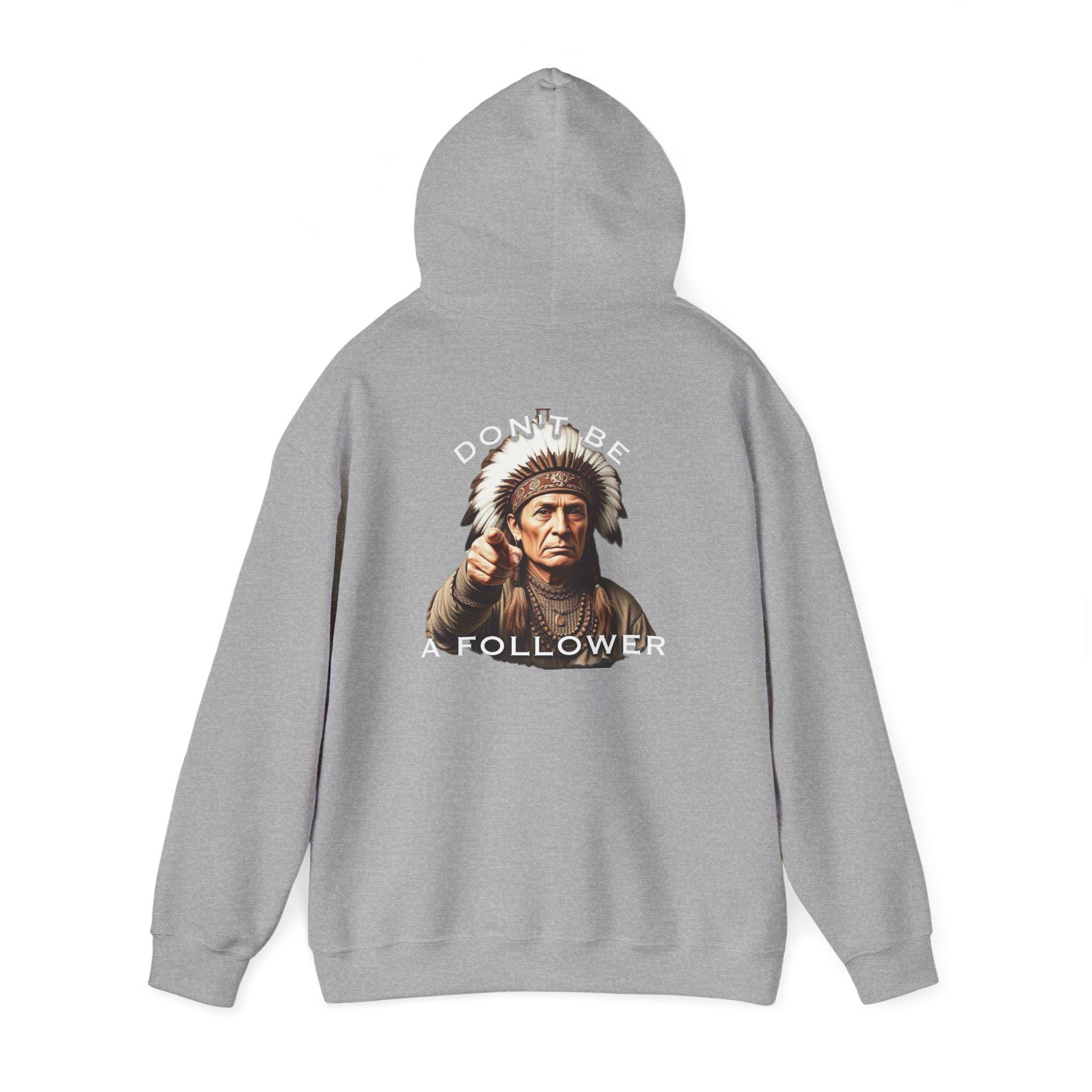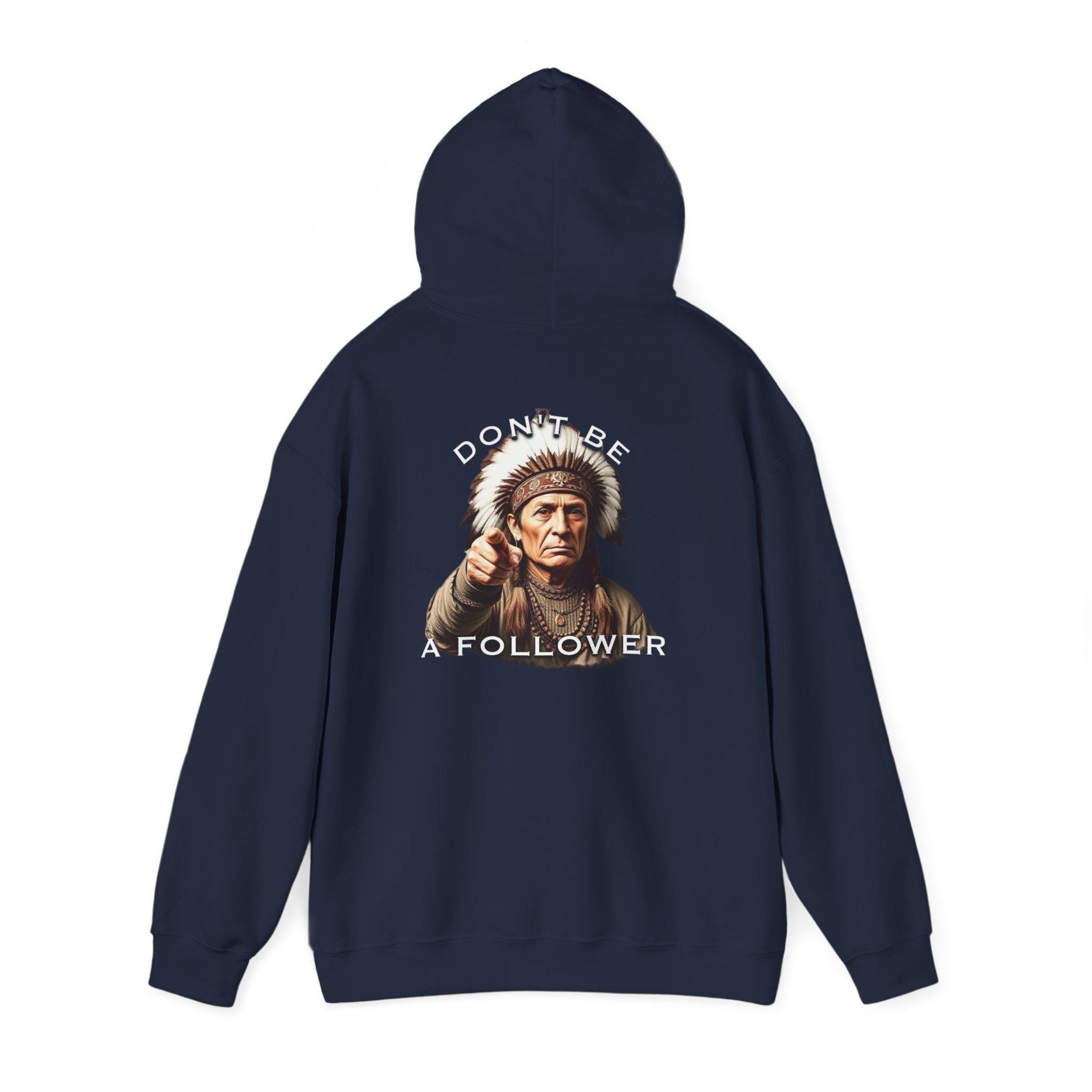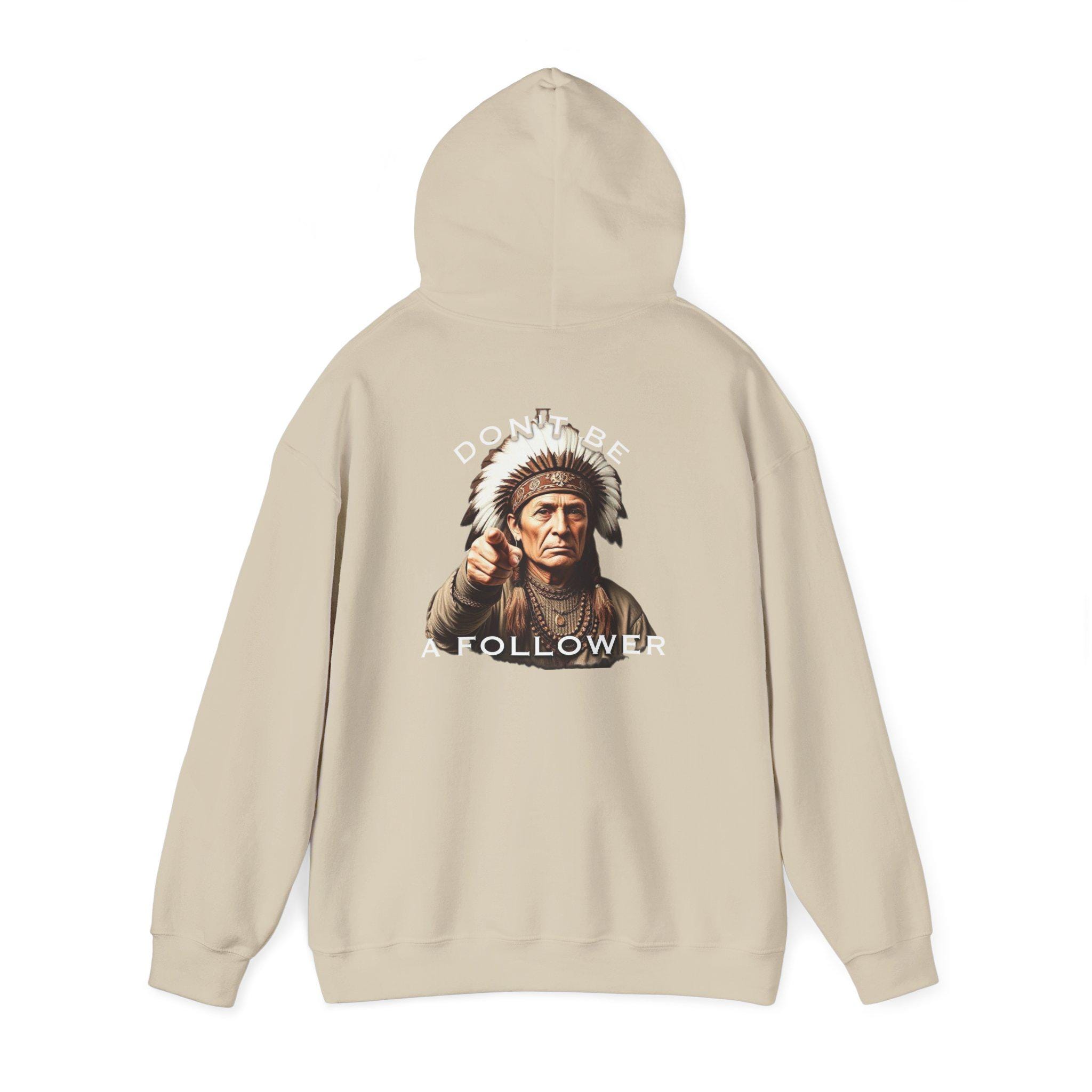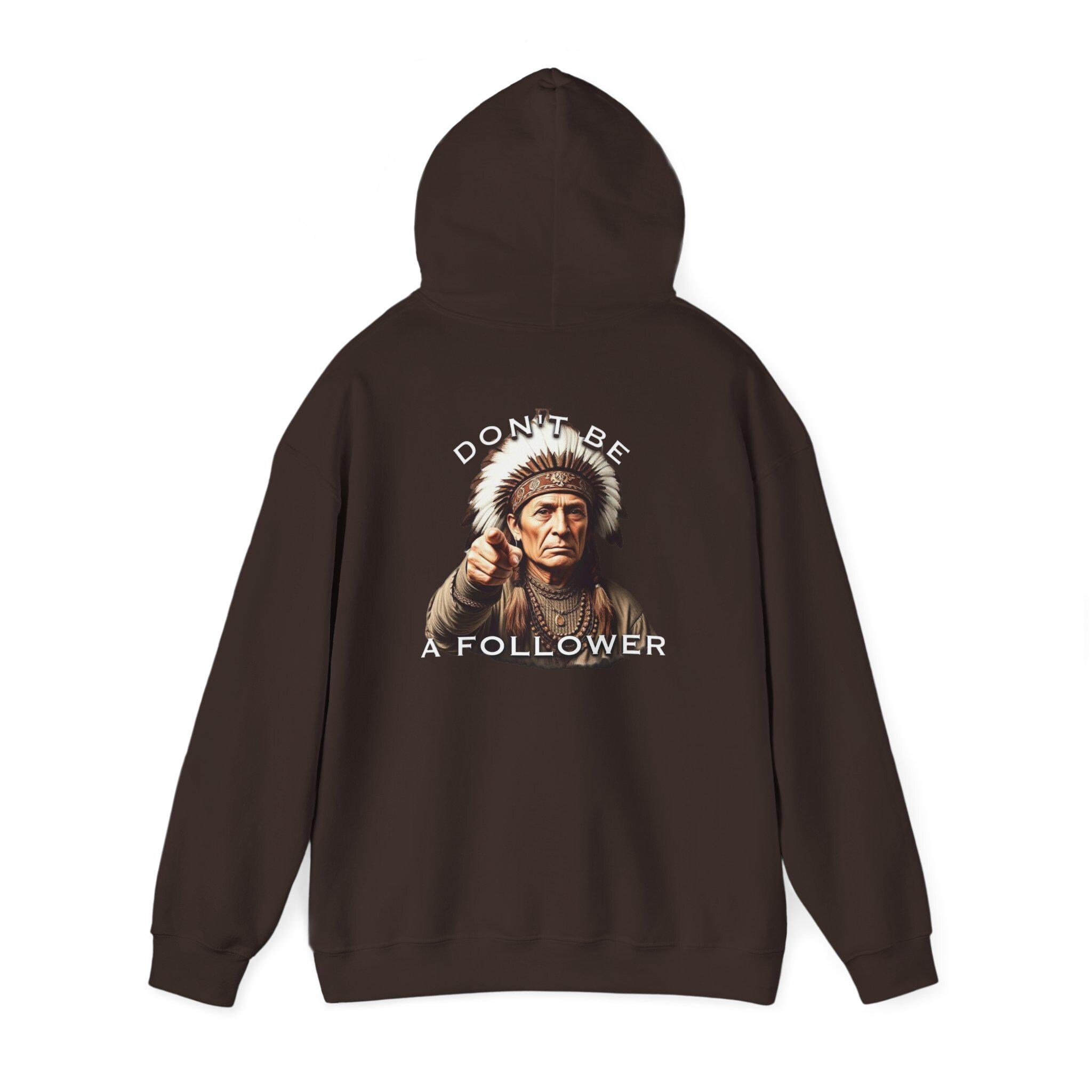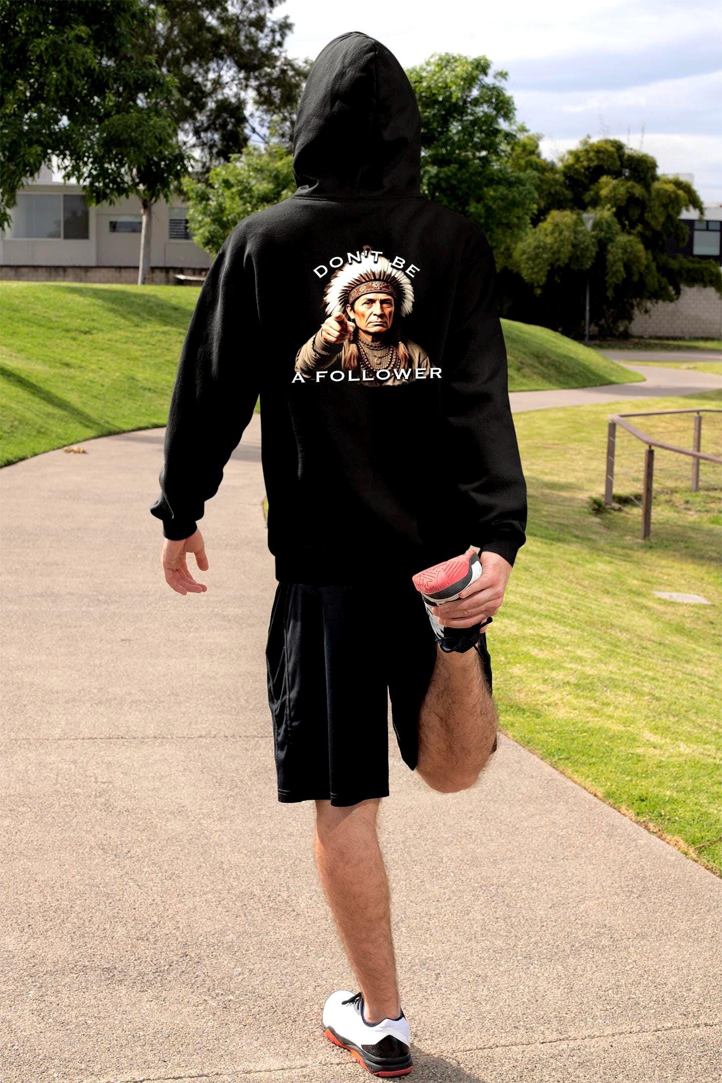 This heavyweight hoodie carries a quiet, confident message. The front shows a small, detailed motif while the back features a grounded portrait of a Native elder with the words “DO BE A FOLLOWER” arched above and below — an ironic, thought-provoking statement that starts conversations. The black fleece provides a deep contrast for the vivid DTF prints, and the roomy kangaroo pocket and double-lined hood make it a go-to layering piece on cool mornings or late nights. Wear it when you want warmth without shouting, when you want an artwork-like graphic that reads as both respectful and provocative, and when you need a durable everyday layer that holds its shape and color wash after wash.