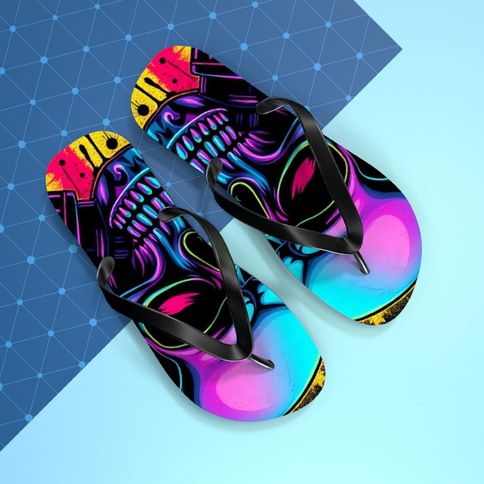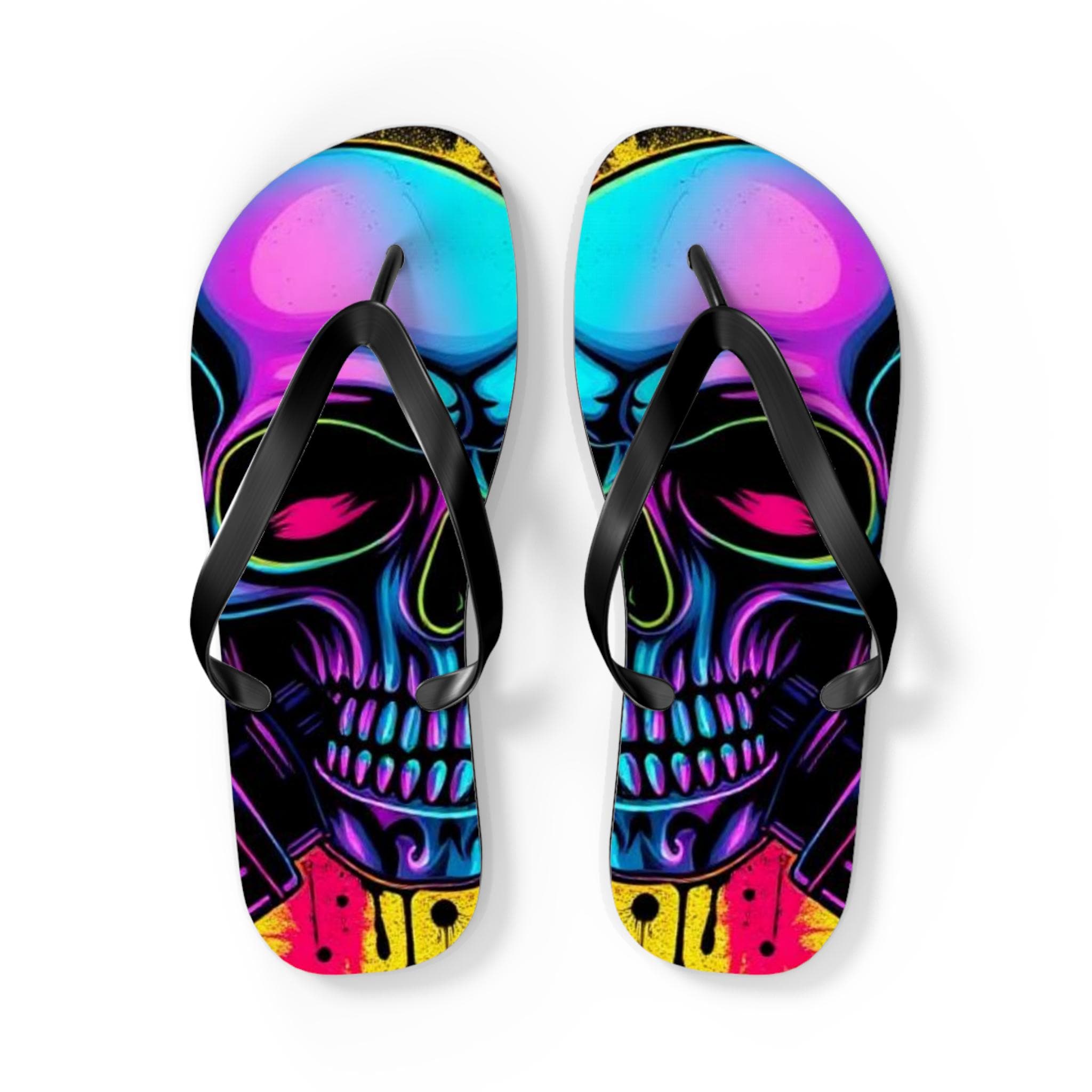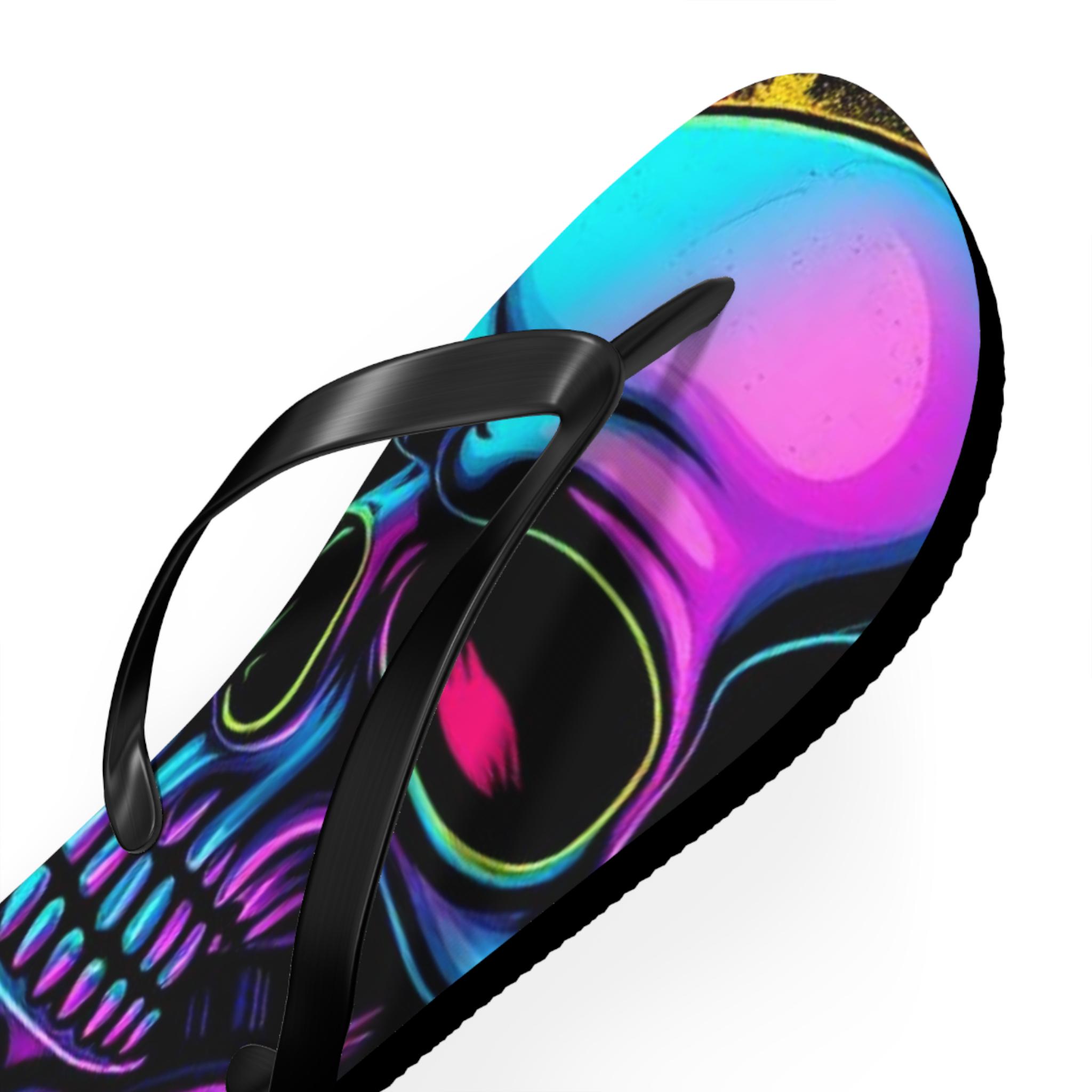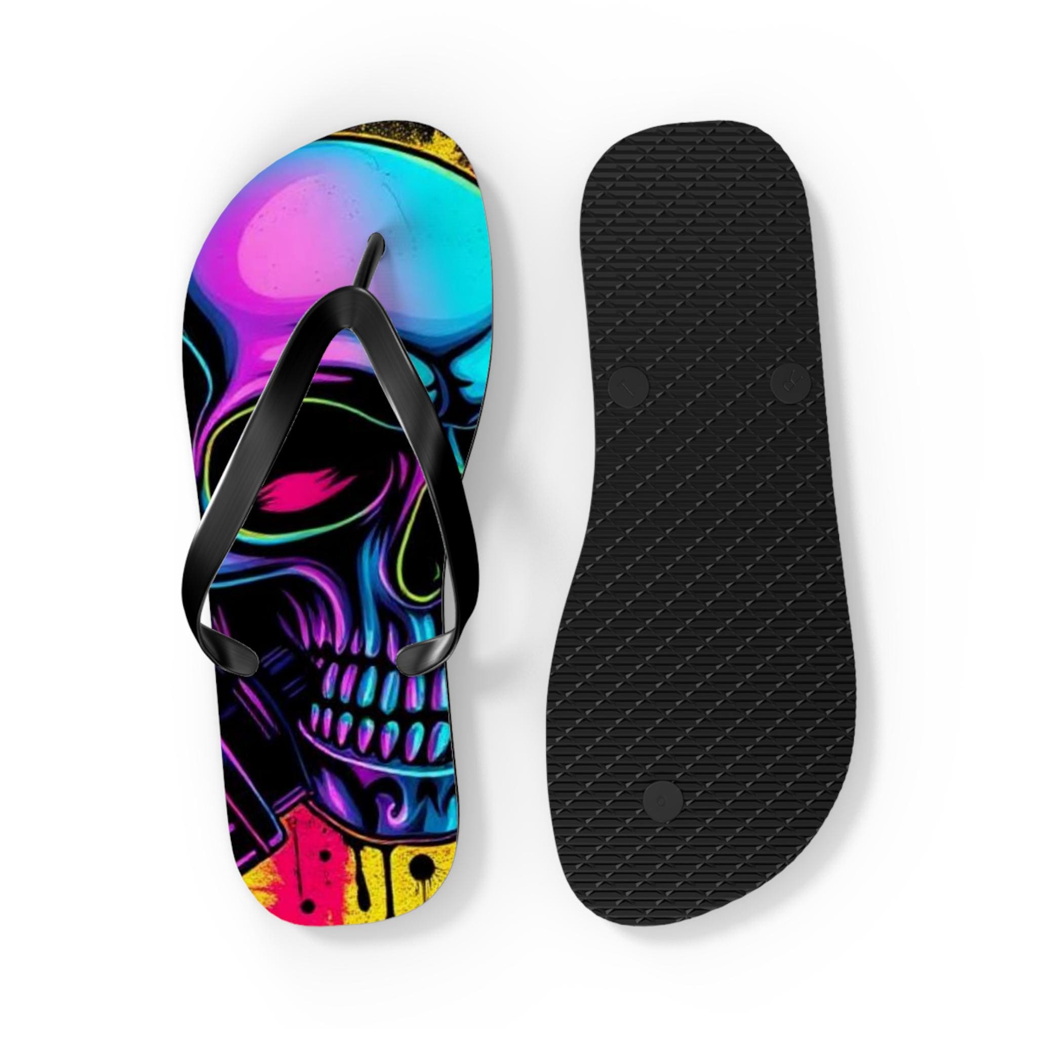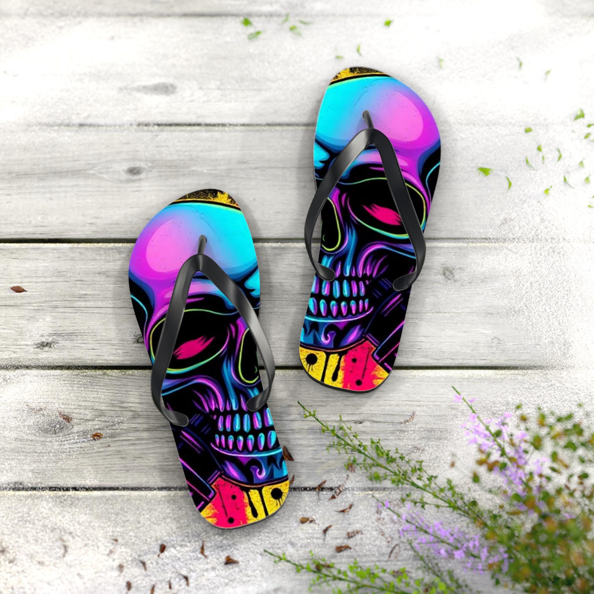 Take your boldest summer moments into the street with these vibrant flip flops. The smooth polyester suede top holds an electric, neon skull print that feels like sun-soaked nights and boardwalk art. Lightweight EVA soles flex with each step, while the textured, slip-resistant bottom keeps you steady on pool decks and slippery sidewalks. Black PVC straps sit comfortably against your feet and let the artwork do the talking. Wear them to music fests, beach nights, or when you want to add a flash of color to an everyday walk.