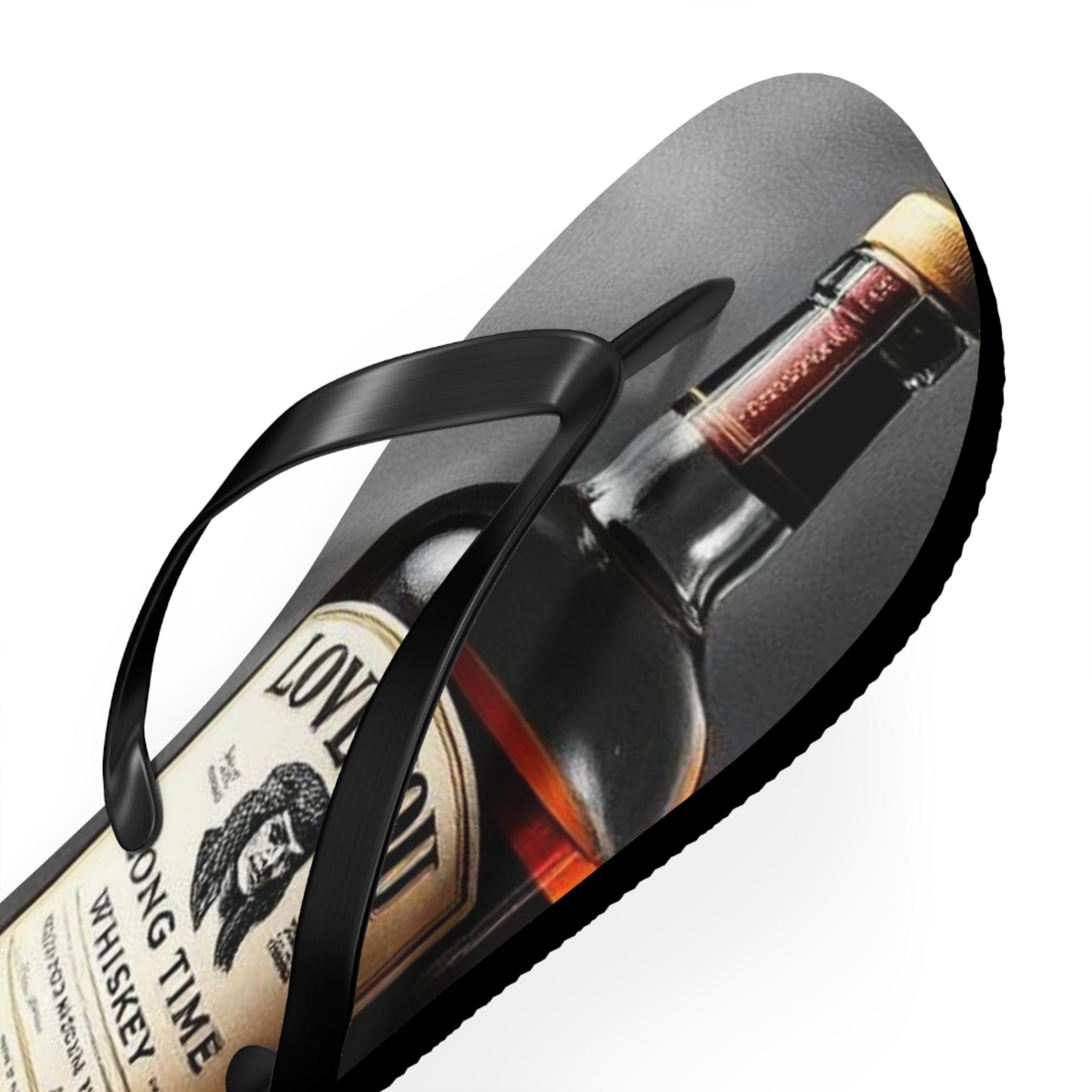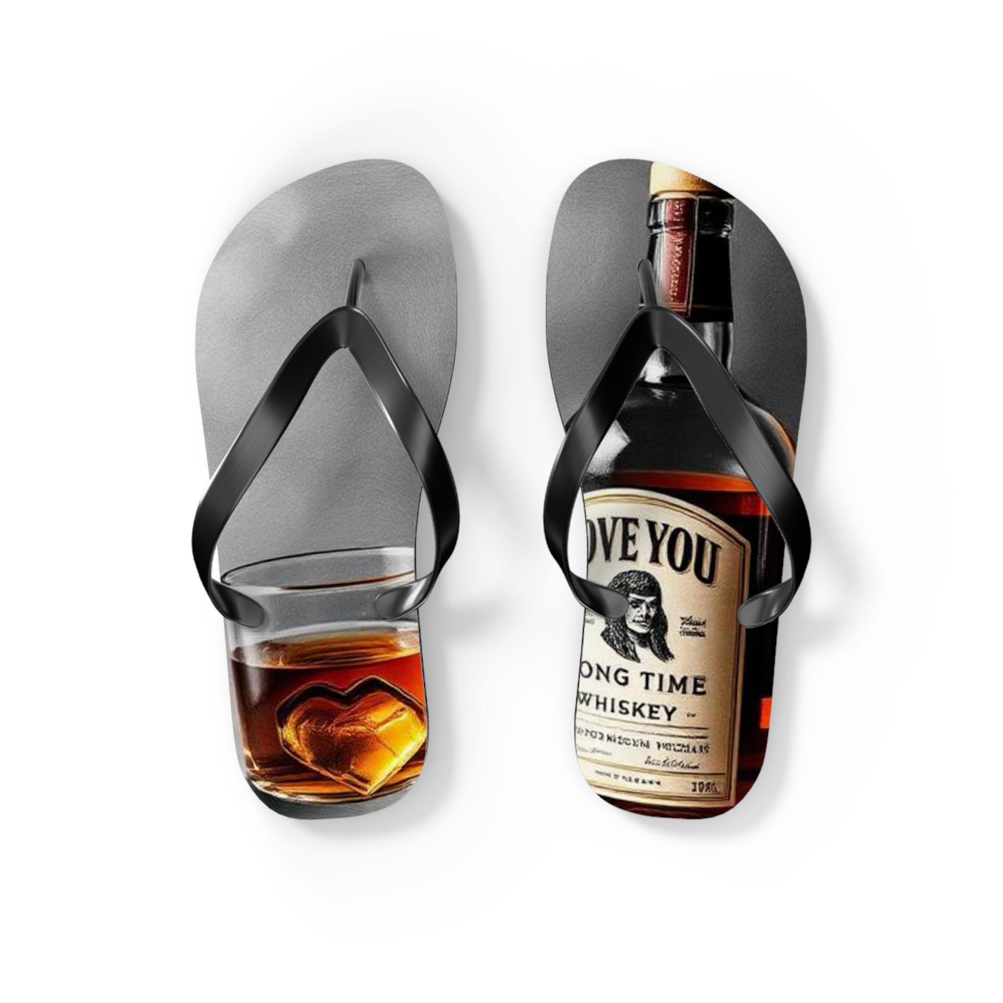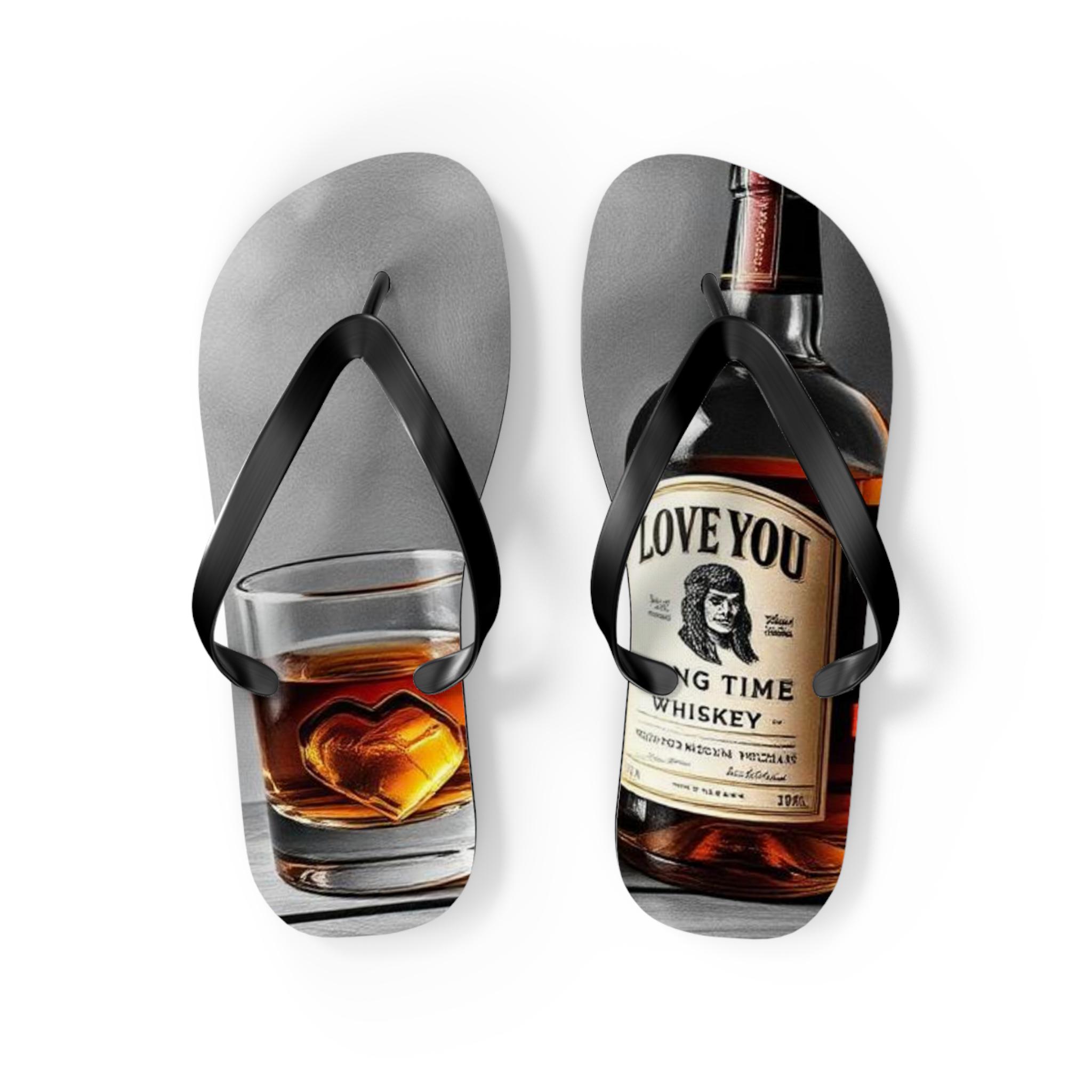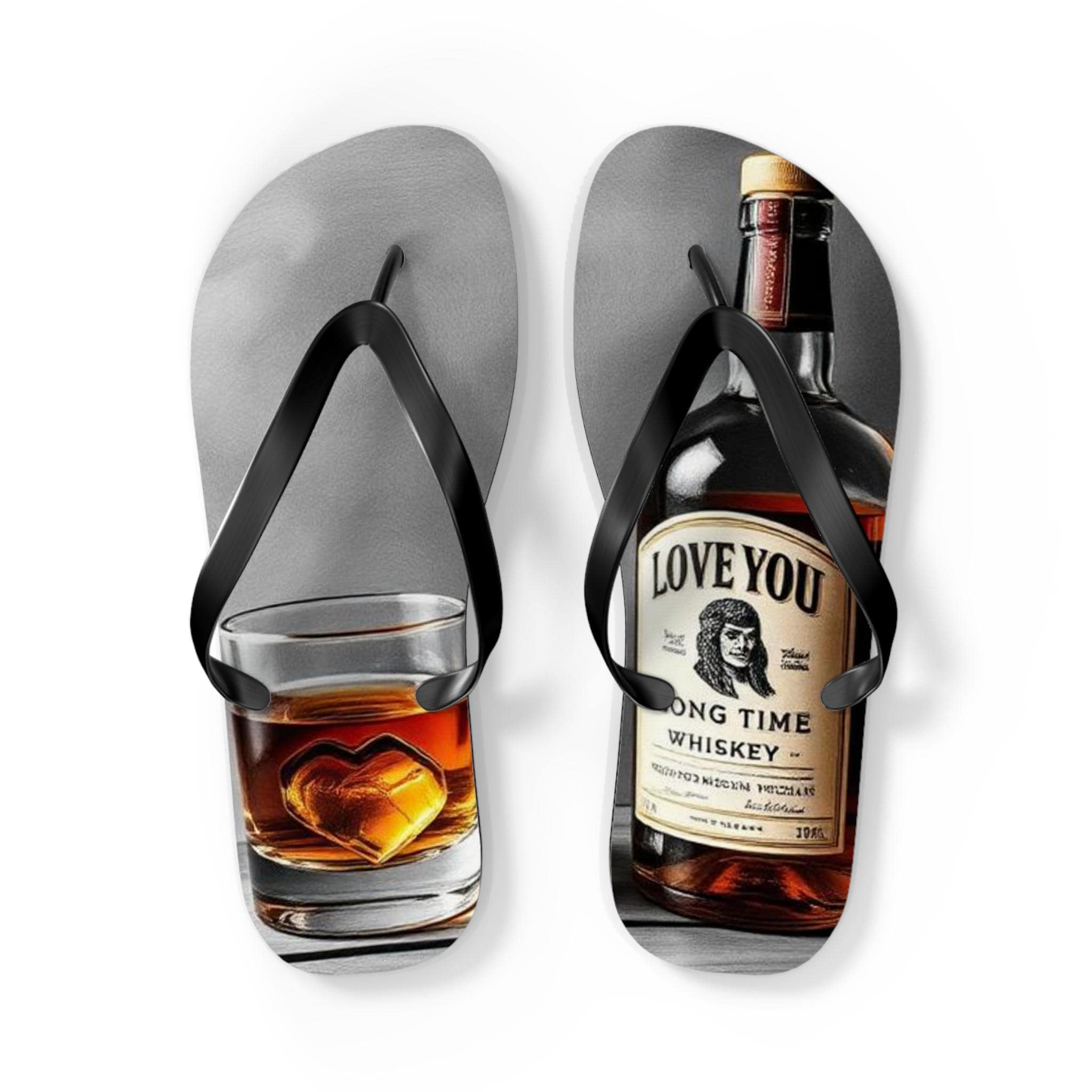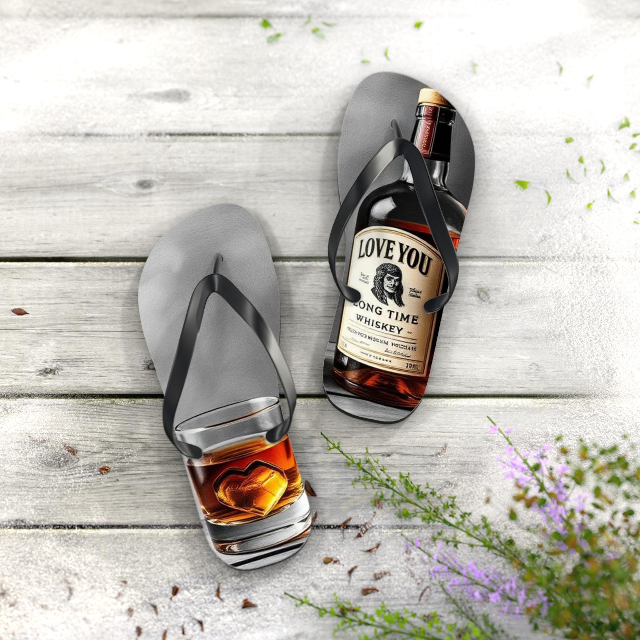 These flip flops carry the warm, easygoing energy of a late-afternoon porch sit — sun low, glass in hand, slow conversation. Printed with a photoreal whiskey bottle and a tumbler with a heart-shaped ice cube, the design feels intimate and slightly nostalgic. Lightweight EVA soles and a soft polyester suede top make them comfortable for slow walks and lounging. The textured, slip-resistant bottom keeps each step steady near pool edges or dewy grass. Let them live by the cooler, accompany backyard cookouts, or be the casual pair you reach for when you want something laid-back with personality.