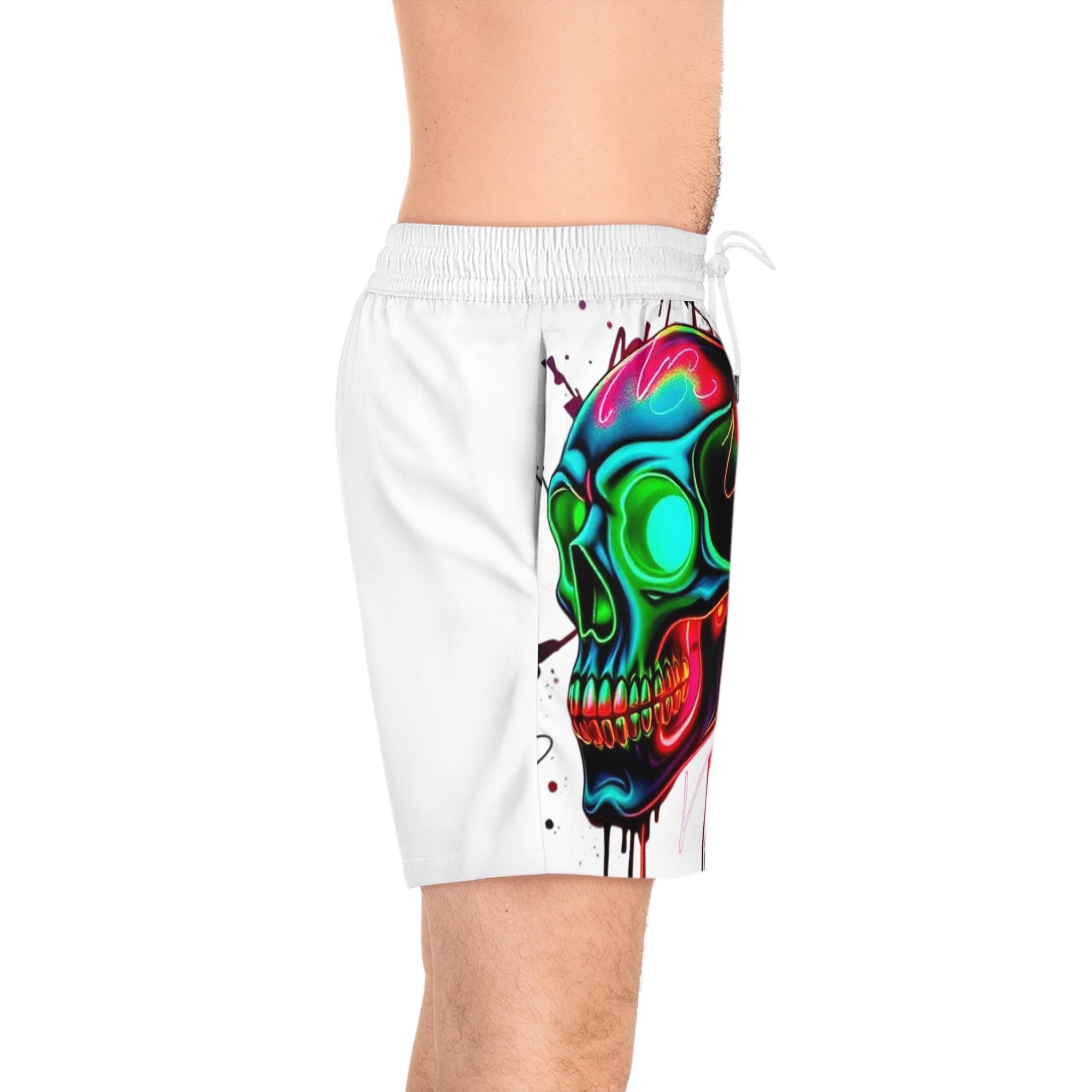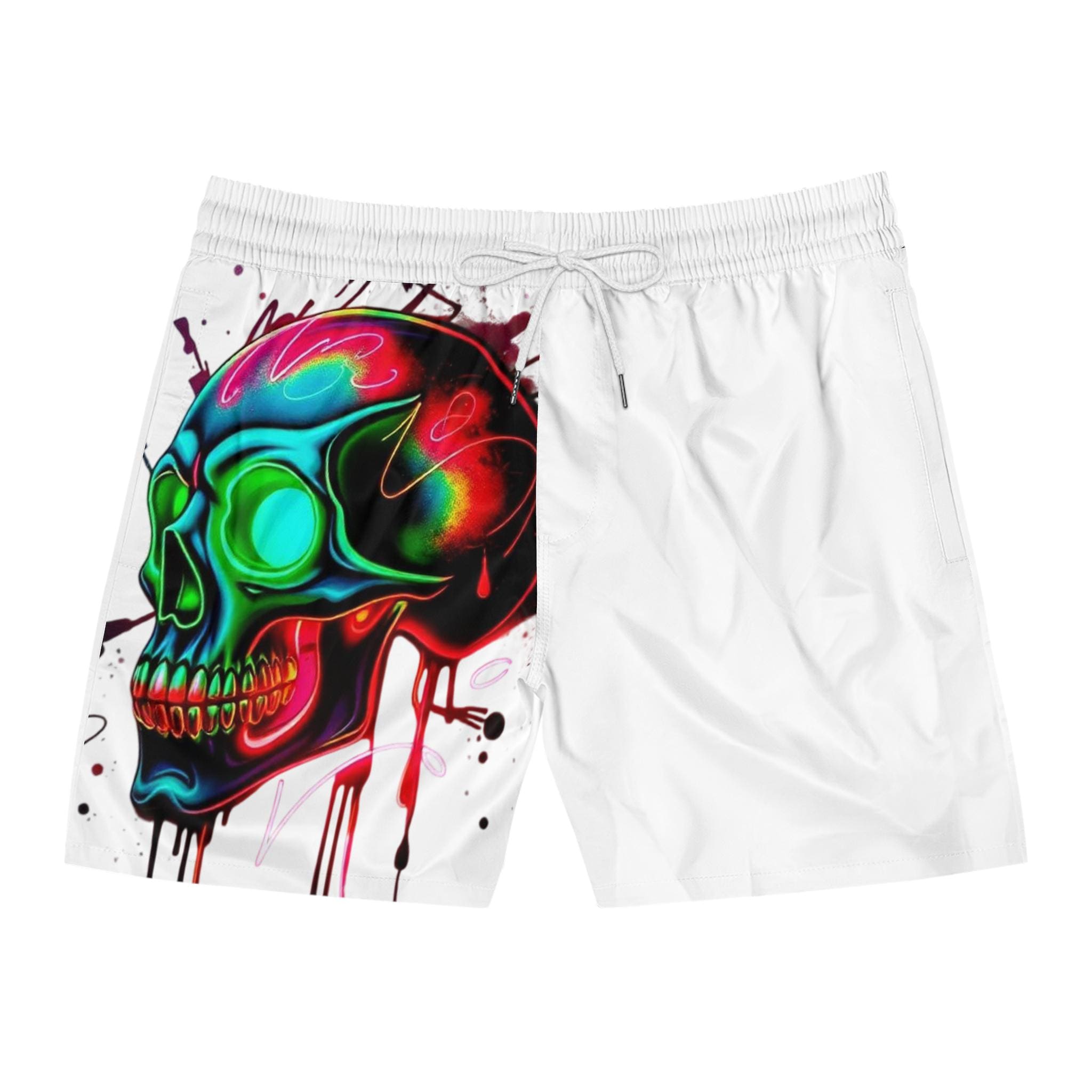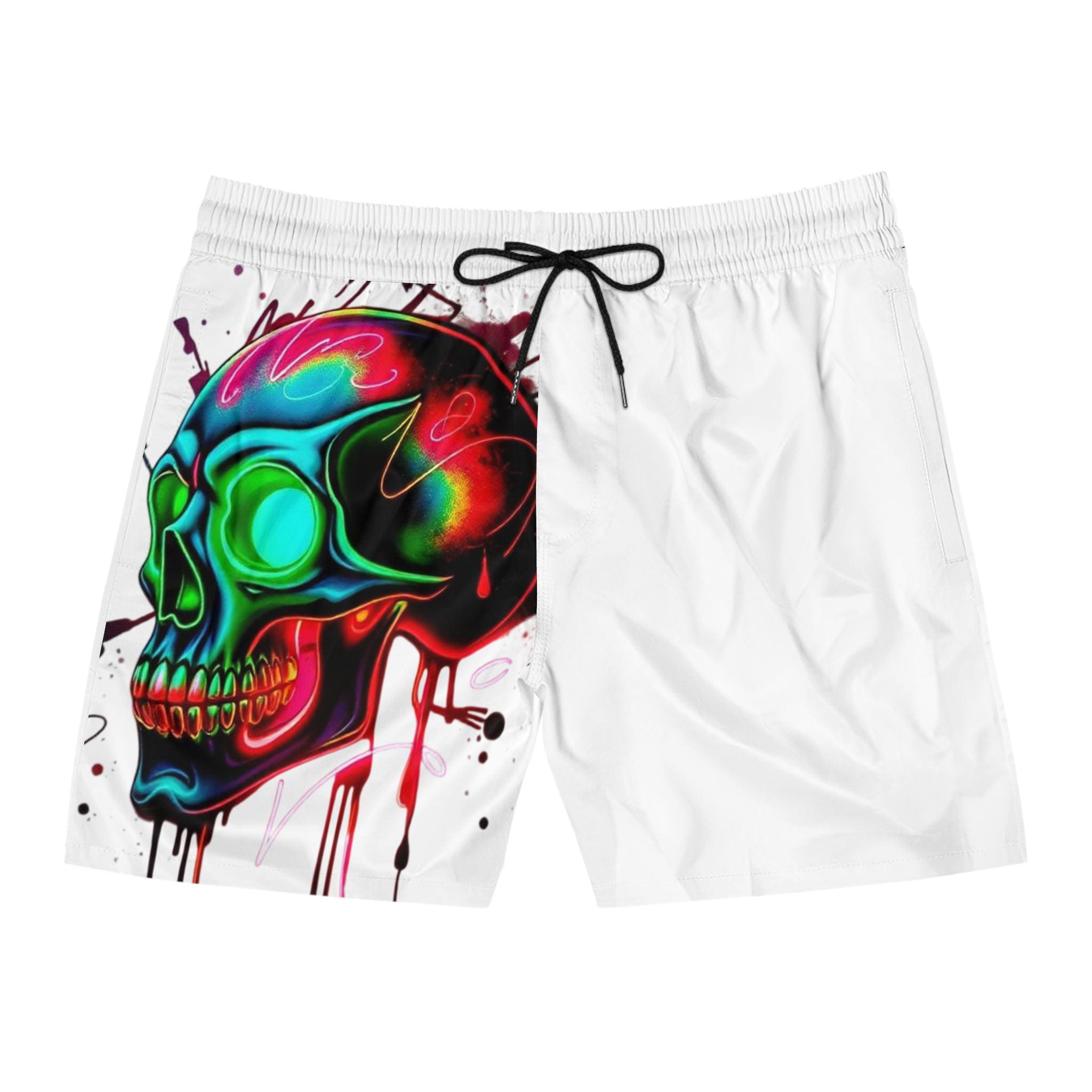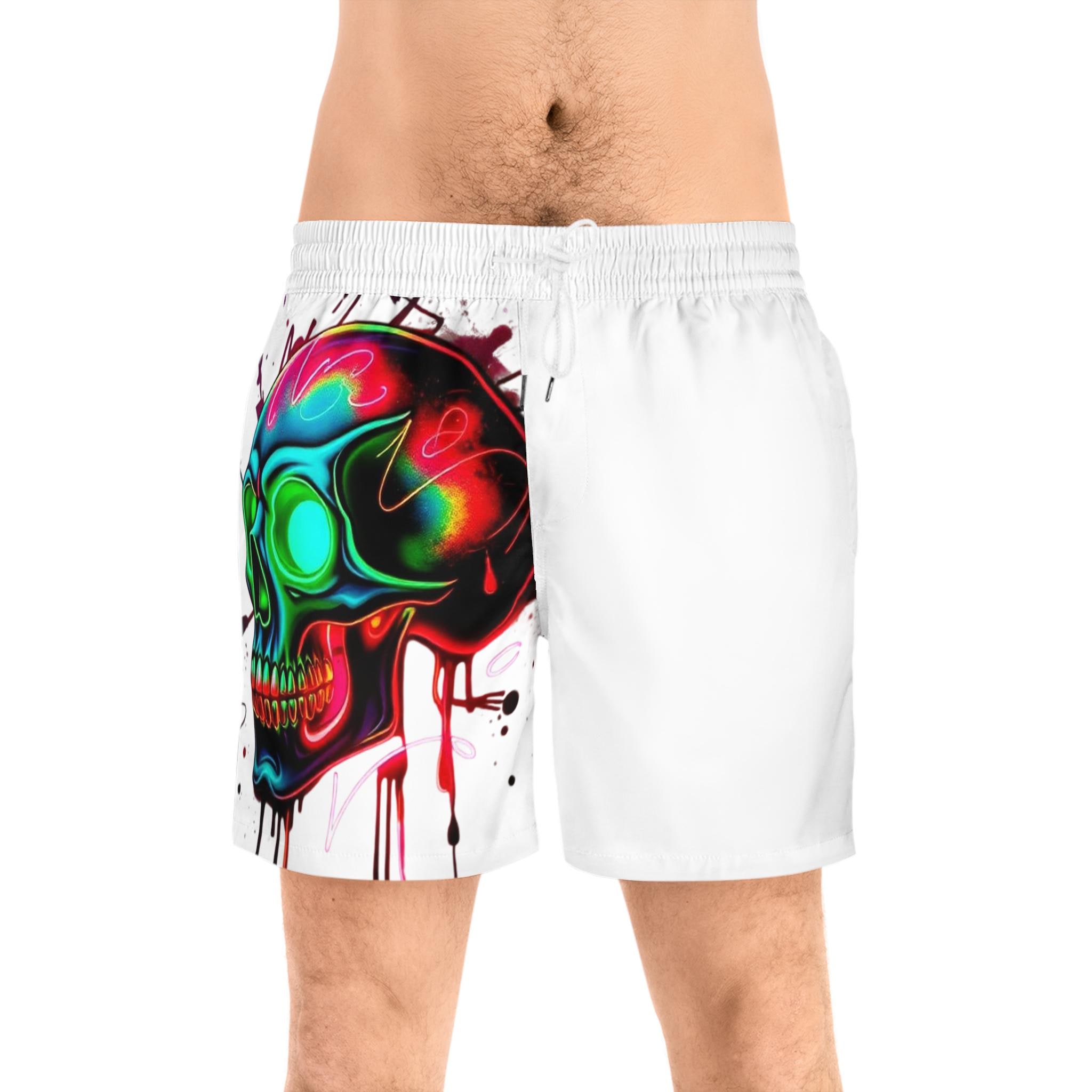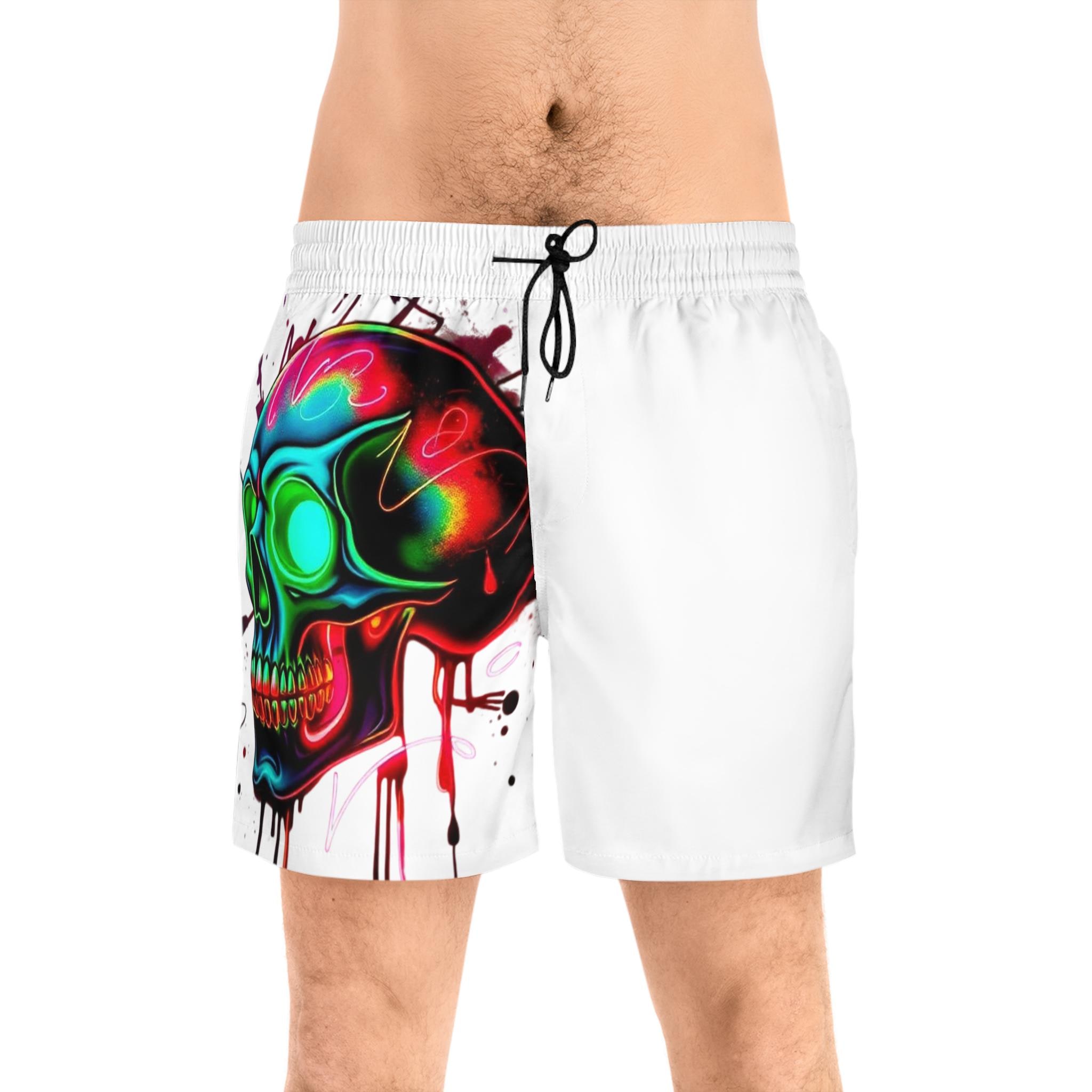These mid-length swim shorts bring bold street-art energy to beach days and backyard hangs. A vibrant, neon skull graphic splashes across one side, its dripping paint and electric hues catching the eye while the opposite panel stays clean and minimal. Lightweight, slightly stretchy fabric and a soft inner mesh lining keep movement easy whether you’re cutting through waves or chasing a sunset run. The elastic waistband with adjustable drawstrings and two mesh side pockets make them practical for active weekends. Wear them with flip-flops or trainers — they slide effortlessly from water to boardwalk, adding an adventurous, art-forward edge to casual summer rotation.