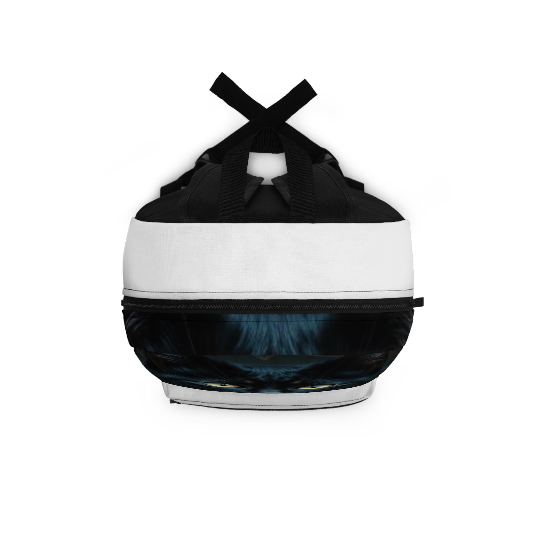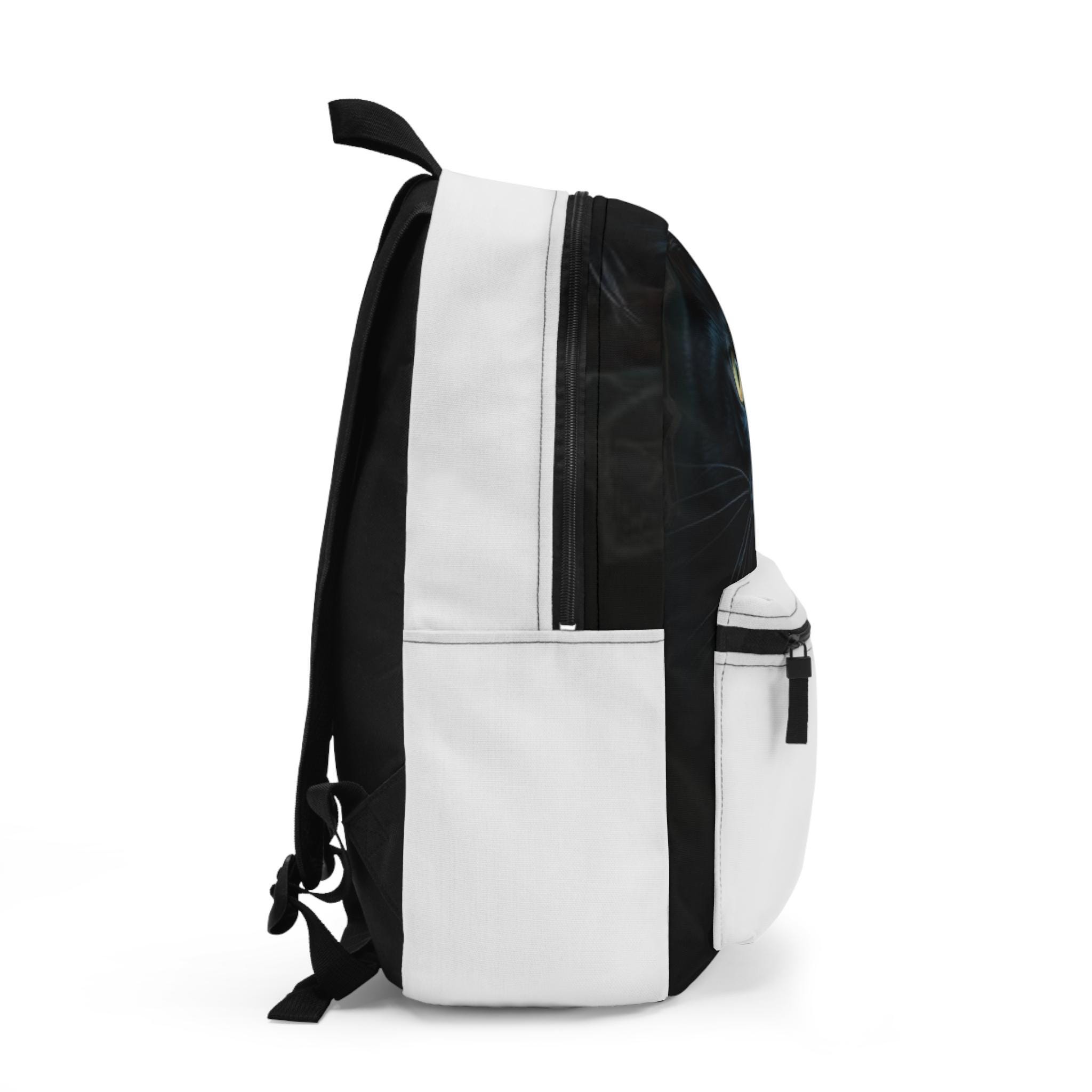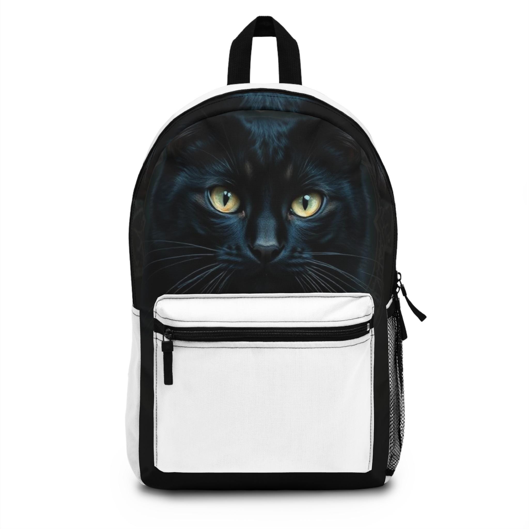 Carry a quiet, watchful energy with this sleek backpack featuring a striking black cat gaze printed on the front panel. The image draws you in — amber eyes, glossy fur, and a hint of moonlit mystery — making the bag feel like a companion on city streets, late-night study sessions, or a weekend escape. Lightweight but structured, it slips easily into daily life: toss in a laptop, tuck a water bottle in the side pocket, and let the padded back and adjustable straps keep shoulders comfortable while you move. The subtle white and black contrast keeps the design modern and versatile, so it complements both casual and slightly dressed-up looks. For anyone who notices the small, curious details and prefers accessories with personality, this backpack adds a little magic to everyday routines and special nights out.