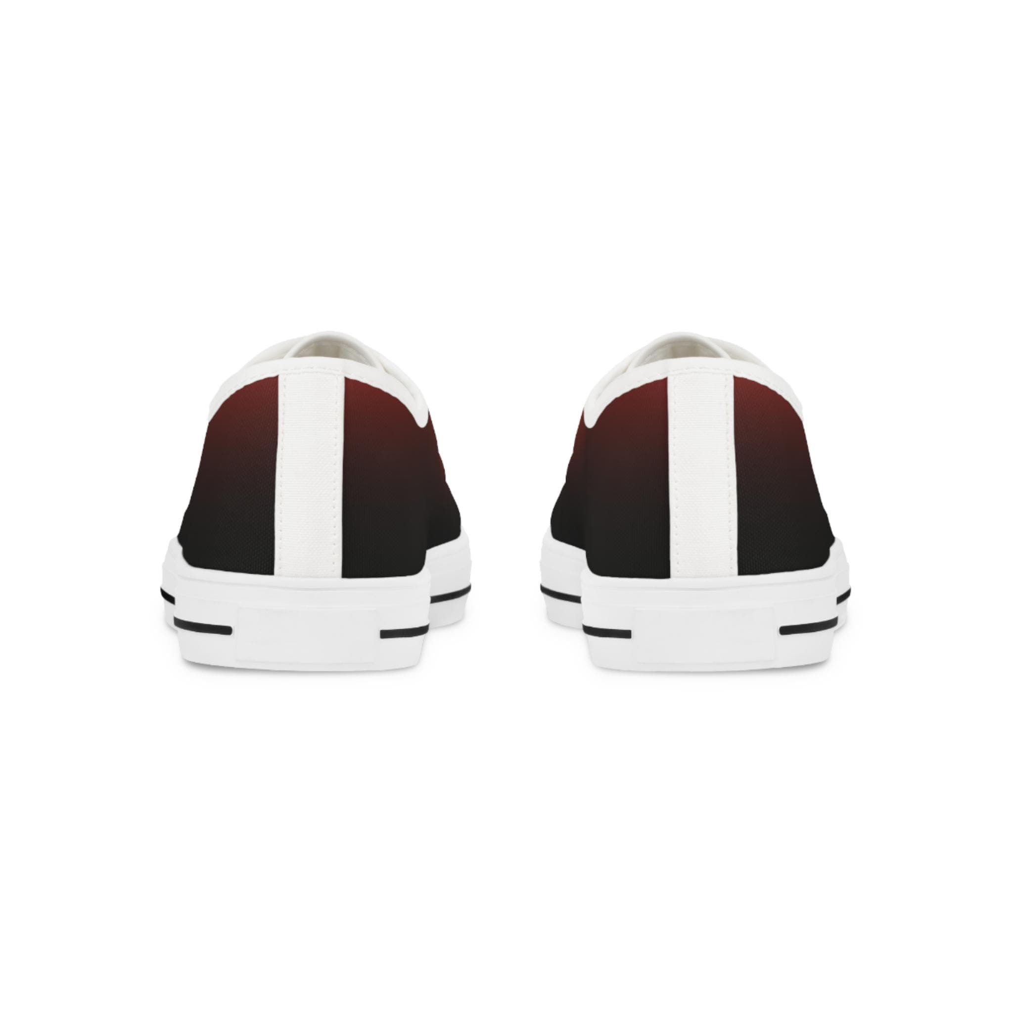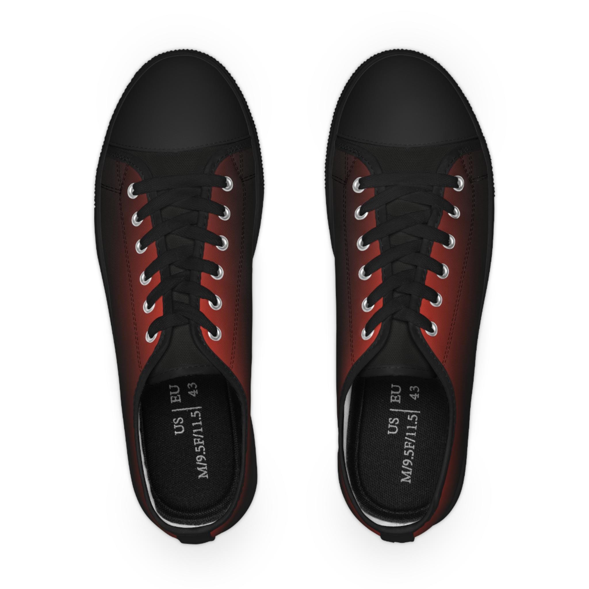 Low-top canvas sneakers with a smoky black-to-deep-red gradient that reads like dusk on the pavement. They have a classic silhouette with pleather toe caps and metal eyelets, plus cushioned memory-foam insoles and EVA shock absorption for long days on your feet. These shoes slip into everyday rotations—paired with rolled denim for coffee runs or layered socks for late-night walks—bringing quiet, streetwise edge without shouting. The full wraparound print keeps the look seamless from profile to tongue, while breathable polyester and a durable rubber outsole make them comfortable and built to move.