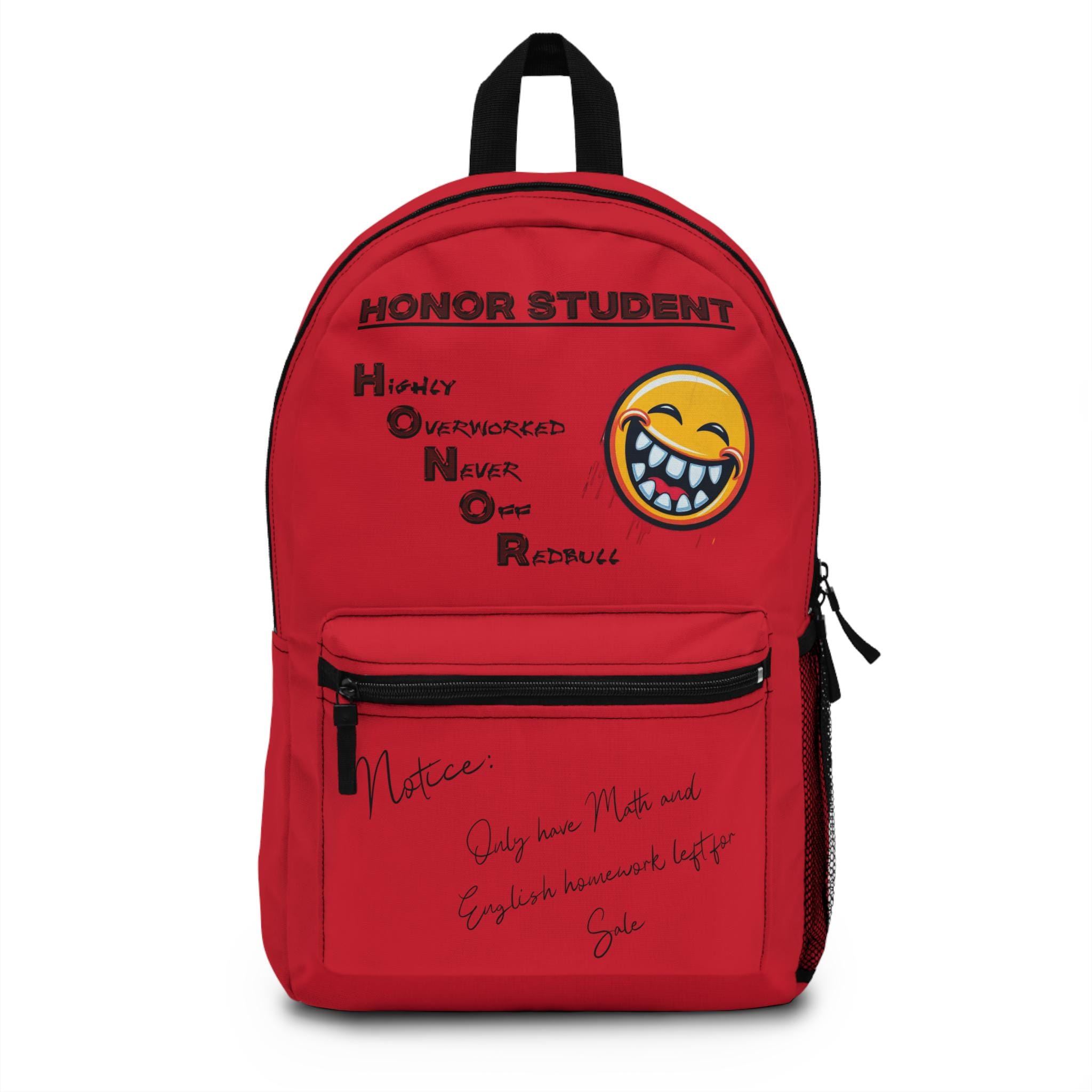 This vibrant red backpack blends playful personality with daily practicality. The front panel features a bold “HONOR STUDENT” header, a cheeky emoji graphic, and handwritten-style notes that give it a lived-in, school-supply vibe. Built for movement, the lightweight polyester shell and padded mesh back keep carry comfortable through commutes, classes, or quick weekend outings. Multiple compartments — including a 13L main pocket, front zip pocket, side bottle holder and an internal laptop/tablet sleeve — organize notebooks, devices, and little treasures without fuss. Small details like adjustable straps, a sewn name tag, and durable zippers make this backpack feel personal and ready for everyday use.