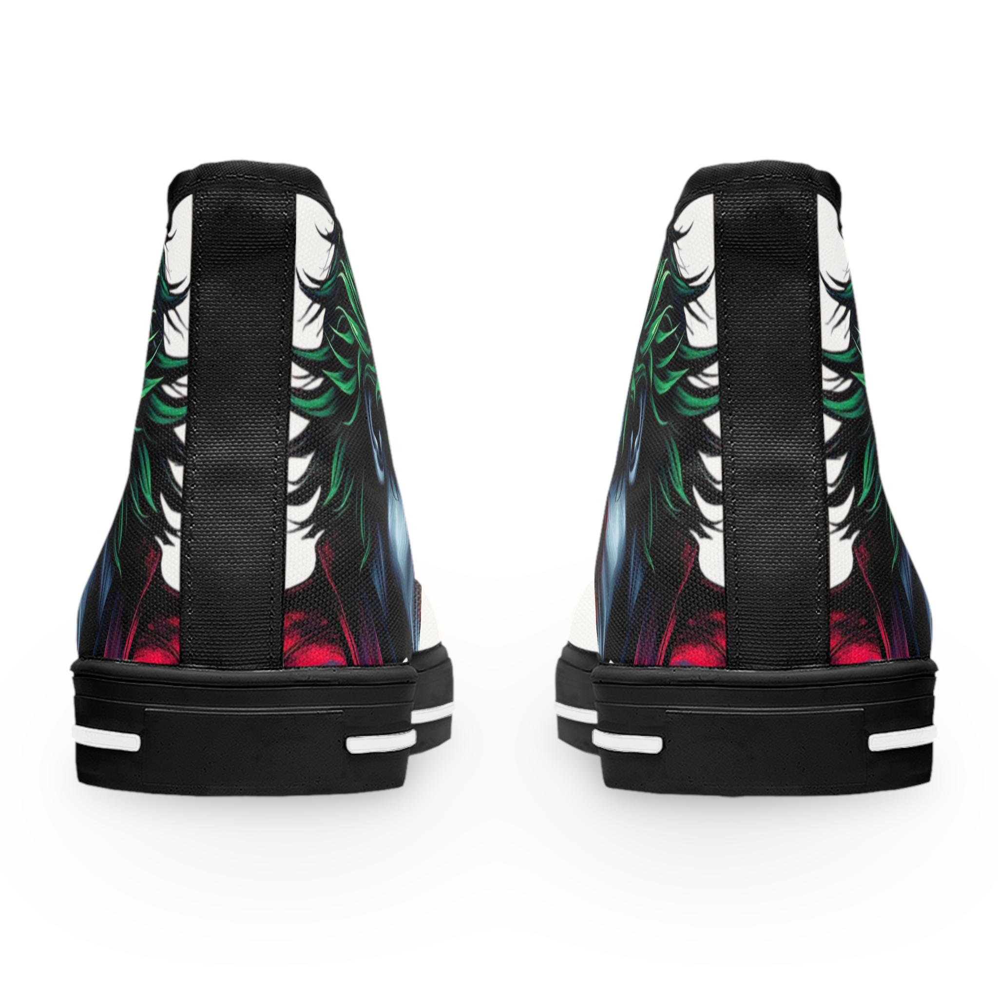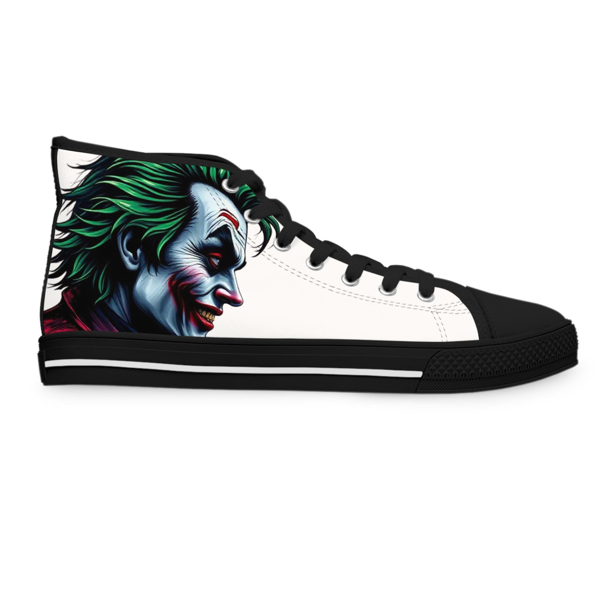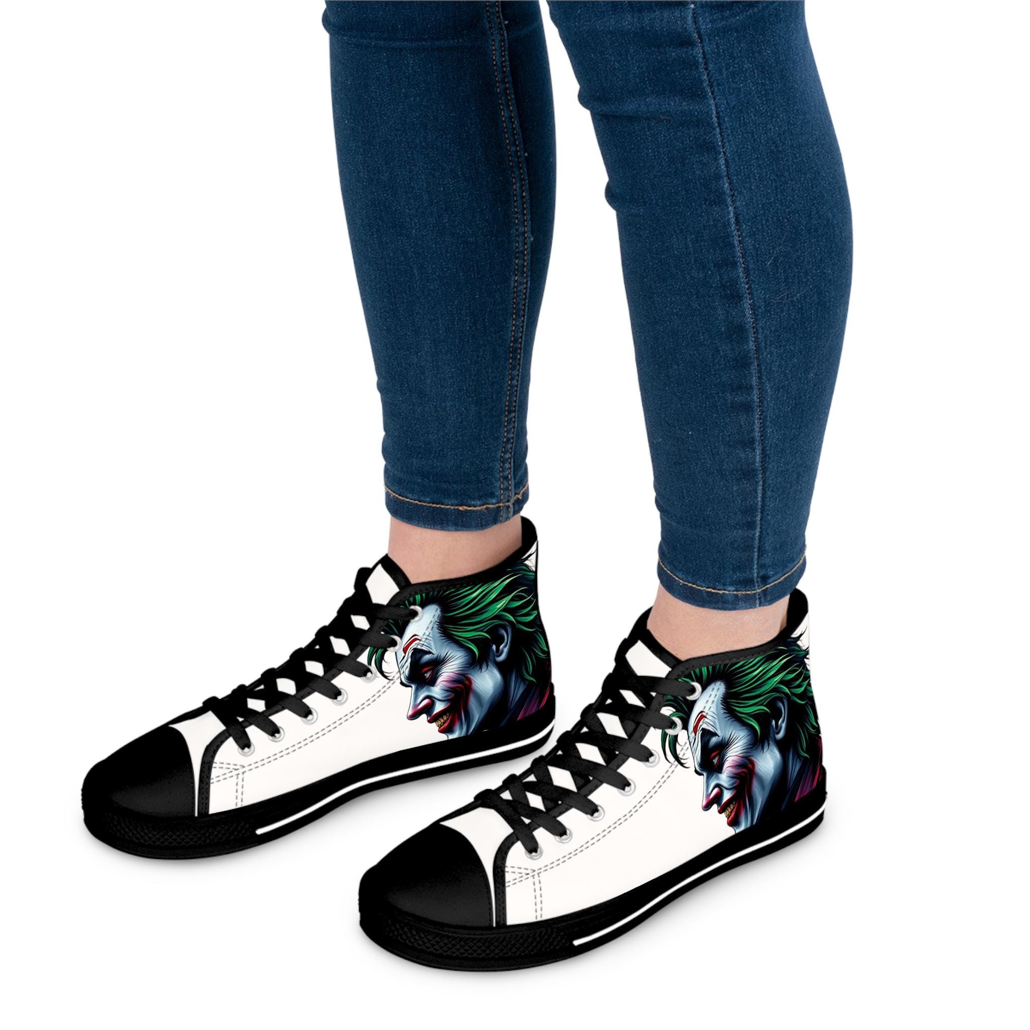 Step into a darker kind of playful rebellion. These high-top sneakers merge bold, cinematic artwork with everyday wearability — the painted, green-haired grin peeking from the ankle adds a mischievous edge to jeans, layered looks, or festival outfits. The canvas upper keeps the silhouette light and breathable, while the pleather toe and durable rubber sole handle city streets and late-night roamings. Memory foam EVA insoles cushion each step so you can wander longer without the ache. Wear them when you want an outfit that whispers trouble and tells a story: comic-book energy, midnight walks, and soundtrack-ready moments all wrapped into one pair.