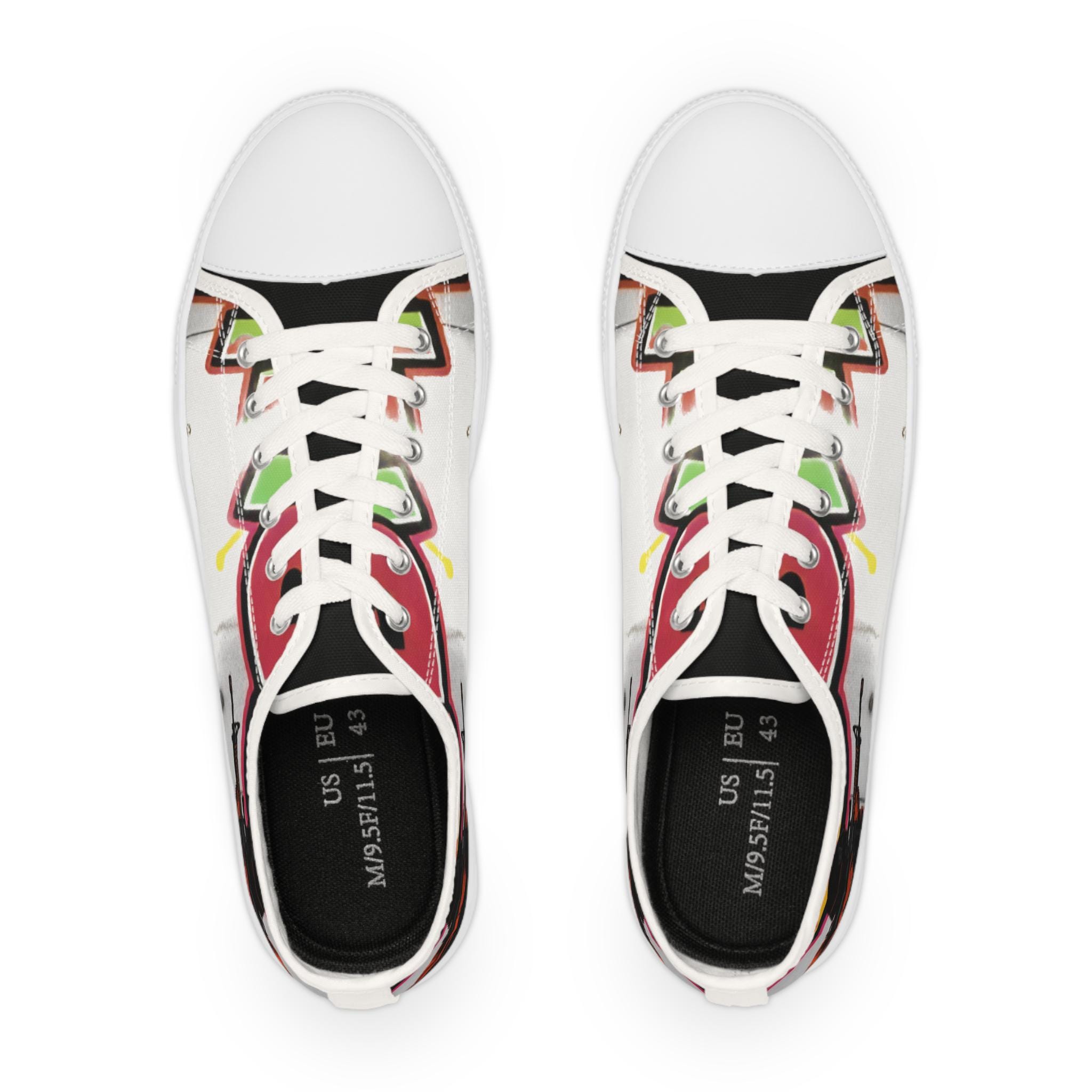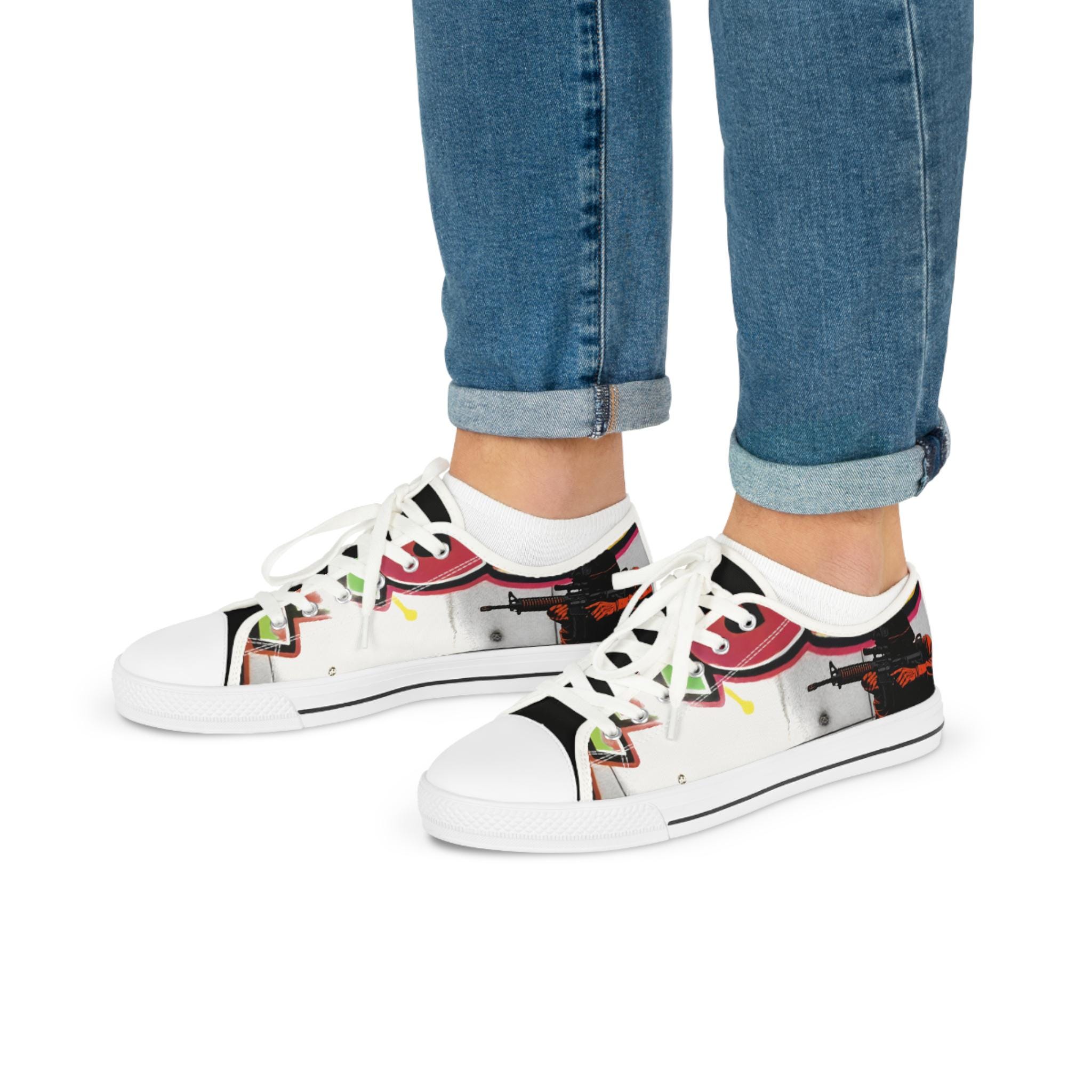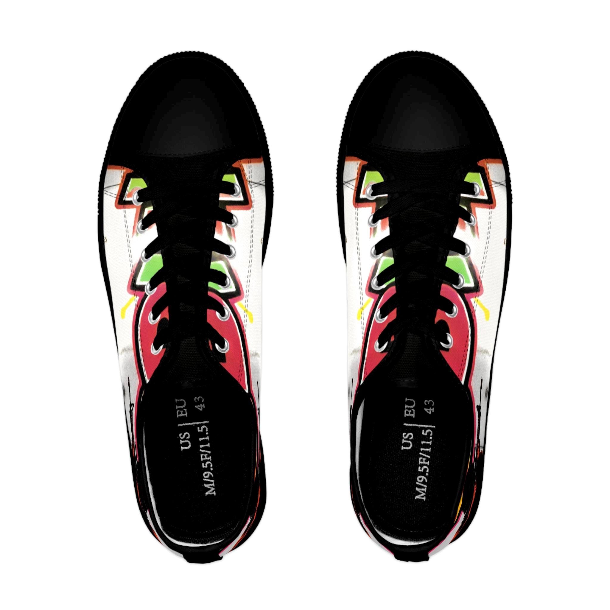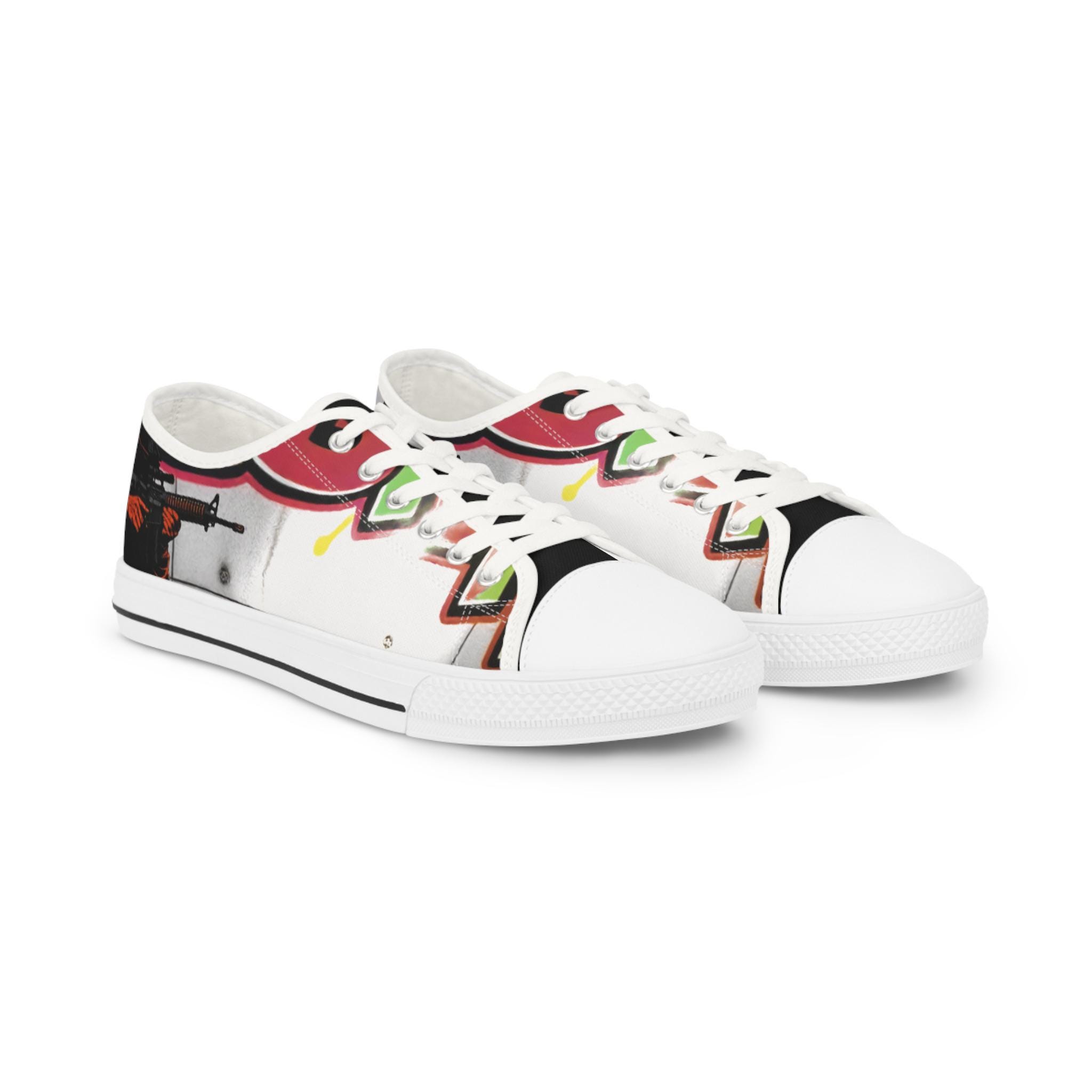 These low-top canvas sneakers carry bold, streetwise energy—think hand-painted mural mixed with skate-culture flair. The wraparound print flows from tongue to heel, where pops of magenta, lime, and graphite create a lively, slightly gritty composition. They feel light underfoot, cushion each step, and age into lived-in favorites that pair effortlessly with lived-in denim, cuffed chinos, or a band tee. Wear them to afternoon skate sessions, gallery walks, or late-night meetups; they bring color and attitude without shouting.