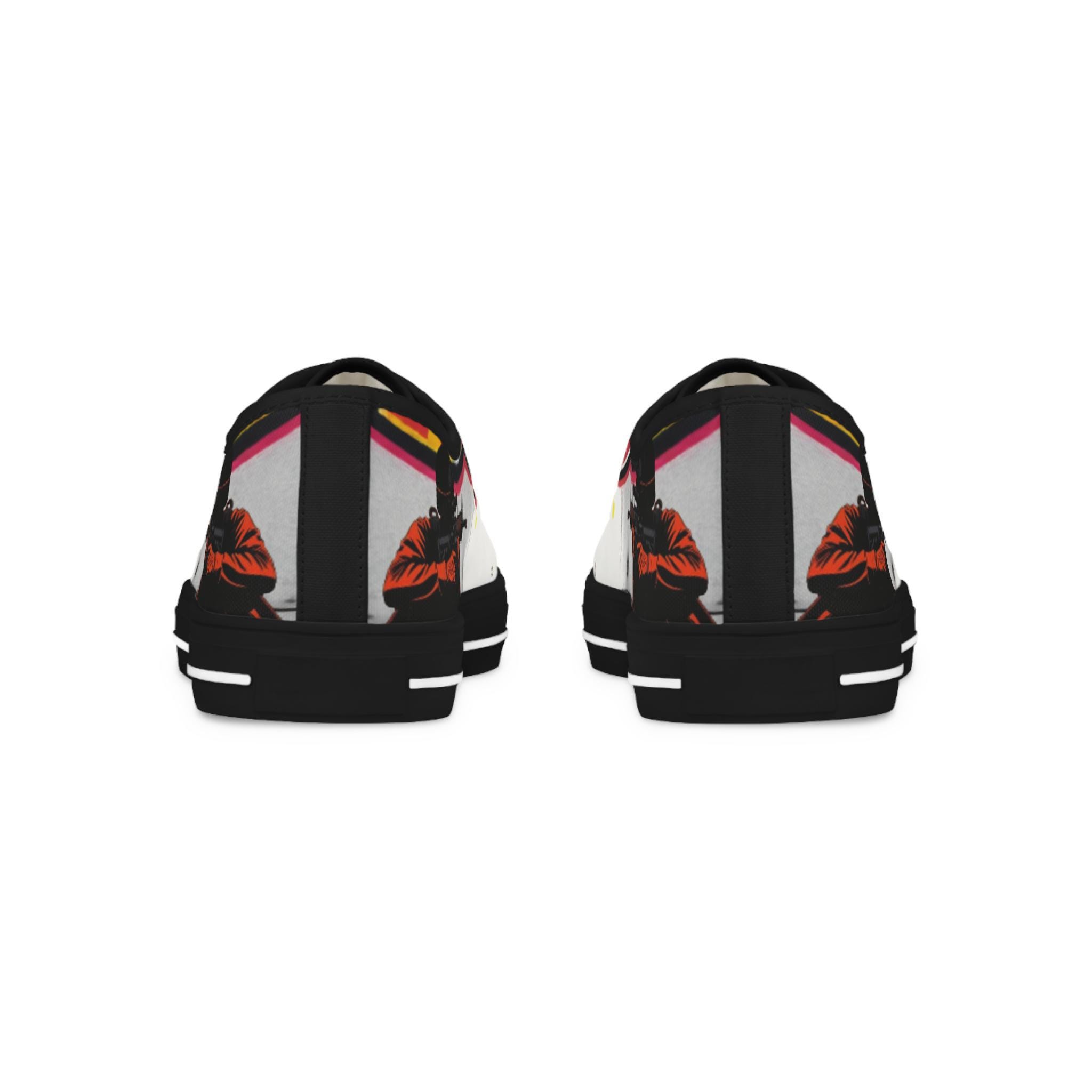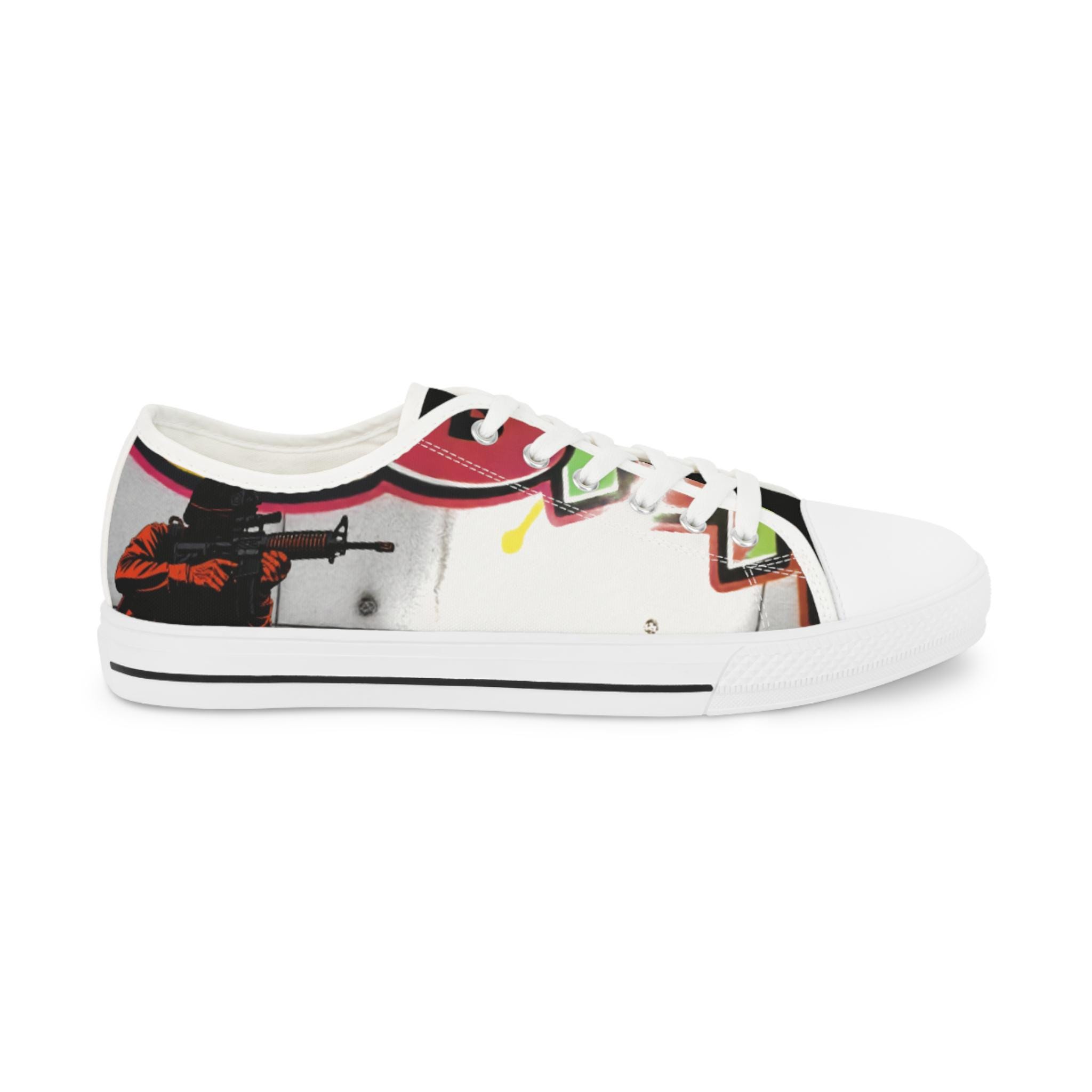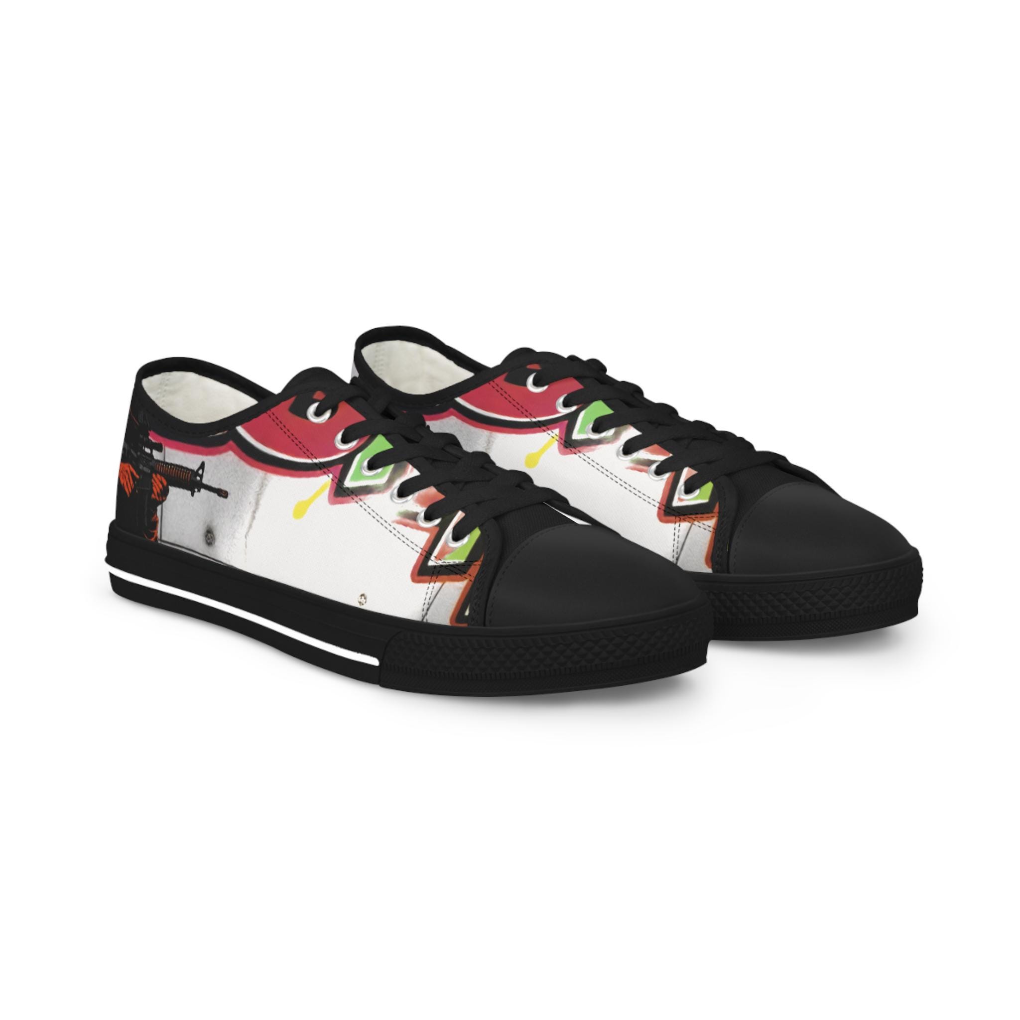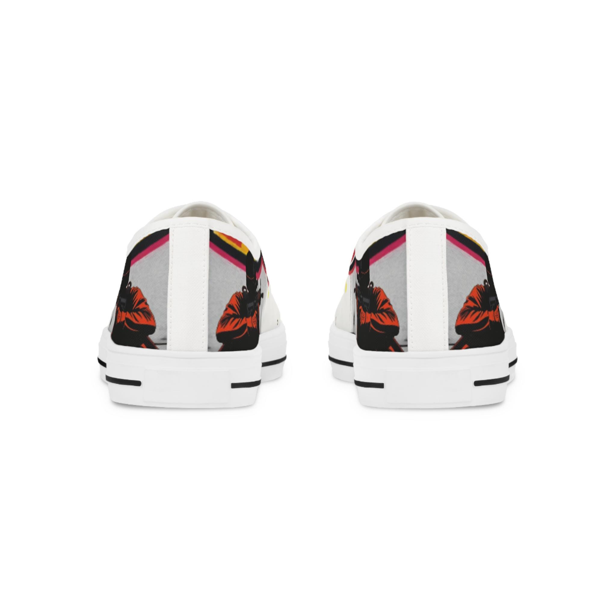 These low-top canvas sneakers carry bold, streetwise energy—think hand-painted mural mixed with skate-culture flair. The wraparound print flows from tongue to heel, where pops of magenta, lime, and graphite create a lively, slightly gritty composition. They feel light underfoot, cushion each step, and age into lived-in favorites that pair effortlessly with lived-in denim, cuffed chinos, or a band tee. Wear them to afternoon skate sessions, gallery walks, or late-night meetups; they bring color and attitude without shouting.
