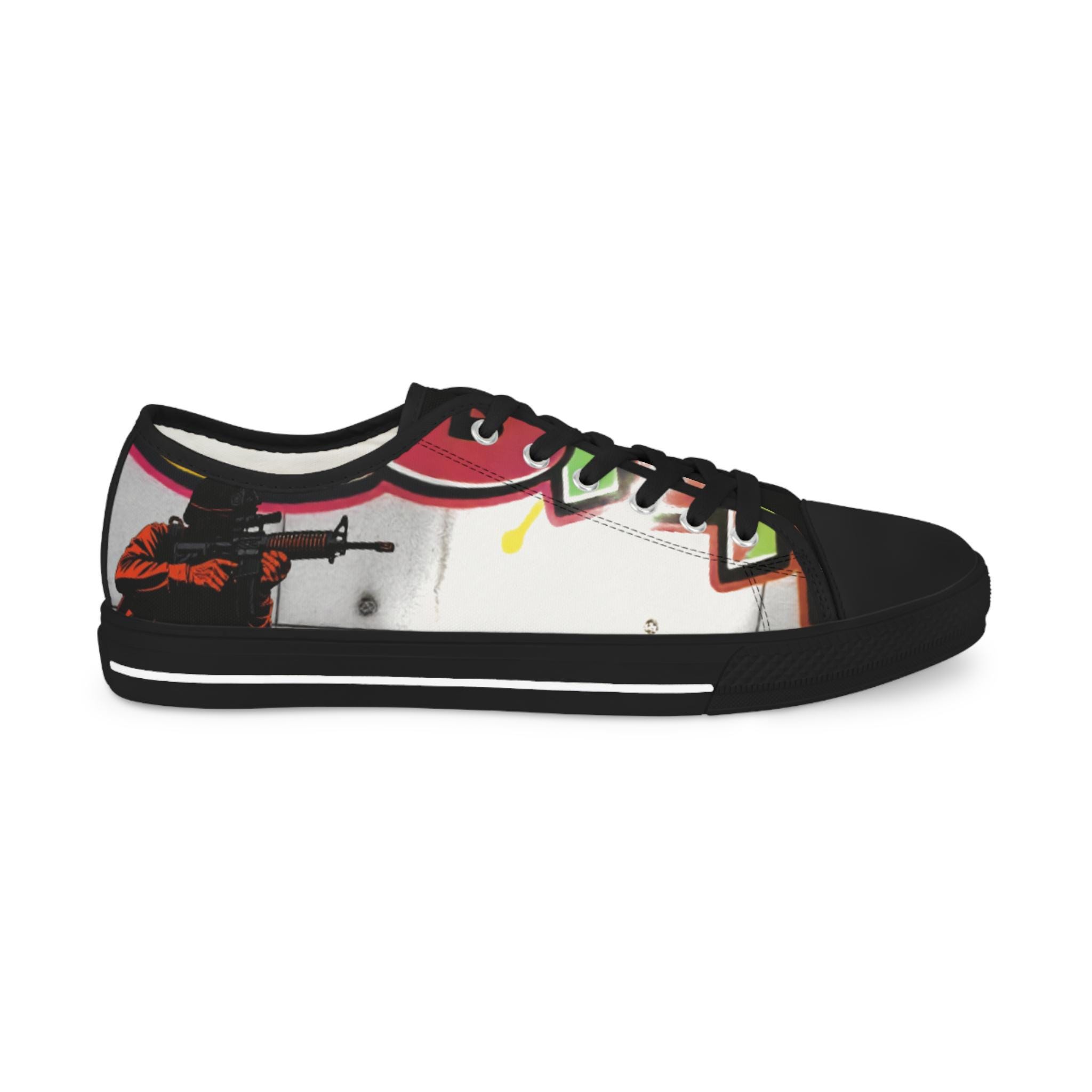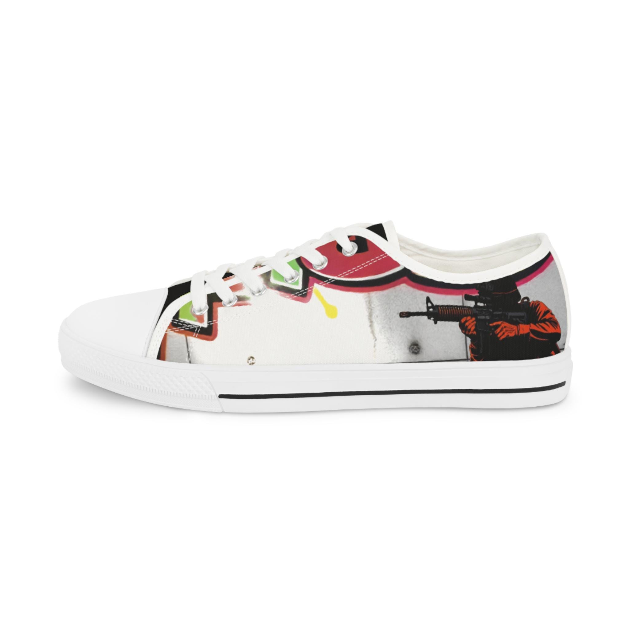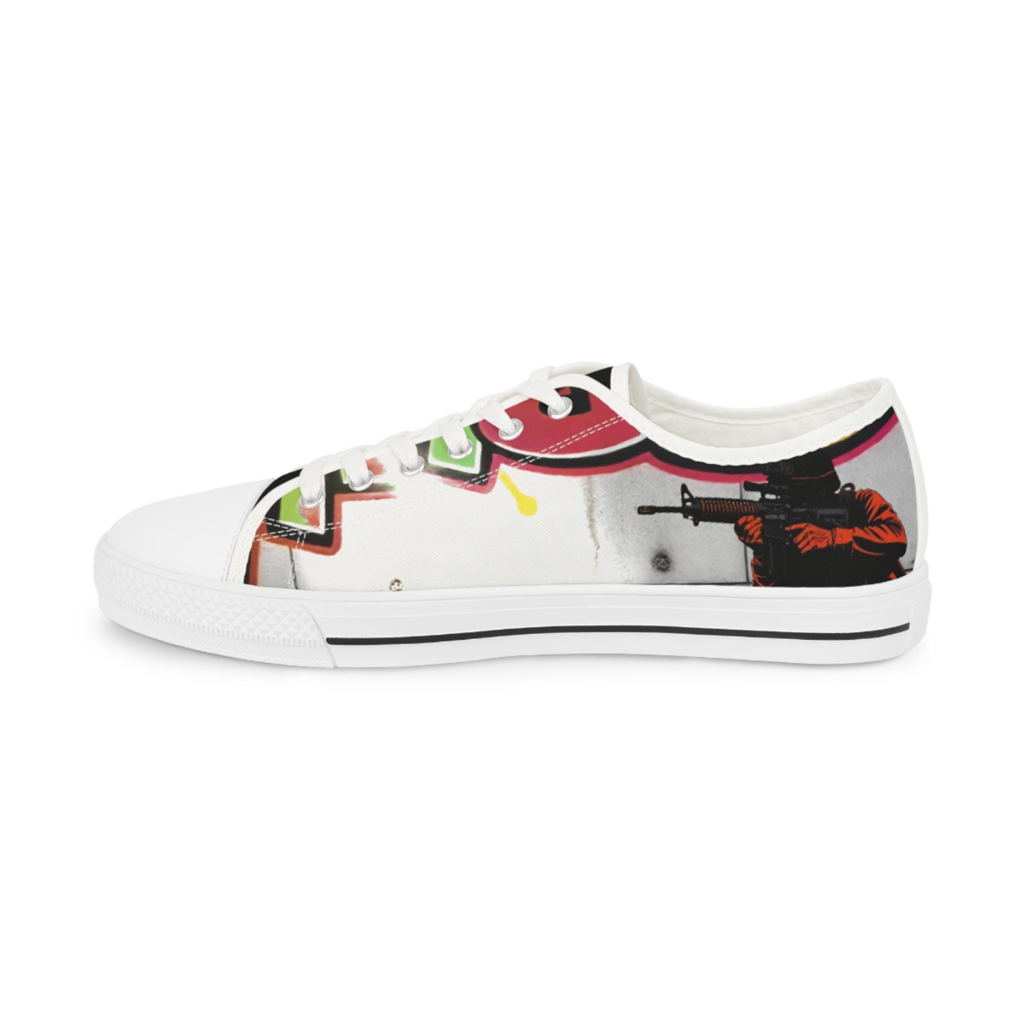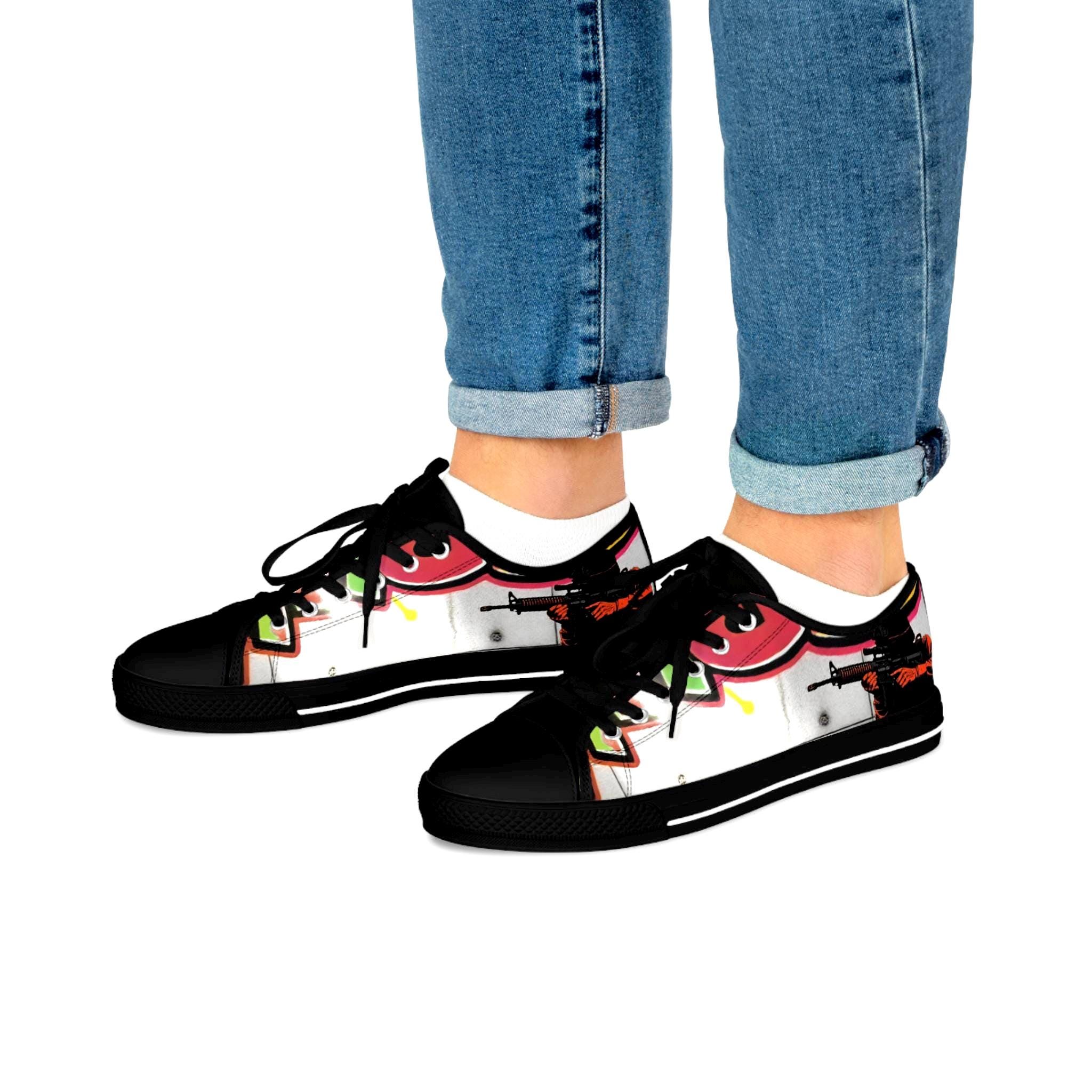 These low-top canvas sneakers carry bold, streetwise energy—think hand-painted mural mixed with skate-culture flair. The wraparound print flows from tongue to heel, where pops of magenta, lime, and graphite create a lively, slightly gritty composition. They feel light underfoot, cushion each step, and age into lived-in favorites that pair effortlessly with lived-in denim, cuffed chinos, or a band tee. Wear them to afternoon skate sessions, gallery walks, or late-night meetups; they bring color and attitude without shouting.