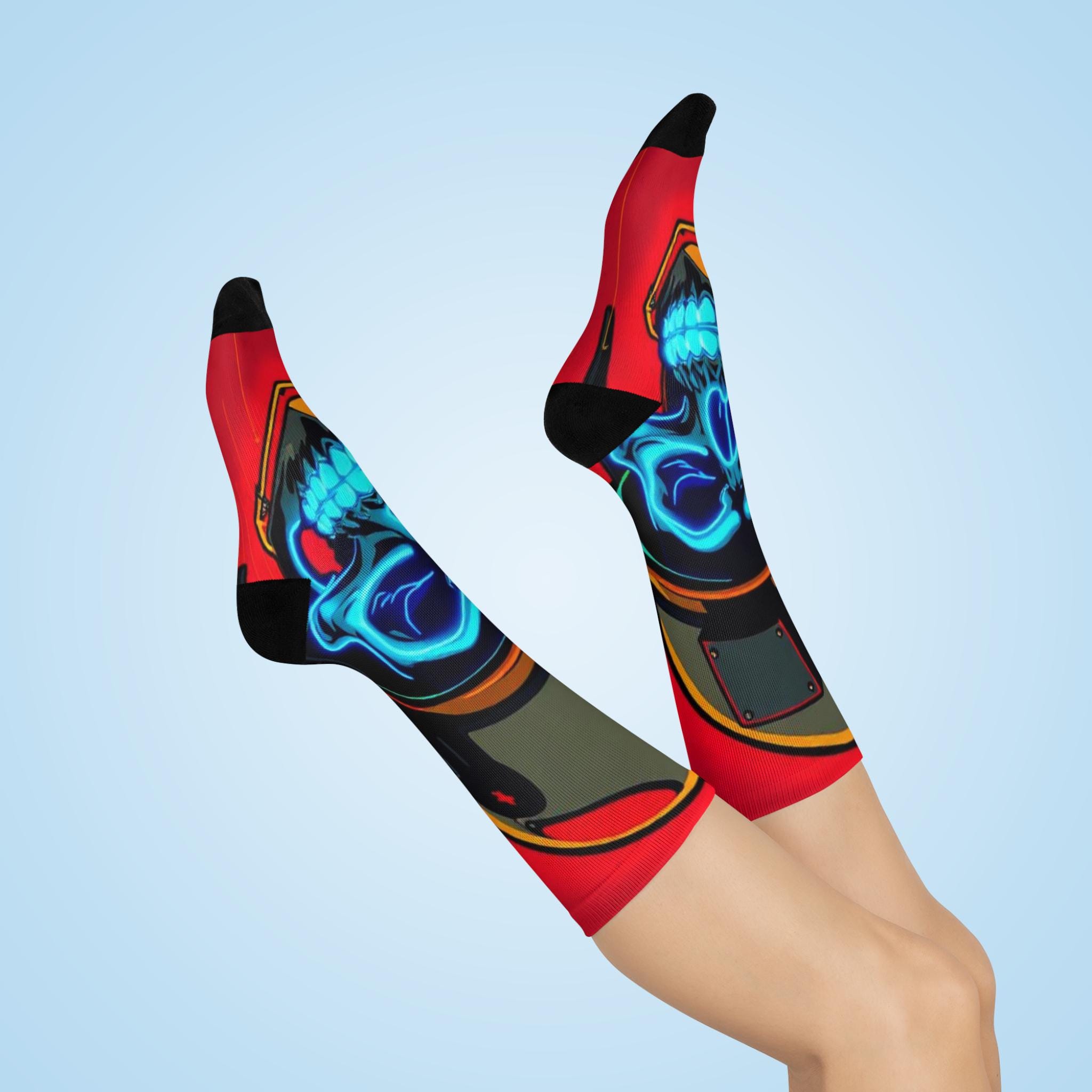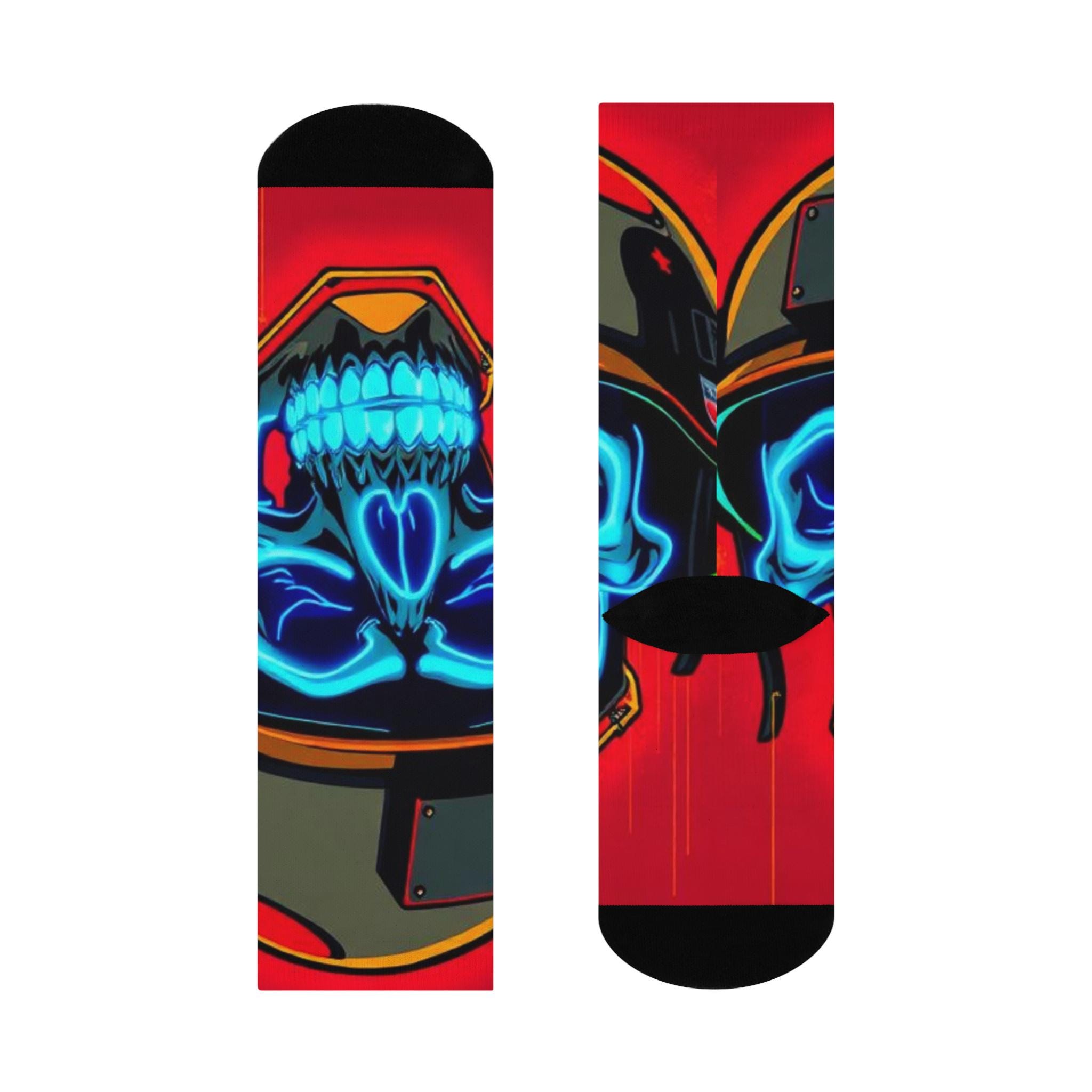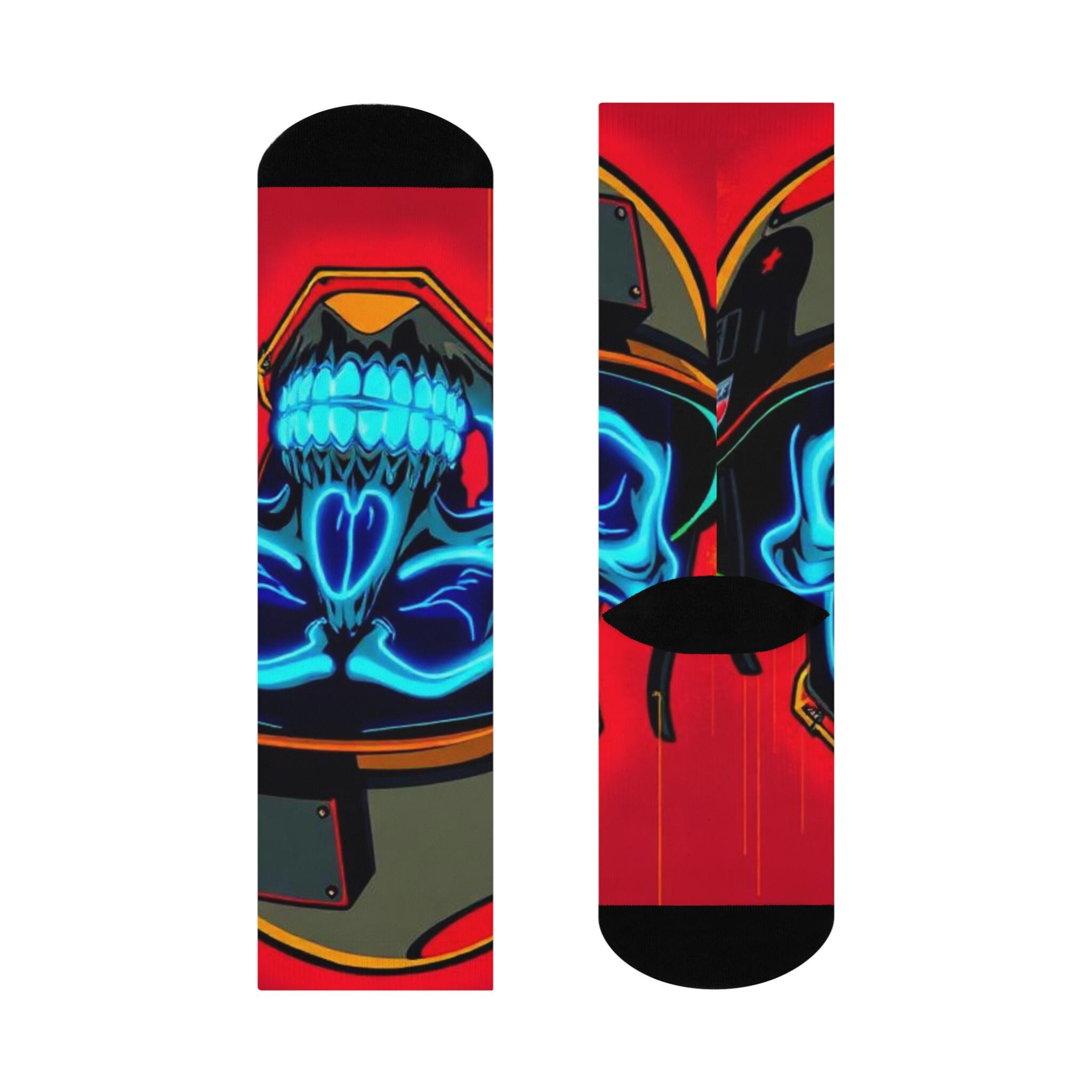 Bold, vibrant crew socks that bring street-edge art to everyday wear. These cushioned crew socks feature an all-over print of a neon blue skull against a rich red background, framed by helmet and metallic accents — a look that reads equal parts retro racer and urban graffiti. The soft, stretchy knit hugs the calf while the cushioned soles keep steps comfortable whether you’re on a long shift, a city walk, or chilling with friends. Bright, high-resolution colors hold up wash after wash, so the design stays striking through regular wear. Slip them on to add an unexpected pop to jeans, sneakers, or a layered outfit — they’re for people who like their accessories loud, durable, and a little rebellious.