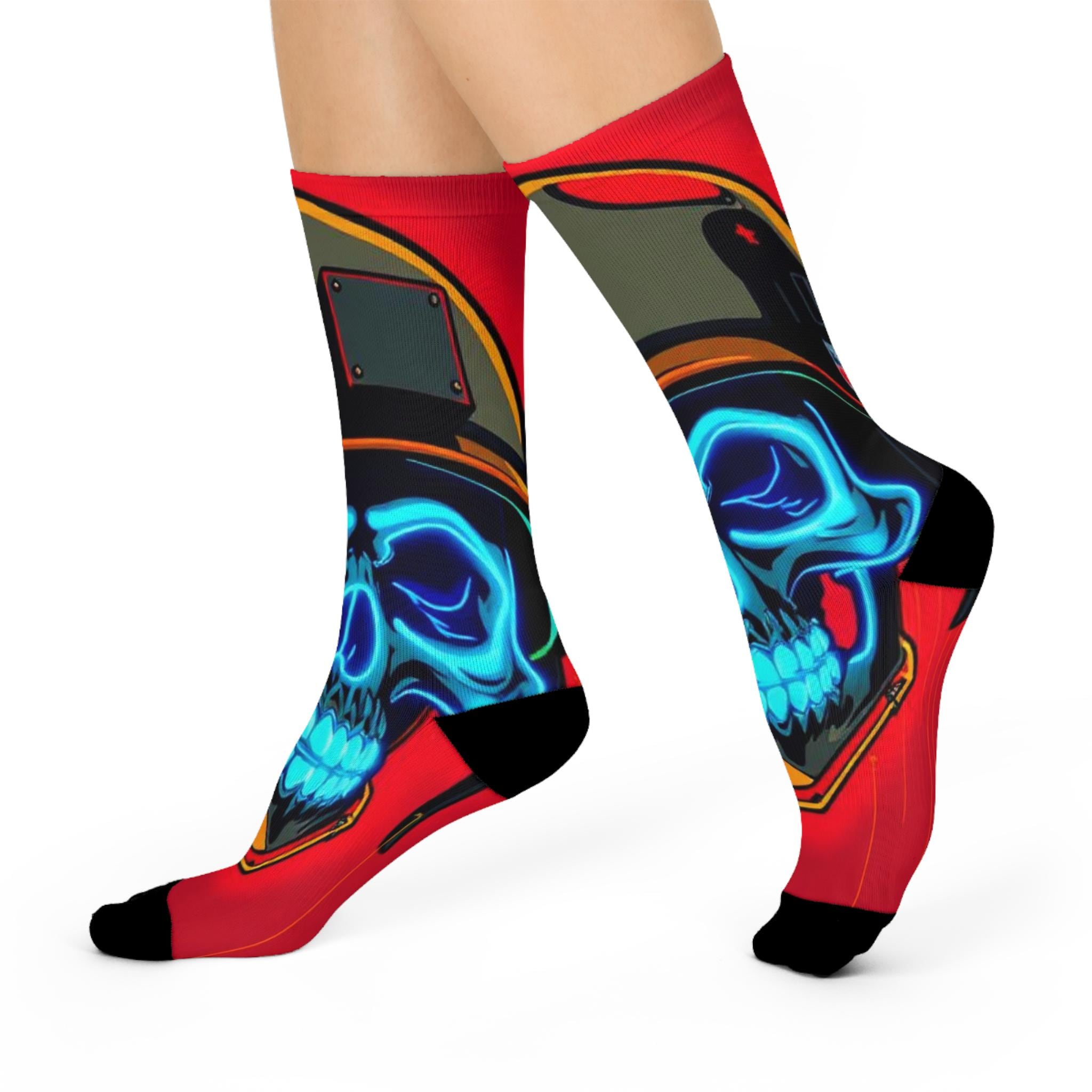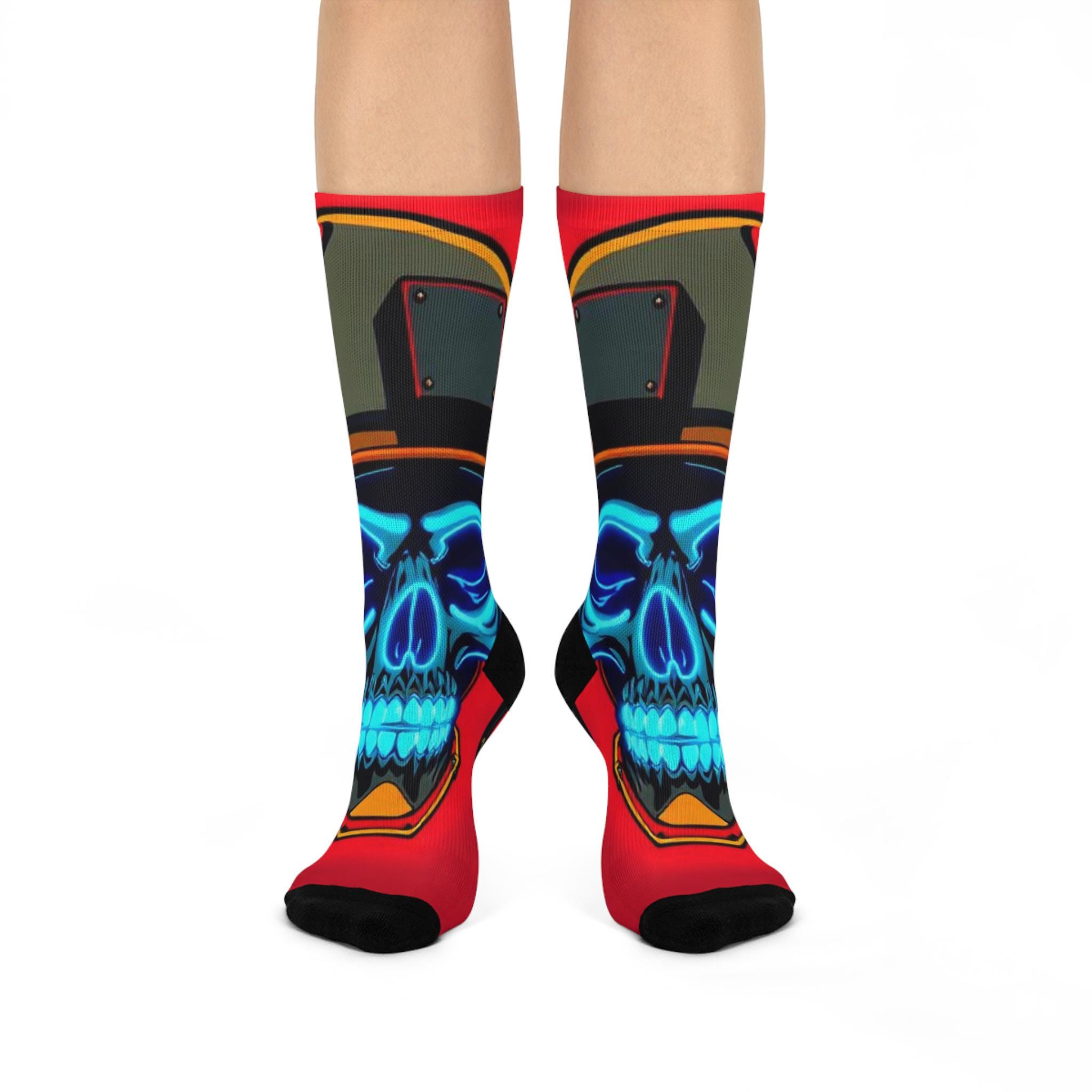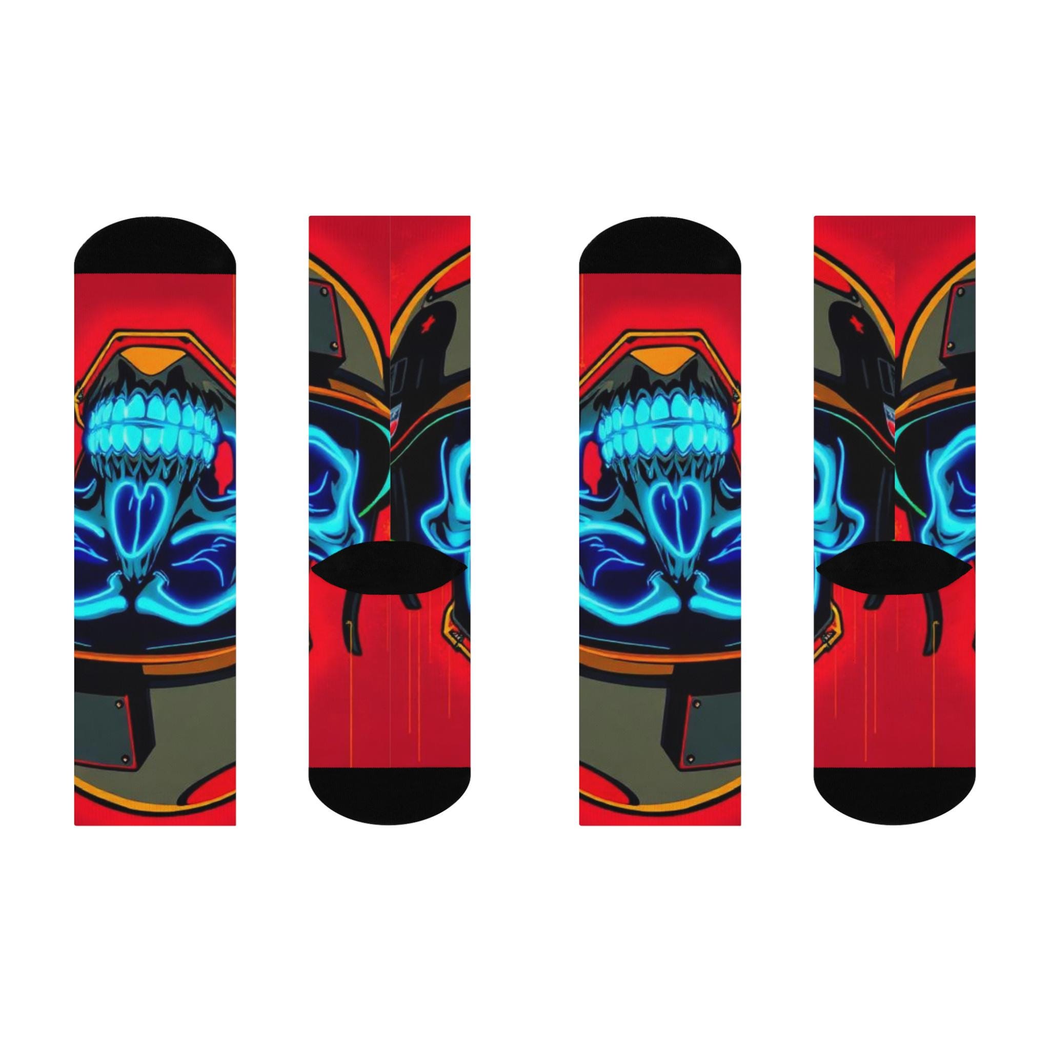 Bold, vibrant crew socks that bring street-edge art to everyday wear. These cushioned crew socks feature an all-over print of a neon blue skull against a rich red background, framed by helmet and metallic accents — a look that reads equal parts retro racer and urban graffiti. The soft, stretchy knit hugs the calf while the cushioned soles keep steps comfortable whether you’re on a long shift, a city walk, or chilling with friends. Bright, high-resolution colors hold up wash after wash, so the design stays striking through regular wear. Slip them on to add an unexpected pop to jeans, sneakers, or a layered outfit — they’re for people who like their accessories loud, durable, and a little rebellious.