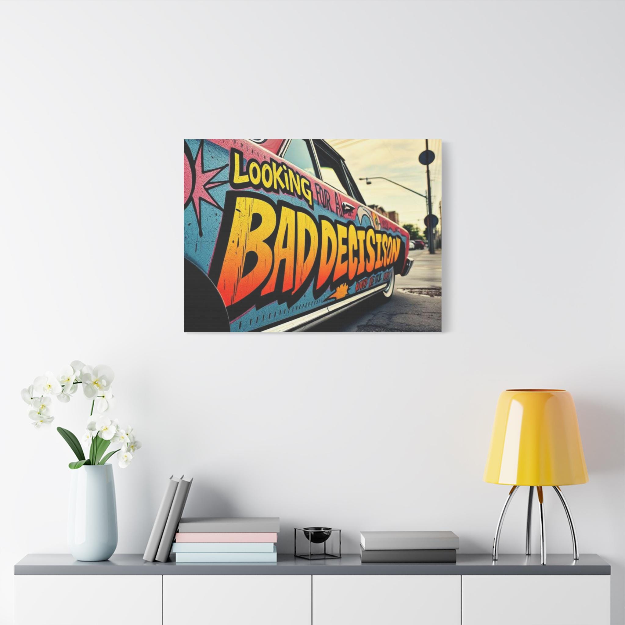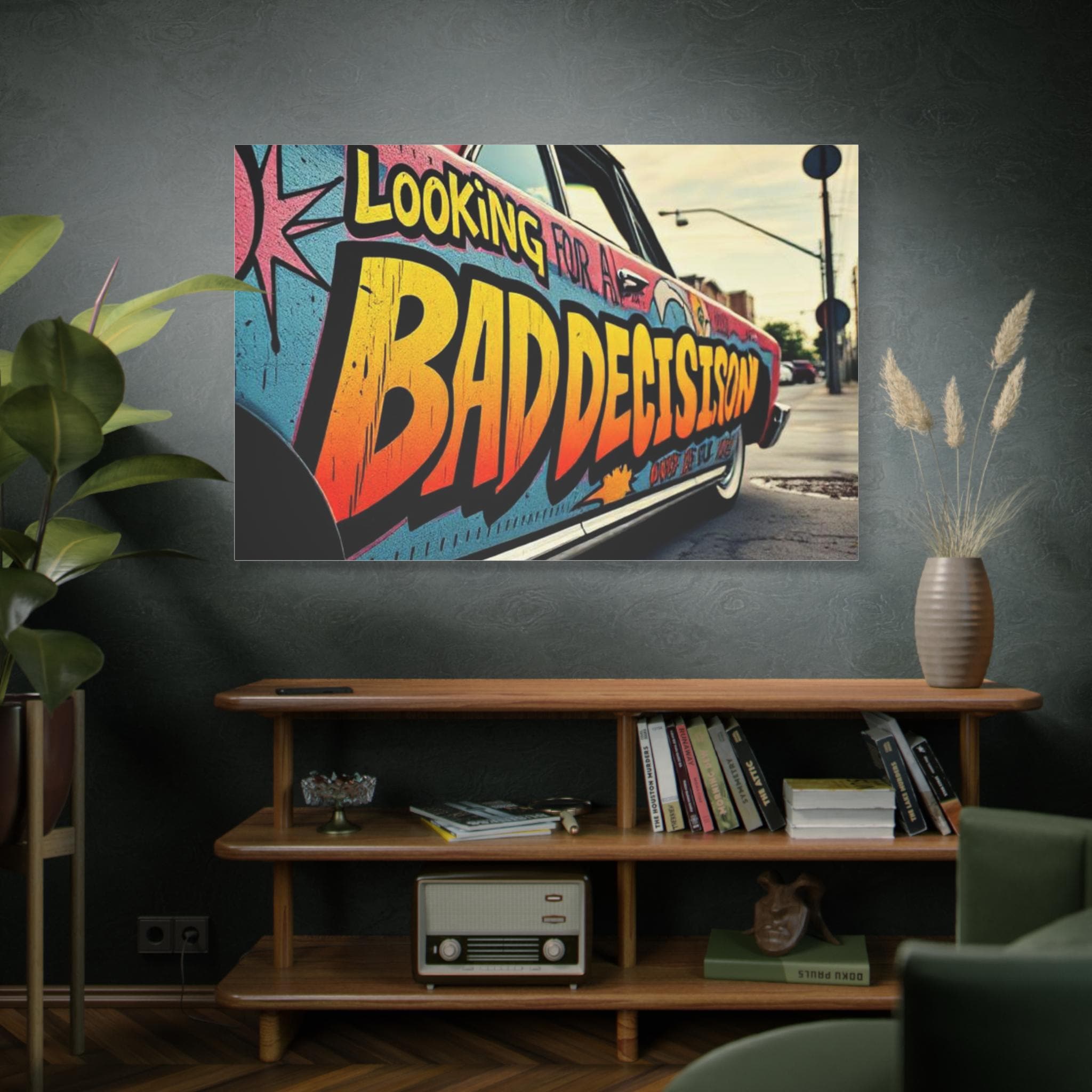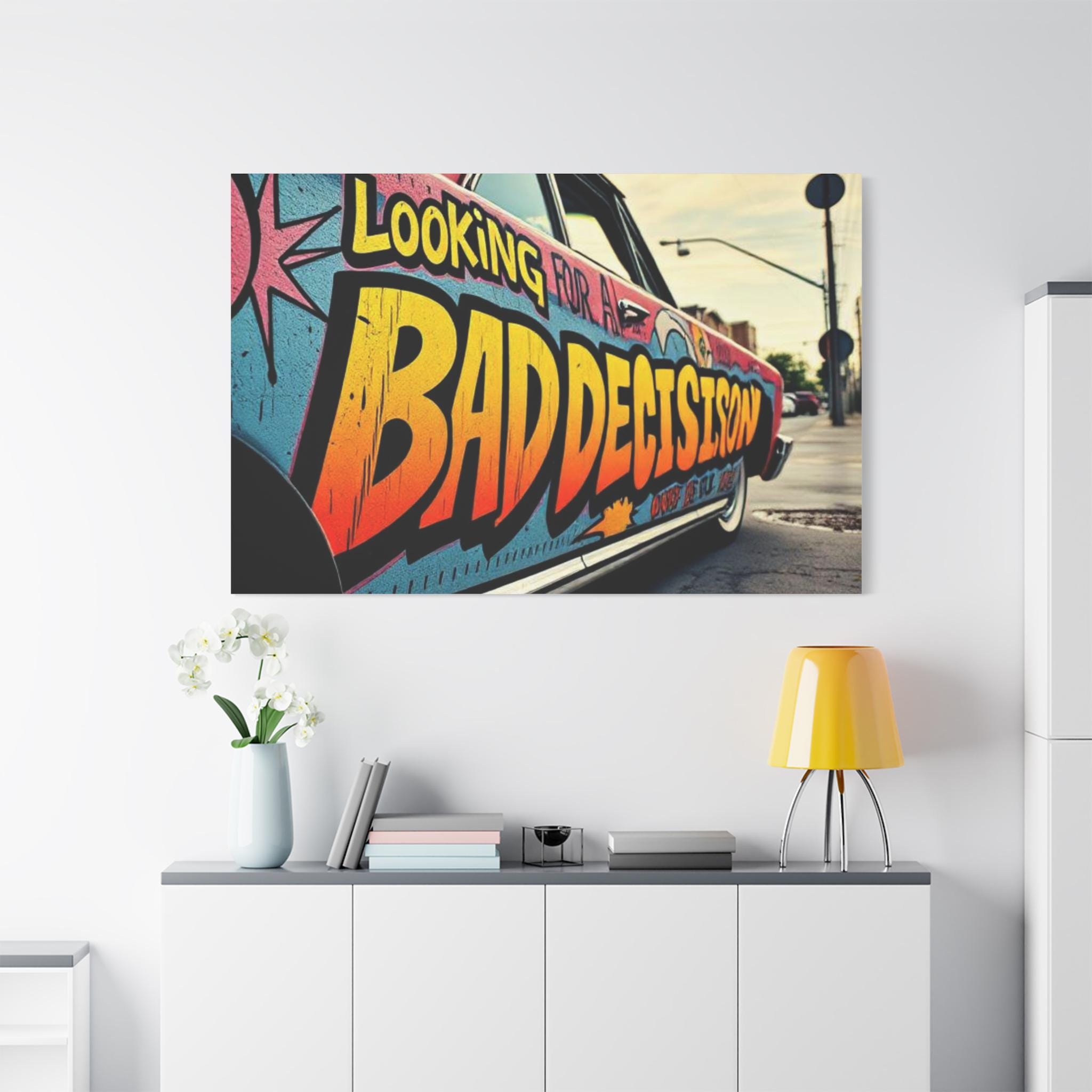 This stretched matte canvas brings streetwise color and attitude to any wall. The close-up shot of a graffiti-covered car reads like a snapshot from an urban road trip — bold lettering, sun-faded tones, and the grit of pavement and light poles in the distance. Mounted on a 1.25" pine profile, the print keeps texture and color true with a special coating and Greenguard Gold latex inks, so the vibrant oranges, teal blues, and weathered blacks stay lively without chemical hazards. Hang it in a studio, loft, or entryway to evoke late-afternoon city runs, mural hunts, and the restless energy of neighborhood streets. The soft rubber dots and included back hanging make installation straightforward, and multiple orientations and sizes let you scale the scene from a snug focal point to a wall-spanning statement.