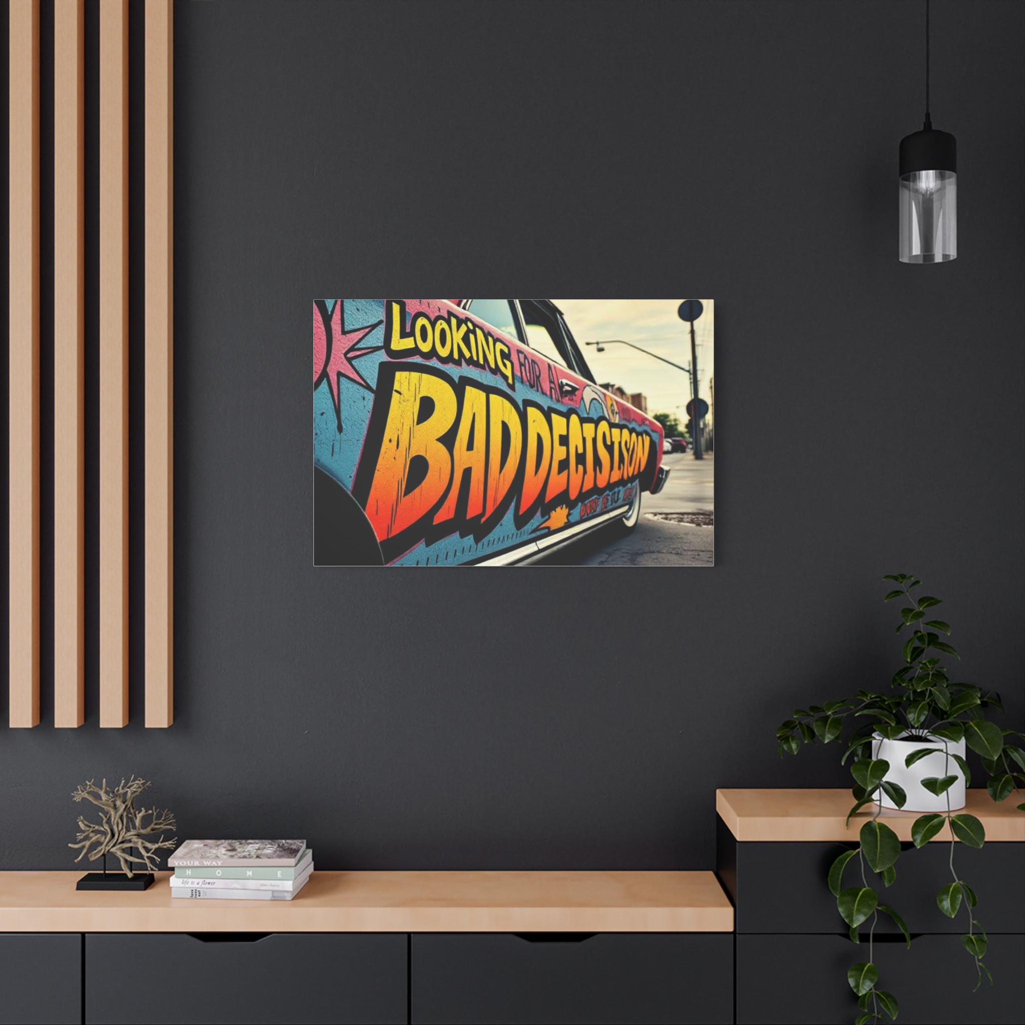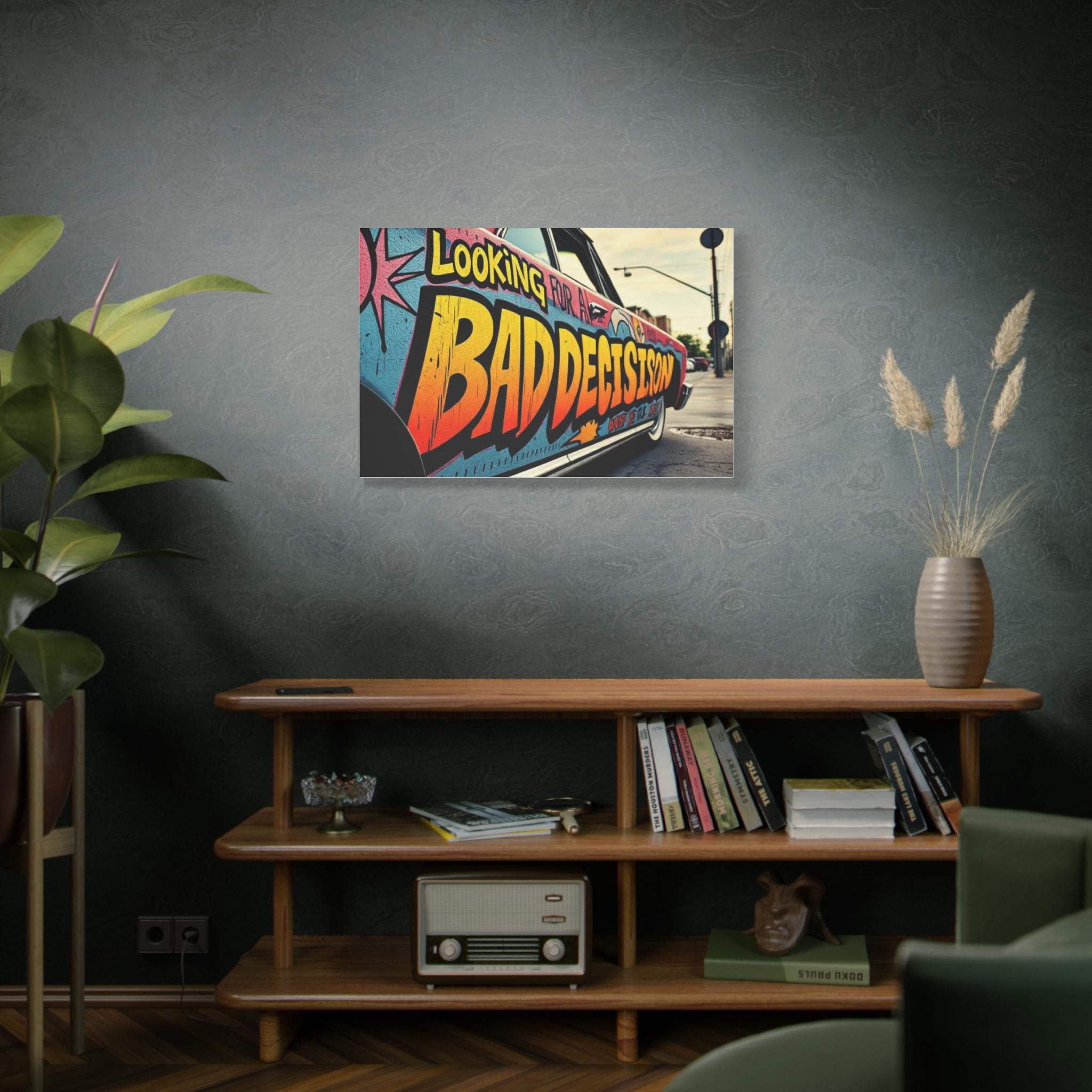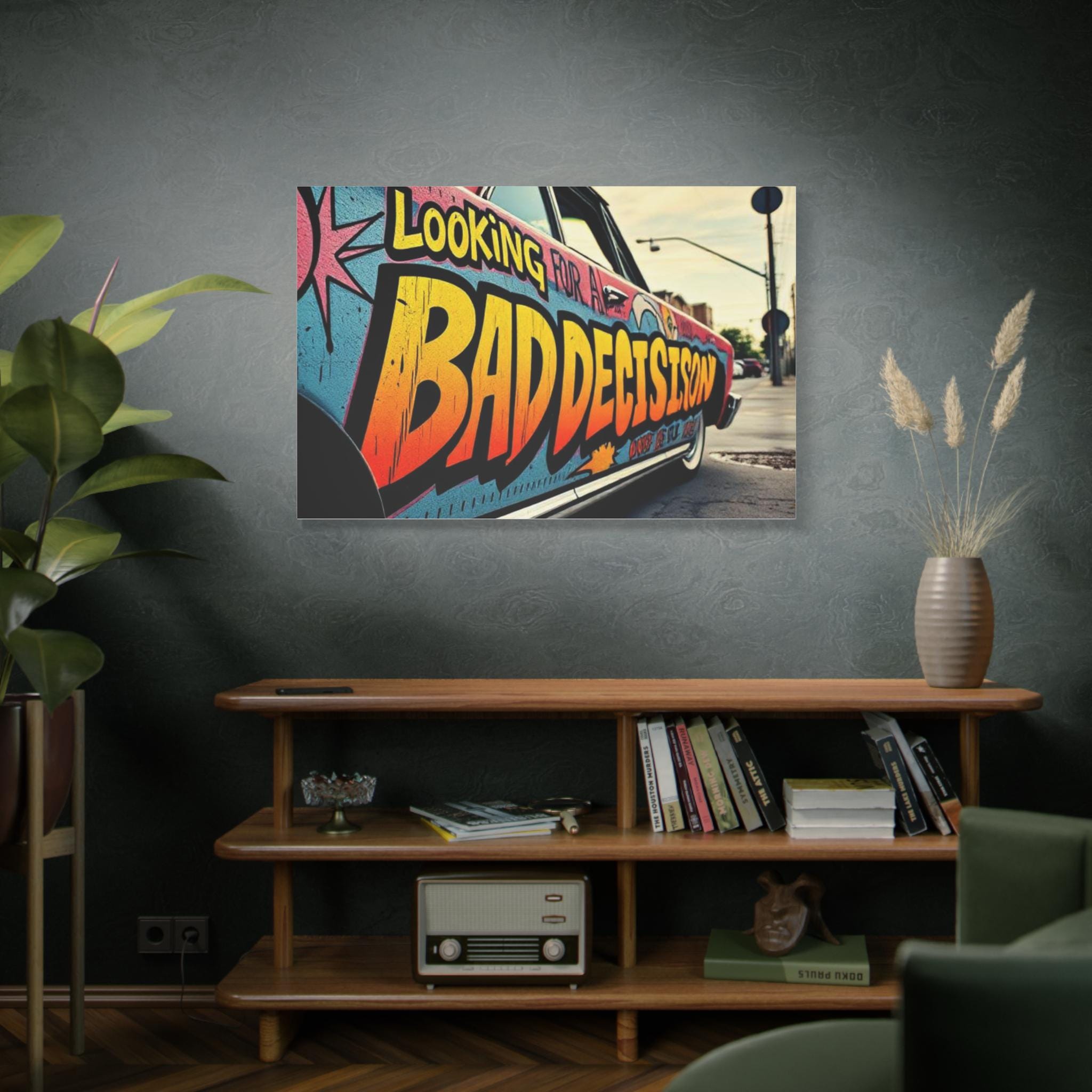 This stretched matte canvas brings streetwise color and attitude to any wall. The close-up shot of a graffiti-covered car reads like a snapshot from an urban road trip — bold lettering, sun-faded tones, and the grit of pavement and light poles in the distance. Mounted on a 1.25" pine profile, the print keeps texture and color true with a special coating and Greenguard Gold latex inks, so the vibrant oranges, teal blues, and weathered blacks stay lively without chemical hazards. Hang it in a studio, loft, or entryway to evoke late-afternoon city runs, mural hunts, and the restless energy of neighborhood streets. The soft rubber dots and included back hanging make installation straightforward, and multiple orientations and sizes let you scale the scene from a snug focal point to a wall-spanning statement.