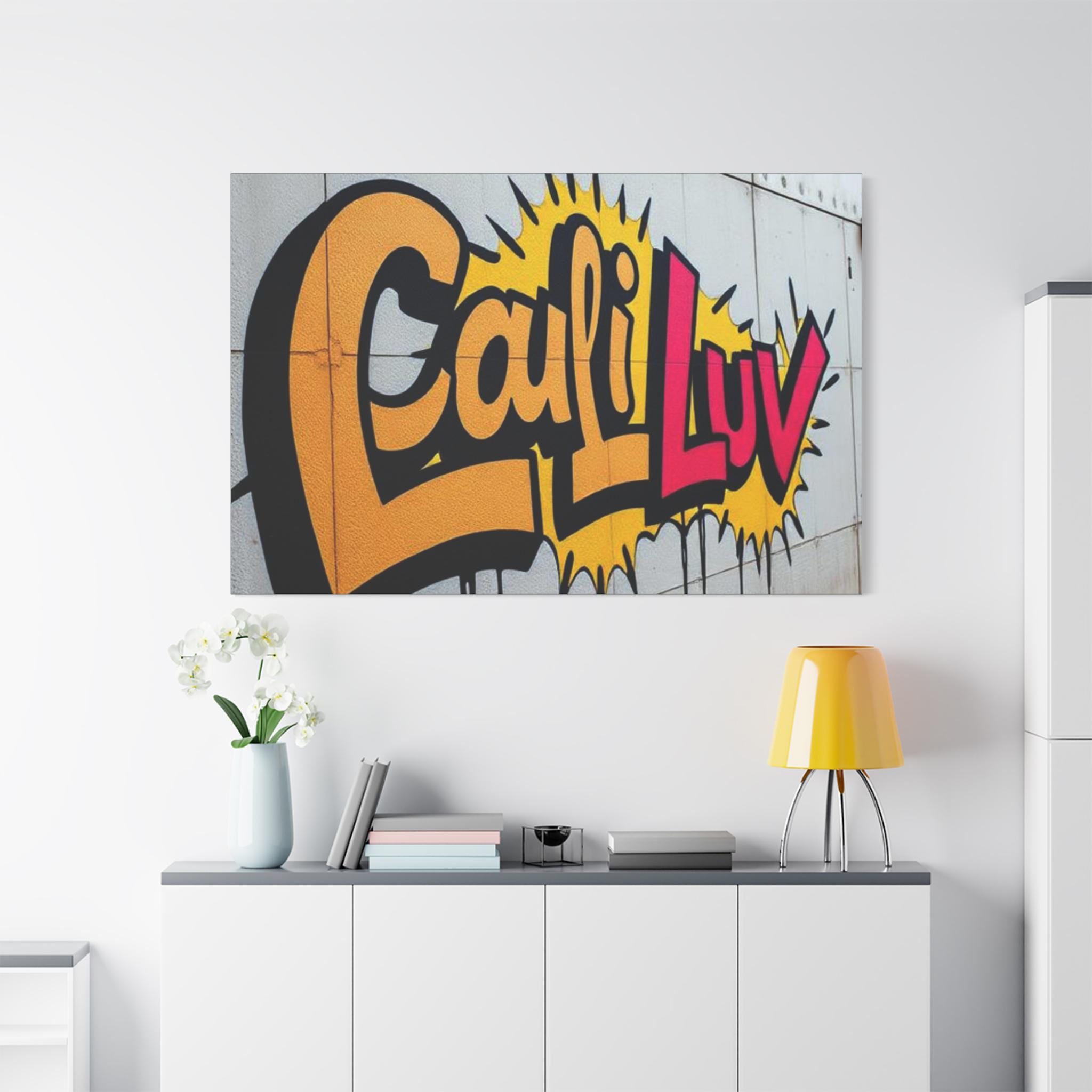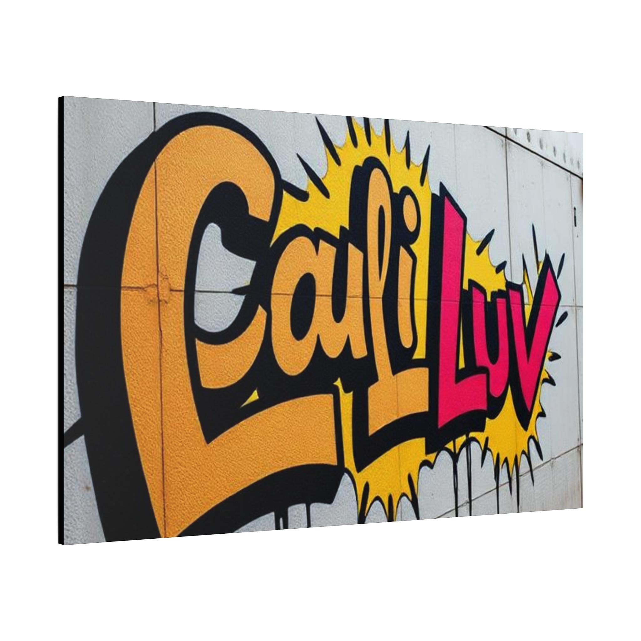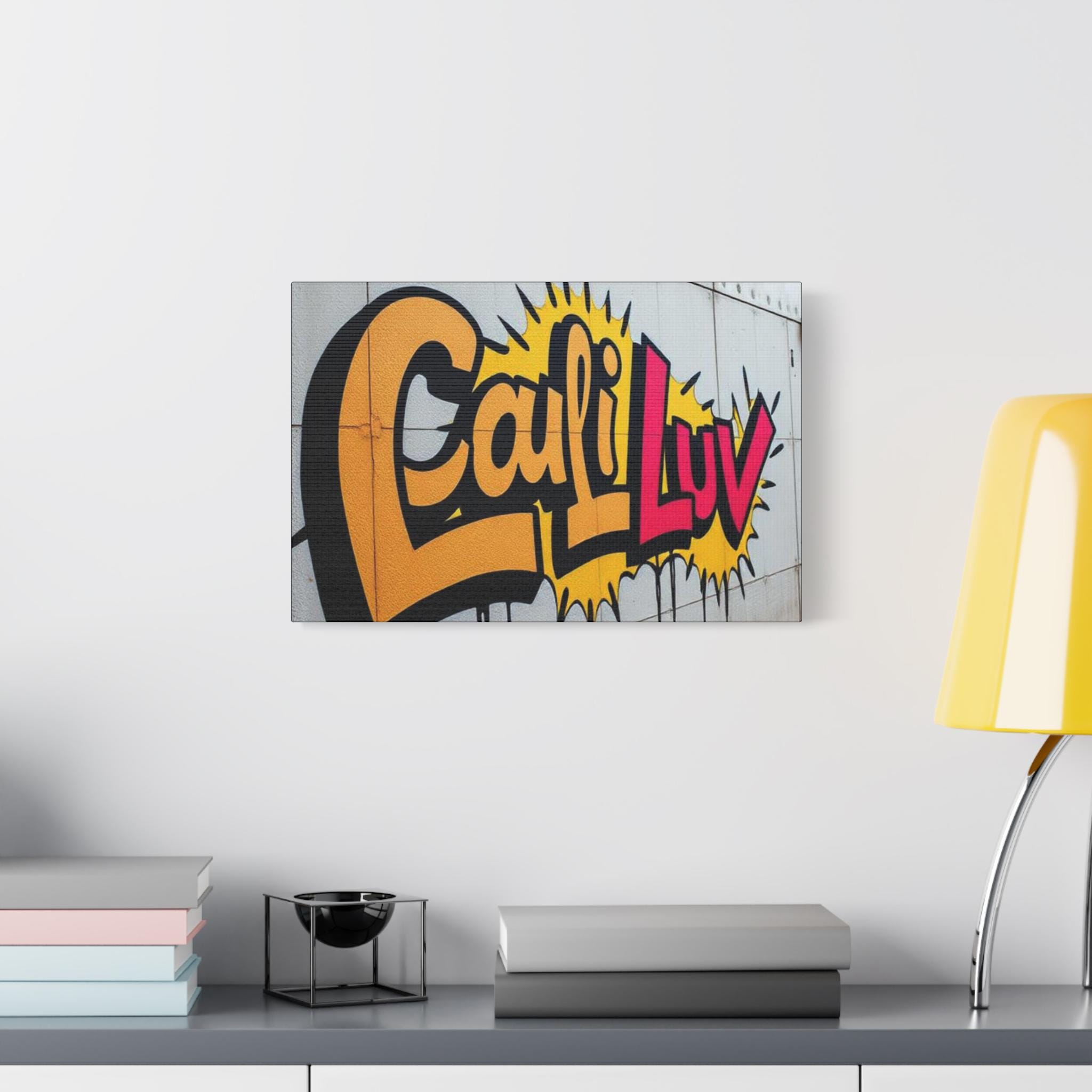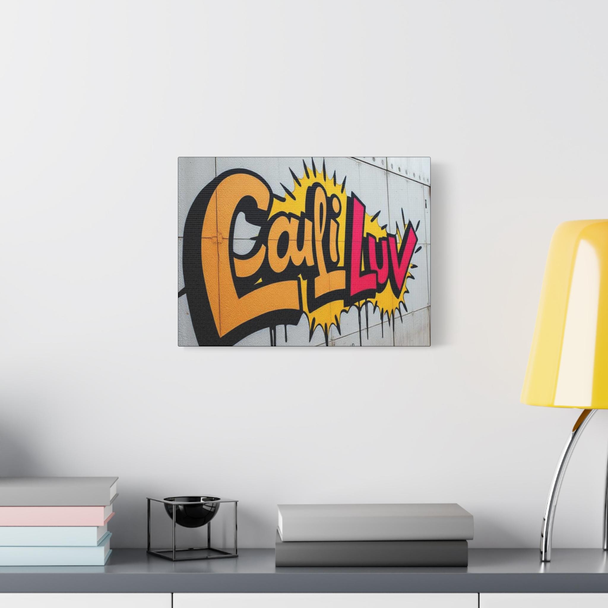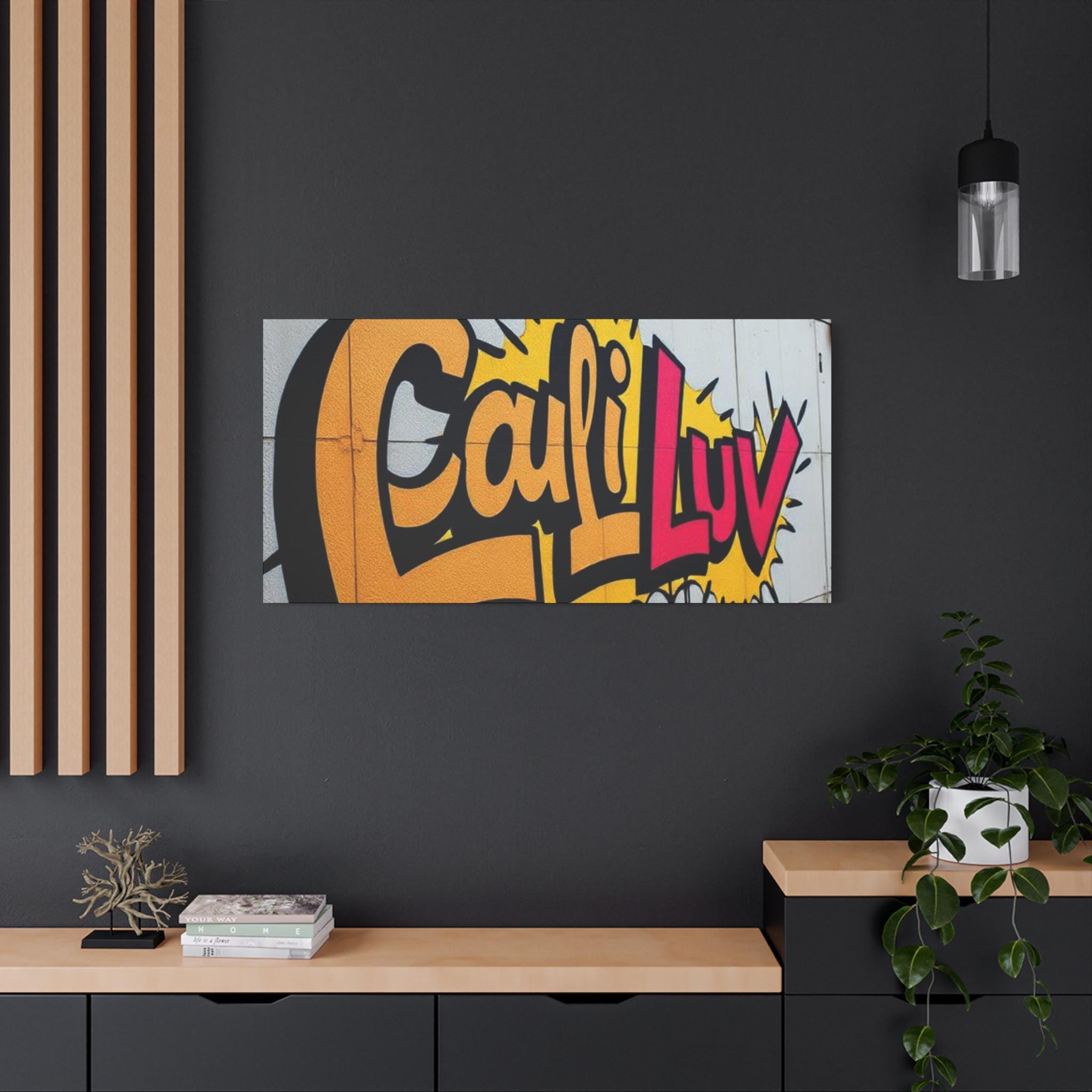 Bright, bold street-art energy captured on matte stretched canvas. This print brings the rush of spray-painted graffiti and sunshine-soaked color into a living room, studio, or hallway. The oversized lettering and comic-style burst read as confident and playful — a piece that livens up neutral walls and sparks conversation. Lightweight yet sturdy, the canvas wraps around a radial pine frame and arrives ready to hang. It sits flush against the wall with soft rubber dots protecting surfaces and keeping the print steady.
