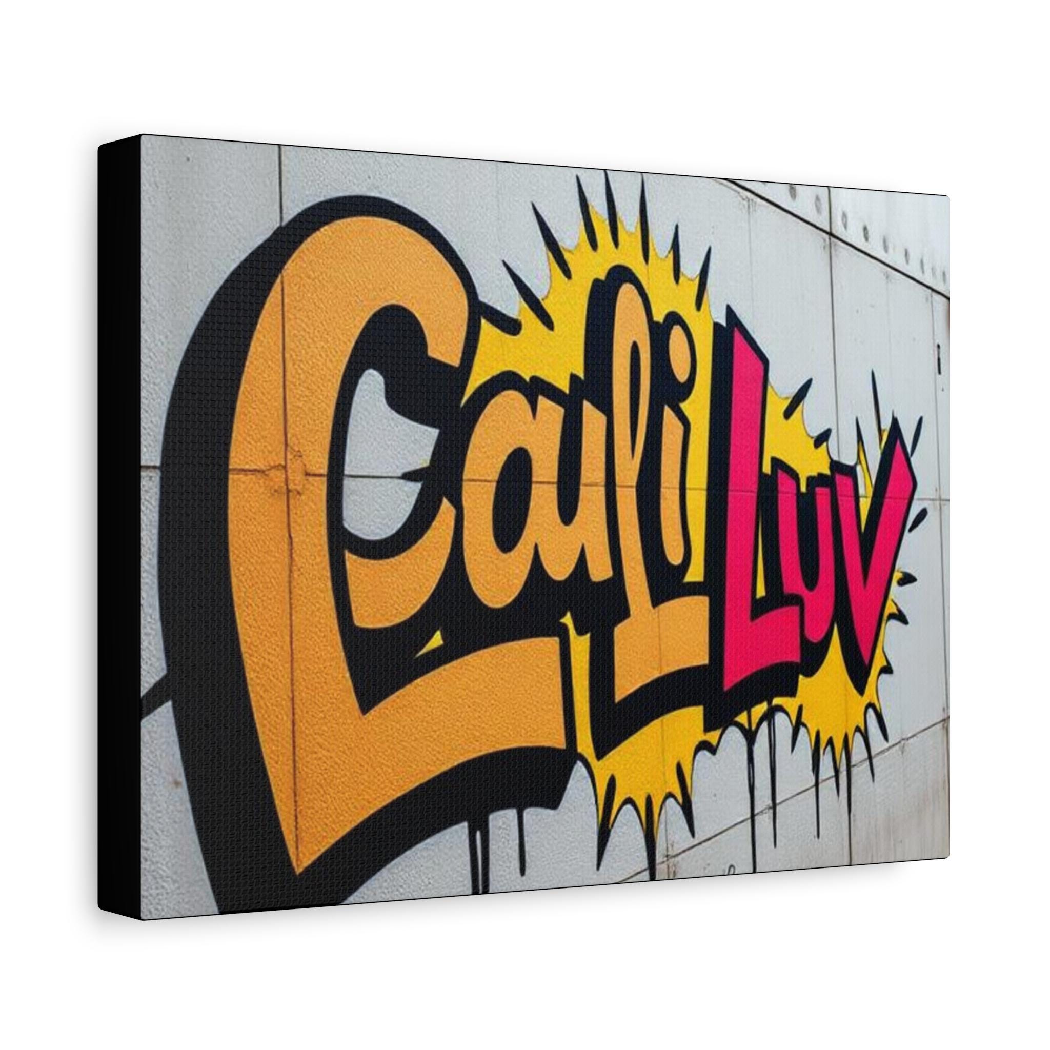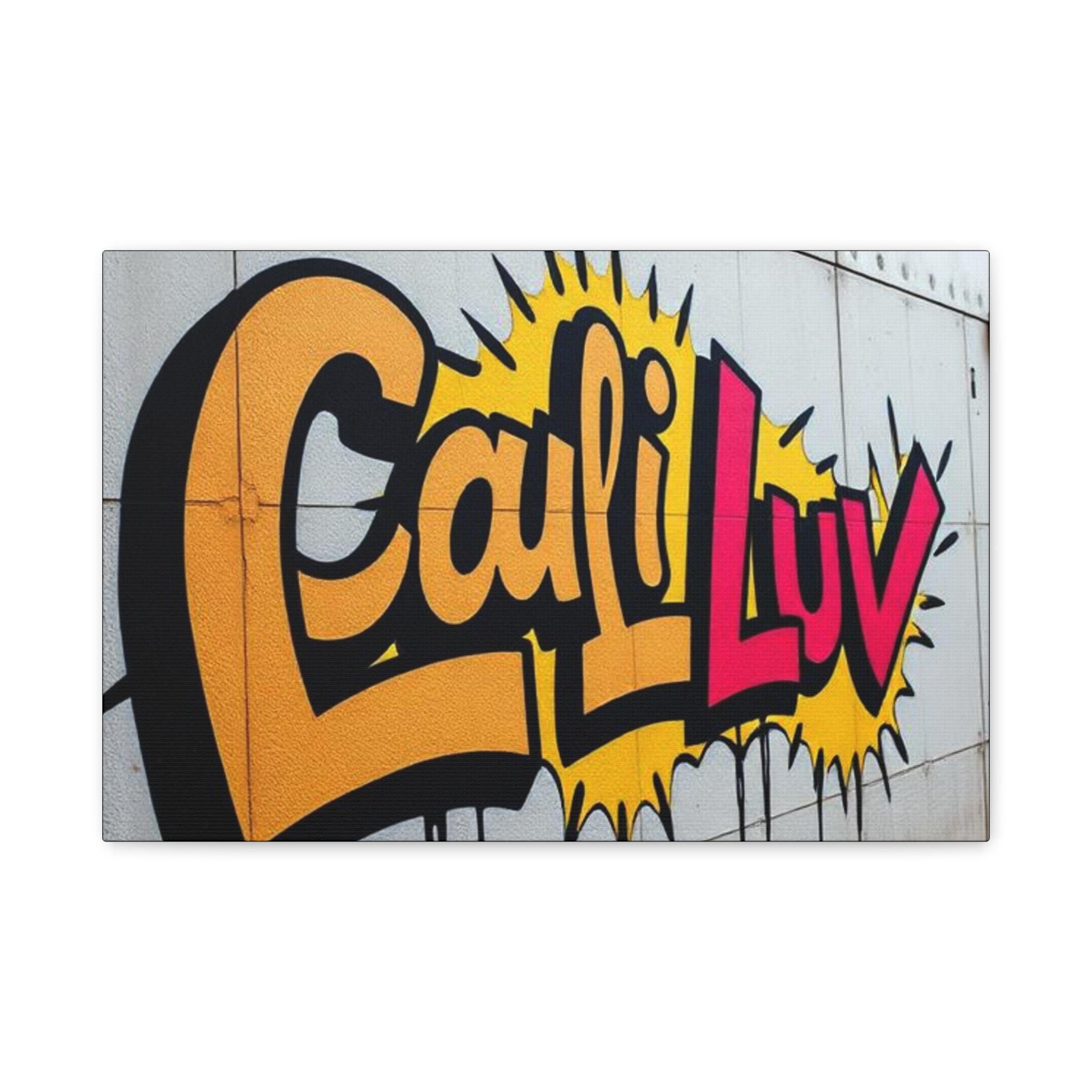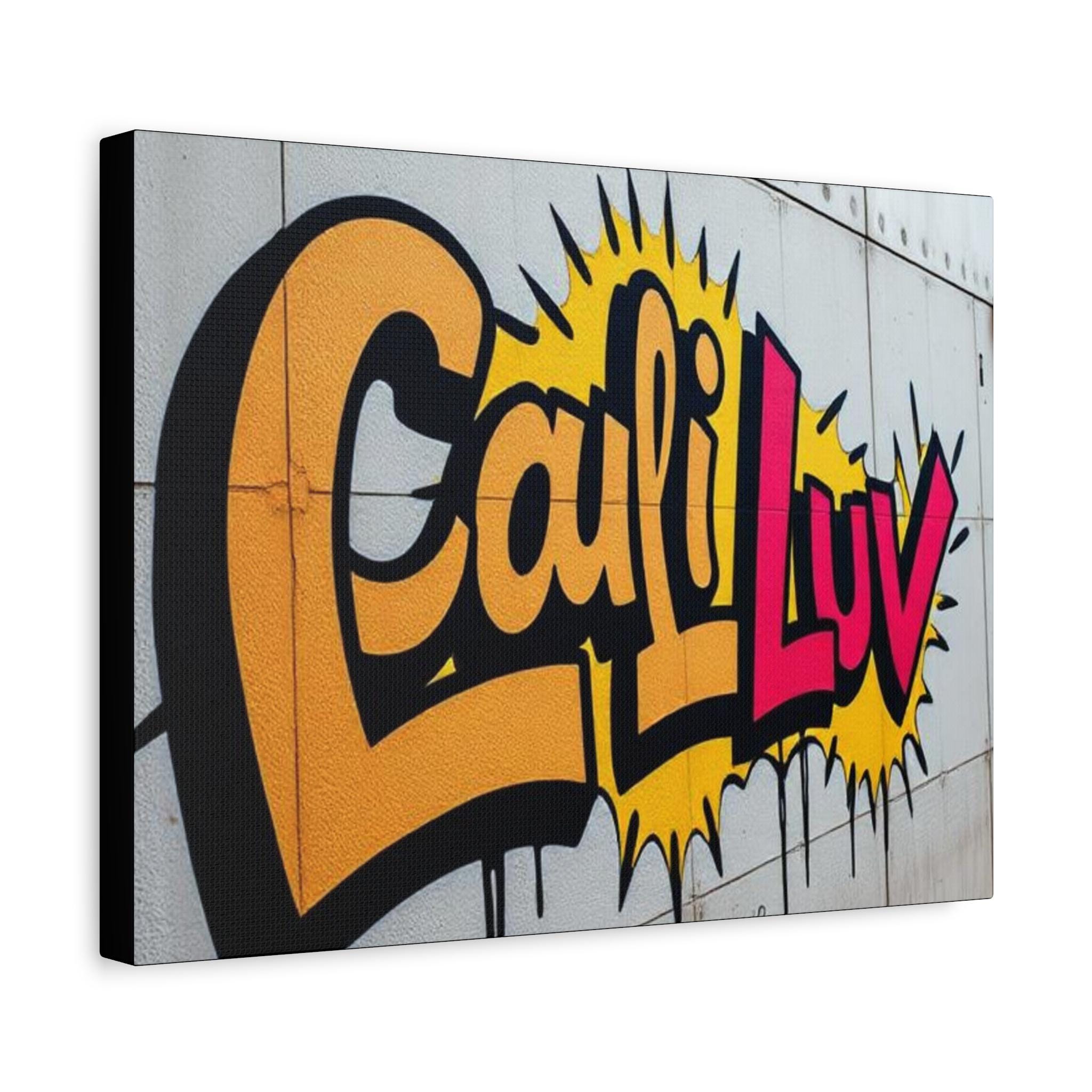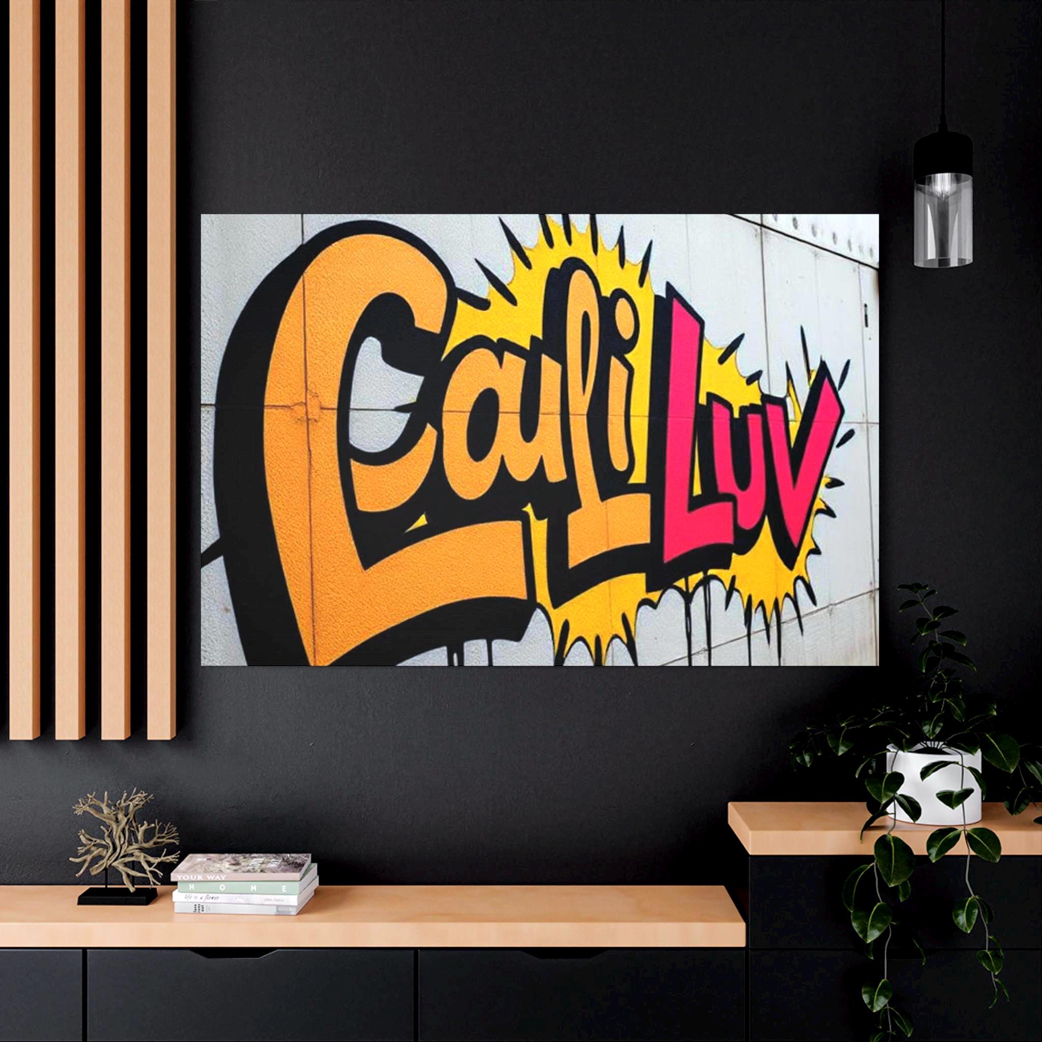 Bright, bold street-art energy captured on matte stretched canvas. This print brings the rush of spray-painted graffiti and sunshine-soaked color into a living room, studio, or hallway. The oversized lettering and comic-style burst read as confident and playful — a piece that livens up neutral walls and sparks conversation. Lightweight yet sturdy, the canvas wraps around a radial pine frame and arrives ready to hang. It sits flush against the wall with soft rubber dots protecting surfaces and keeping the print steady.