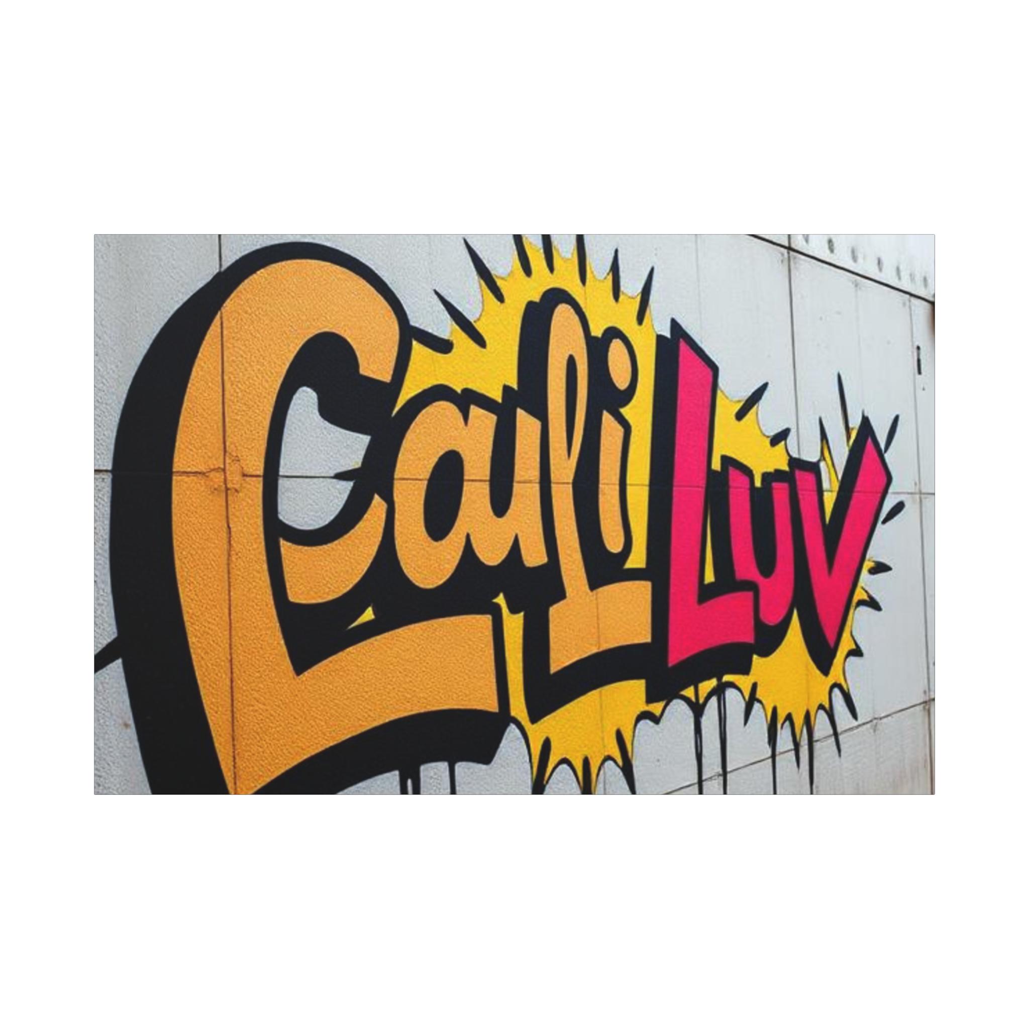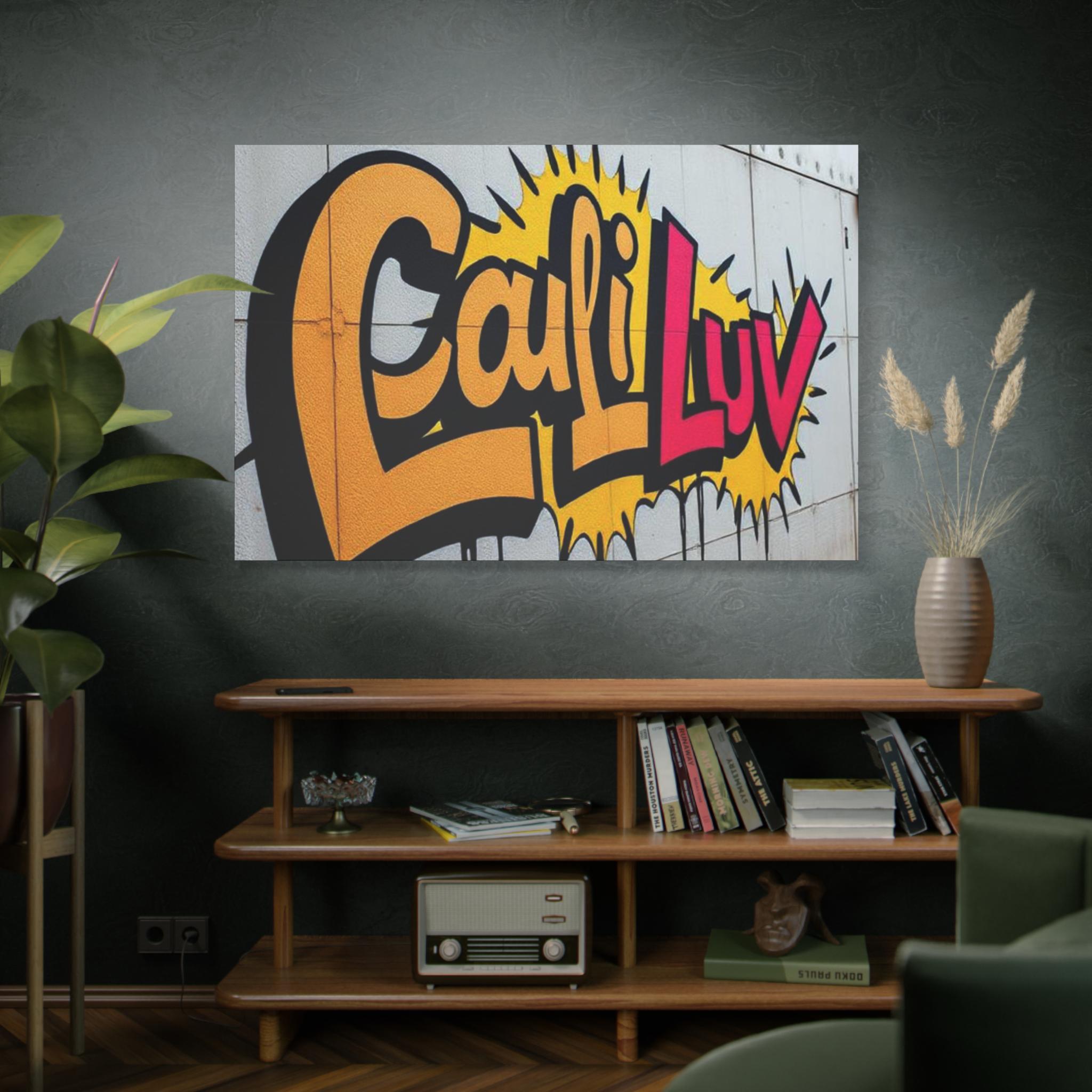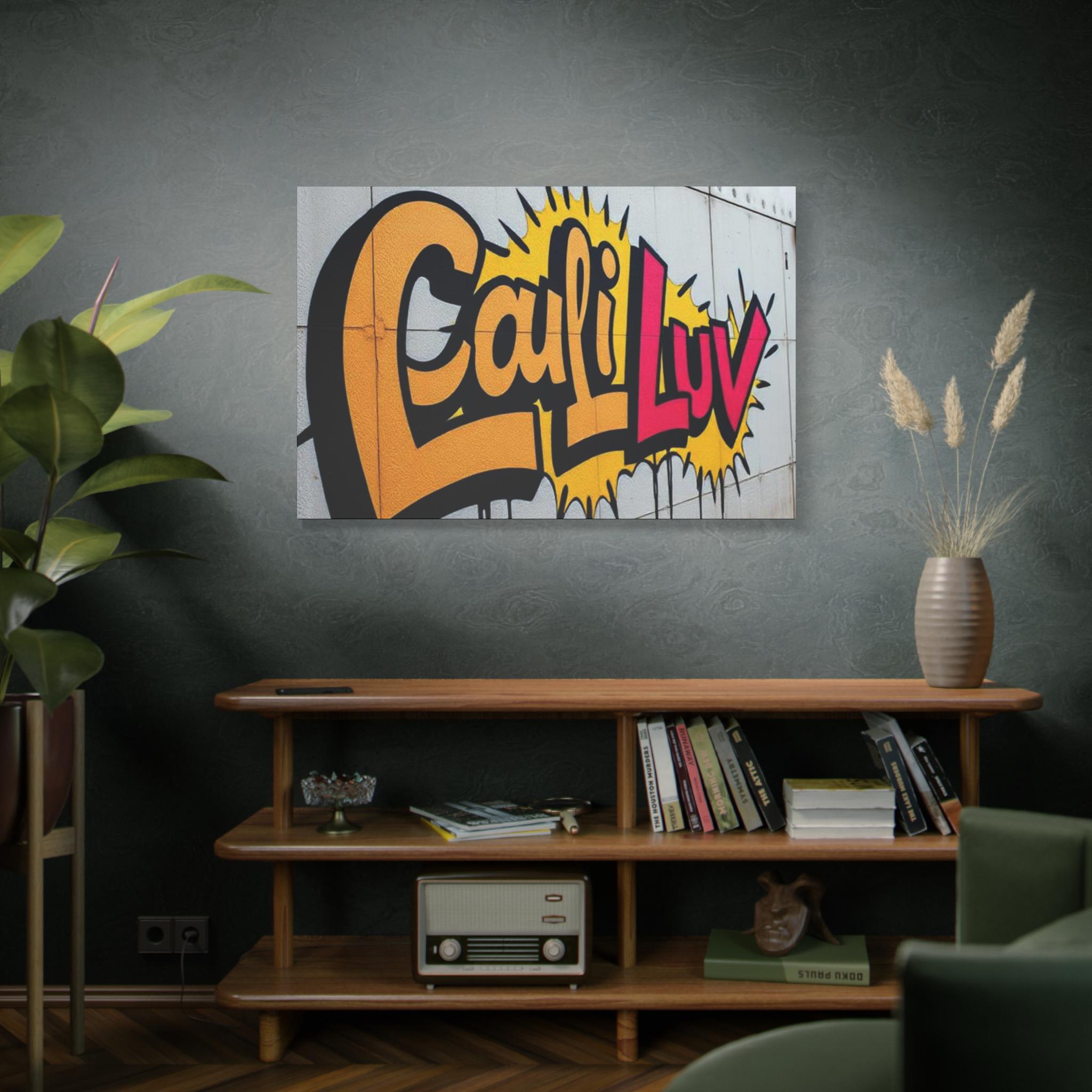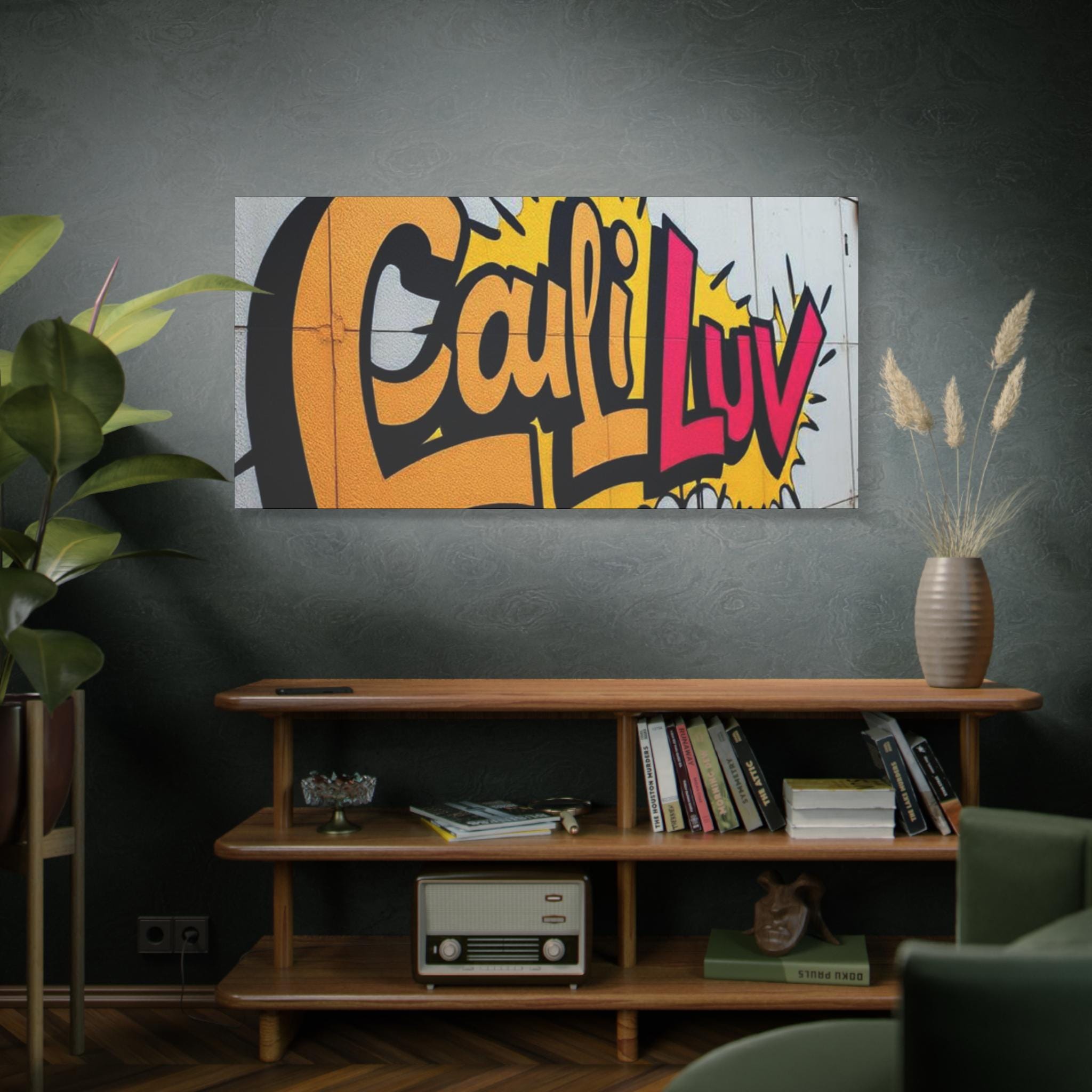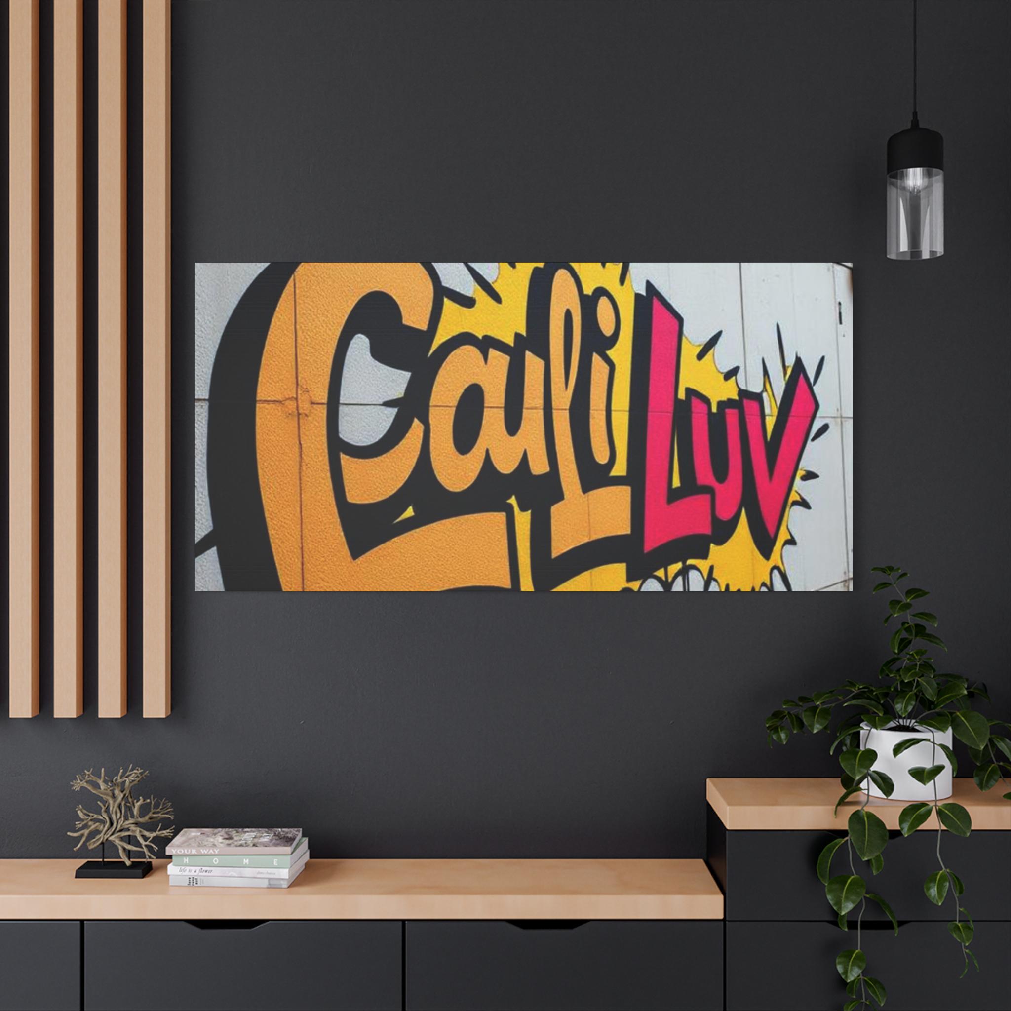 Bright, bold street-art energy captured on matte stretched canvas. This print brings the rush of spray-painted graffiti and sunshine-soaked color into a living room, studio, or hallway. The oversized lettering and comic-style burst read as confident and playful — a piece that livens up neutral walls and sparks conversation. Lightweight yet sturdy, the canvas wraps around a radial pine frame and arrives ready to hang. It sits flush against the wall with soft rubber dots protecting surfaces and keeping the print steady.