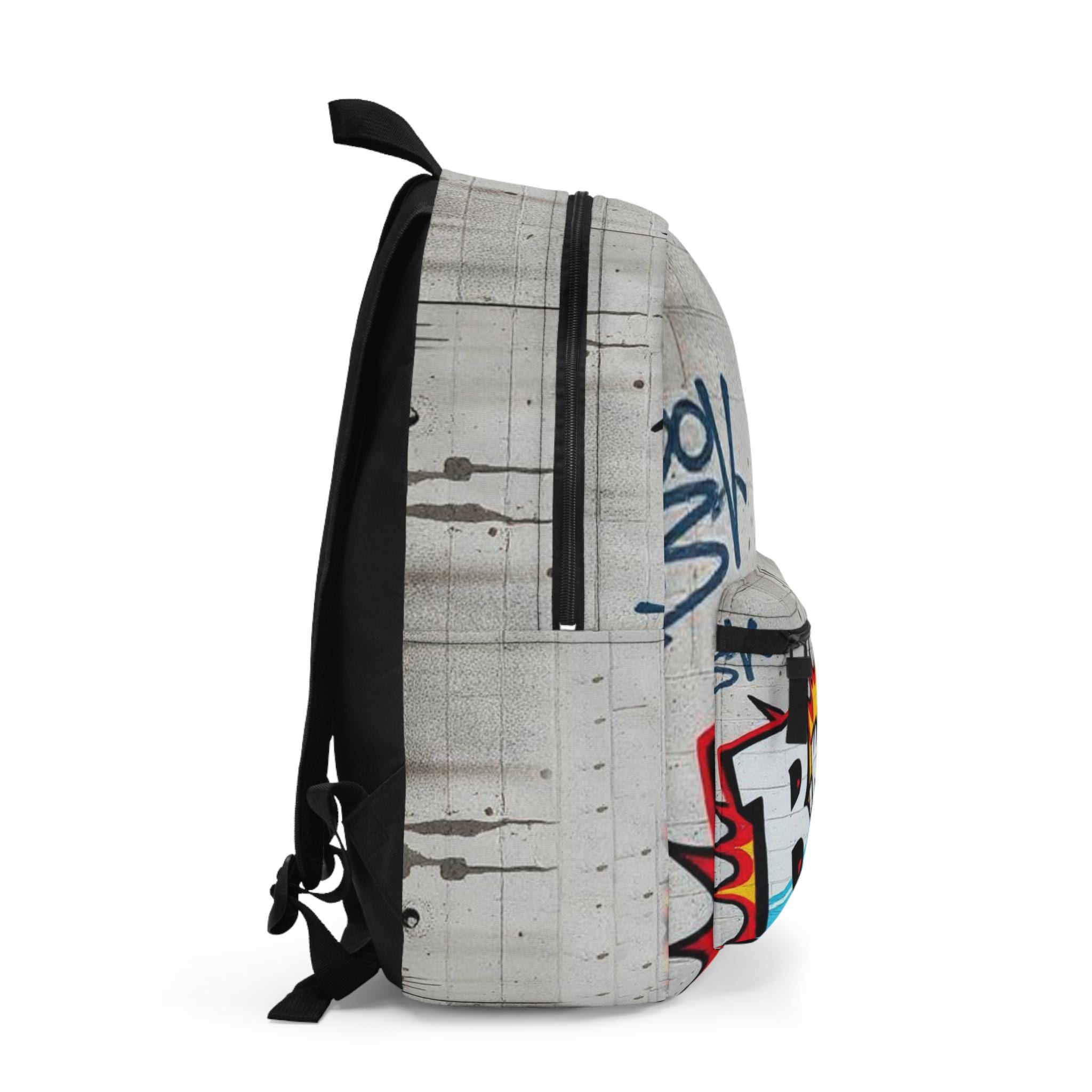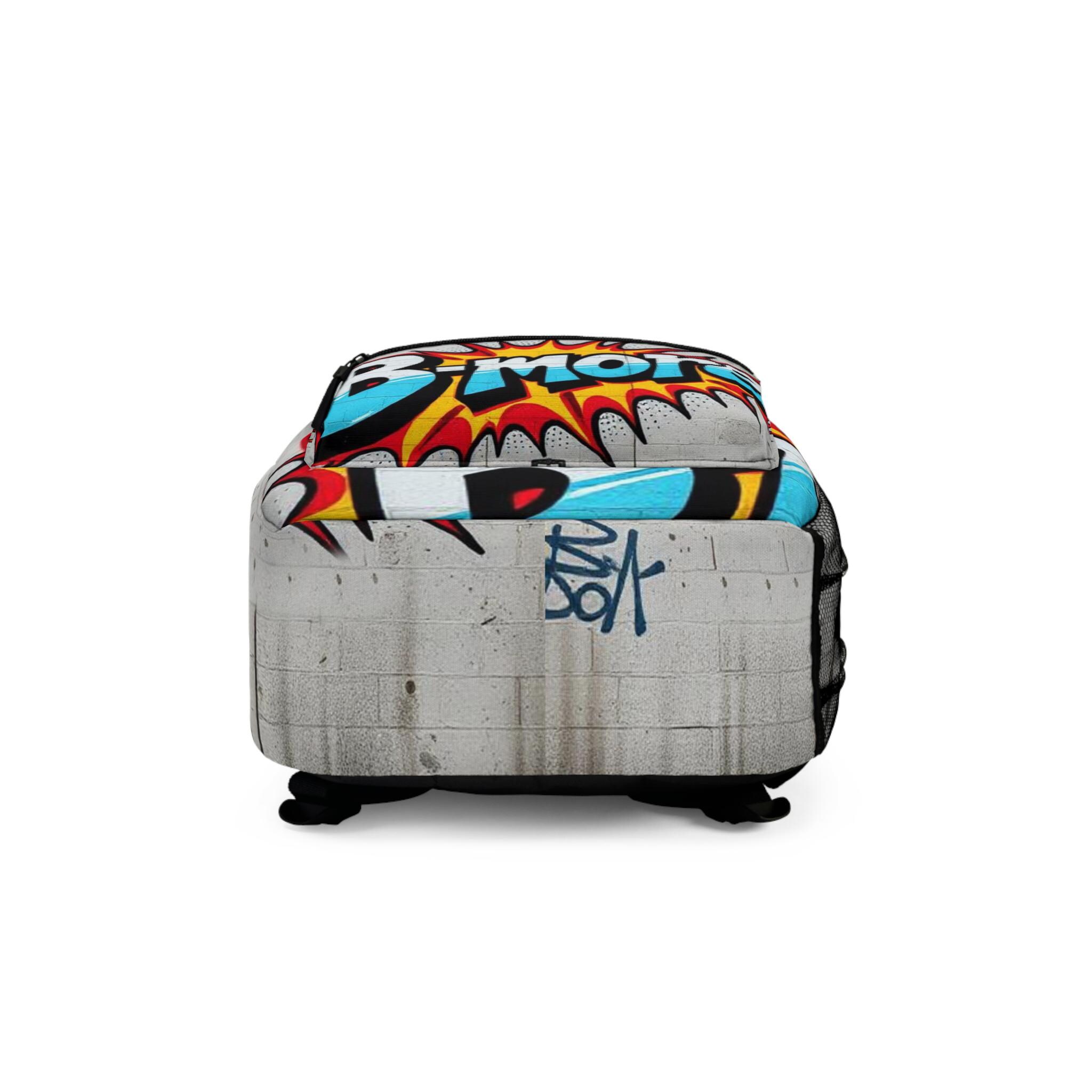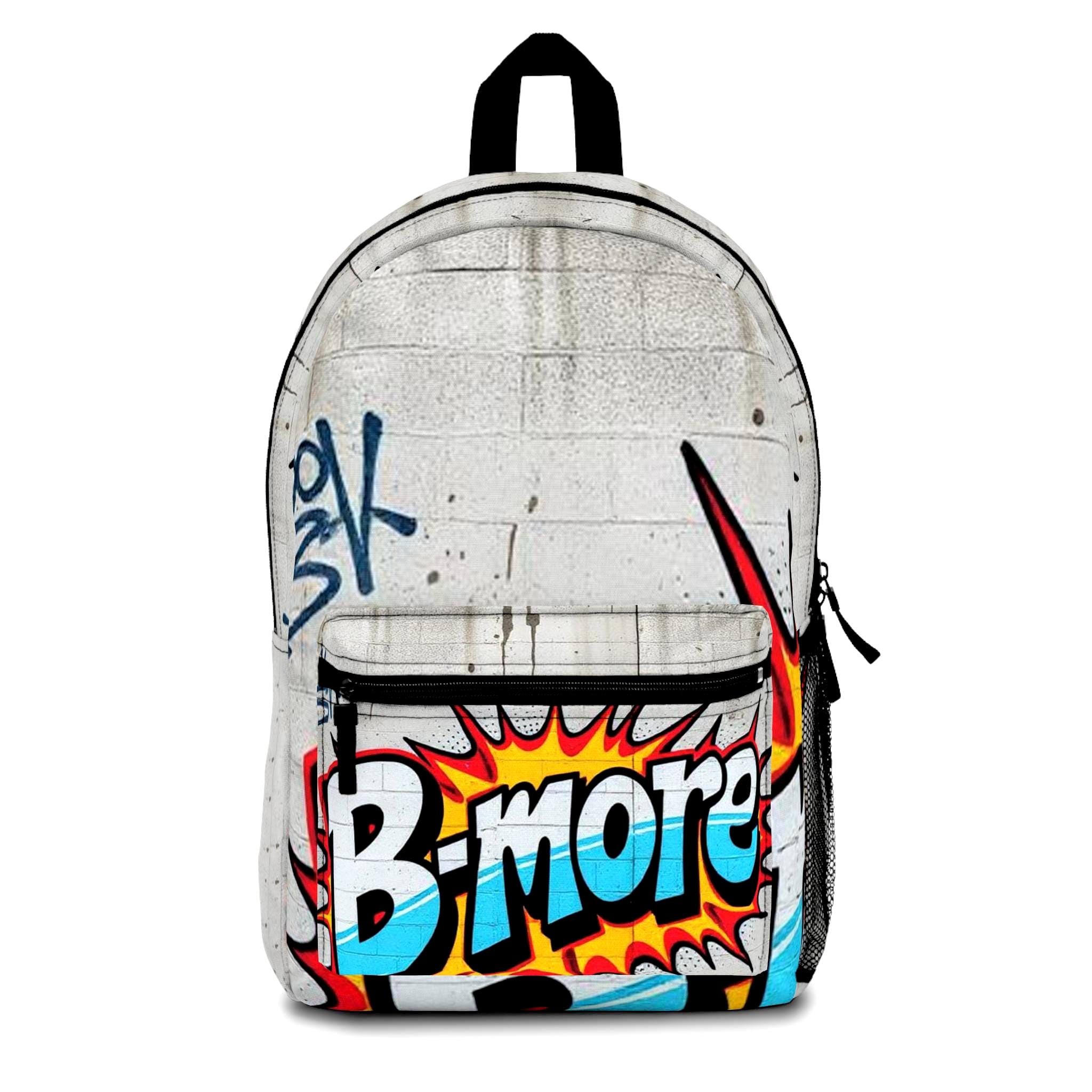This backpack brings street energy to everyday travel. Painted panels mimic a spray-painted brick wall with bold, comic-style lettering that shouts “B-more” in vibrant reds, blues, and yellows. It feels gritty and urban, yet light and practical — a compact companion for commuting, campus days, or city explorations. The padded mesh back and adjustable straps keep shoulders comfortable when you’re cycling between stops. Multiple zip compartments, a laptop/tablet sleeve and a side bottle pocket keep gear organized without fuss. The visible stitching and subtle dashed lines inside the front pocket add an authentic, handcrafted touch that suits anyone who likes worn-in, city-style accessories.