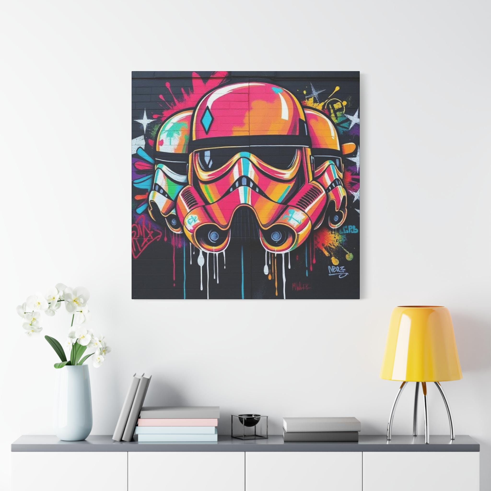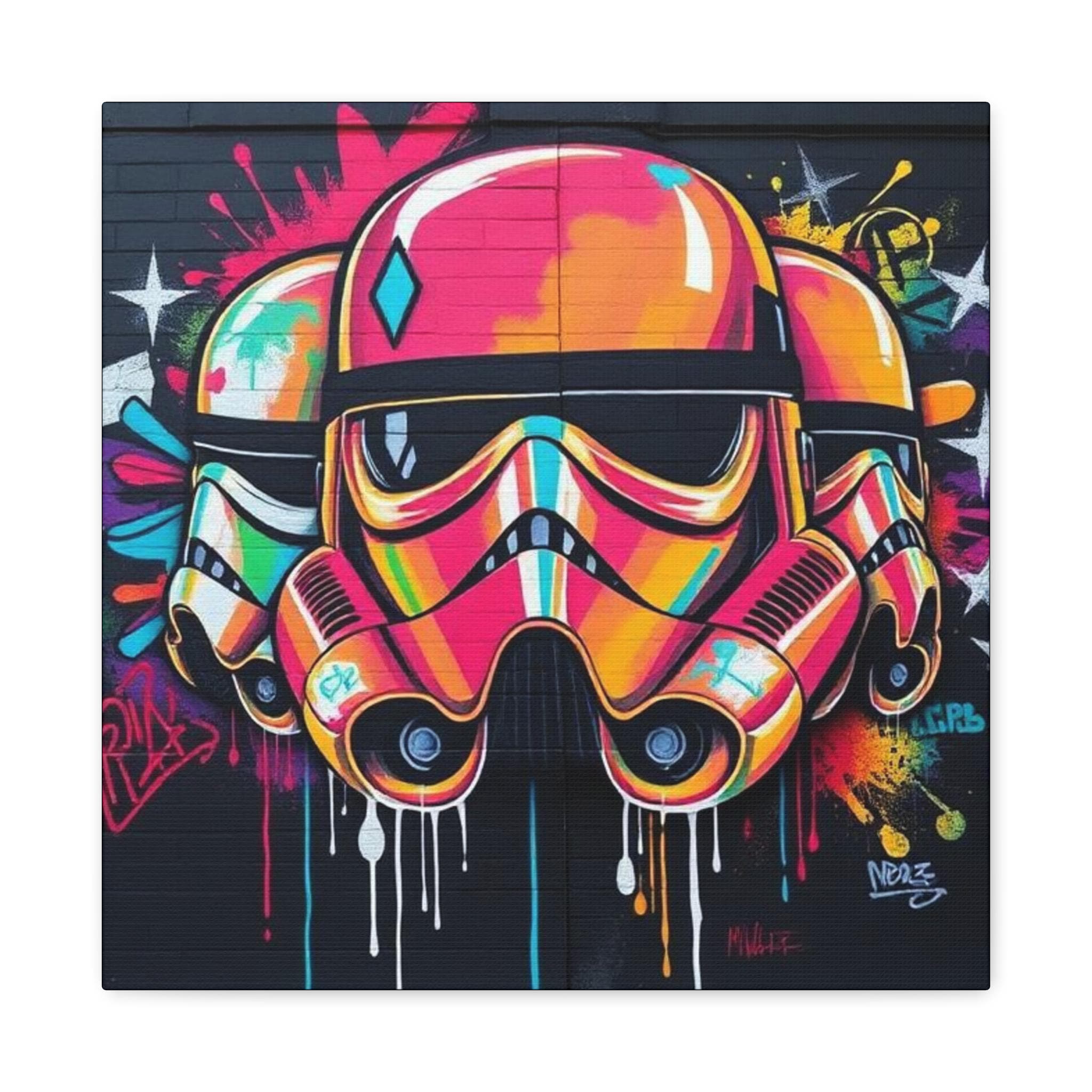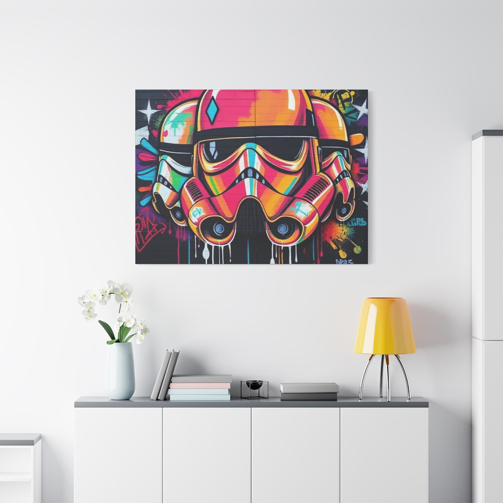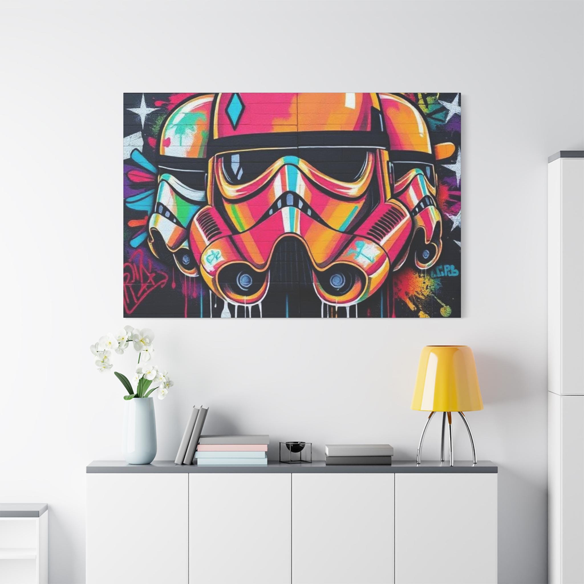 A vibrant stretched canvas that turns bold street art into a living statement on your wall. The vivid, graffiti-style stormtrooper helmet bursts with neon pinks, oranges and aquas that catch the eye from across a room. Mounted on a slim 1.25" pine frame with a black wrapped edge, this piece keeps a clean, modern silhouette while the textured matte canvas preserves color depth without glare. Hang it in a creative studio, game room, or living space to bring an urban, rebellious pulse to the atmosphere. The durable coating and latex-based inks keep the image rich and safe, while the included back-hanging hardware and soft rubber supports make installation steady and effortless.