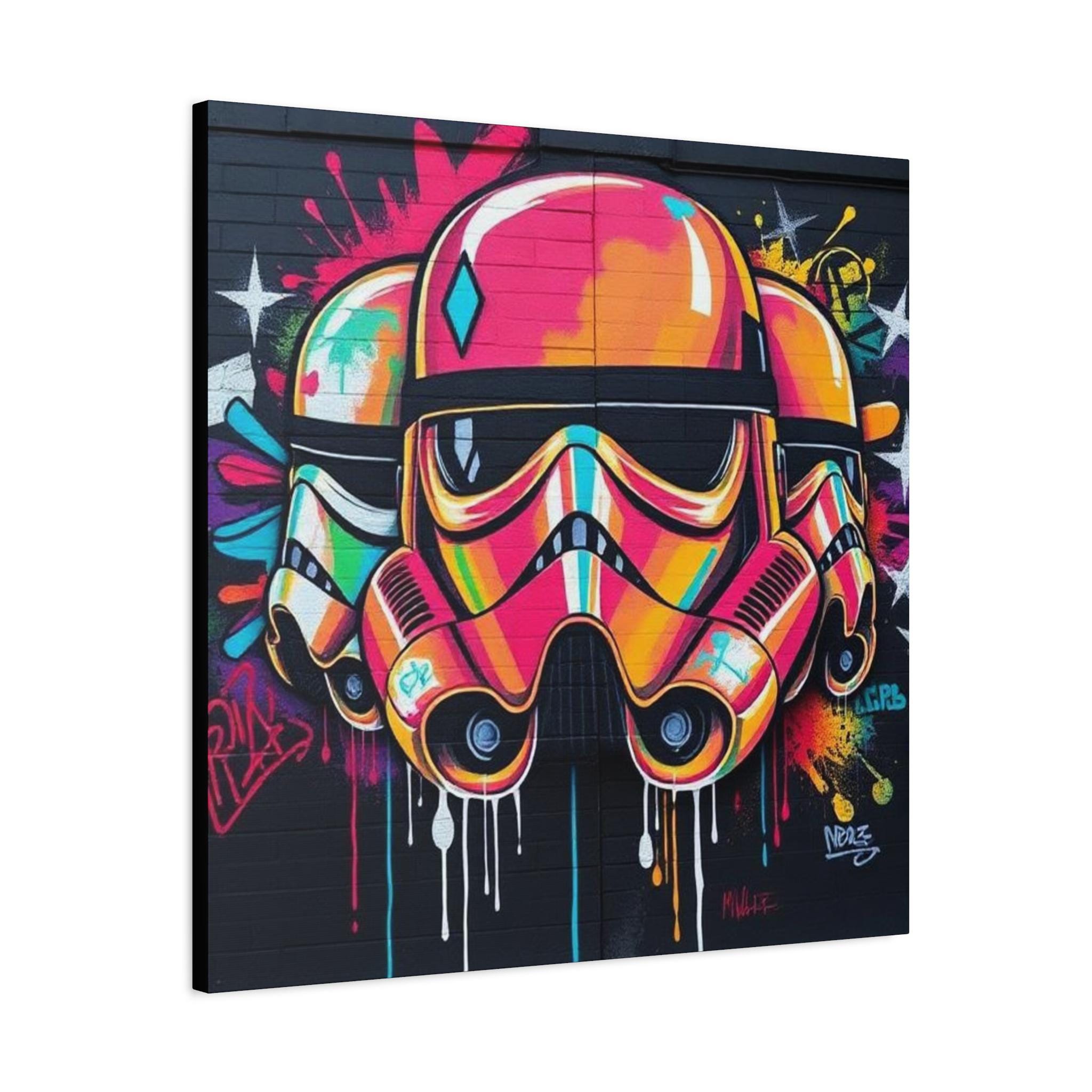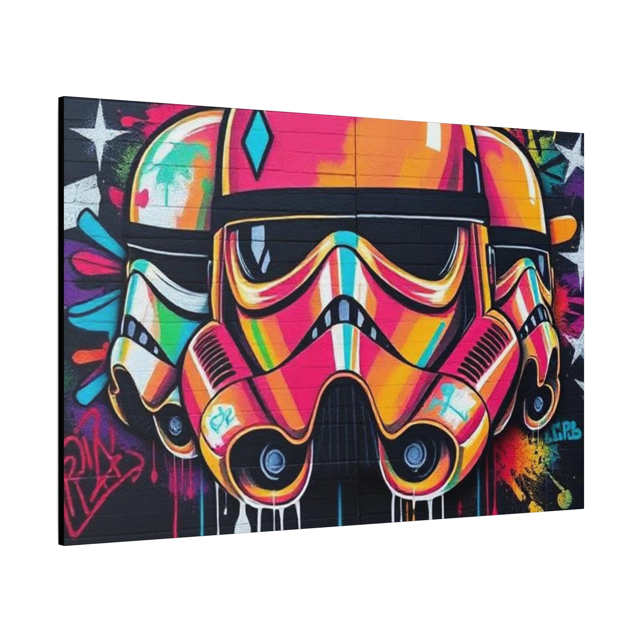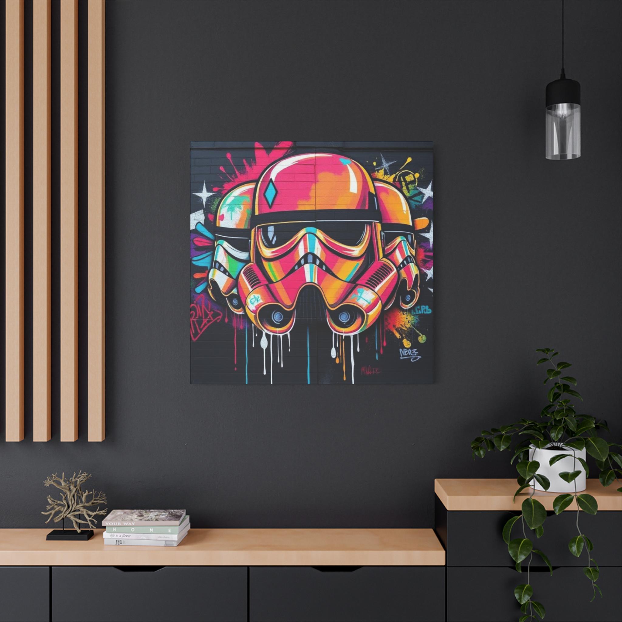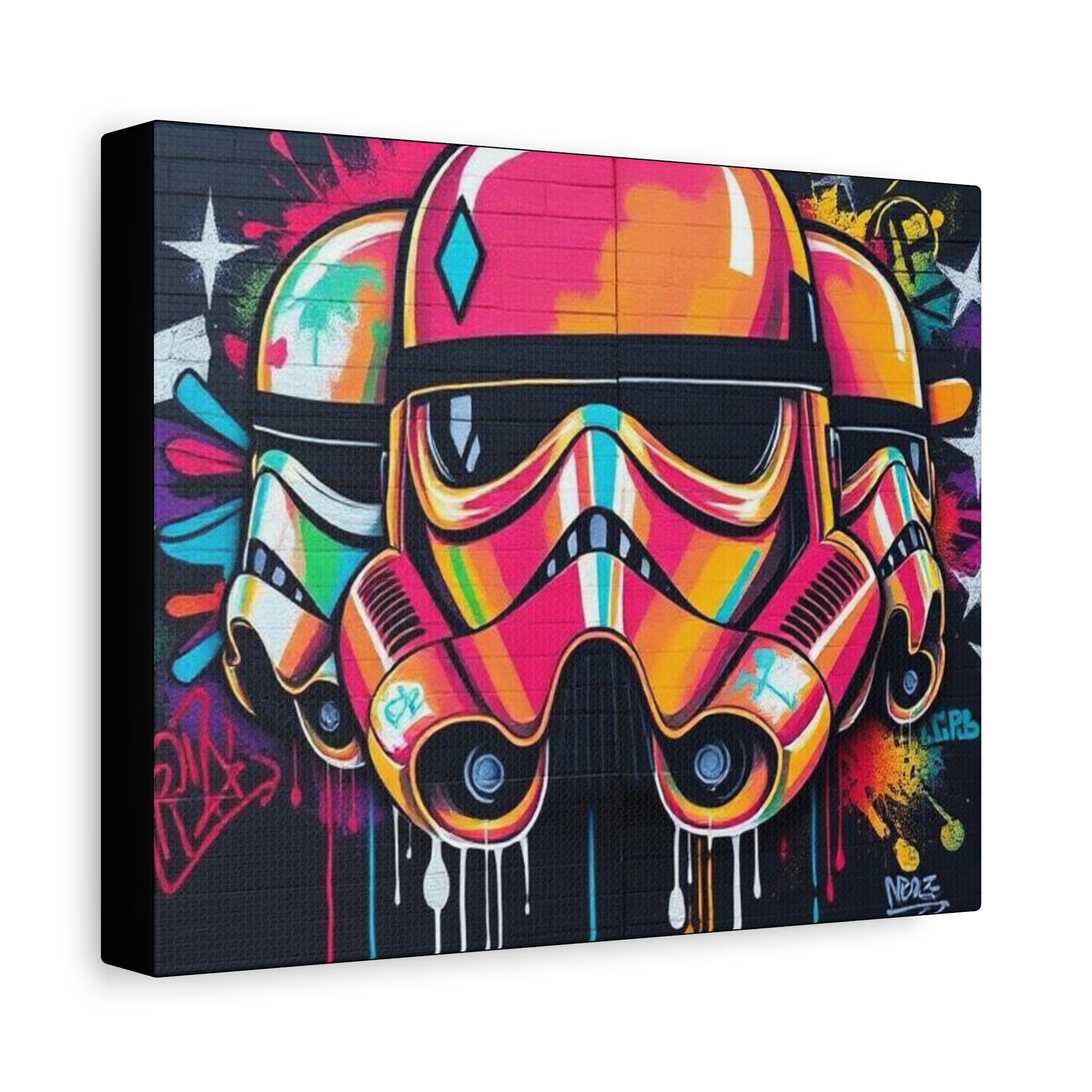 A vibrant stretched canvas that turns bold street art into a living statement on your wall. The vivid, graffiti-style stormtrooper helmet bursts with neon pinks, oranges and aquas that catch the eye from across a room. Mounted on a slim 1.25" pine frame with a black wrapped edge, this piece keeps a clean, modern silhouette while the textured matte canvas preserves color depth without glare. Hang it in a creative studio, game room, or living space to bring an urban, rebellious pulse to the atmosphere. The durable coating and latex-based inks keep the image rich and safe, while the included back-hanging hardware and soft rubber supports make installation steady and effortless.