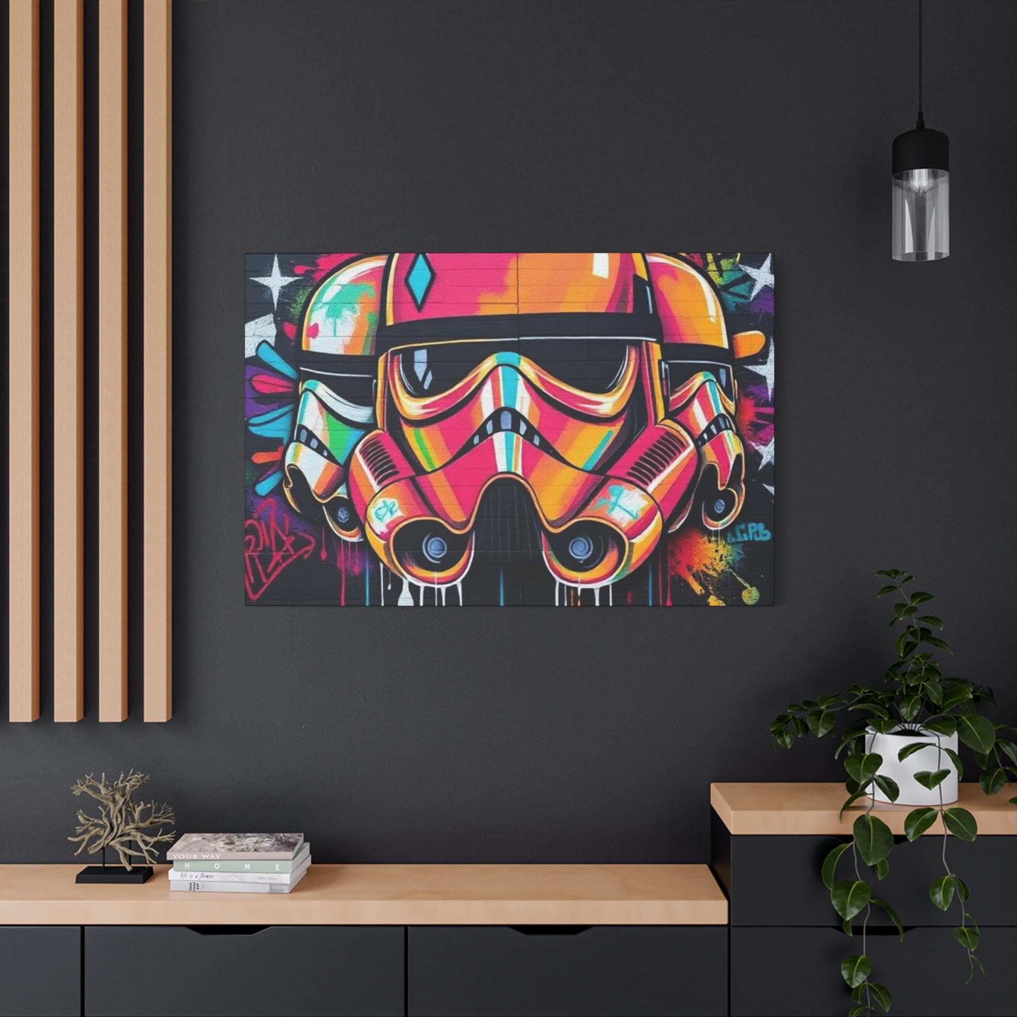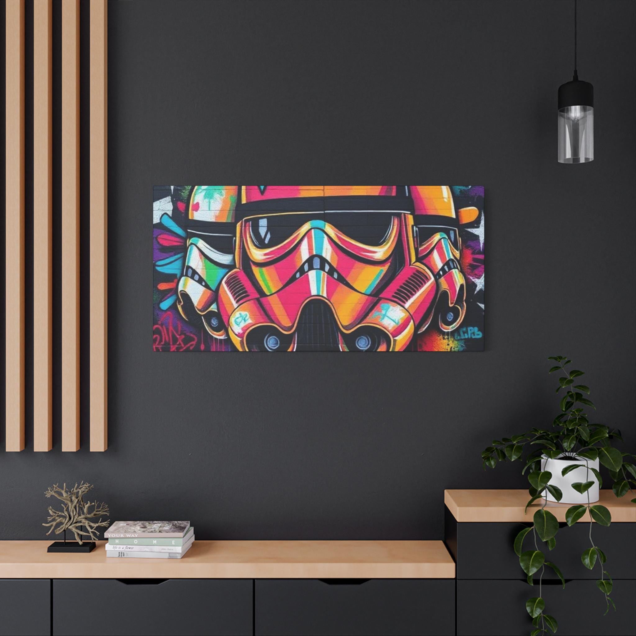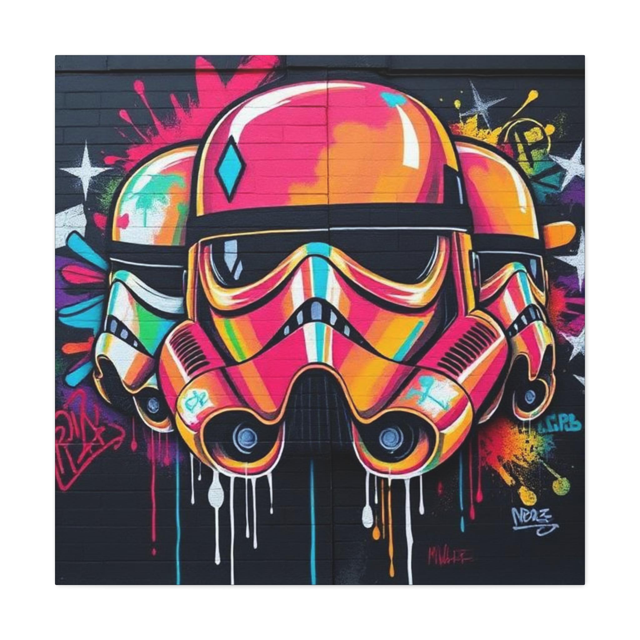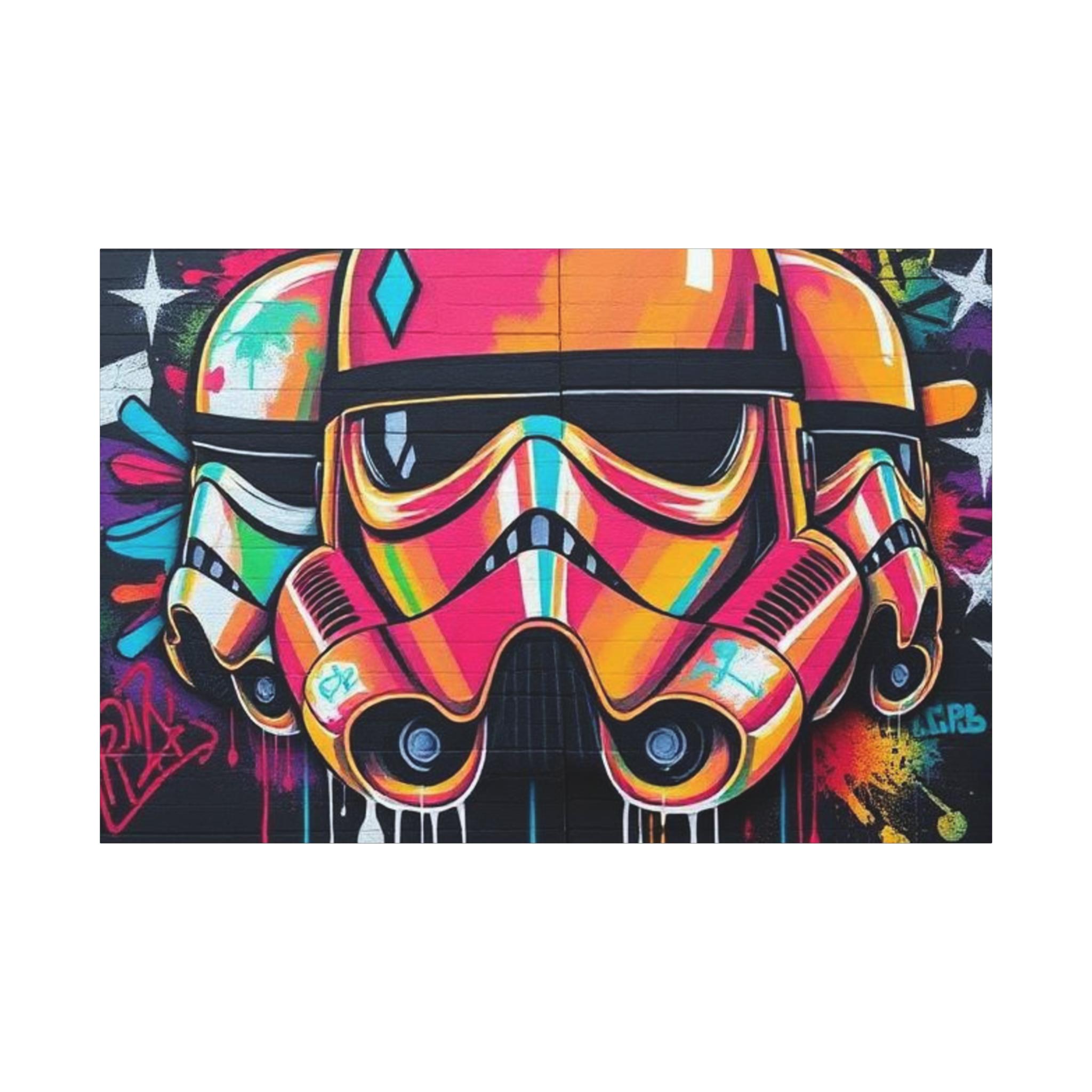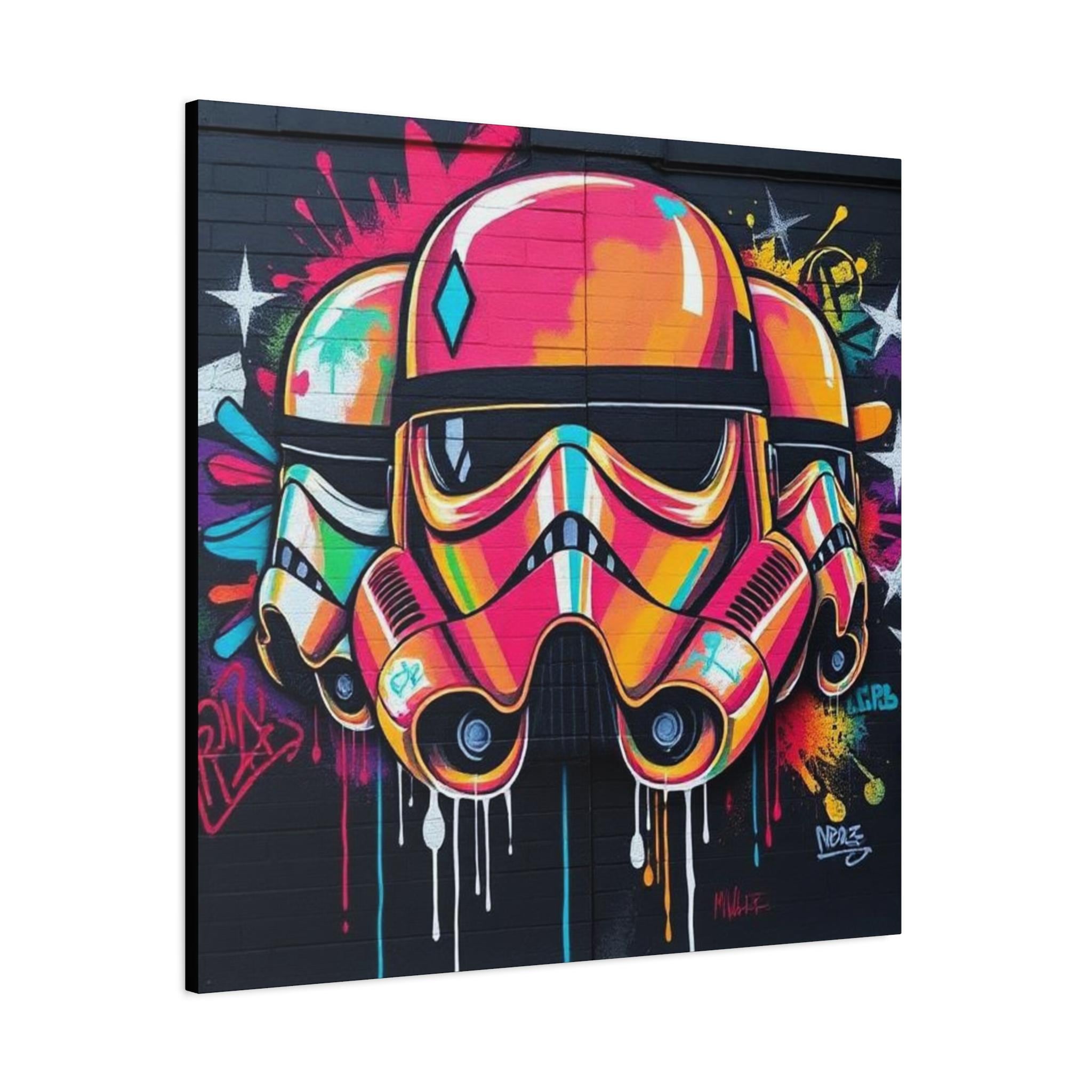 A vibrant stretched canvas that turns bold street art into a living statement on your wall. The vivid, graffiti-style stormtrooper helmet bursts with neon pinks, oranges and aquas that catch the eye from across a room. Mounted on a slim 1.25" pine frame with a black wrapped edge, this piece keeps a clean, modern silhouette while the textured matte canvas preserves color depth without glare. Hang it in a creative studio, game room, or living space to bring an urban, rebellious pulse to the atmosphere. The durable coating and latex-based inks keep the image rich and safe, while the included back-hanging hardware and soft rubber supports make installation steady and effortless.