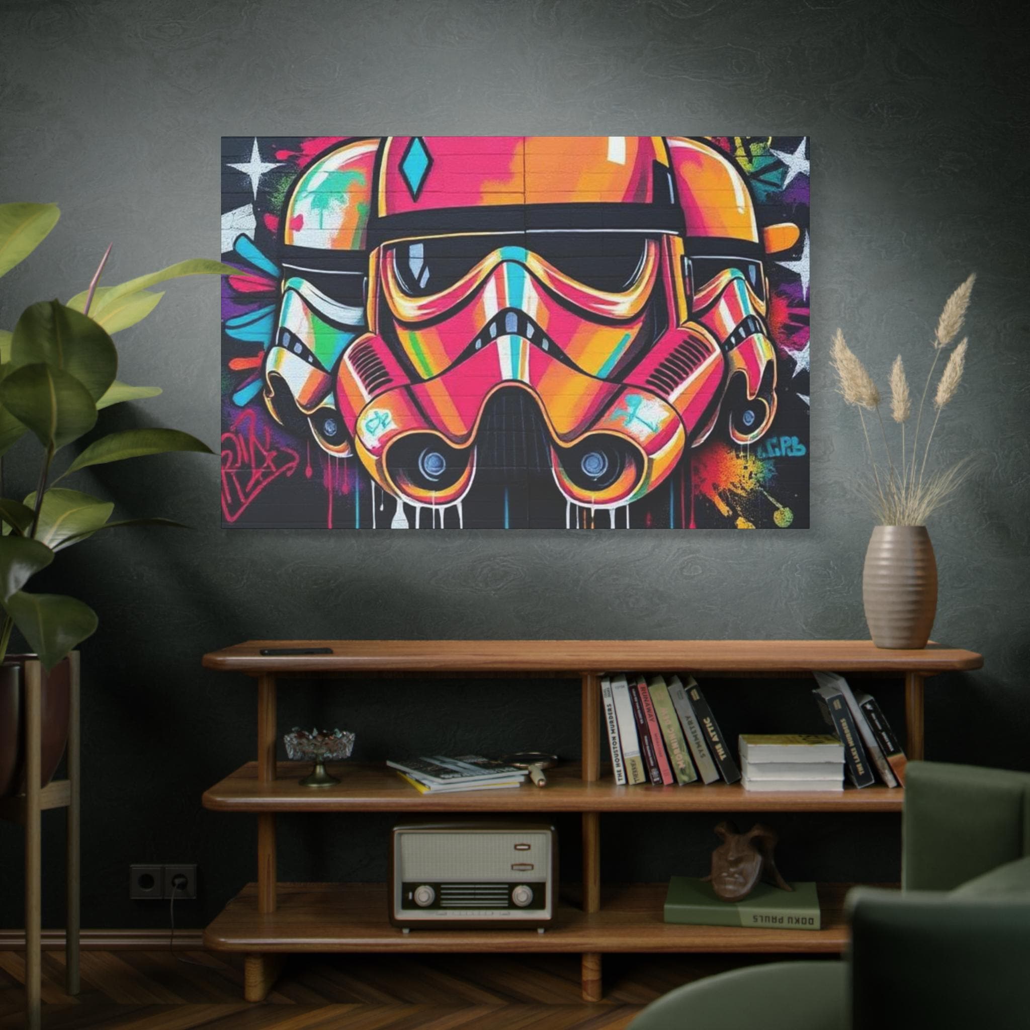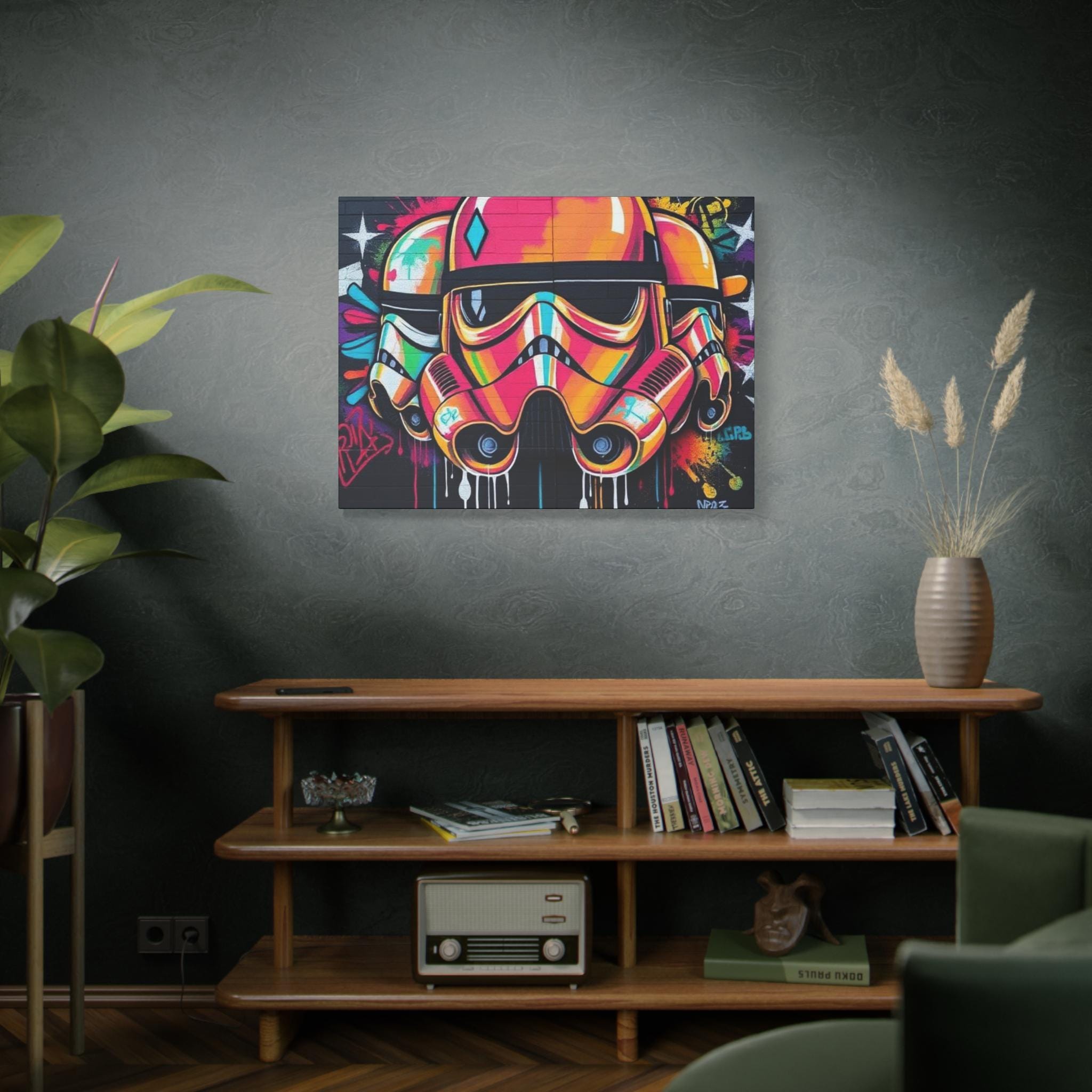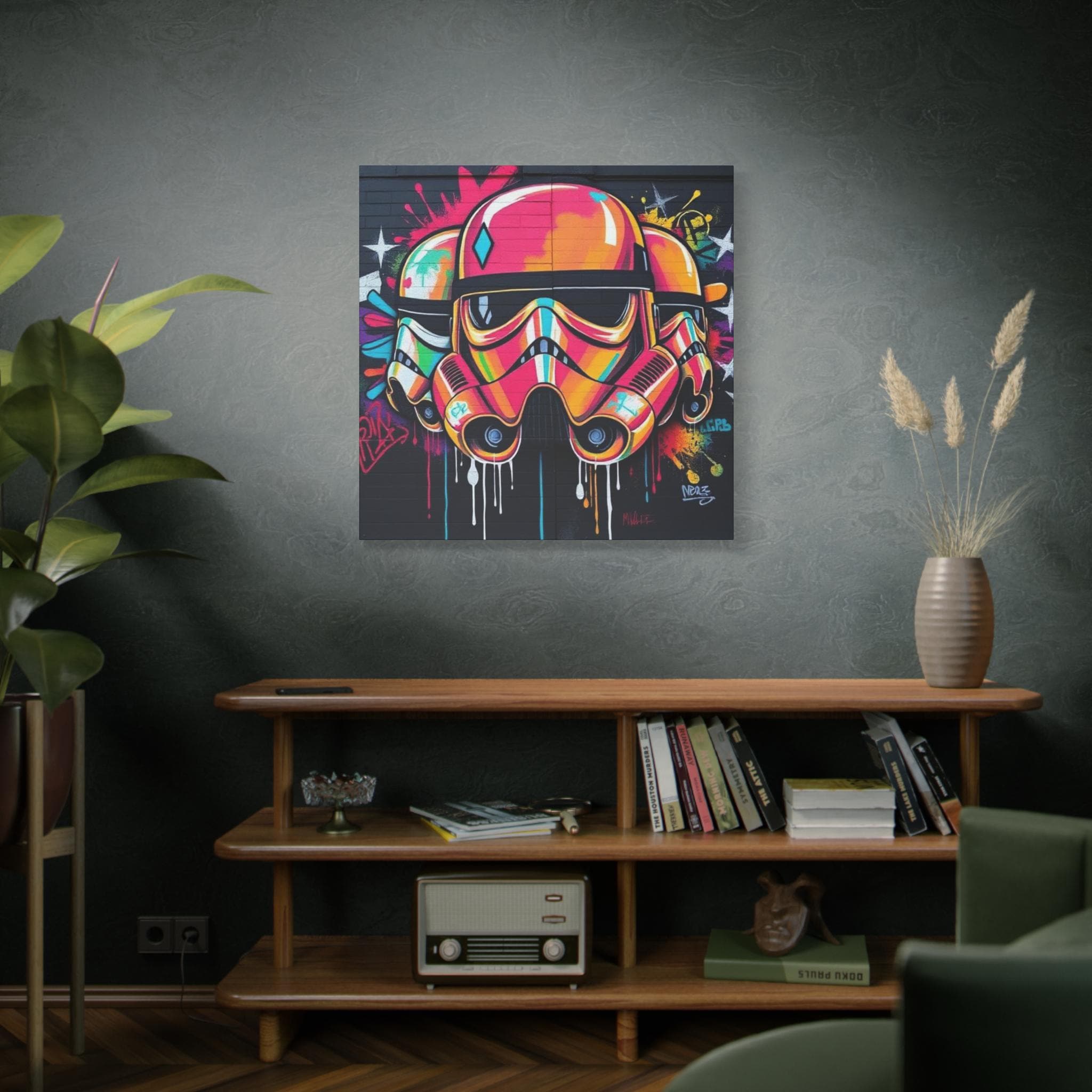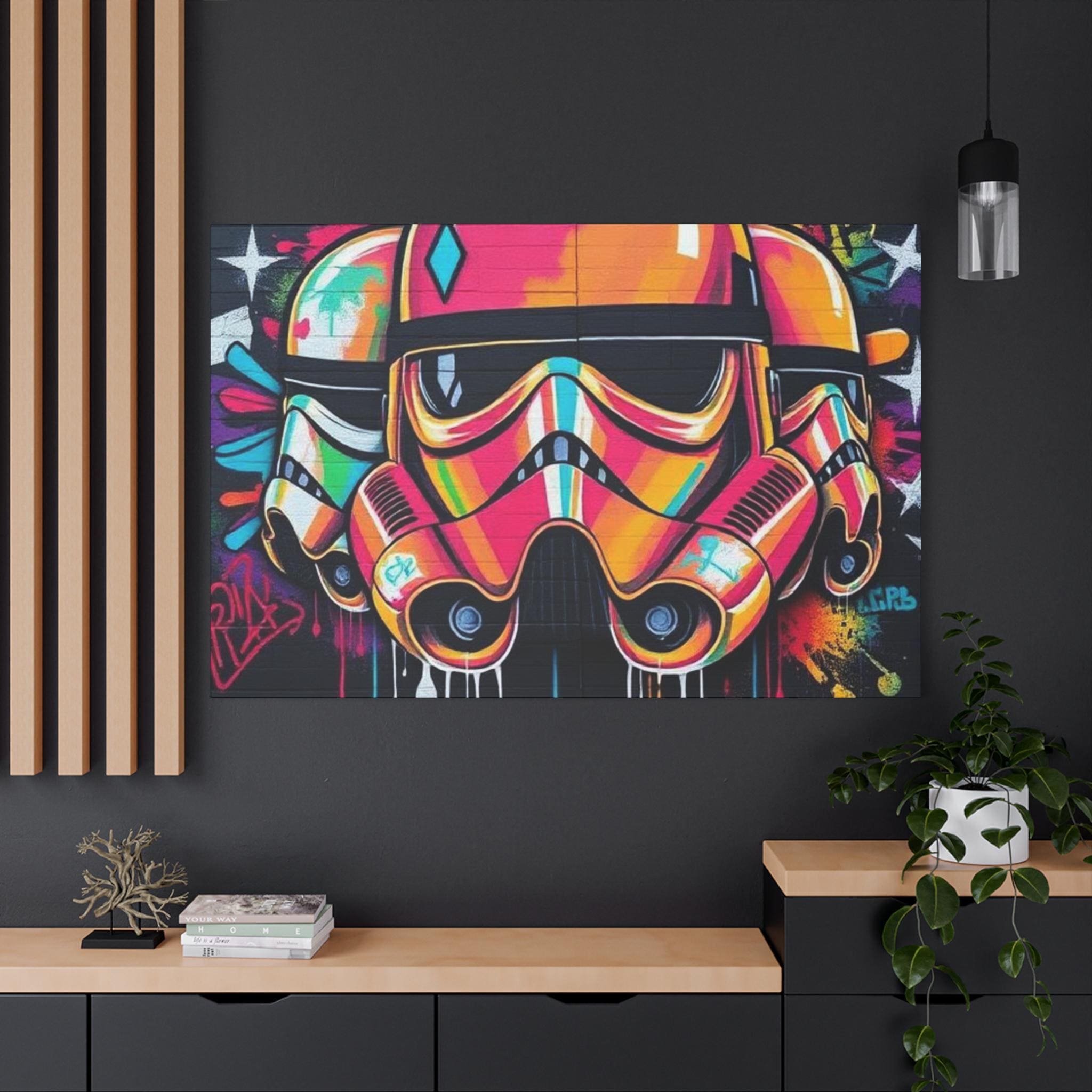 A vibrant stretched canvas that turns bold street art into a living statement on your wall. The vivid, graffiti-style stormtrooper helmet bursts with neon pinks, oranges and aquas that catch the eye from across a room. Mounted on a slim 1.25" pine frame with a black wrapped edge, this piece keeps a clean, modern silhouette while the textured matte canvas preserves color depth without glare. Hang it in a creative studio, game room, or living space to bring an urban, rebellious pulse to the atmosphere. The durable coating and latex-based inks keep the image rich and safe, while the included back-hanging hardware and soft rubber supports make installation steady and effortless.