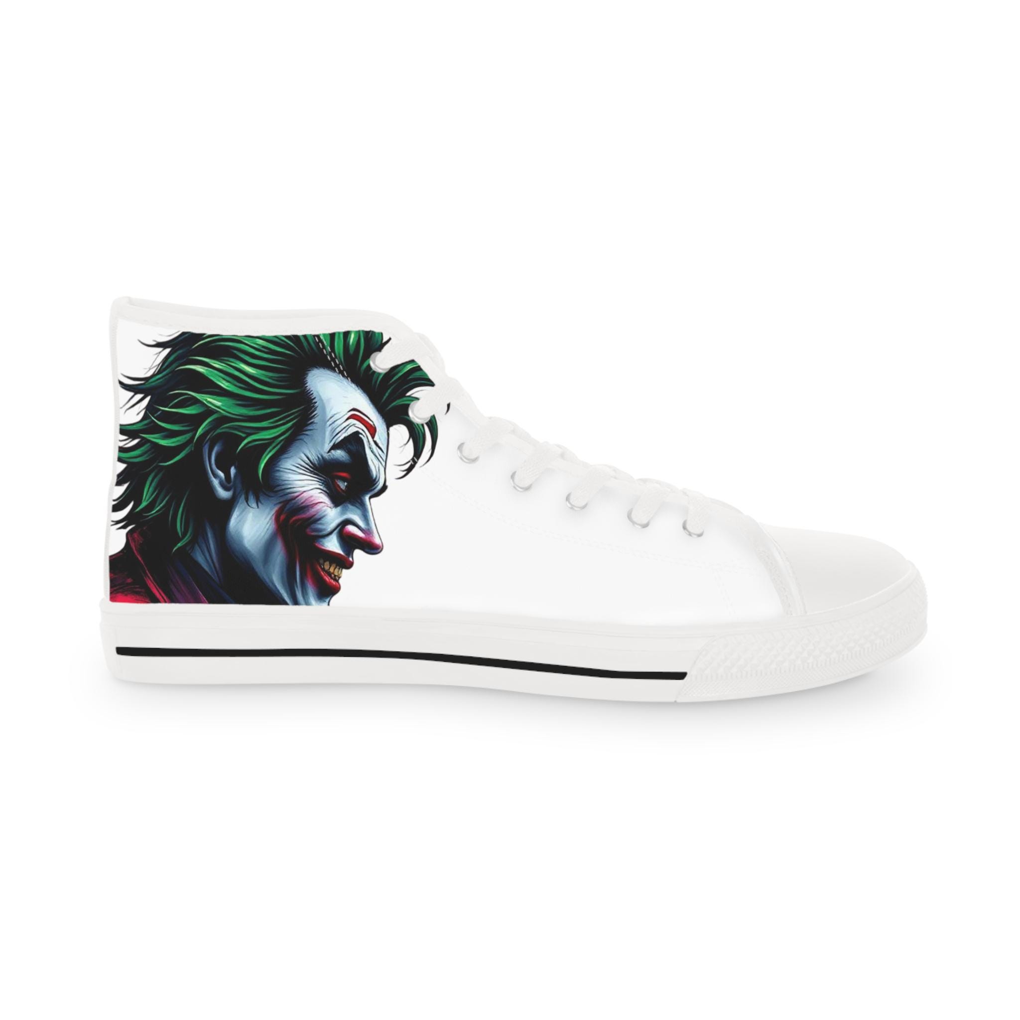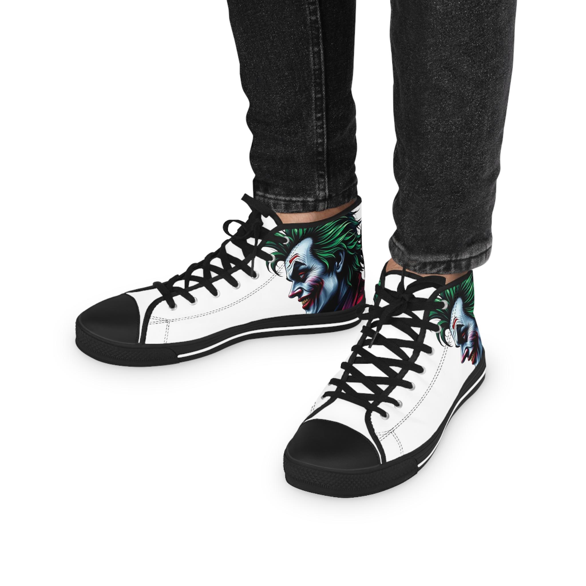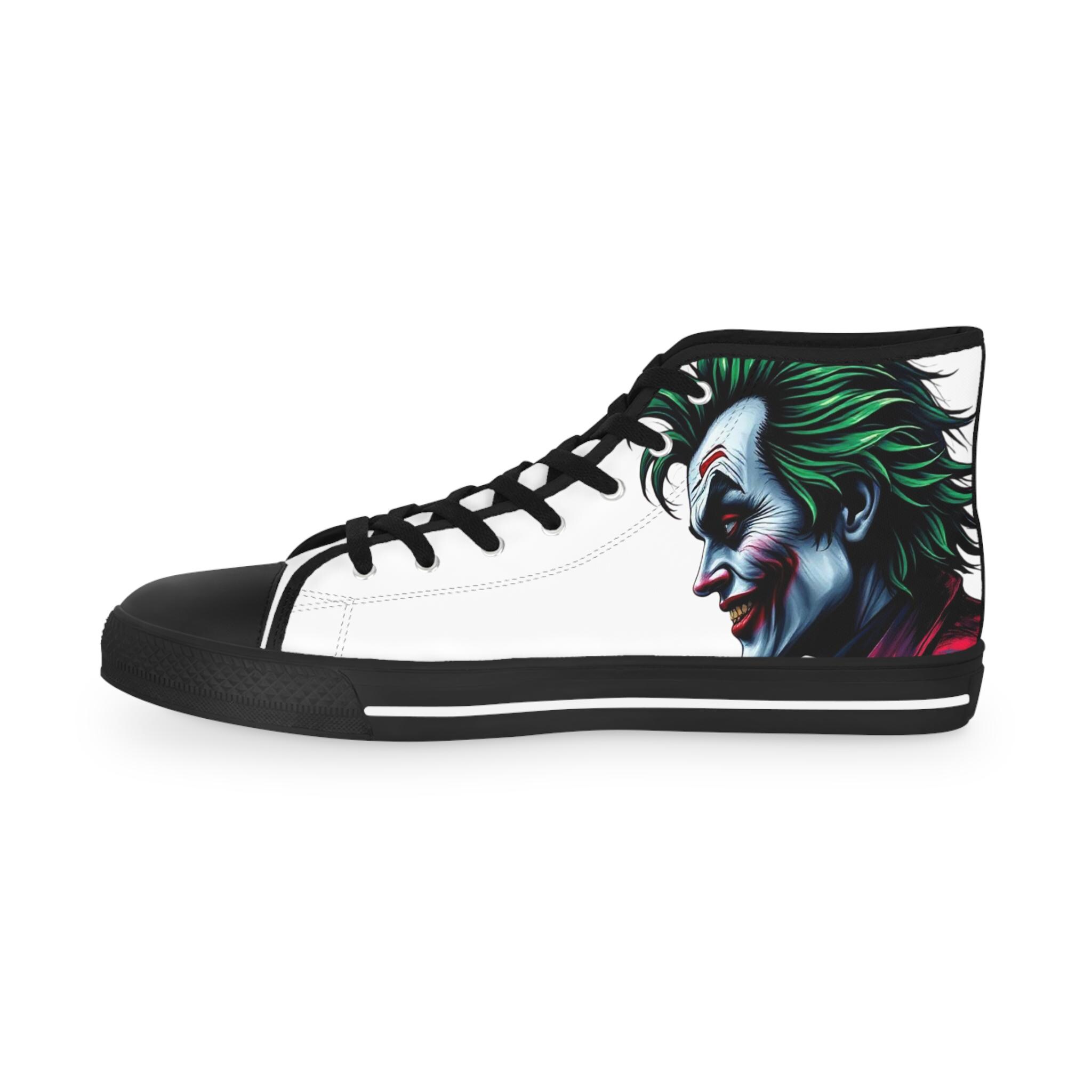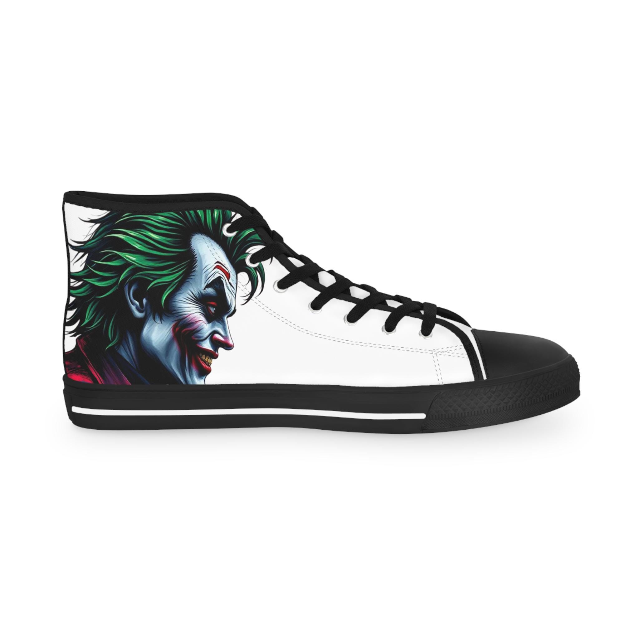 These high-top sneakers carry a dark, cinematic energy—your steps feel loud even when silent. The wraparound print places a grim, painted grin at the ankle and tongue, so every stride reveals another sliver of the portrait. The canvas upper breathes while a cushioned EVA memory-foam insole takes the edge off long days. Metal eyelets and a pleather-reinforced toe add a gritty durability that matches the shoe’s bold attitude. Wear them with cropped jeans or a long coat; they pull a whole outfit toward the dramatic and unapologetic.