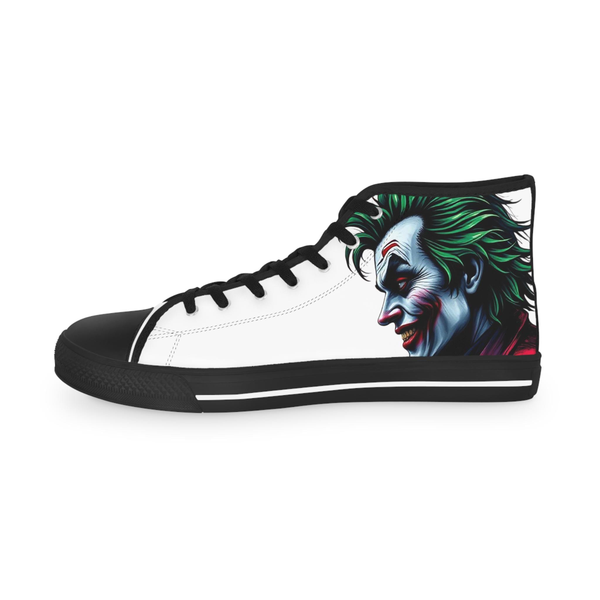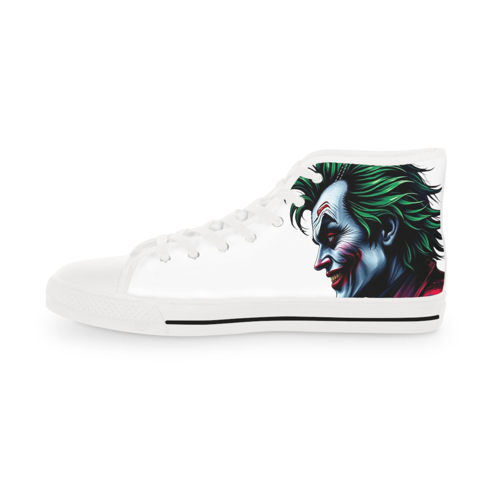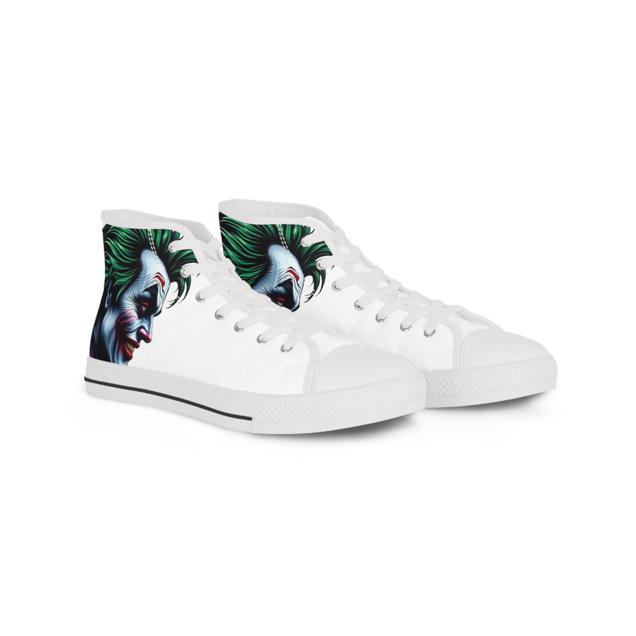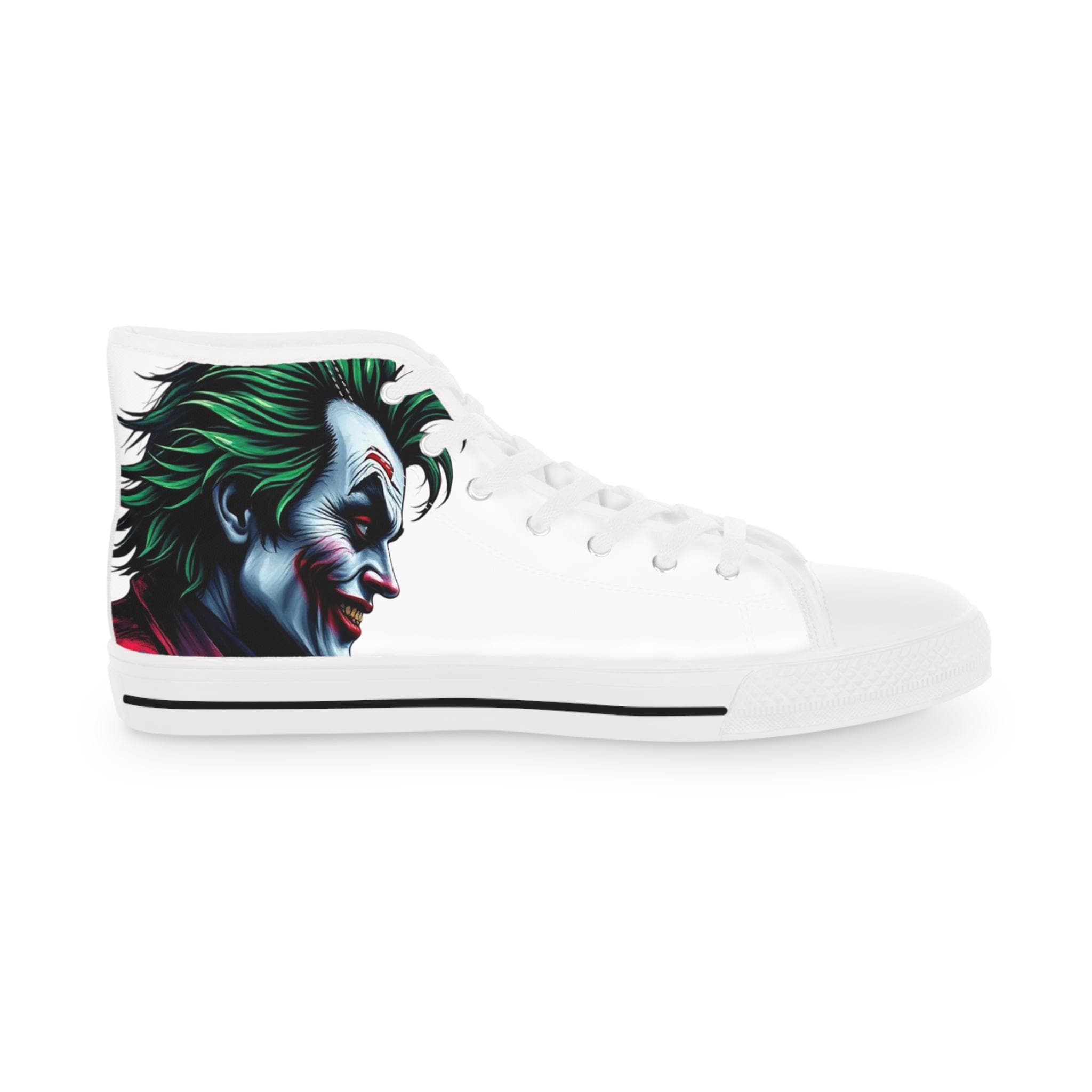 These high-top sneakers carry a dark, cinematic energy—your steps feel loud even when silent. The wraparound print places a grim, painted grin at the ankle and tongue, so every stride reveals another sliver of the portrait. The canvas upper breathes while a cushioned EVA memory-foam insole takes the edge off long days. Metal eyelets and a pleather-reinforced toe add a gritty durability that matches the shoe’s bold attitude. Wear them with cropped jeans or a long coat; they pull a whole outfit toward the dramatic and unapologetic.