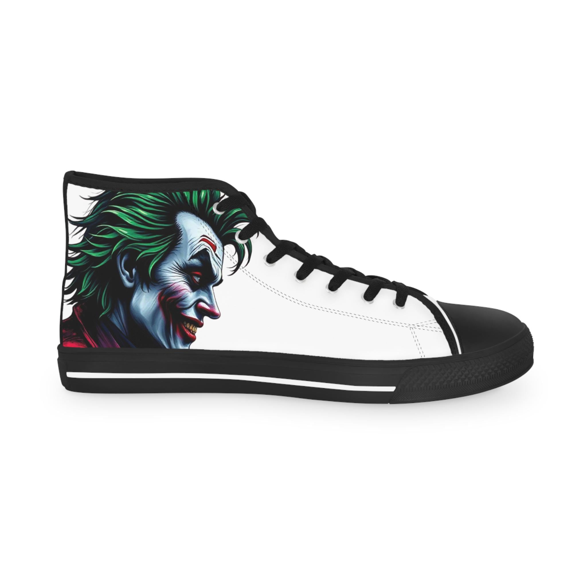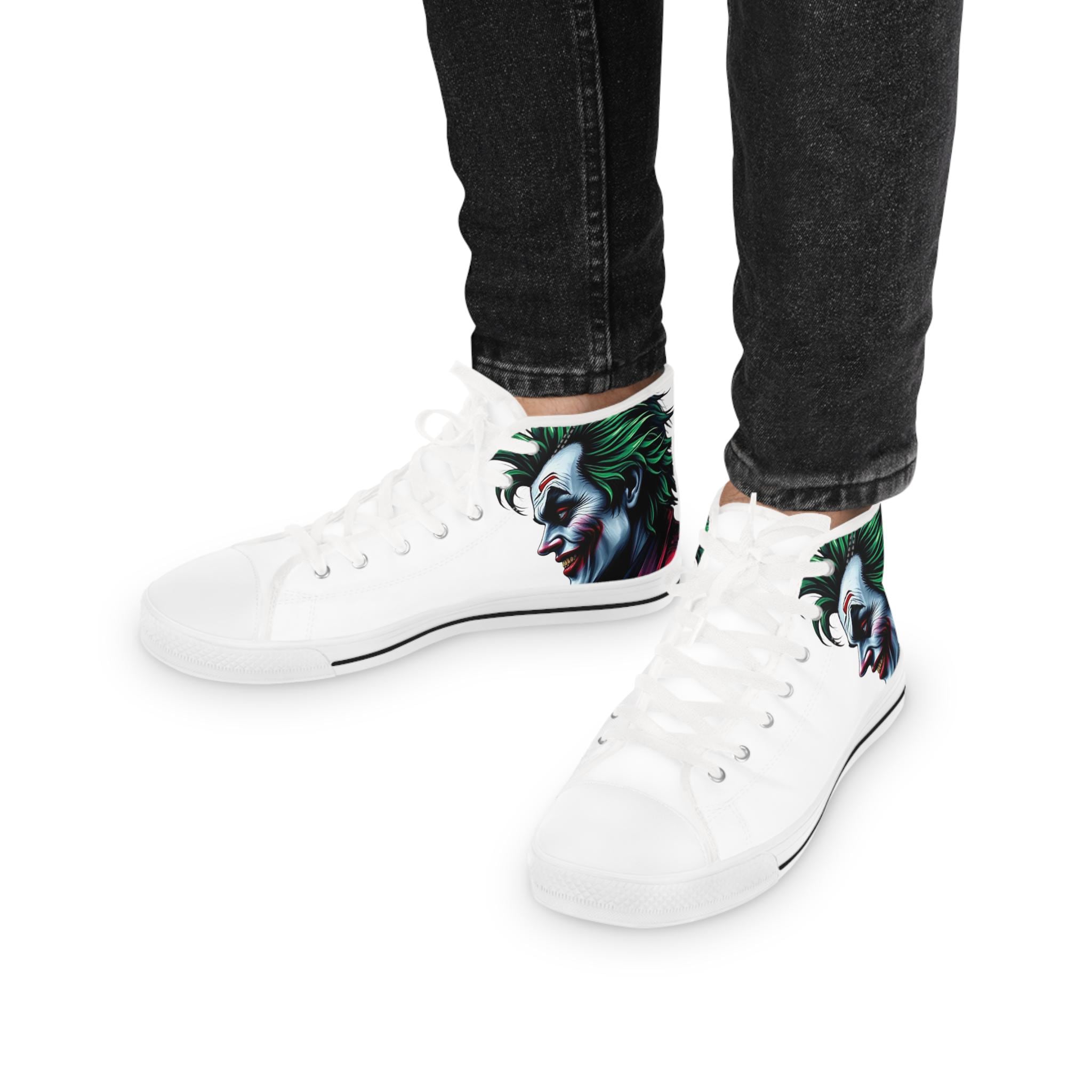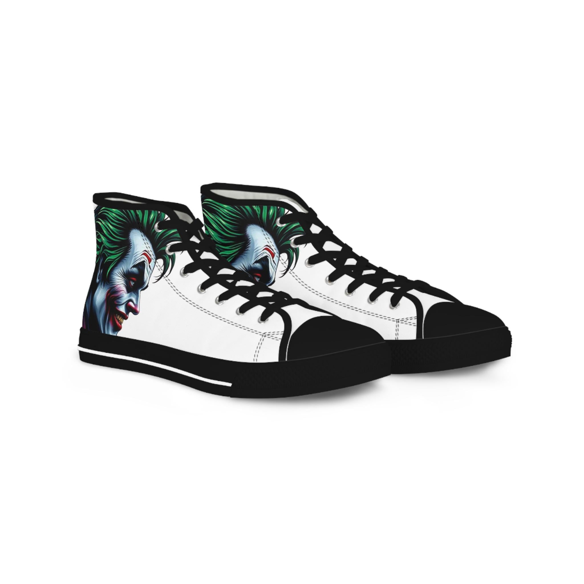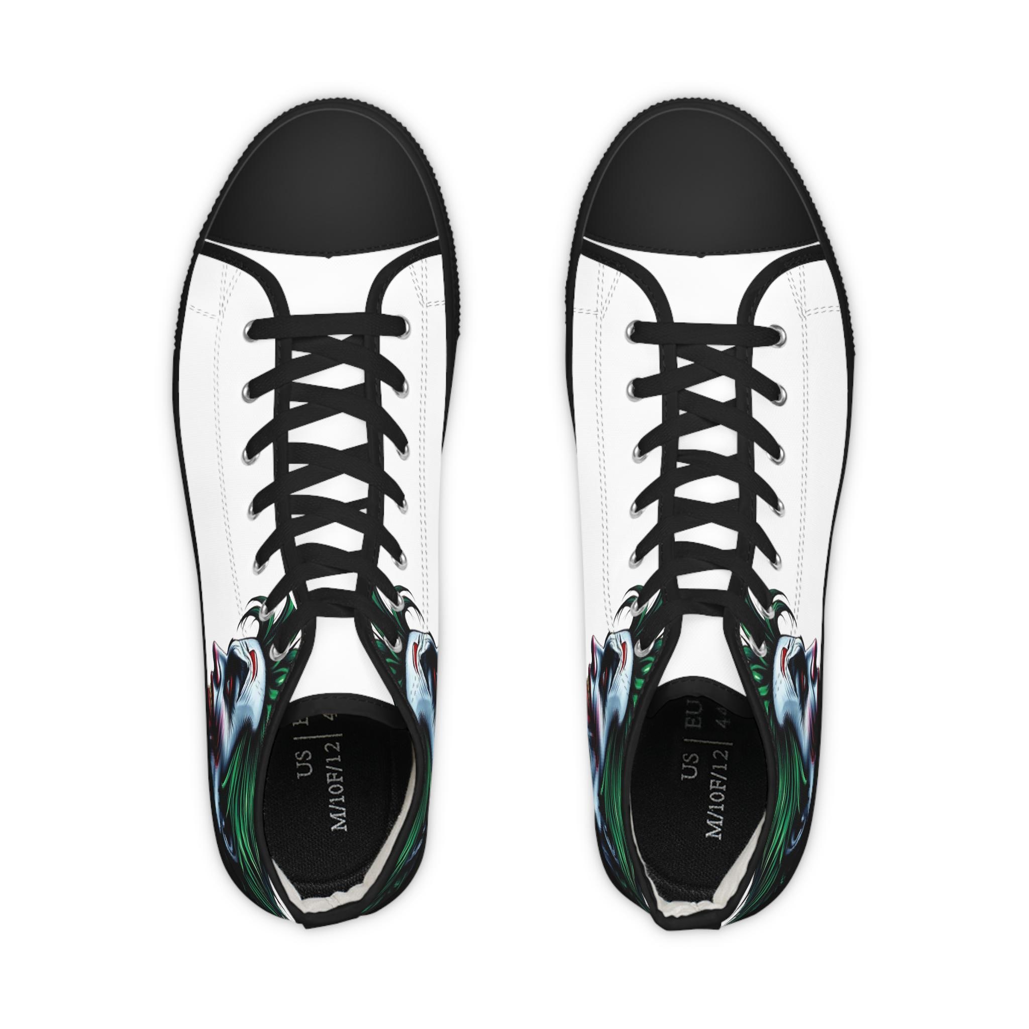 These high-top sneakers carry a dark, cinematic energy—your steps feel loud even when silent. The wraparound print places a grim, painted grin at the ankle and tongue, so every stride reveals another sliver of the portrait. The canvas upper breathes while a cushioned EVA memory-foam insole takes the edge off long days. Metal eyelets and a pleather-reinforced toe add a gritty durability that matches the shoe’s bold attitude. Wear them with cropped jeans or a long coat; they pull a whole outfit toward the dramatic and unapologetic.