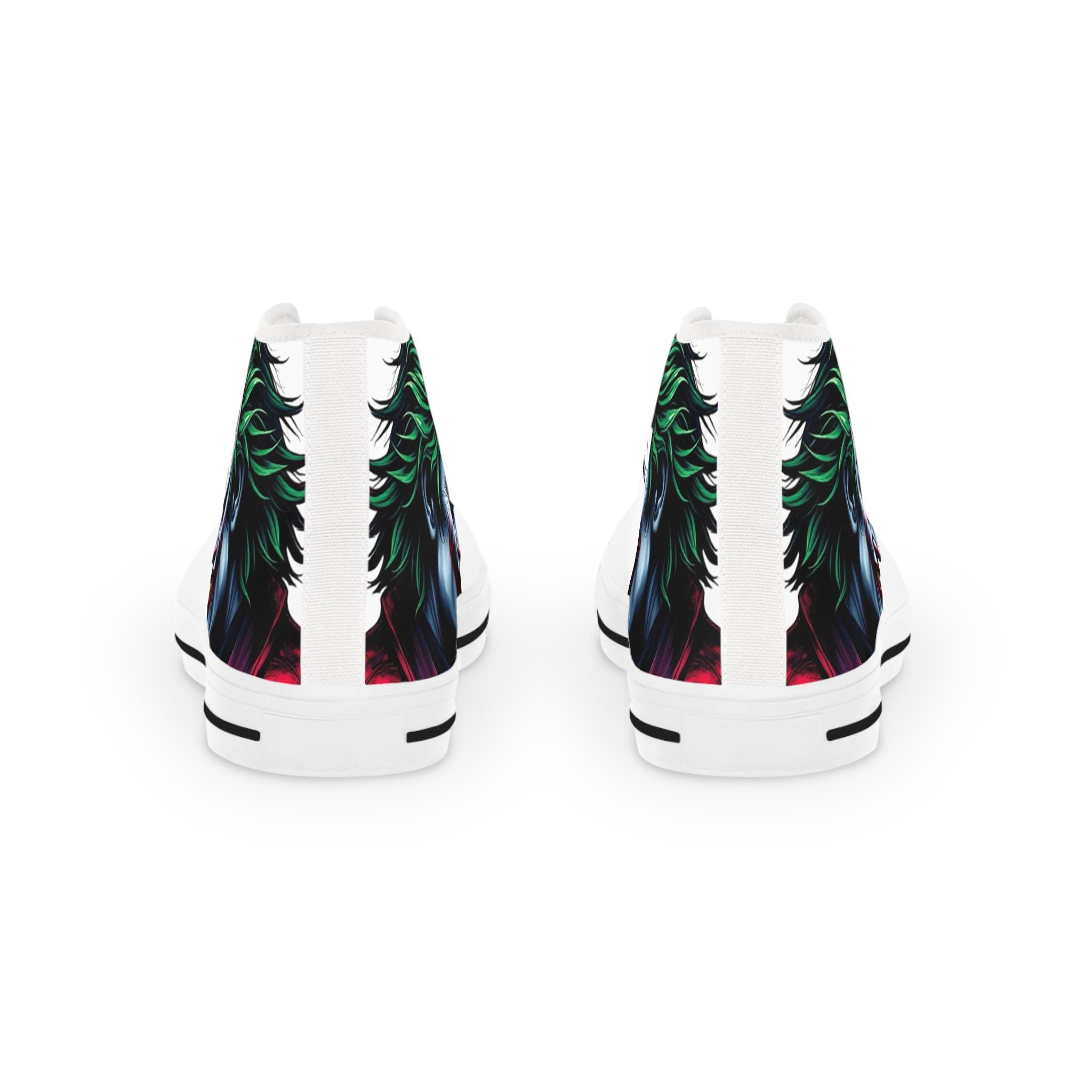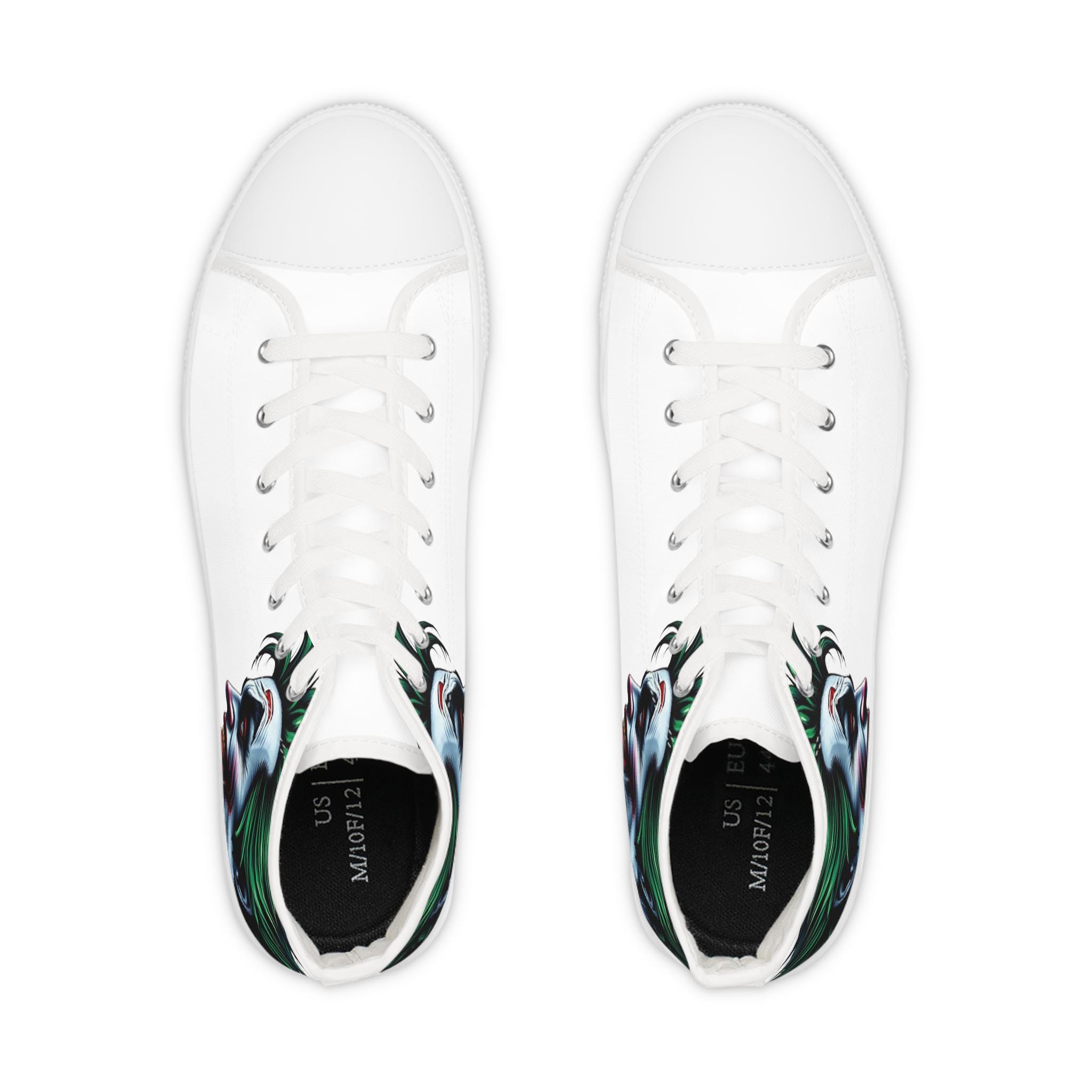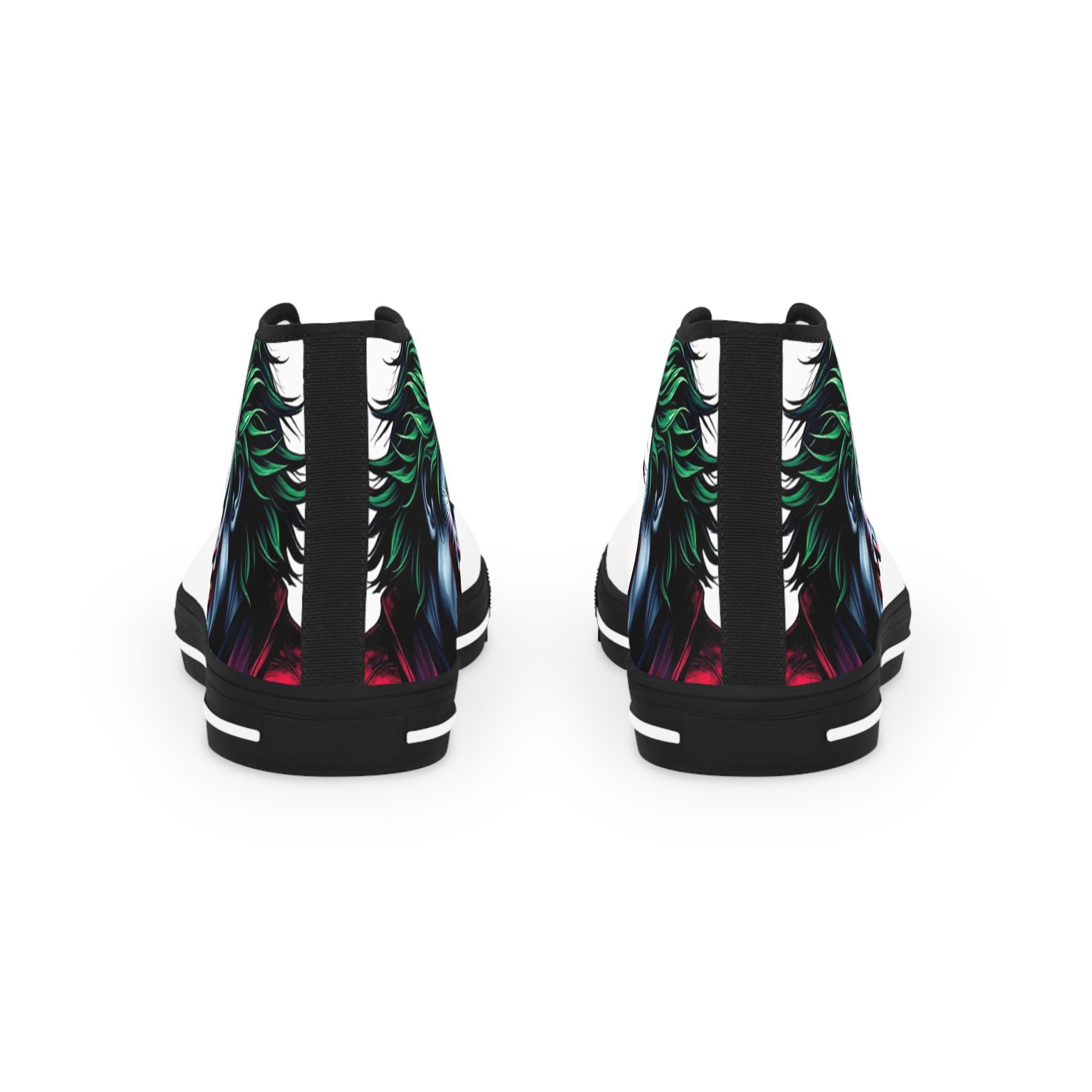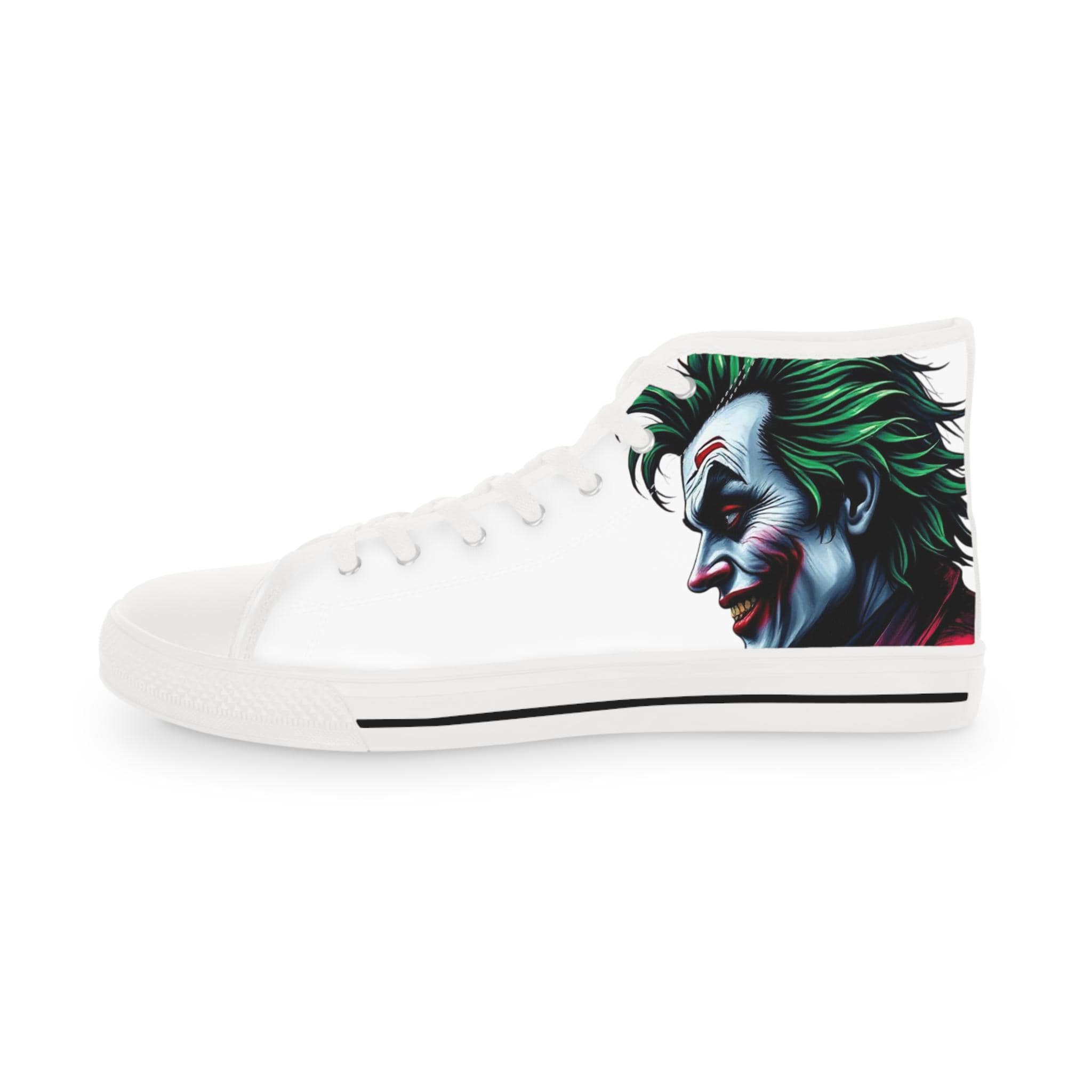 These high-top sneakers carry a dark, cinematic energy—your steps feel loud even when silent. The wraparound print places a grim, painted grin at the ankle and tongue, so every stride reveals another sliver of the portrait. The canvas upper breathes while a cushioned EVA memory-foam insole takes the edge off long days. Metal eyelets and a pleather-reinforced toe add a gritty durability that matches the shoe’s bold attitude. Wear them with cropped jeans or a long coat; they pull a whole outfit toward the dramatic and unapologetic.