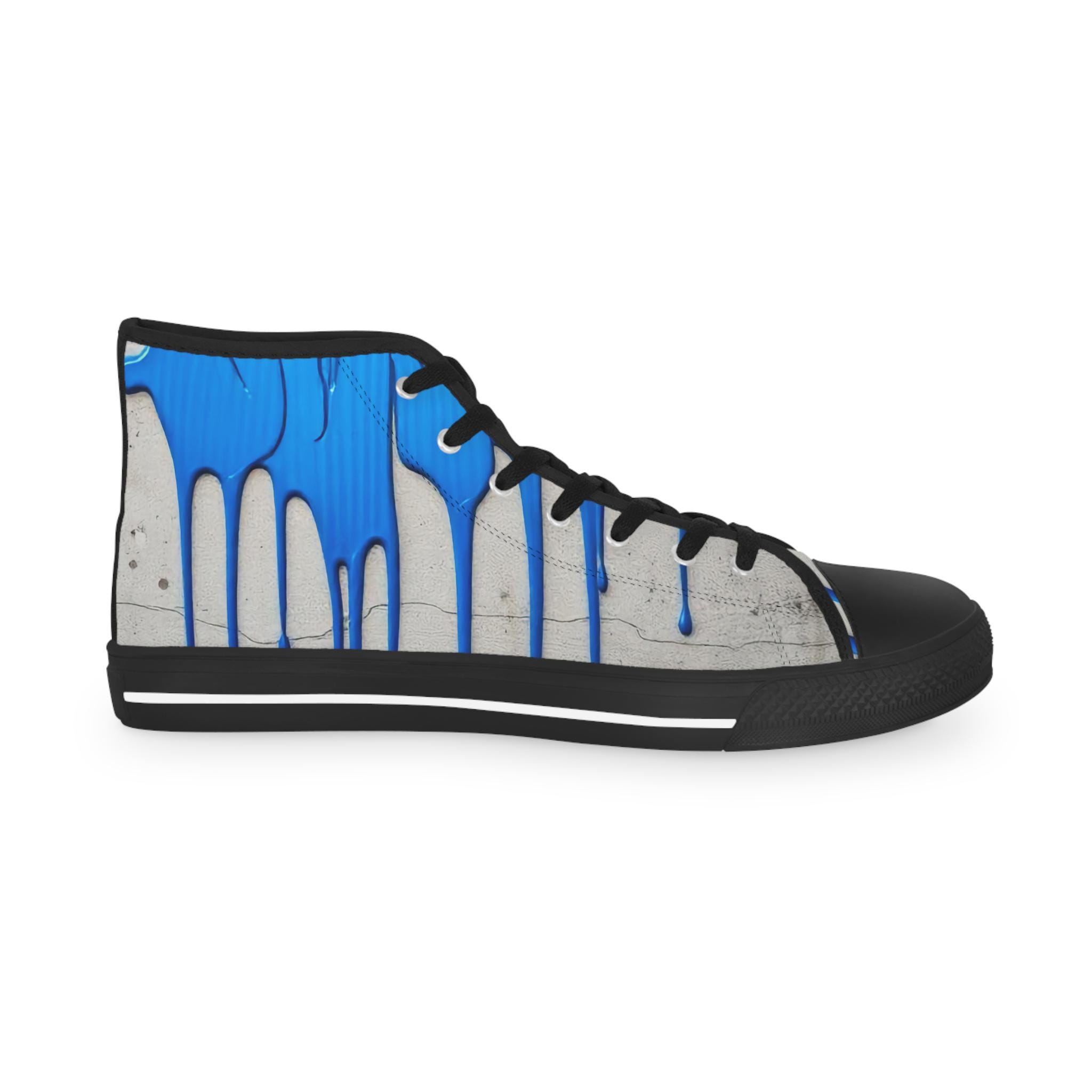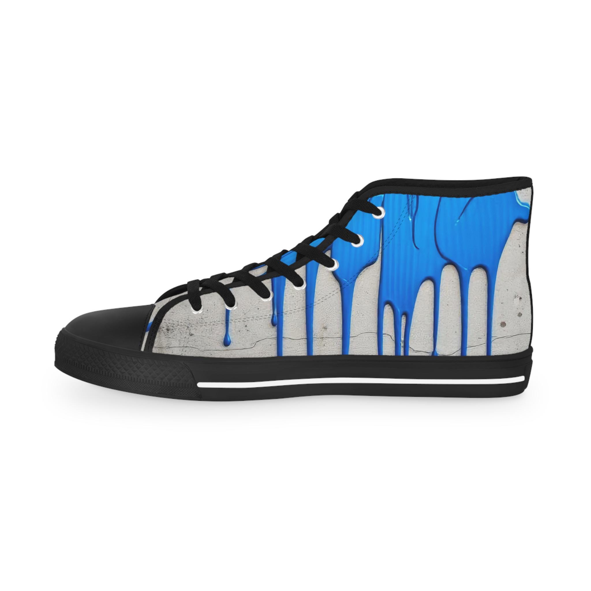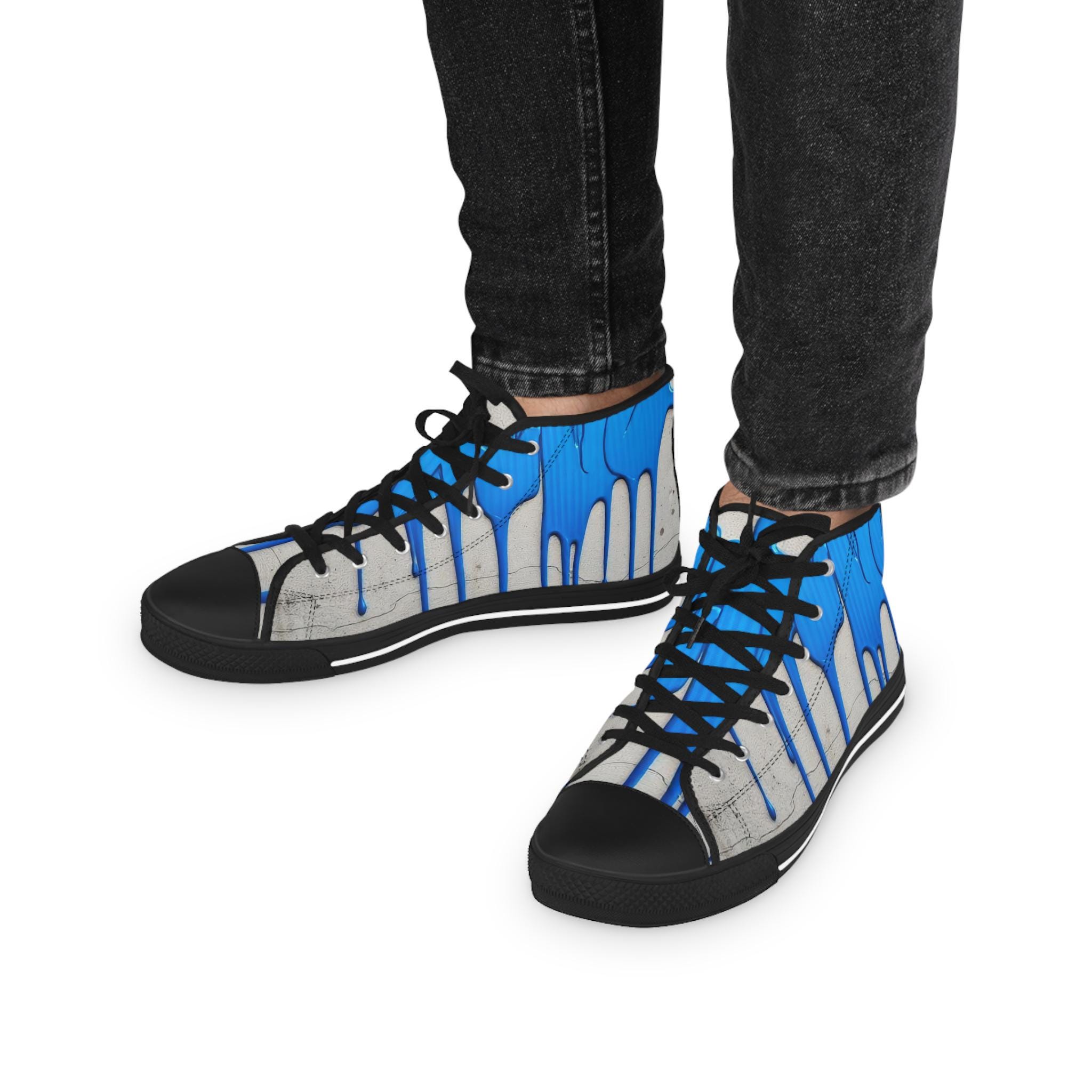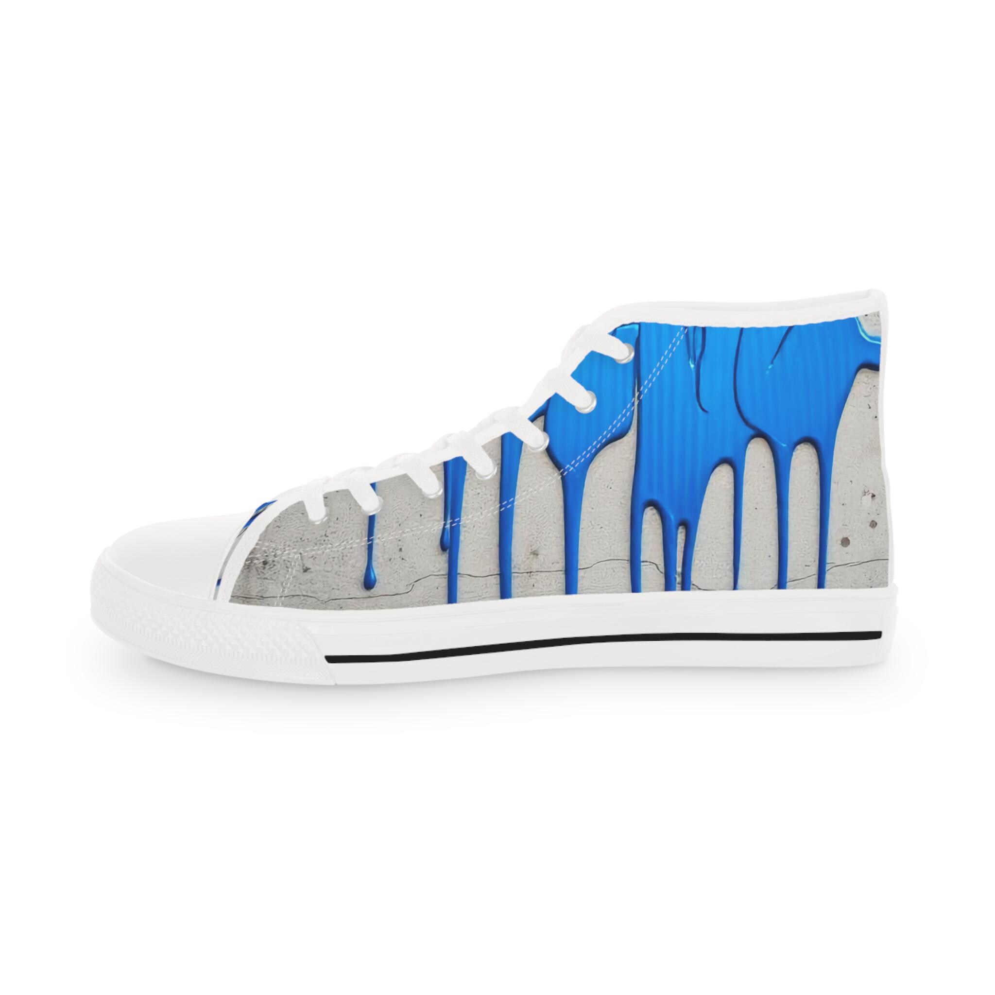 These high-top sneakers bring street-art energy to everyday steps. The full-wrap design shows layered blue drips over a soft grey, distressed backdrop — a look that reads like a mural painted right onto your shoes. Lightweight EVA insoles with memory-foam deodorant cushioning absorb impact and stay fresh, while the pleather toe and durable rubber outsole stand up to city wear. Silver metal eyelets and breathable polyester canvas keep the sneakers feeling airy and secure. Wear them on gallery nights, weekend coffee runs, or while sketching in a favorite park — they carry color, attitude, and comfort wherever you go.