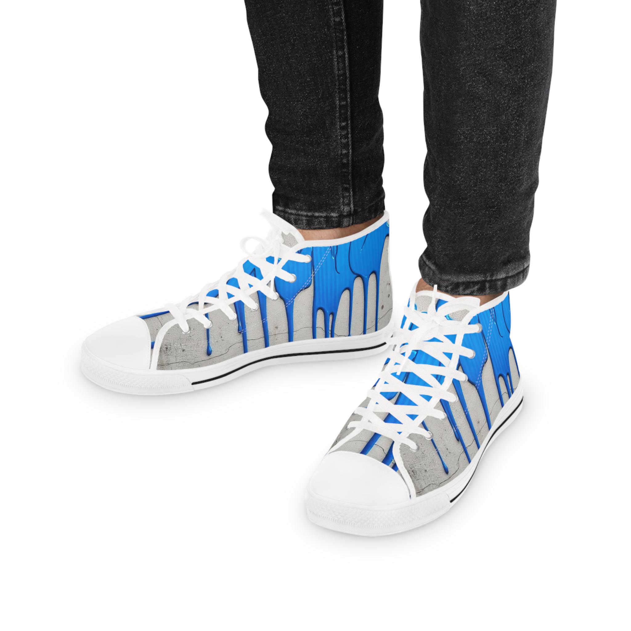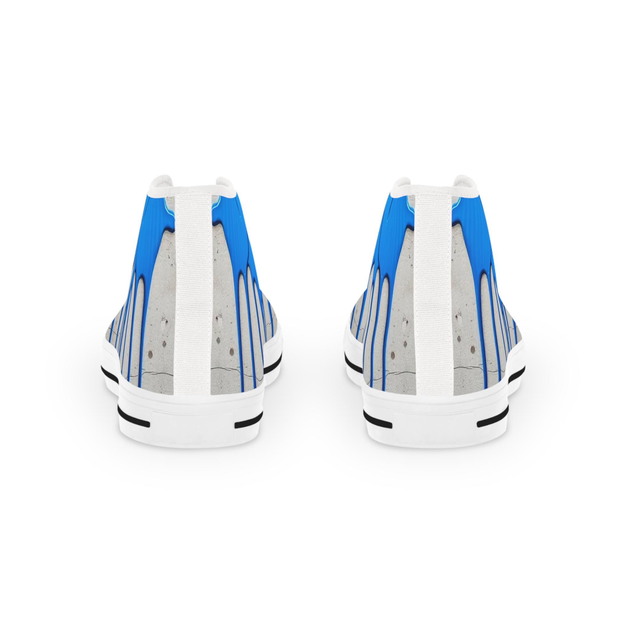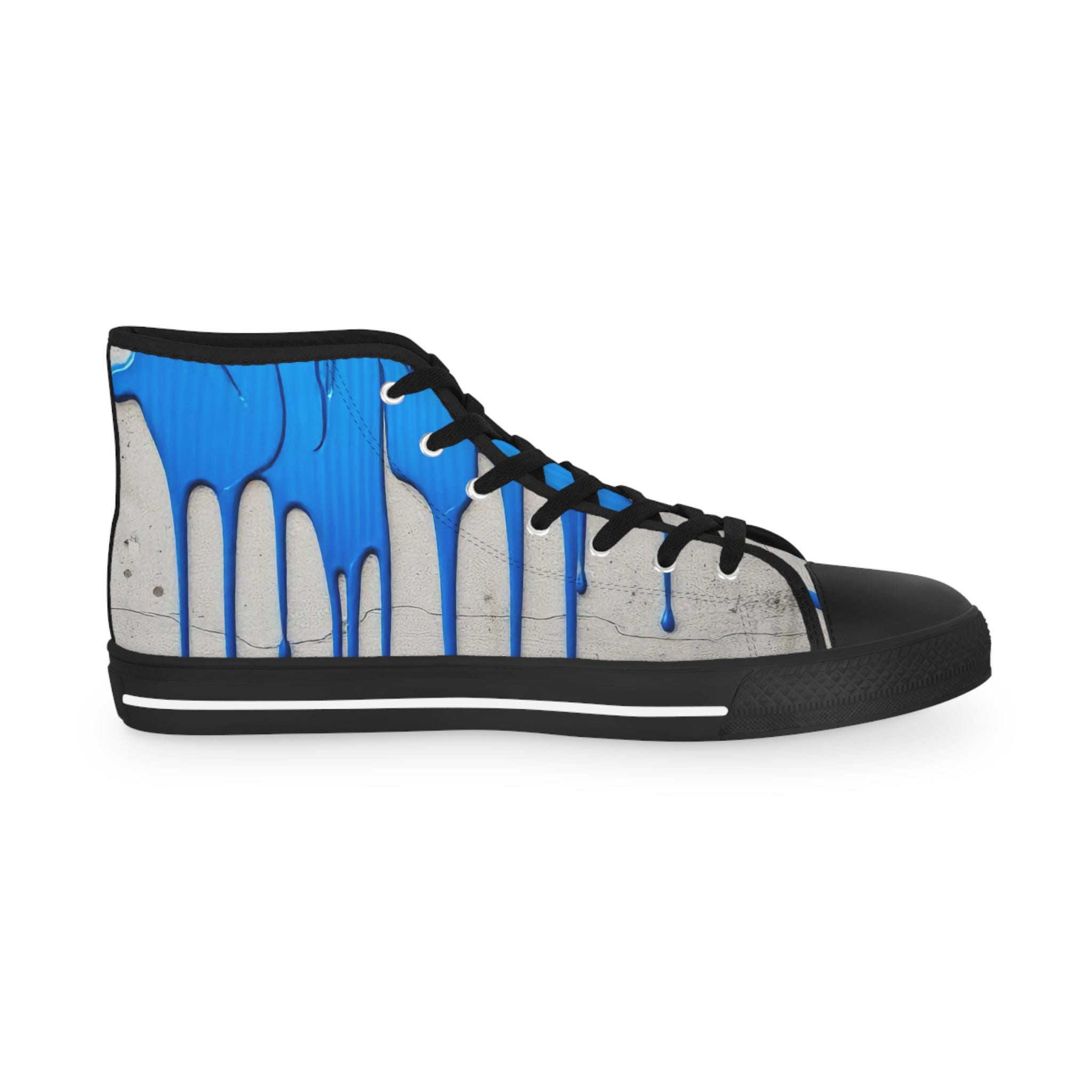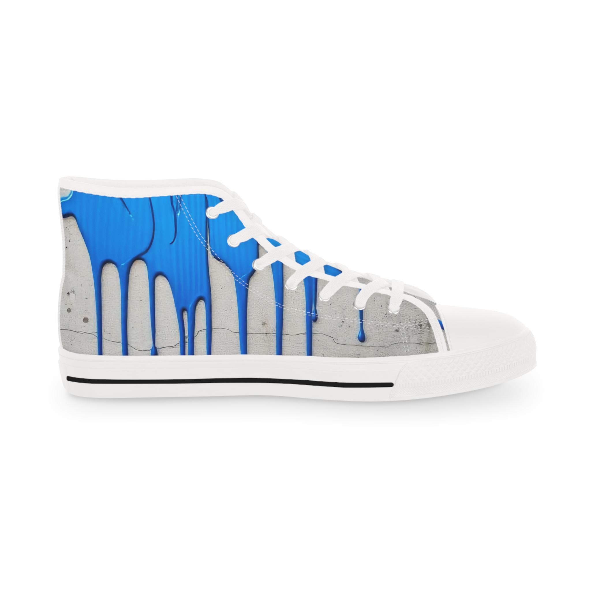 These high-top sneakers bring street-art energy to everyday steps. The full-wrap design shows layered blue drips over a soft grey, distressed backdrop — a look that reads like a mural painted right onto your shoes. Lightweight EVA insoles with memory-foam deodorant cushioning absorb impact and stay fresh, while the pleather toe and durable rubber outsole stand up to city wear. Silver metal eyelets and breathable polyester canvas keep the sneakers feeling airy and secure. Wear them on gallery nights, weekend coffee runs, or while sketching in a favorite park — they carry color, attitude, and comfort wherever you go.