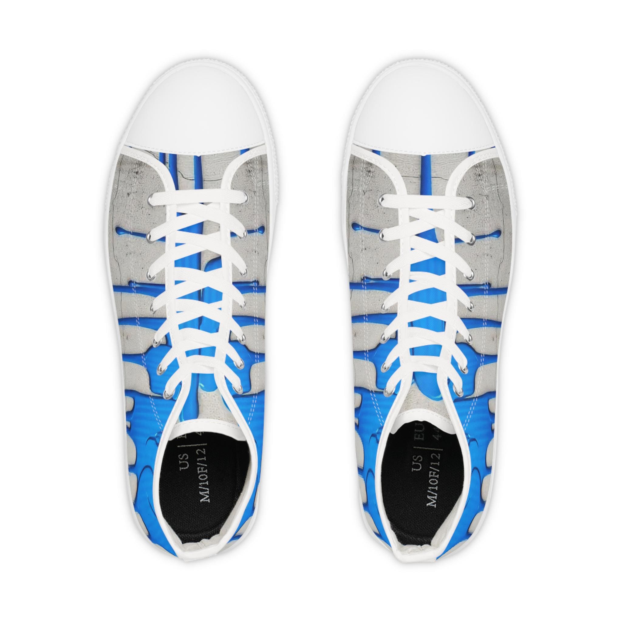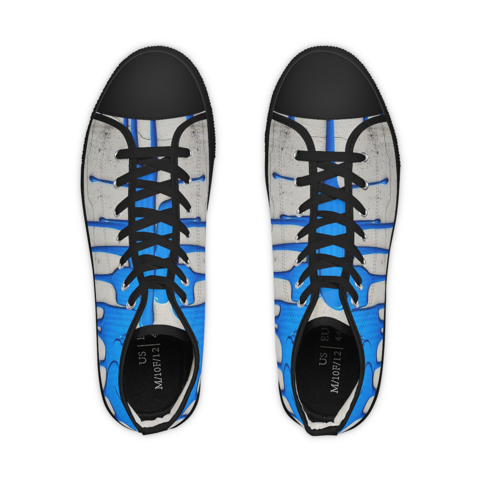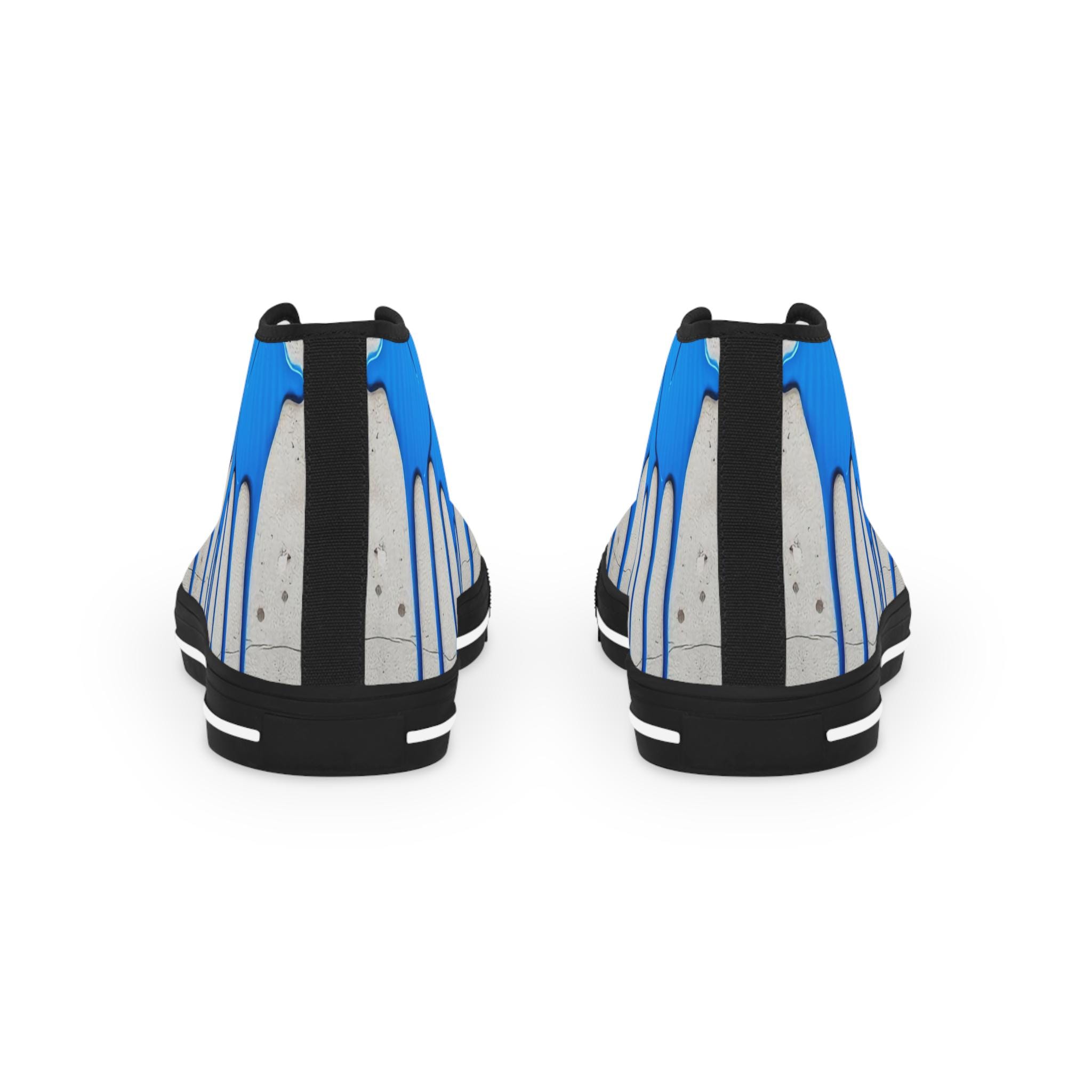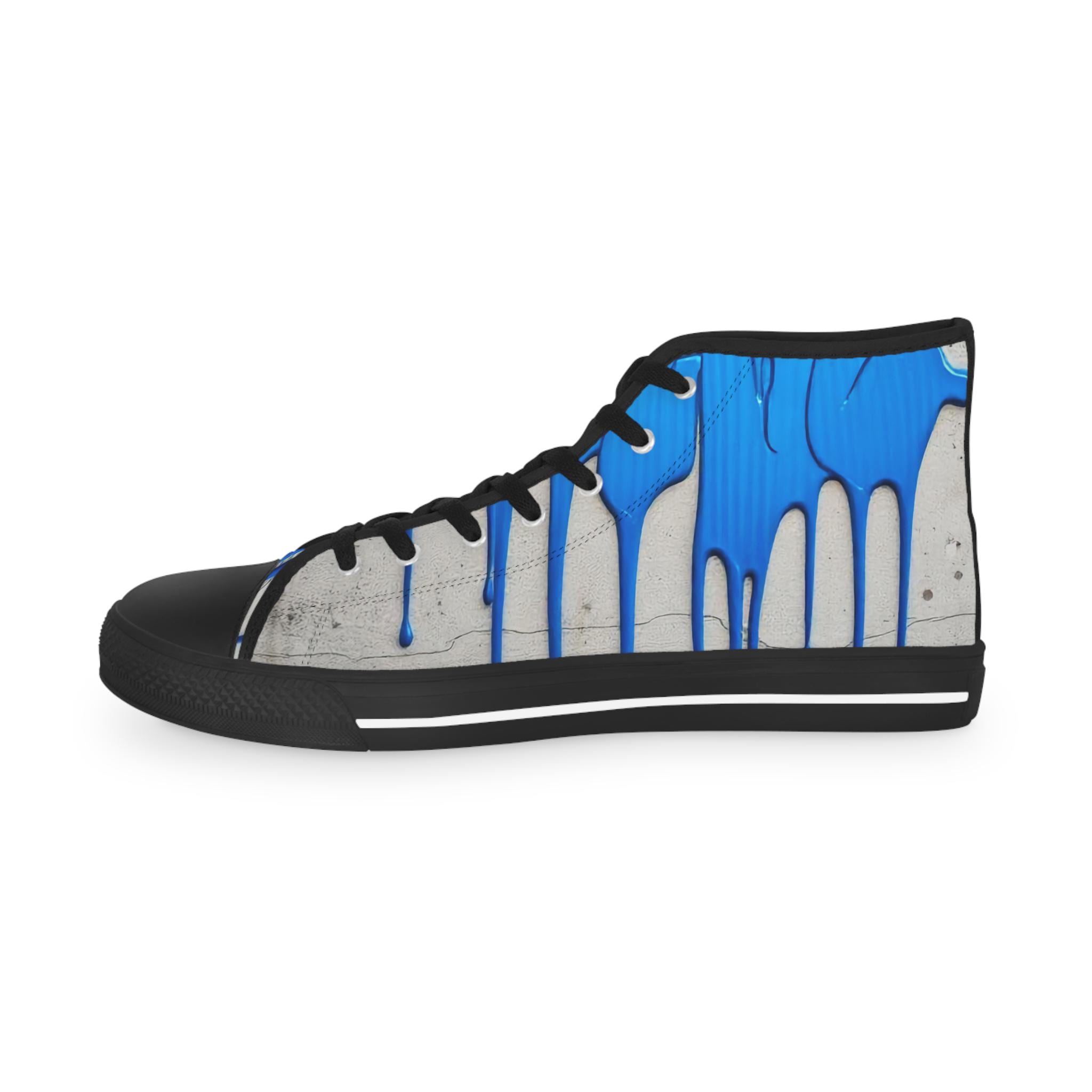 These high-top sneakers bring street-art energy to everyday steps. The full-wrap design shows layered blue drips over a soft grey, distressed backdrop — a look that reads like a mural painted right onto your shoes. Lightweight EVA insoles with memory-foam deodorant cushioning absorb impact and stay fresh, while the pleather toe and durable rubber outsole stand up to city wear. Silver metal eyelets and breathable polyester canvas keep the sneakers feeling airy and secure. Wear them on gallery nights, weekend coffee runs, or while sketching in a favorite park — they carry color, attitude, and comfort wherever you go.