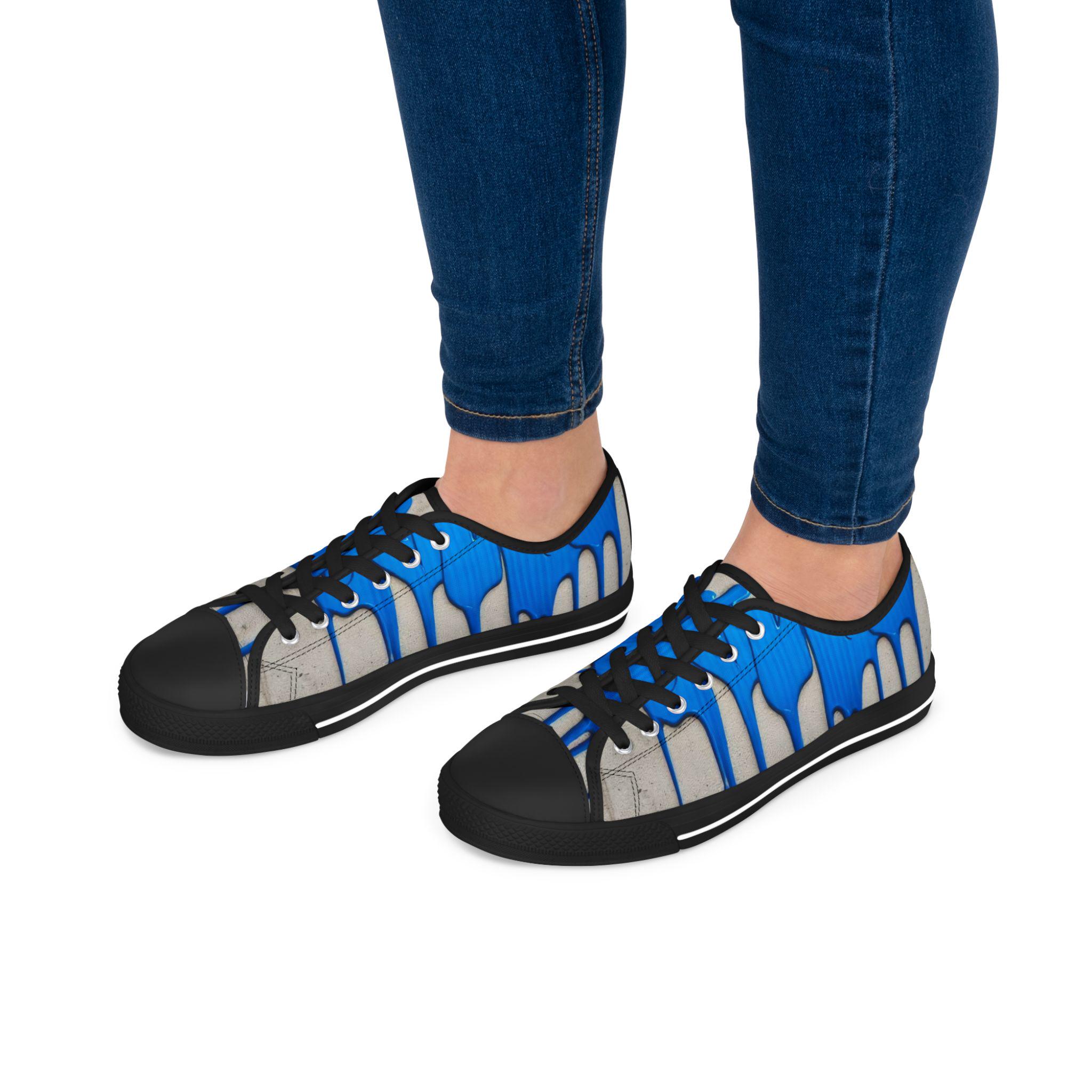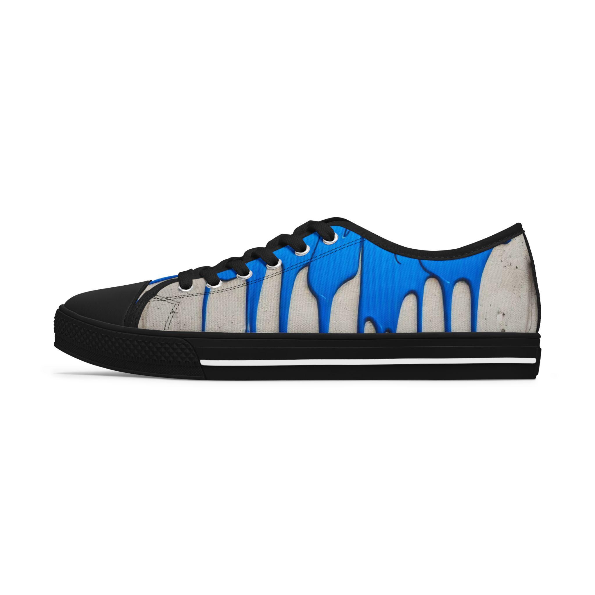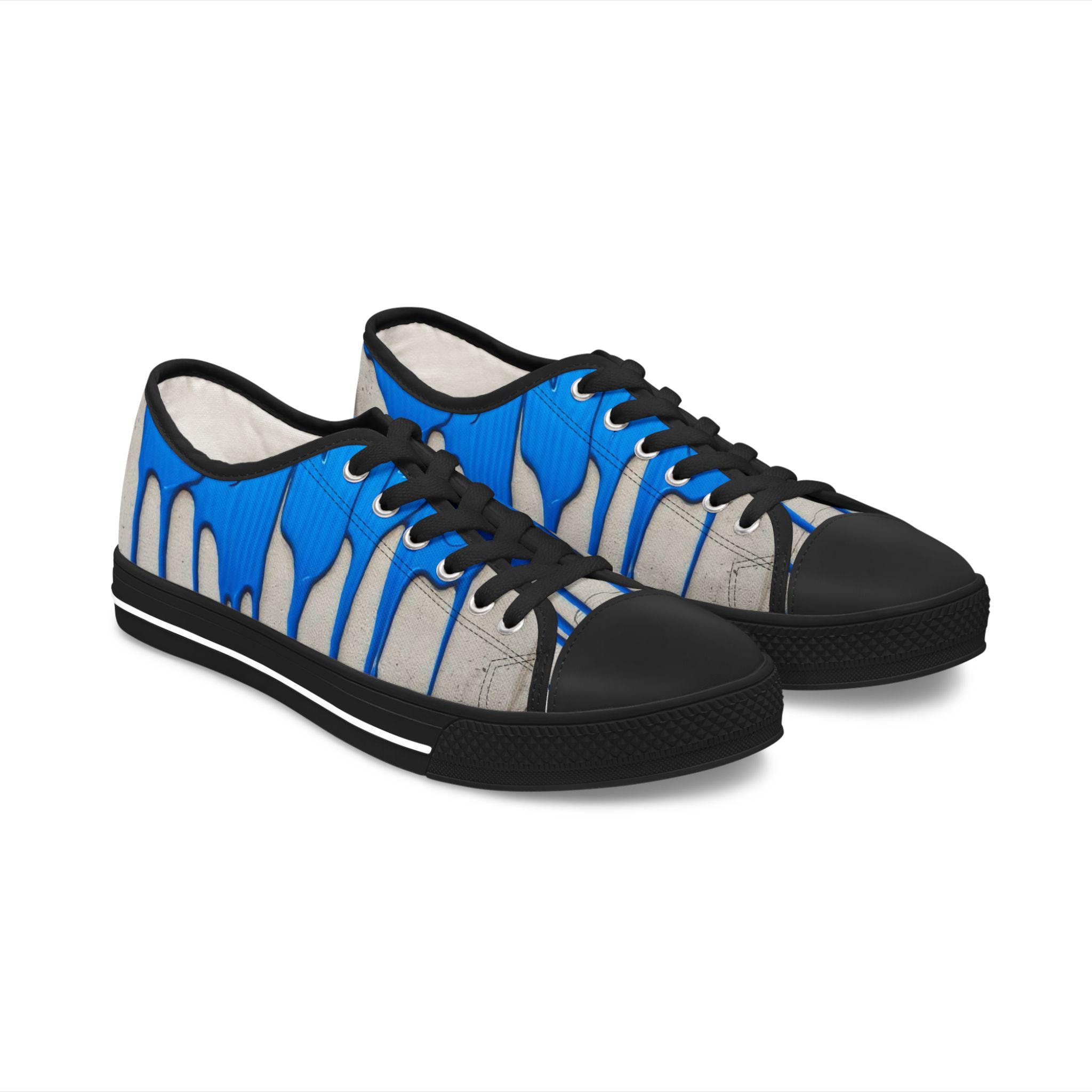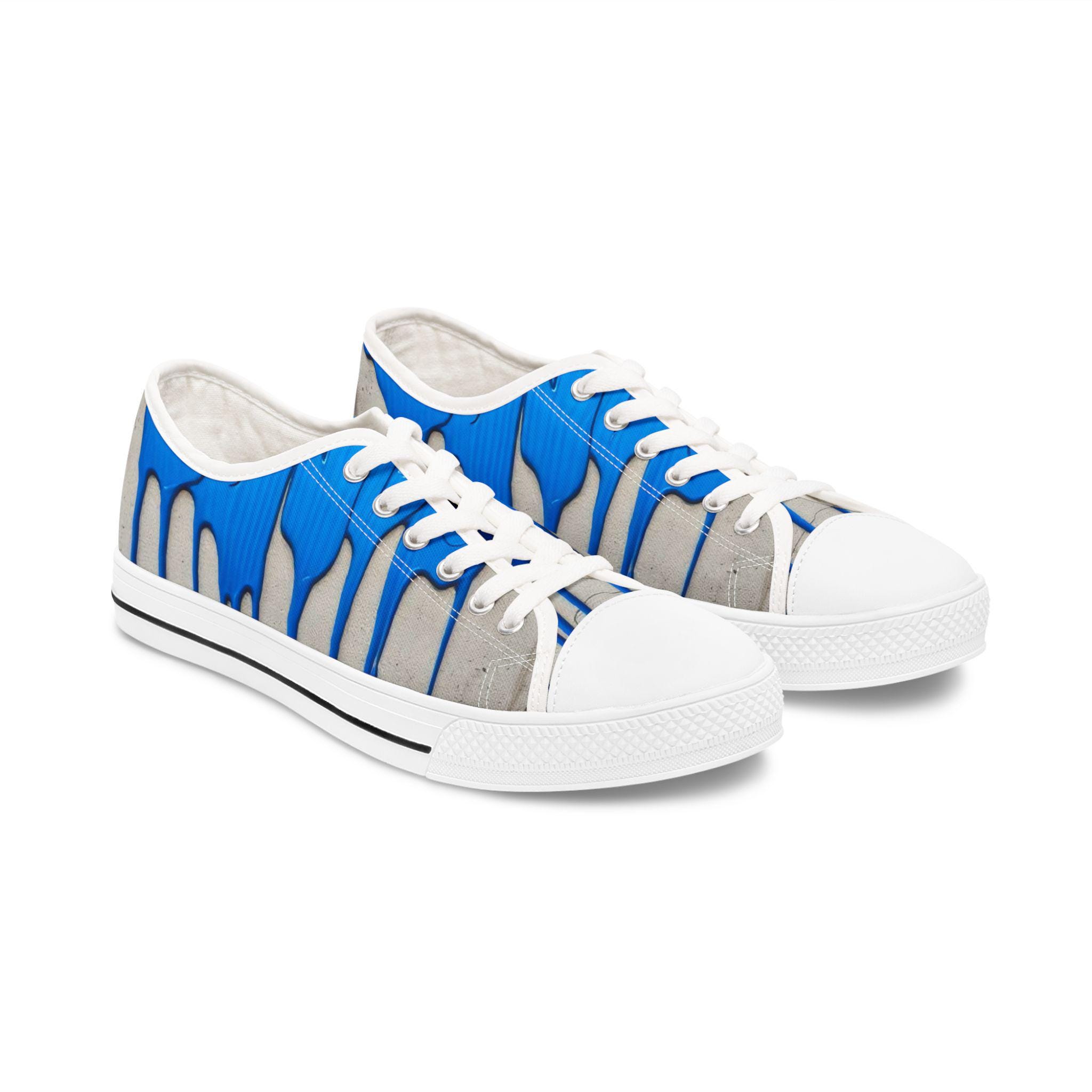 These low-top canvas sneakers bring an artful, urban edge to everyday steps. Bright cobalt drips run over a weathered concrete backdrop, like fresh paint on a city wall — energetic and unexpected. The foam-lined polyester canvas and memory-foam insoles cushion long walks, while the EVA midsole and durable rubber outsole keep every stride light and springy. Metal eyelets and pleather-reinforced toe add small, resilient details that age well with wear. Wear them to add a loud, creative accent to a neutral outfit, to carry you through gallery crawls, skatepark hangs, or casual coffee runs.