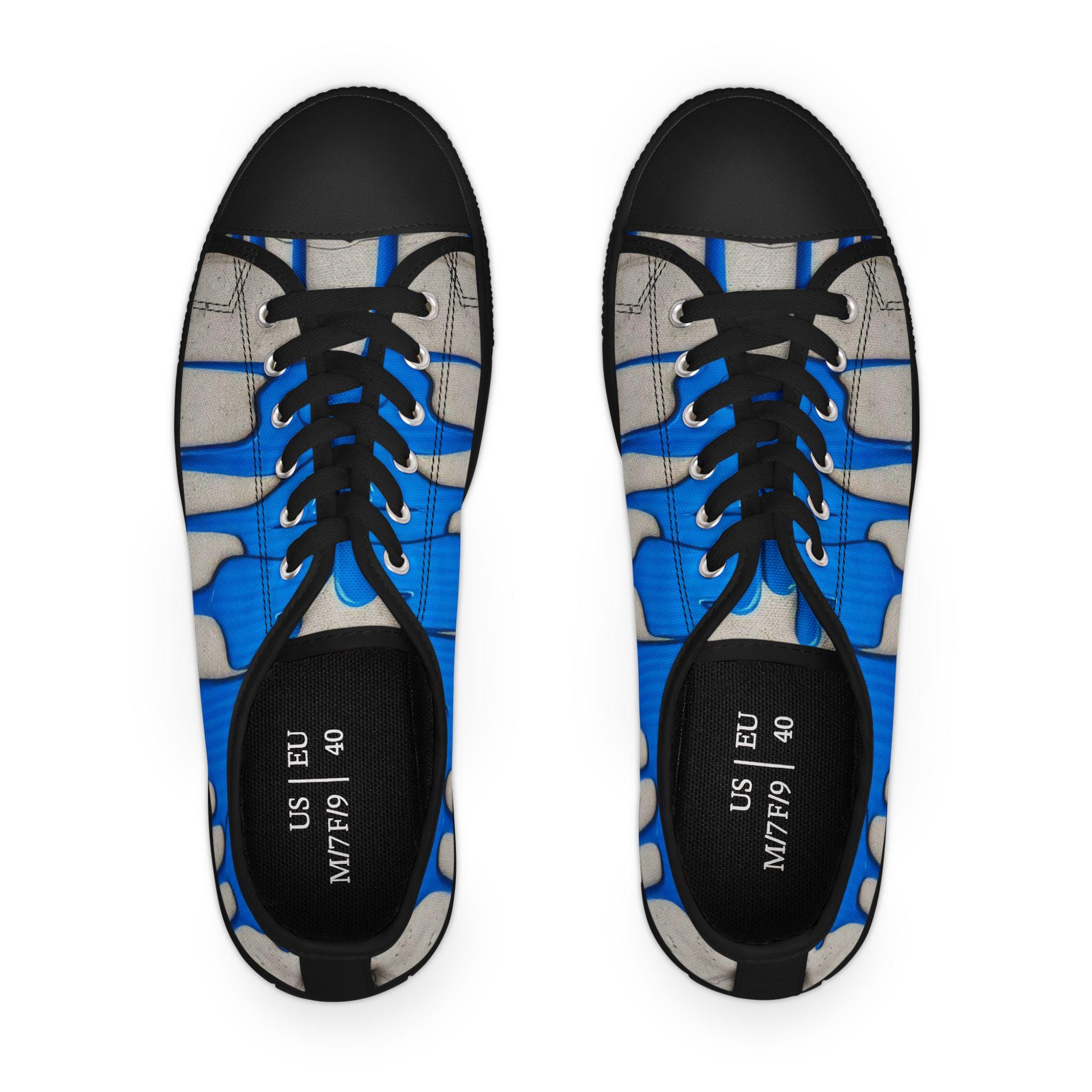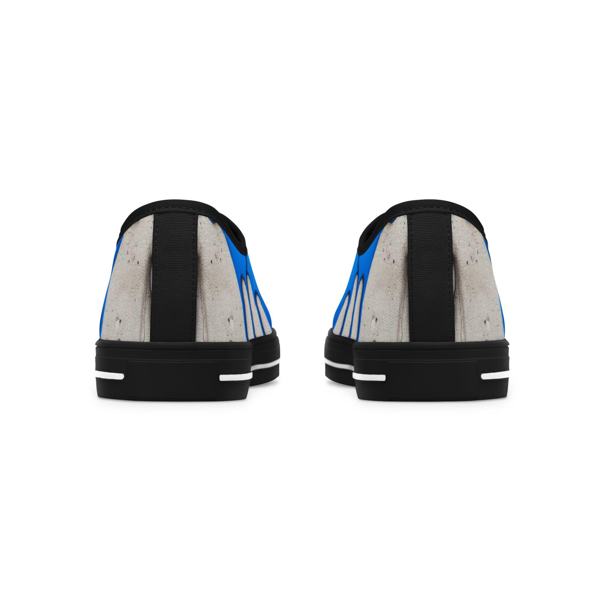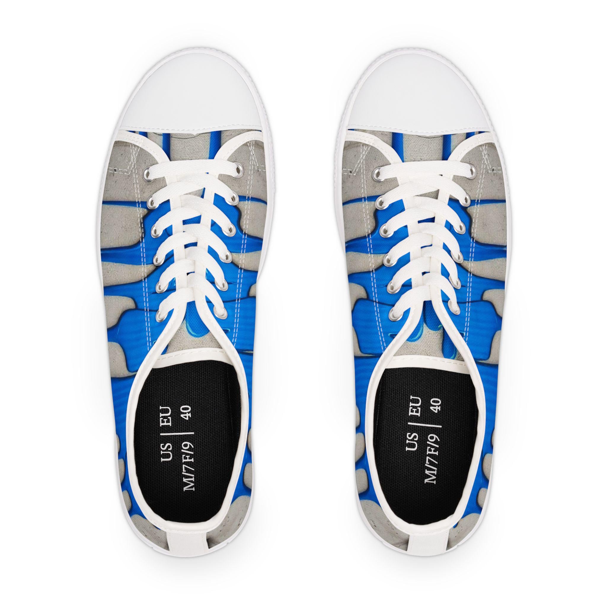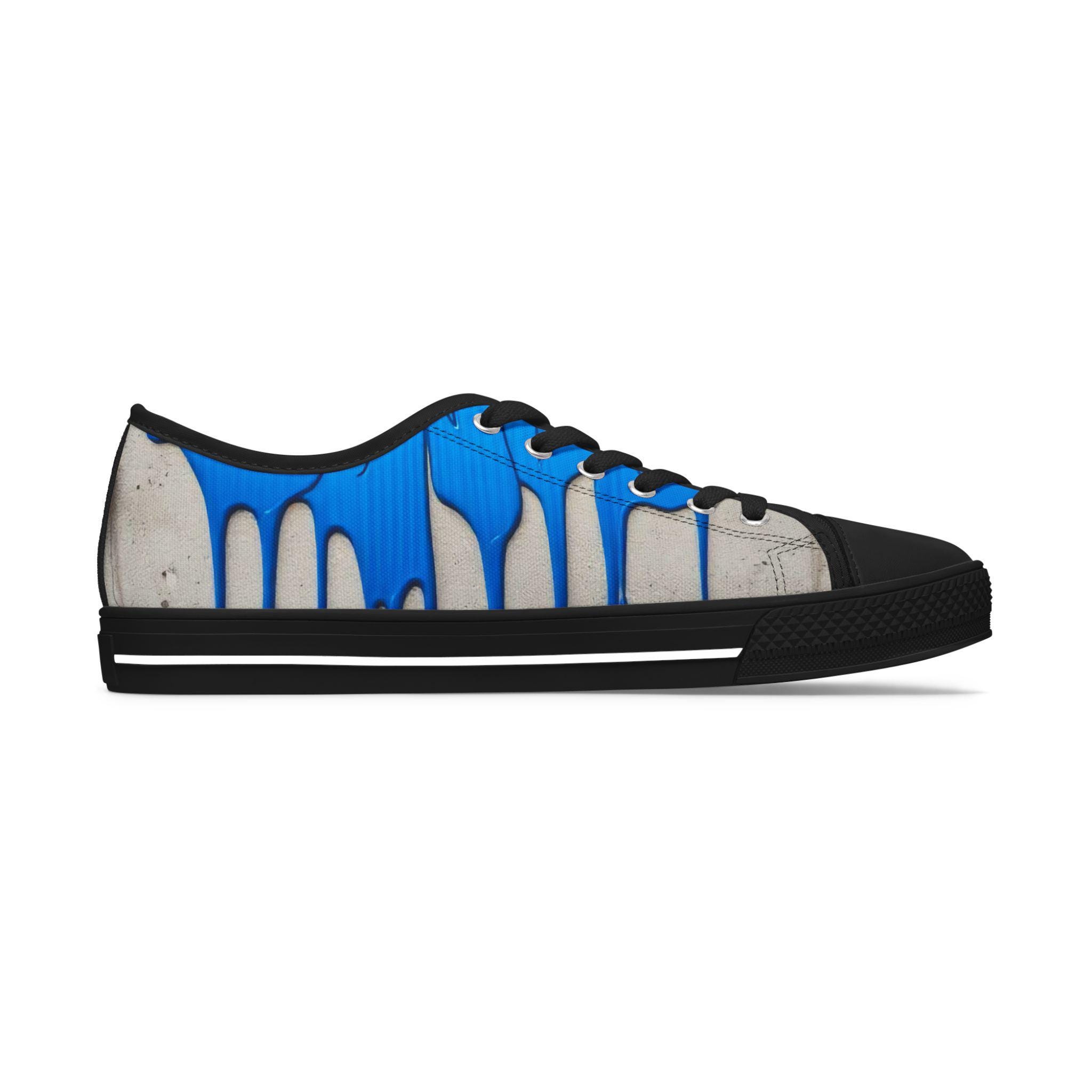 These low-top canvas sneakers bring an artful, urban edge to everyday steps. Bright cobalt drips run over a weathered concrete backdrop, like fresh paint on a city wall — energetic and unexpected. The foam-lined polyester canvas and memory-foam insoles cushion long walks, while the EVA midsole and durable rubber outsole keep every stride light and springy. Metal eyelets and pleather-reinforced toe add small, resilient details that age well with wear. Wear them to add a loud, creative accent to a neutral outfit, to carry you through gallery crawls, skatepark hangs, or casual coffee runs.