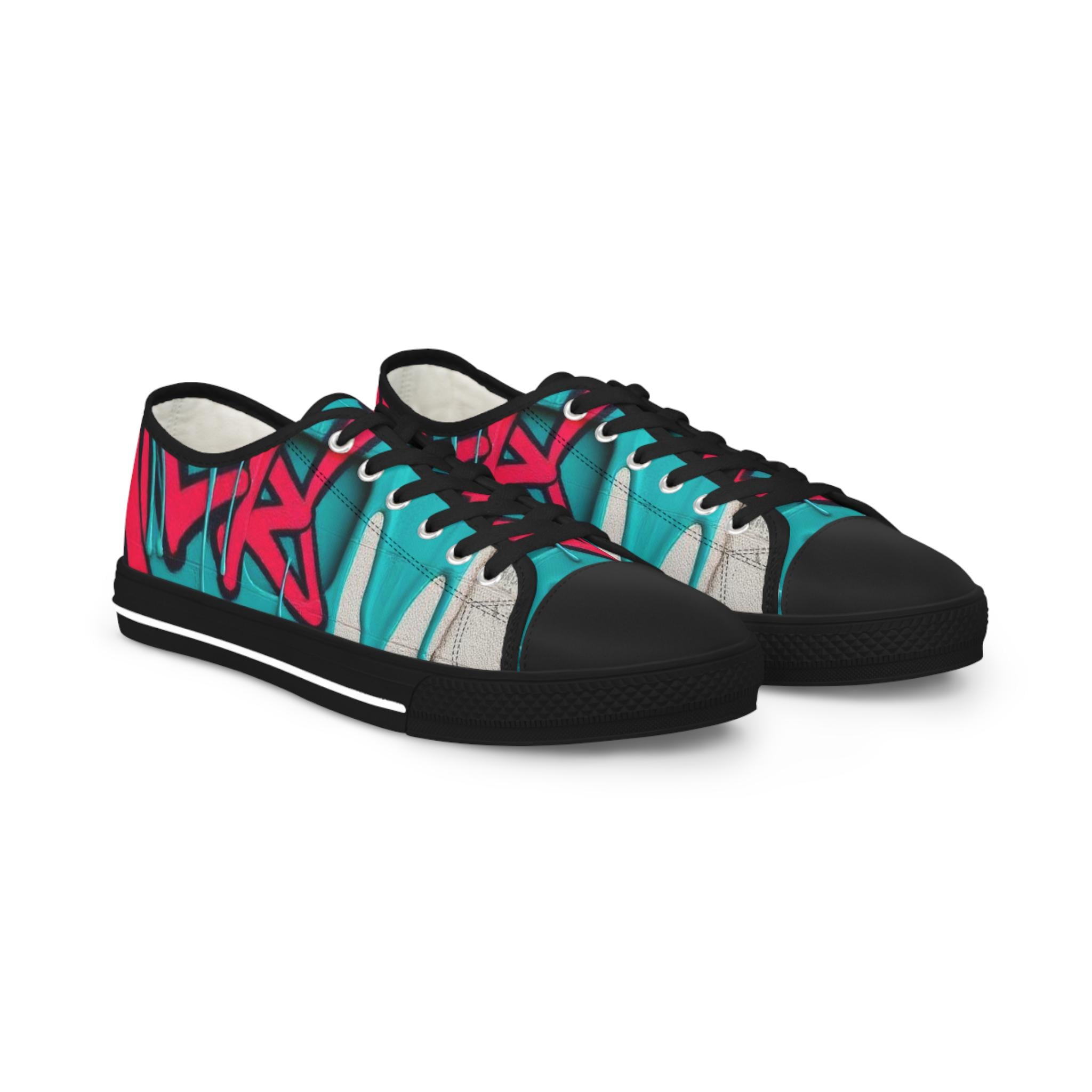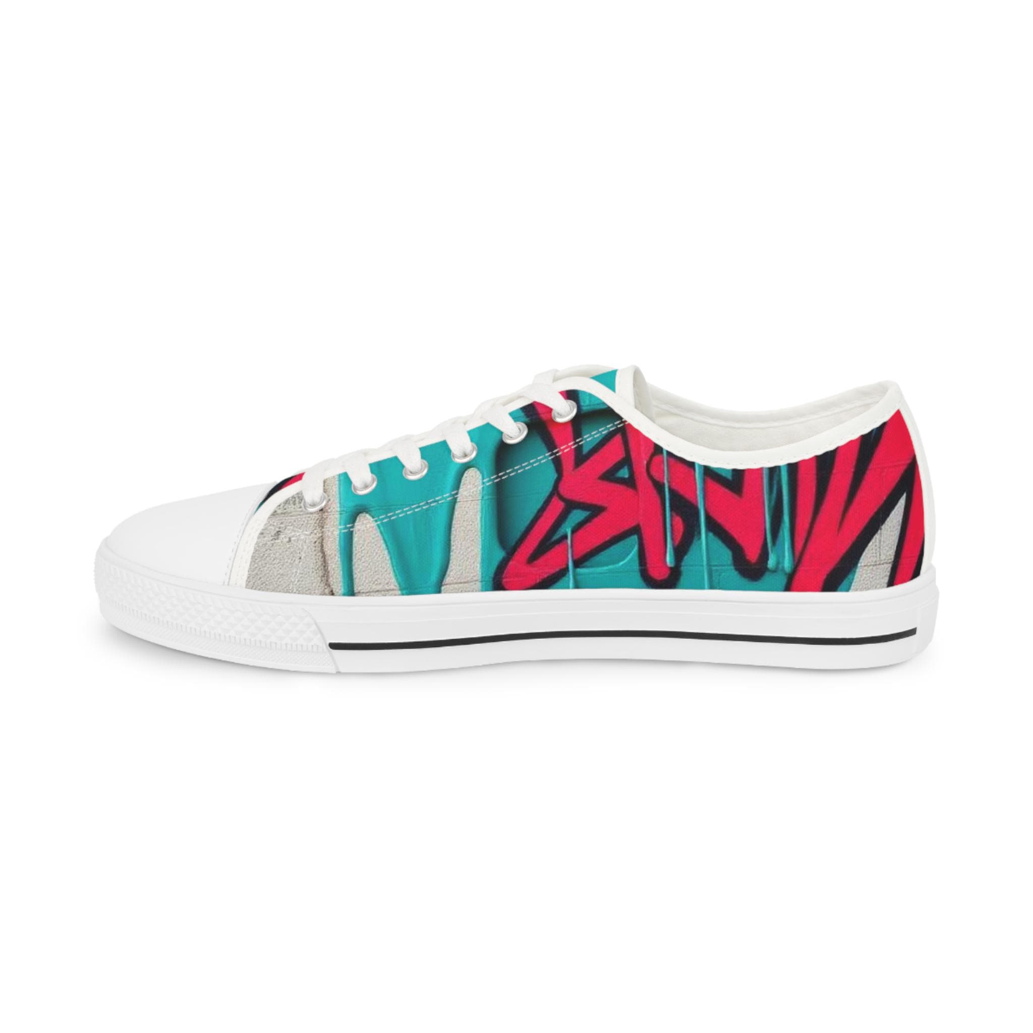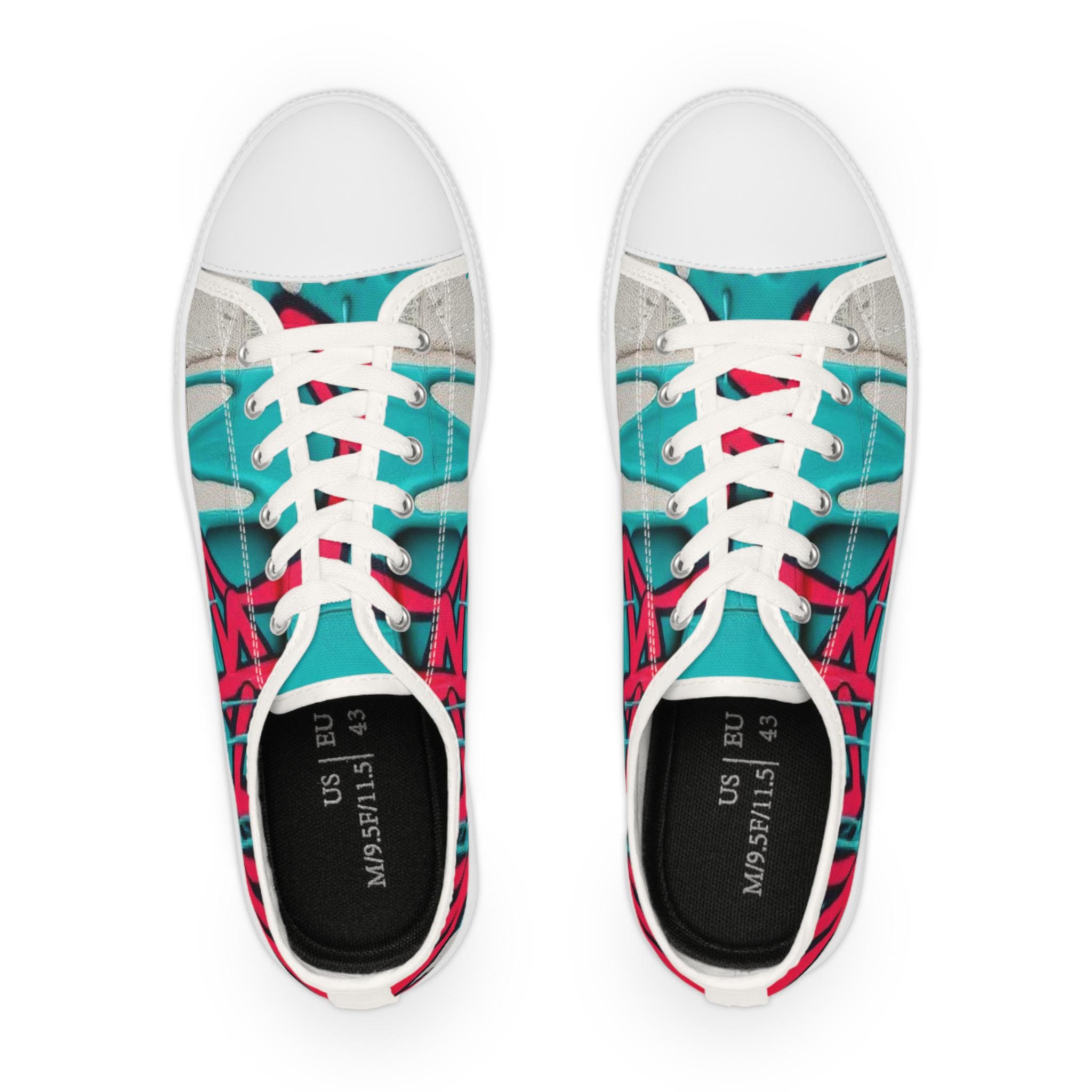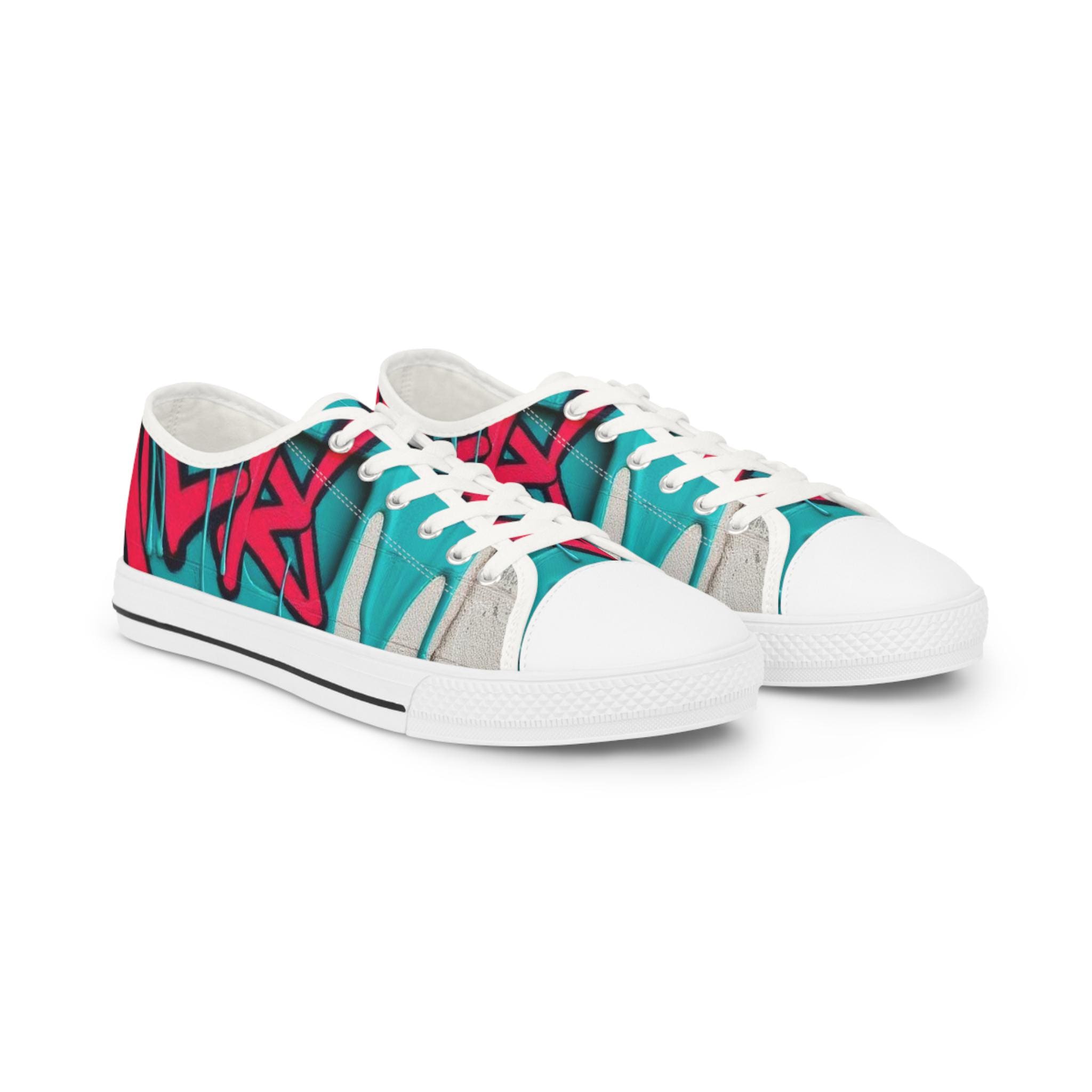 Bright, streetwise sneakers that carry bold graffiti energy into everyday wear. The low-profile silhouette pairs breathable polyester canvas with PU leather accents and pleather toe protection, so the shoes stay light while standing up to city life. Memory-foam insoles and EVA shock absorption give a cushioned, responsive step whether you’re walking blocks or hopping on transit. Full wraparound print keeps the vibrant teal-and-raspberry artwork uninterrupted from tongue to heel. Runs slightly large—size down if you prefer a snug fit.
