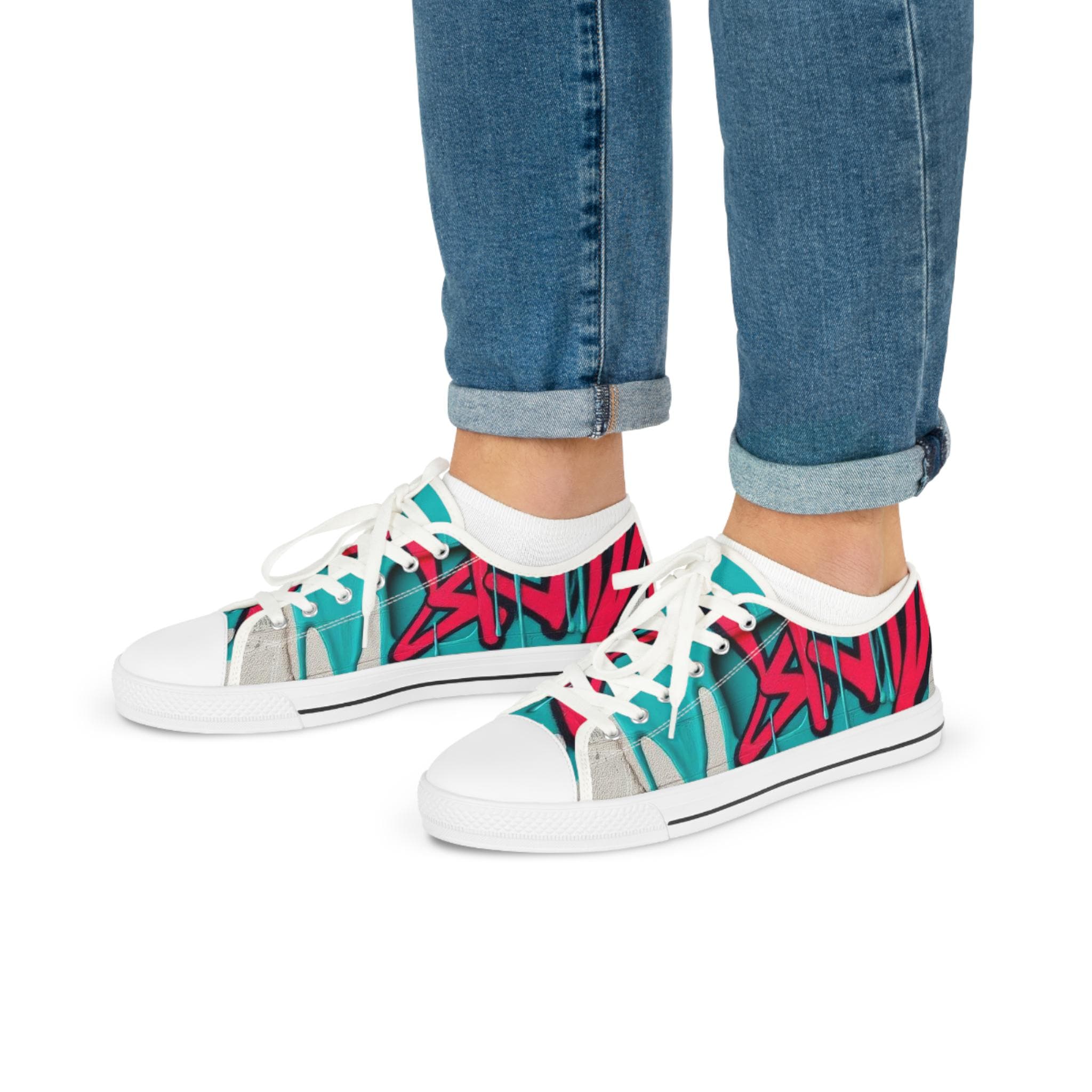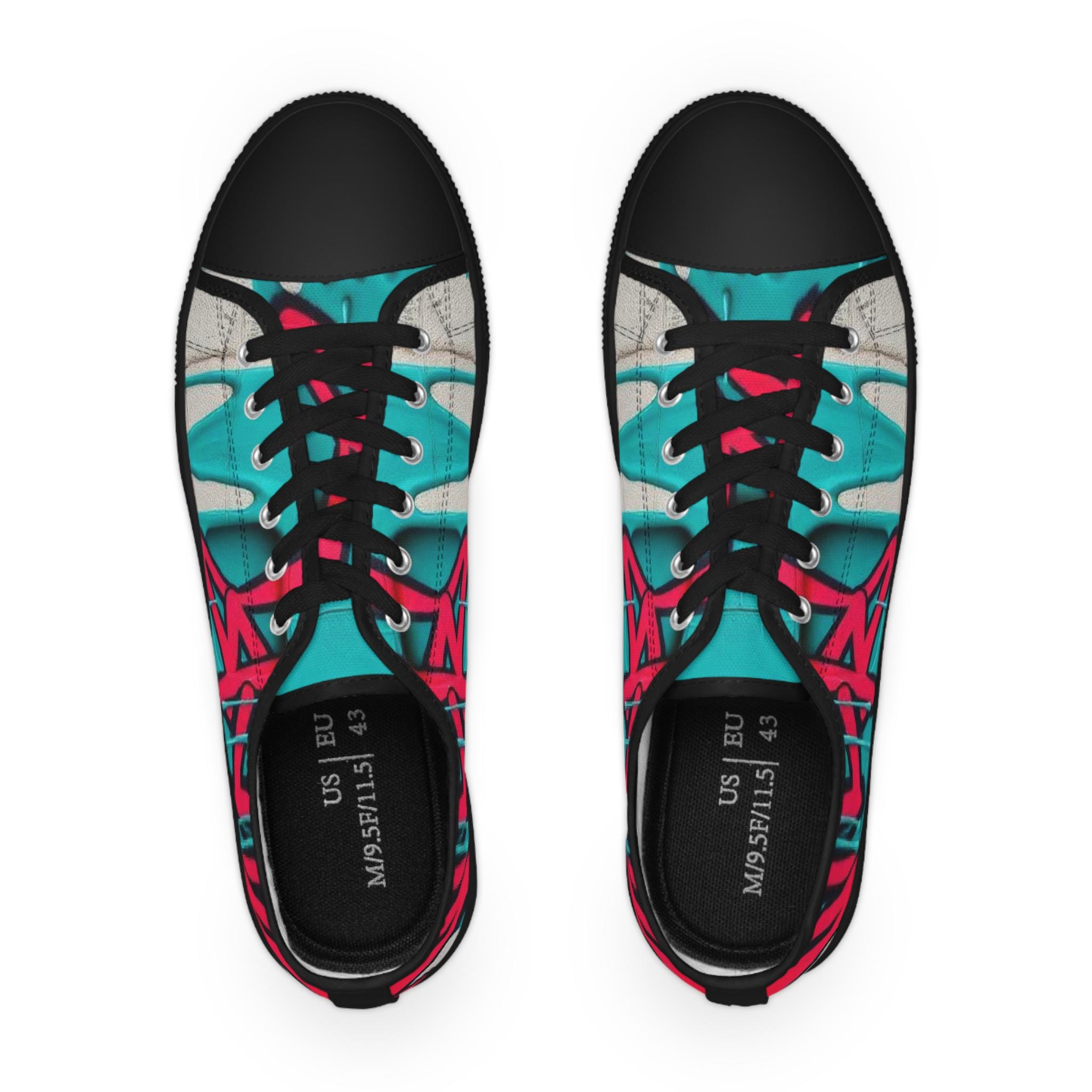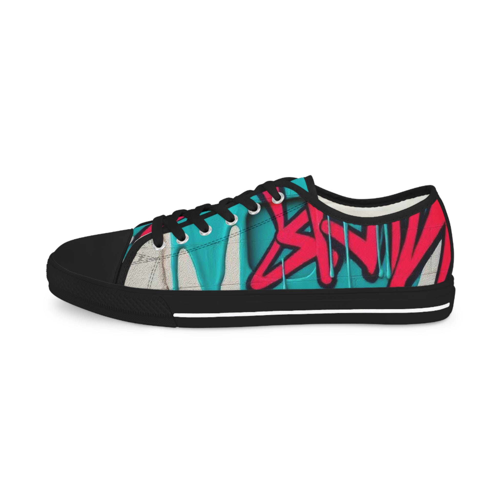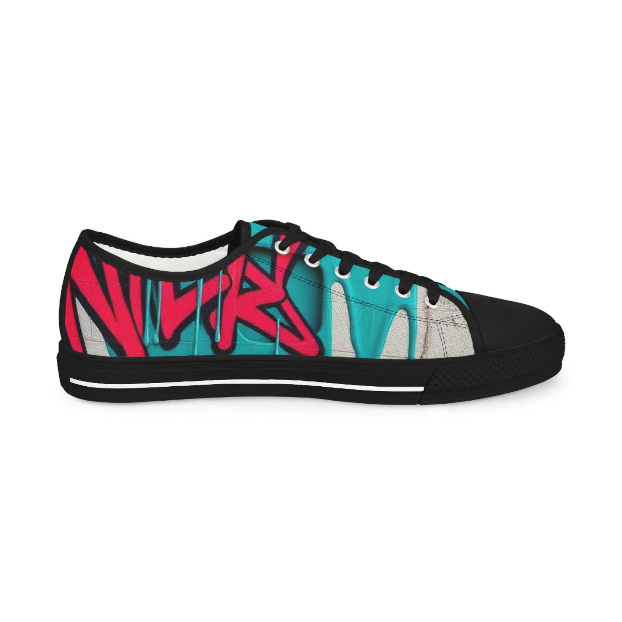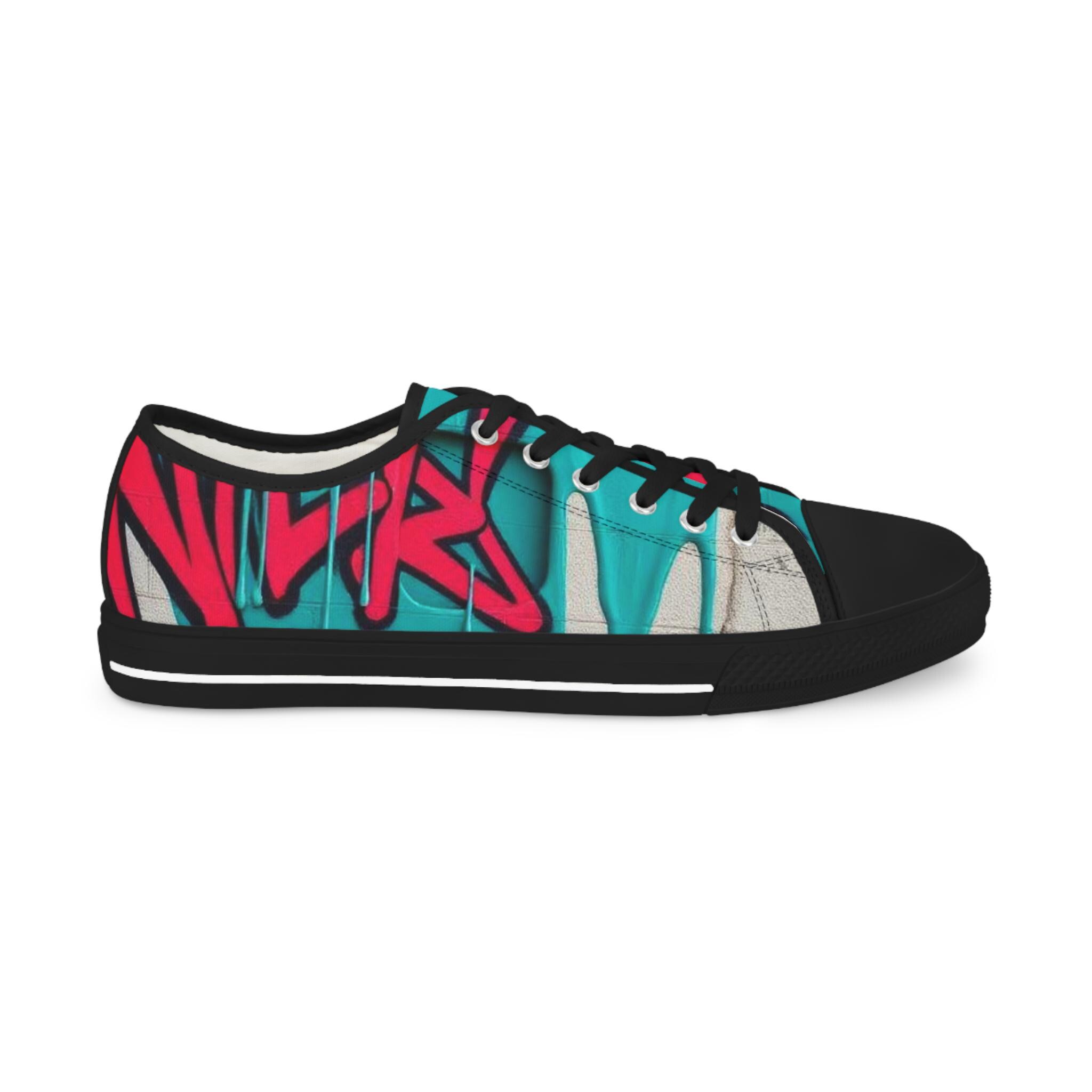 Bright, streetwise sneakers that carry bold graffiti energy into everyday wear. The low-profile silhouette pairs breathable polyester canvas with PU leather accents and pleather toe protection, so the shoes stay light while standing up to city life. Memory-foam insoles and EVA shock absorption give a cushioned, responsive step whether you’re walking blocks or hopping on transit. Full wraparound print keeps the vibrant teal-and-raspberry artwork uninterrupted from tongue to heel. Runs slightly large—size down if you prefer a snug fit.