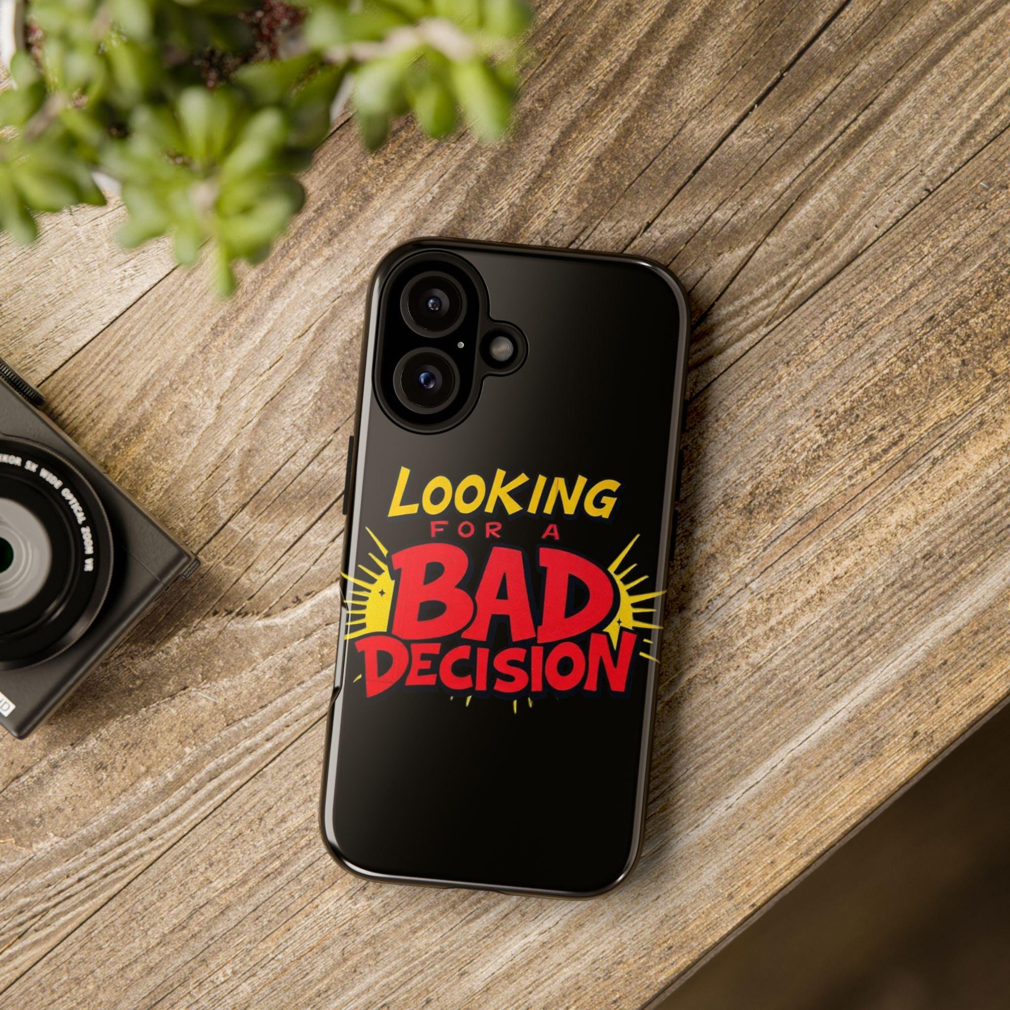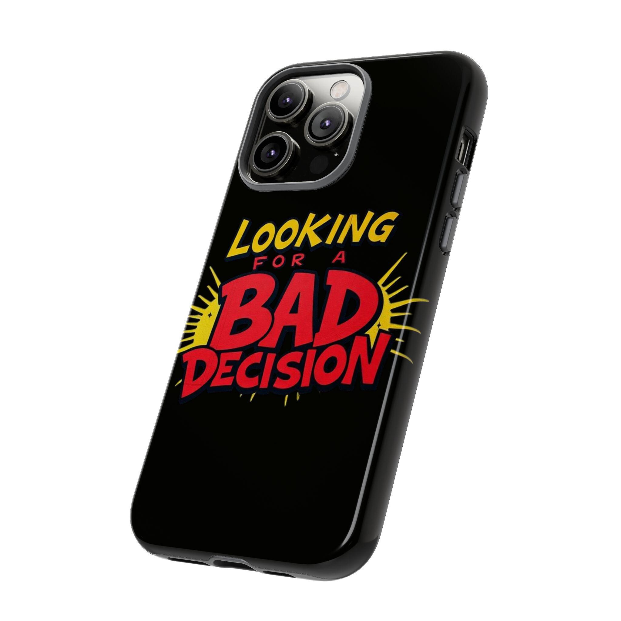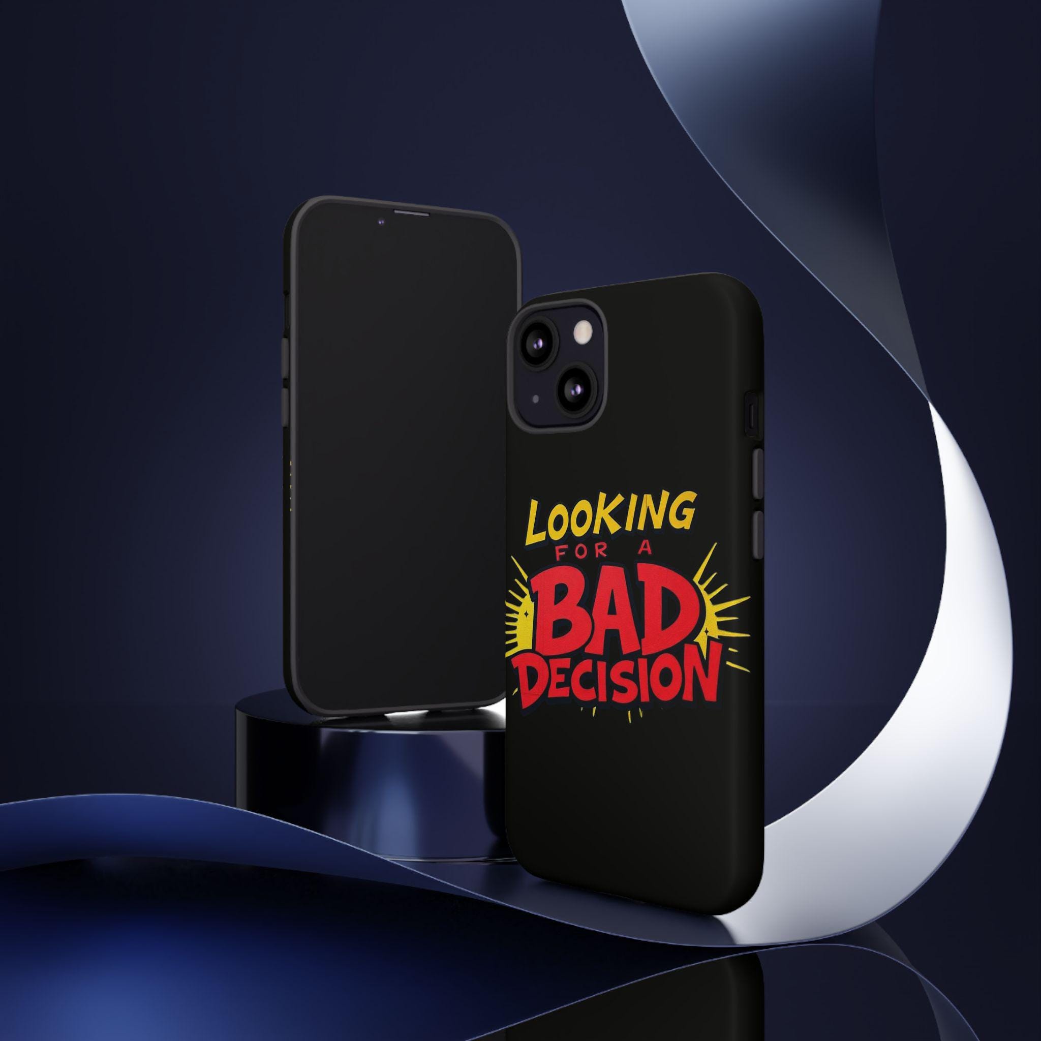 A slim, tough phone case that brings attitude and protection to your everyday carry. Bold retro lettering pops against a deep matte black background: “Looking for a Bad Decision” reads like a dare, playful and unapologetic. The dual-layer build and silicone liner absorb shocks so your phone survives the slips, drops, and small adventures that come with city nights and weekend escapes. Finished with a high-density 3D wrap and UV-resistant inks, the graphic stays vivid even after sun-soaked days. Clear port openings keep connectivity hassle-free and wireless charging works without removing the case. This case fits into the life of someone who moves fast, laughs loud, and doesn’t take themselves too seriously—carry that energy wherever you go.