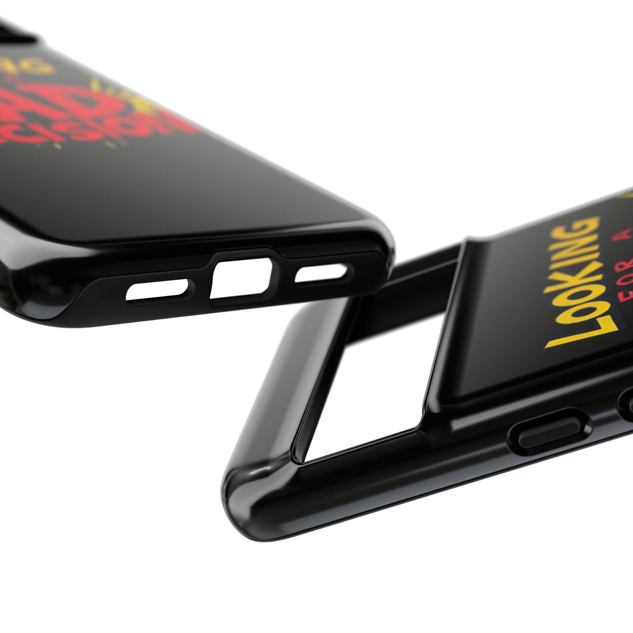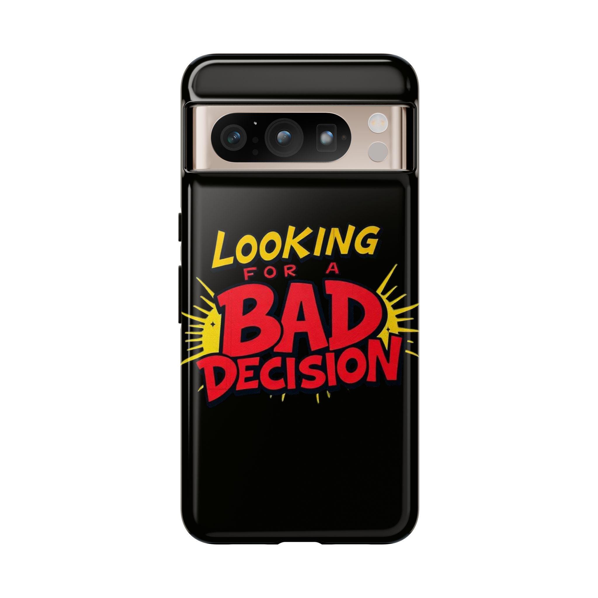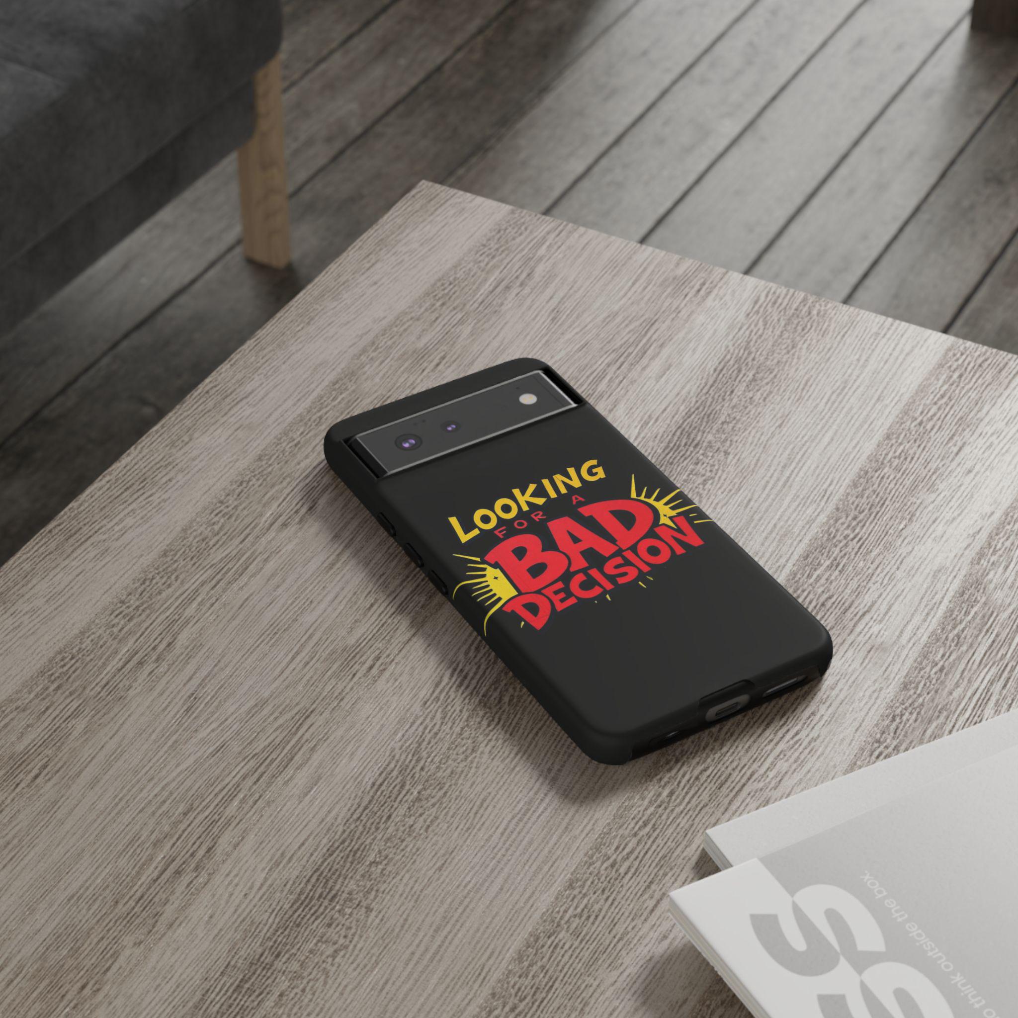 A slim, tough phone case that brings attitude and protection to your everyday carry. Bold retro lettering pops against a deep matte black background: “Looking for a Bad Decision” reads like a dare, playful and unapologetic. The dual-layer build and silicone liner absorb shocks so your phone survives the slips, drops, and small adventures that come with city nights and weekend escapes. Finished with a high-density 3D wrap and UV-resistant inks, the graphic stays vivid even after sun-soaked days. Clear port openings keep connectivity hassle-free and wireless charging works without removing the case. This case fits into the life of someone who moves fast, laughs loud, and doesn’t take themselves too seriously—carry that energy wherever you go.