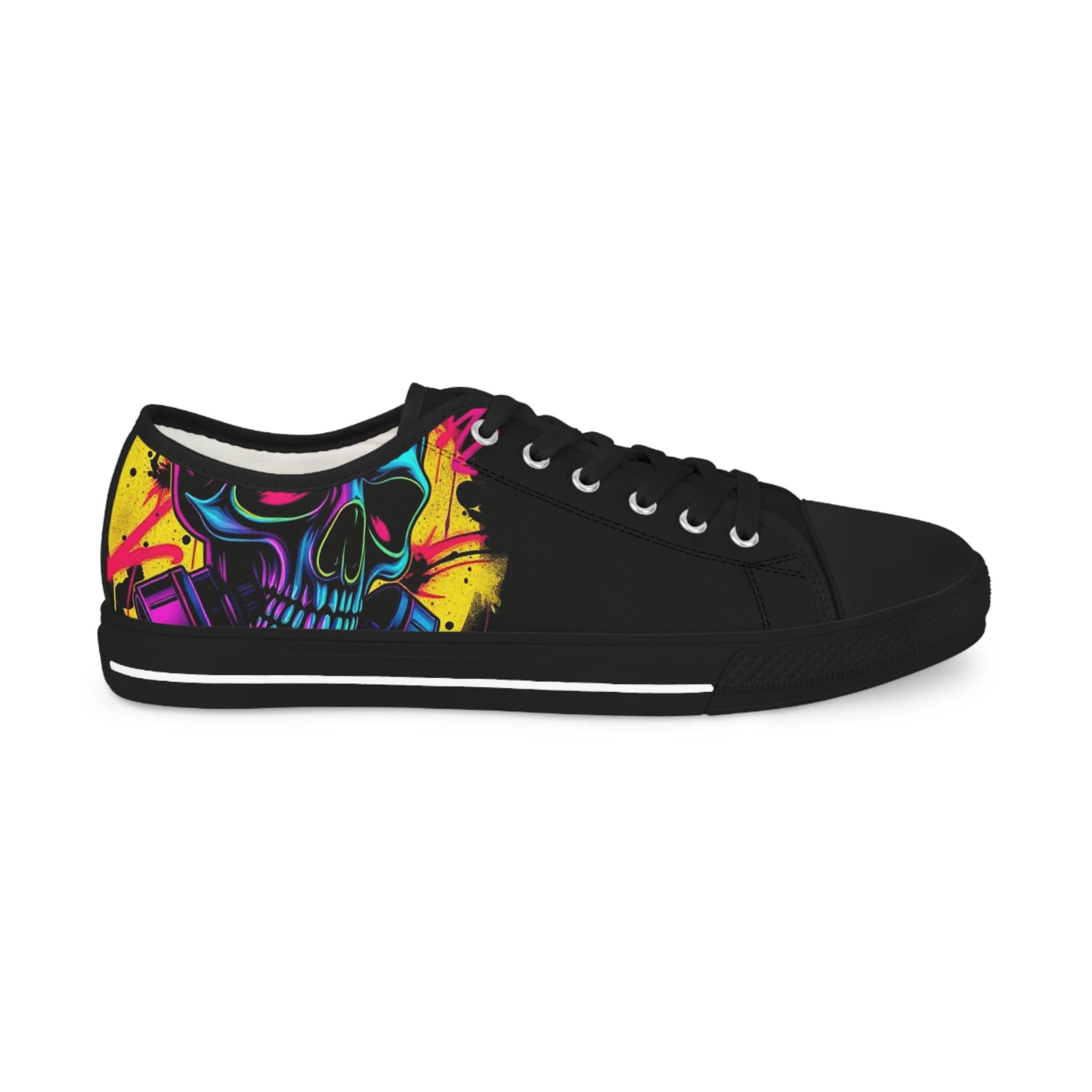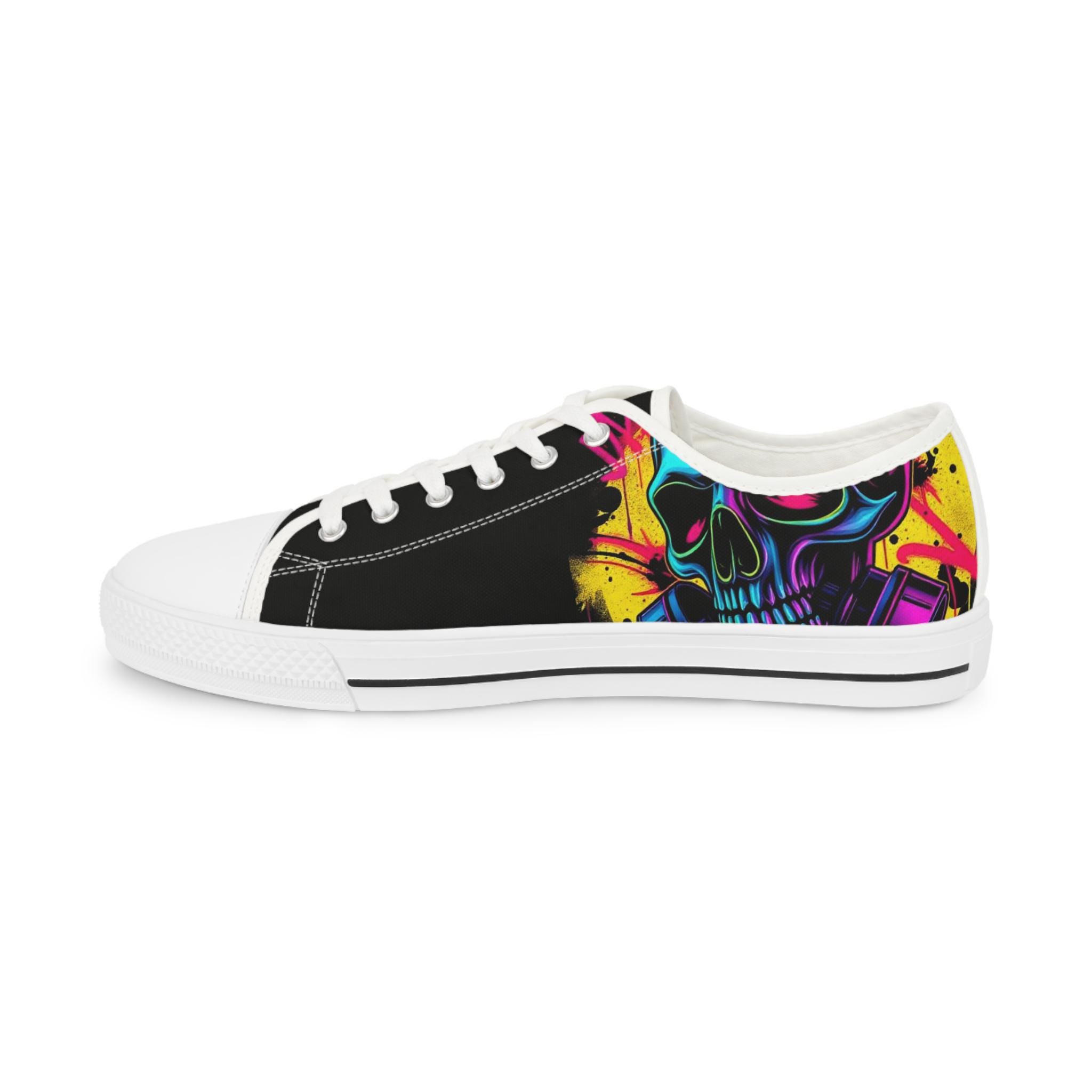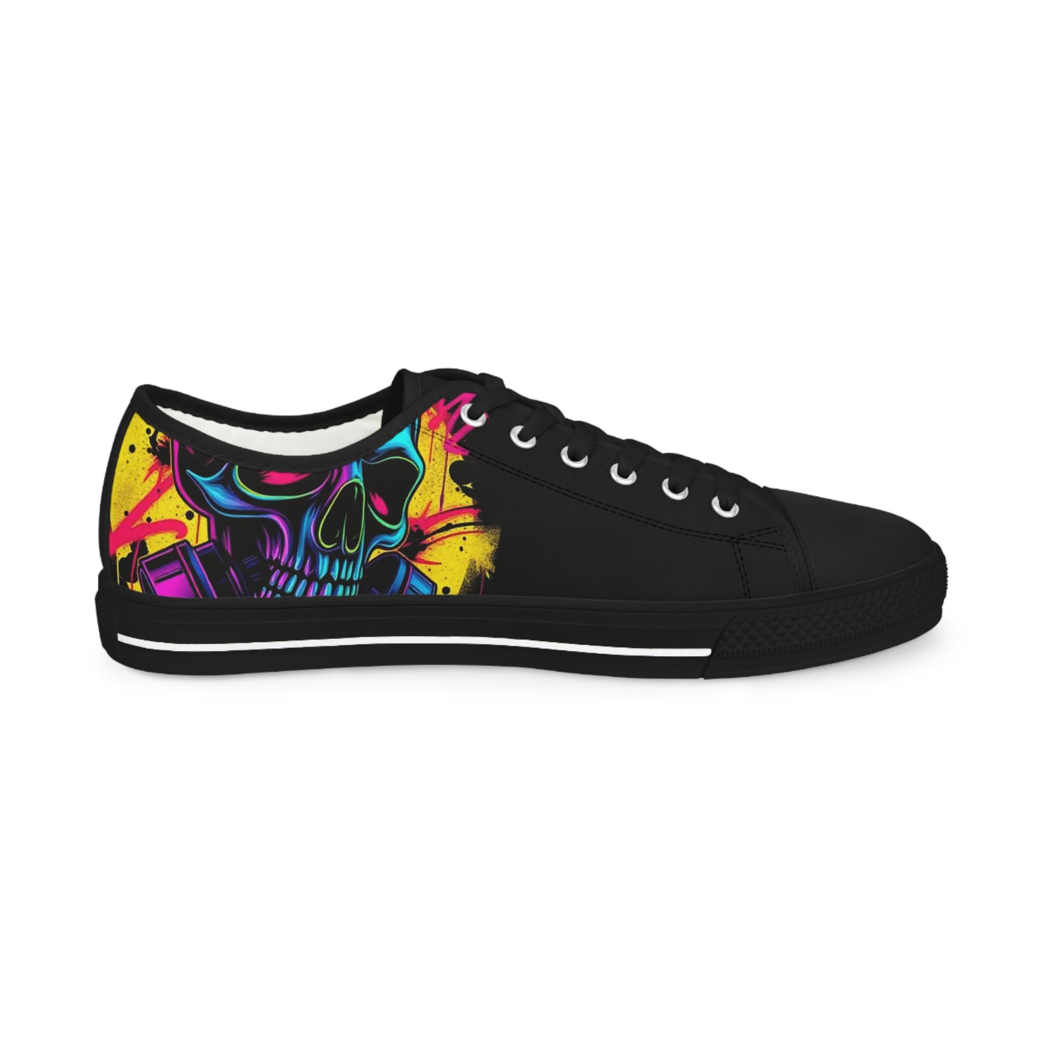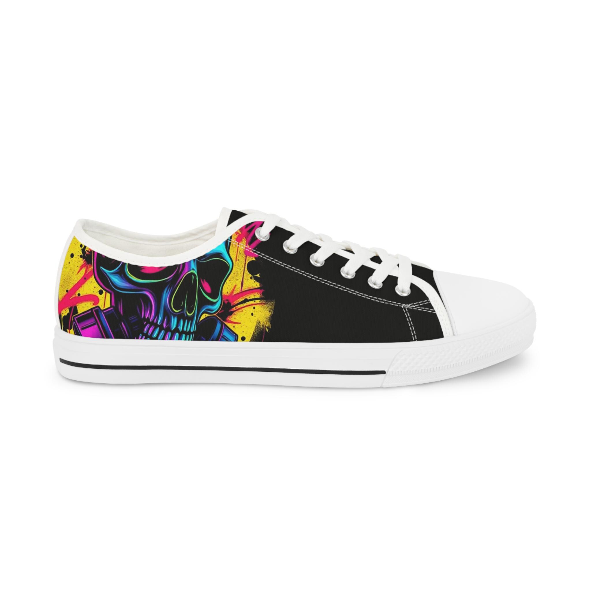 Low-top canvas sneakers with a bold, painterly skull motif that pops against classic black panels. Lightweight EVA soles and memory-foam insoles keep steps springy and comfortable all day. The wraparound print flows across both sides and the tongue, so every angle shows off bright, neon-like splashes of color. Metal eyelets, pleather toe caps, and rubber outsoles add durable details that handle daily wear. These shoes run slightly large — size down for a snugger fit. Wear them to showcase a rebellious, art-forward look whether you're wandering city streets, heading to a gig, or meeting friends for coffee.