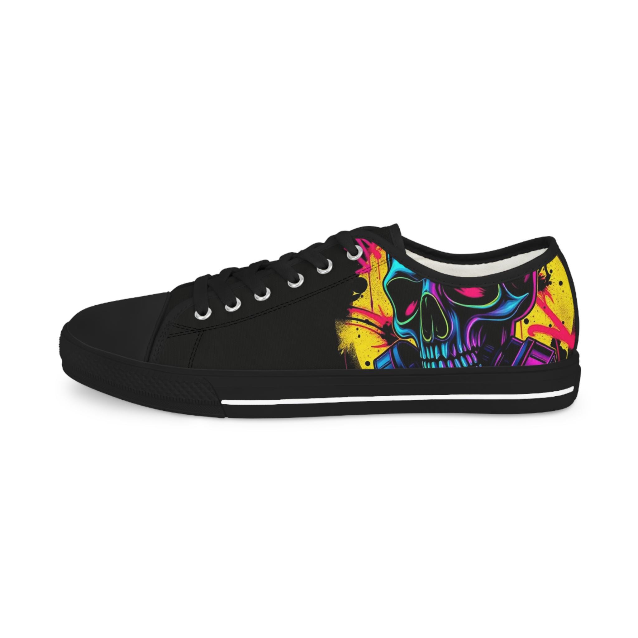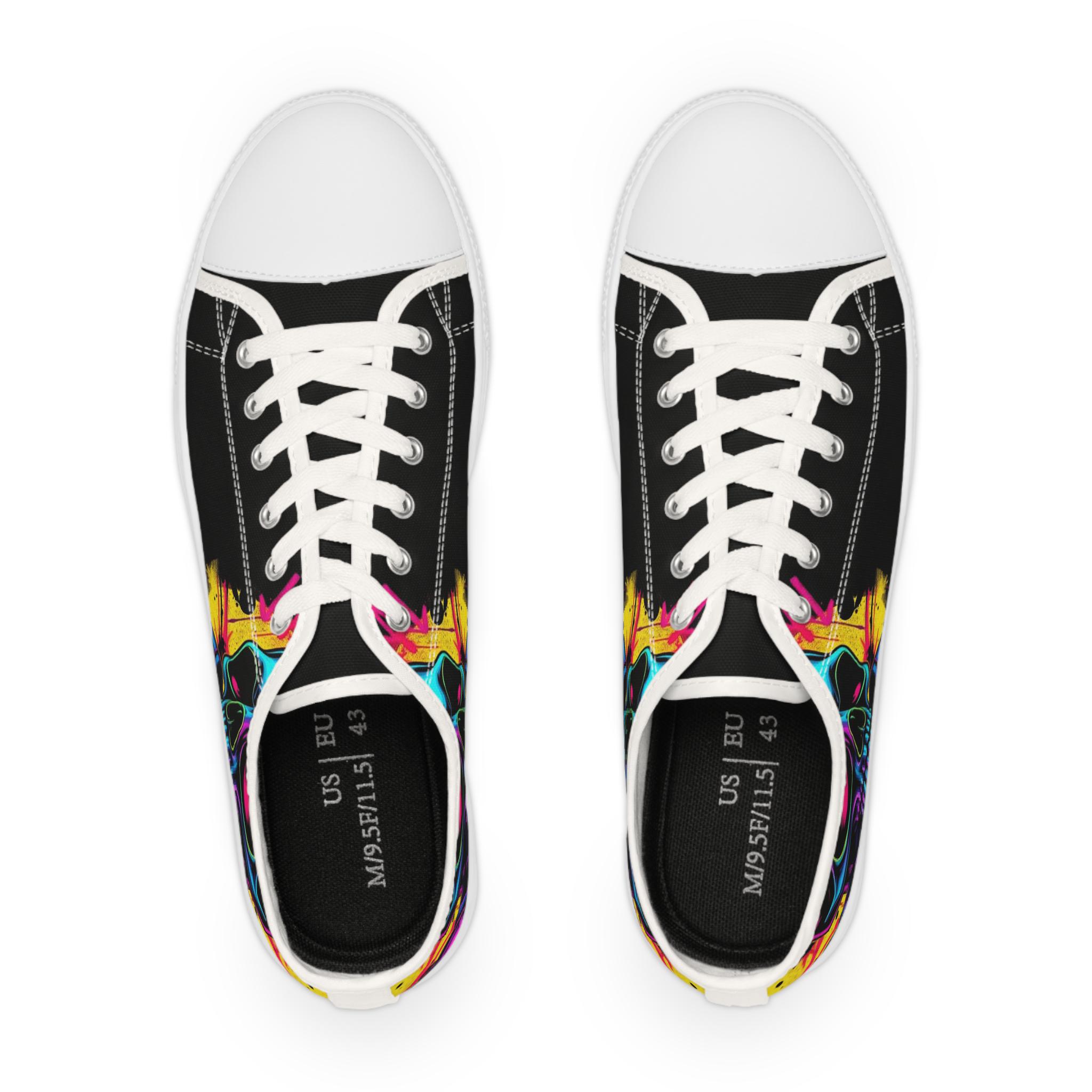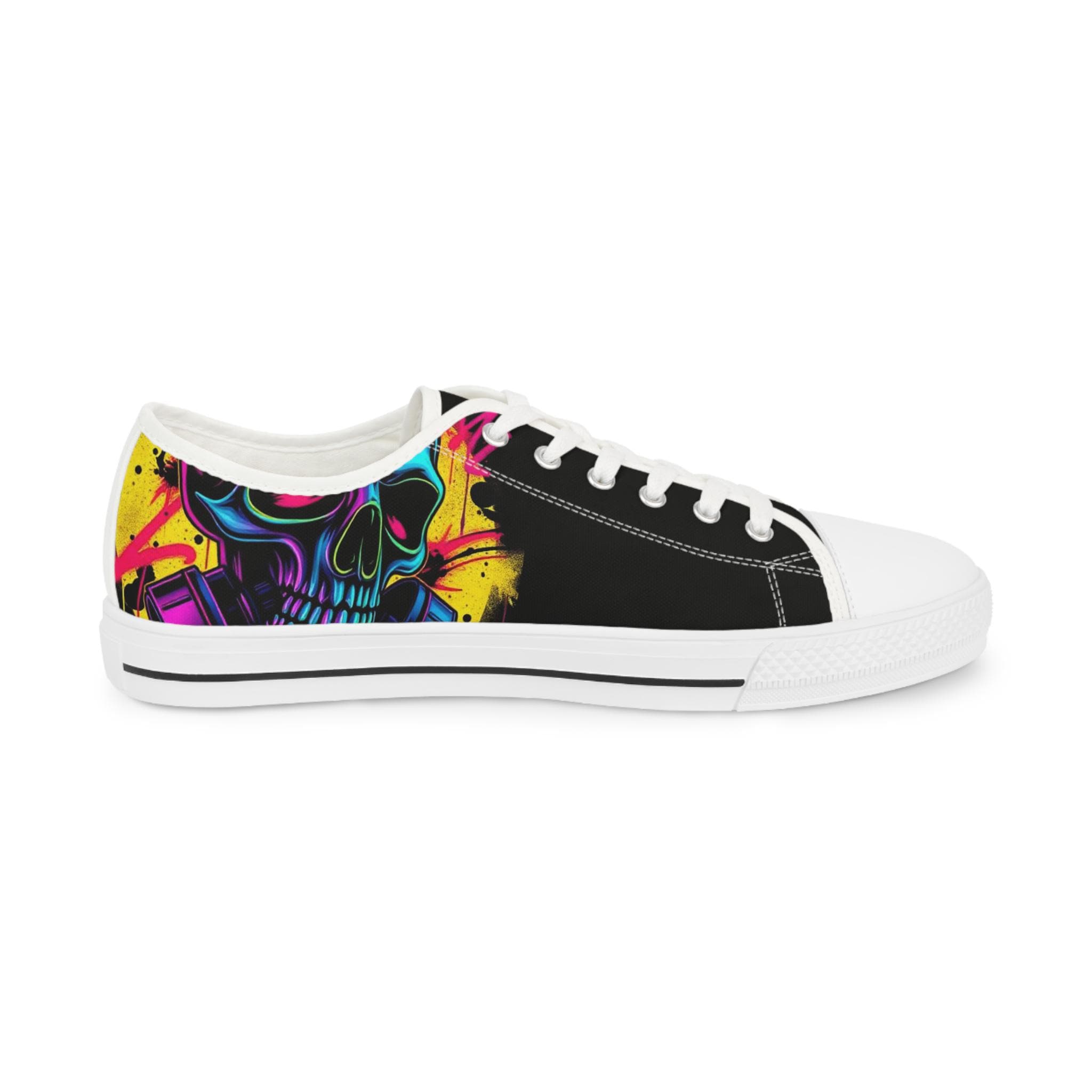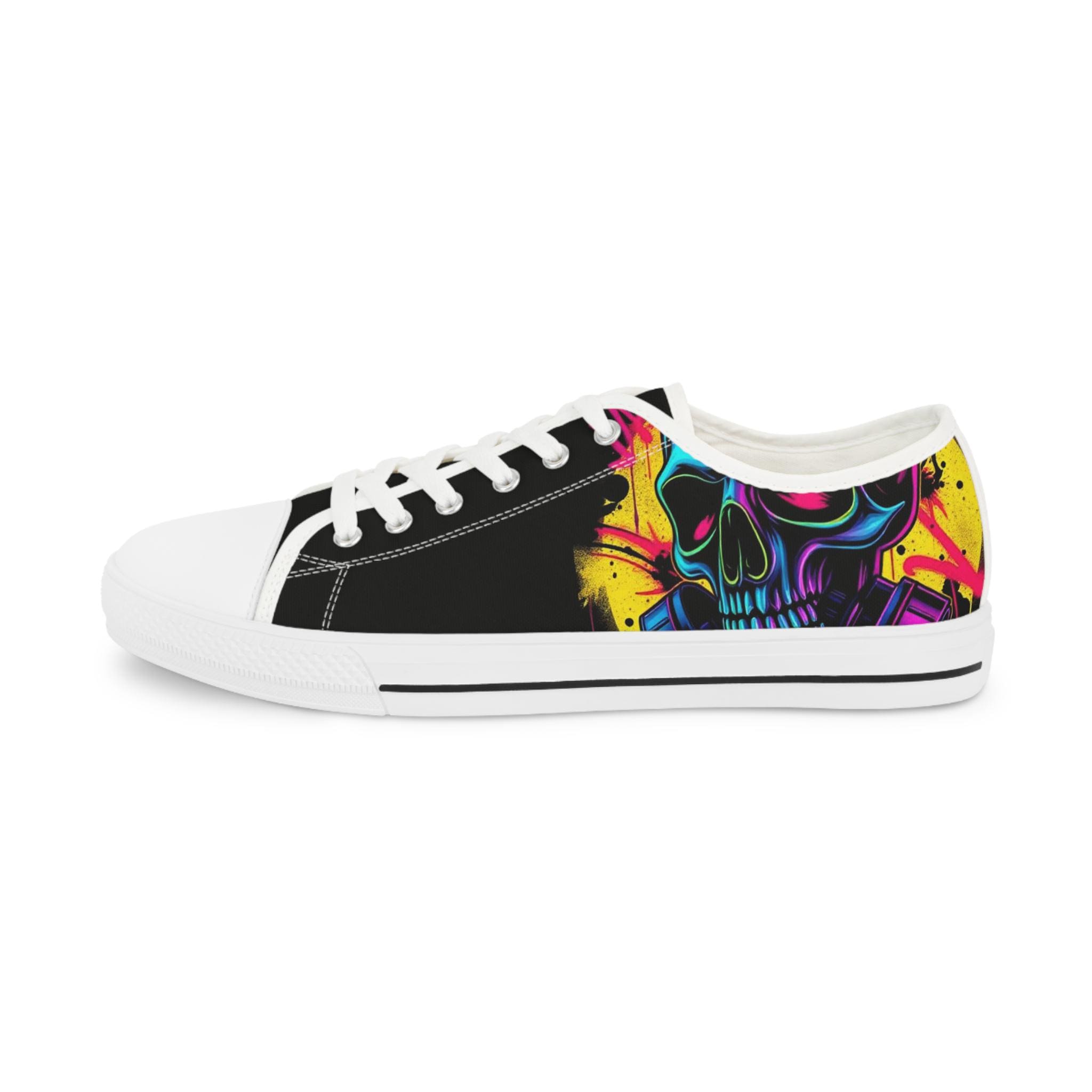 Low-top canvas sneakers with a bold, painterly skull motif that pops against classic black panels. Lightweight EVA soles and memory-foam insoles keep steps springy and comfortable all day. The wraparound print flows across both sides and the tongue, so every angle shows off bright, neon-like splashes of color. Metal eyelets, pleather toe caps, and rubber outsoles add durable details that handle daily wear. These shoes run slightly large — size down for a snugger fit. Wear them to showcase a rebellious, art-forward look whether you're wandering city streets, heading to a gig, or meeting friends for coffee.