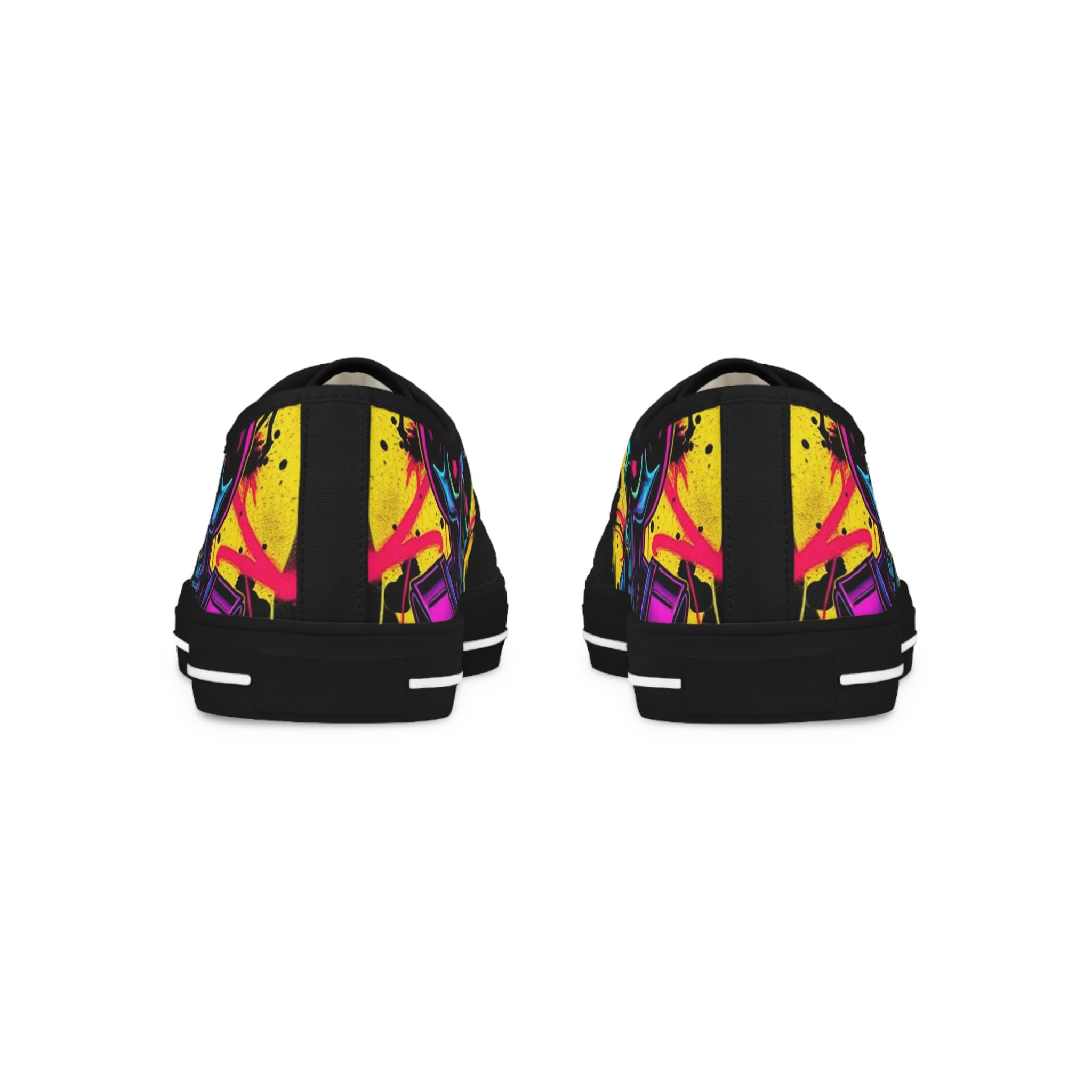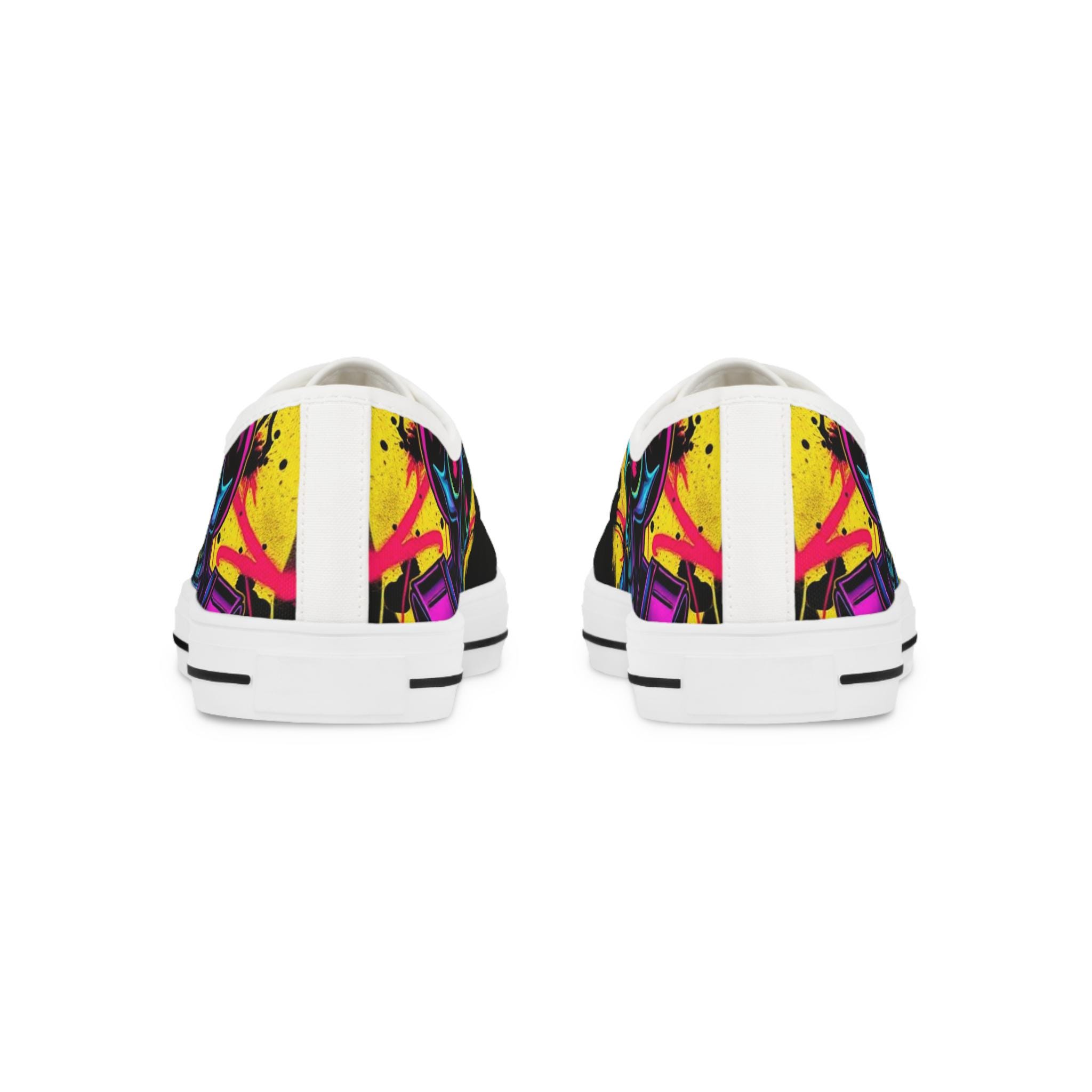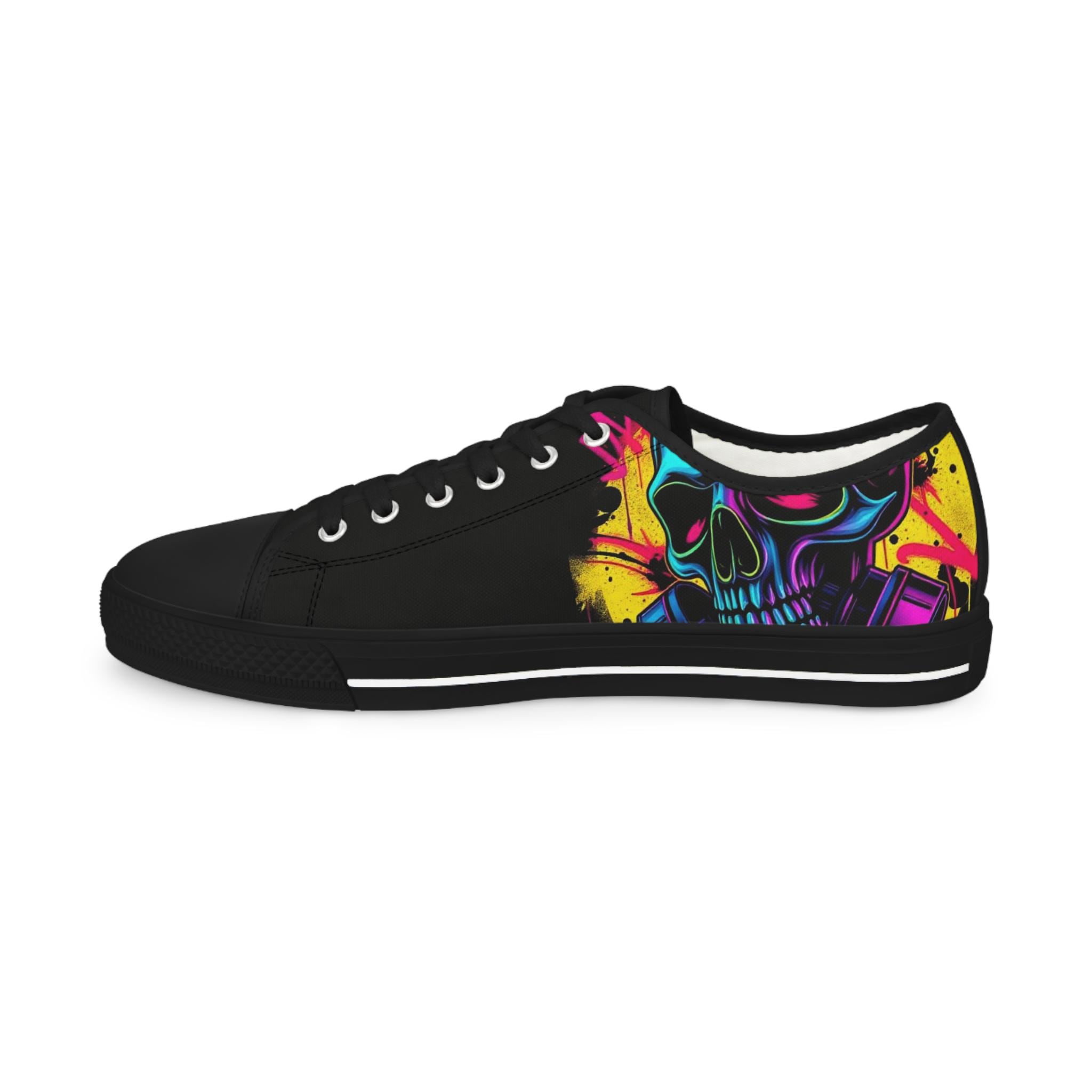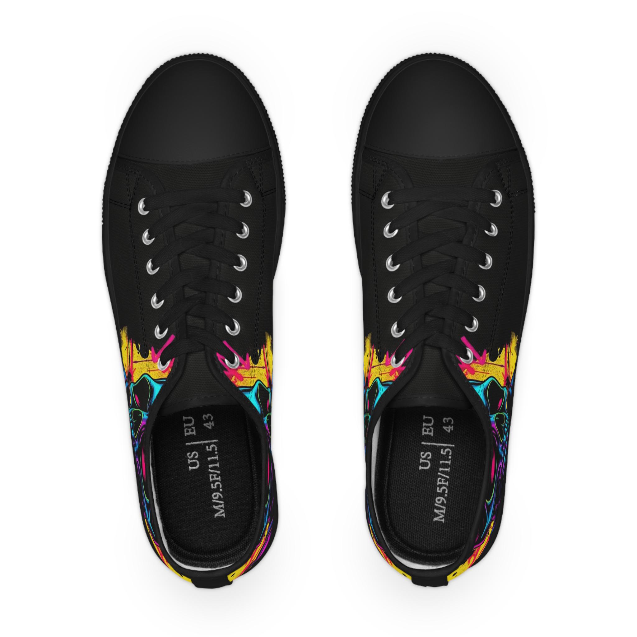 Low-top canvas sneakers with a bold, painterly skull motif that pops against classic black panels. Lightweight EVA soles and memory-foam insoles keep steps springy and comfortable all day. The wraparound print flows across both sides and the tongue, so every angle shows off bright, neon-like splashes of color. Metal eyelets, pleather toe caps, and rubber outsoles add durable details that handle daily wear. These shoes run slightly large — size down for a snugger fit. Wear them to showcase a rebellious, art-forward look whether you're wandering city streets, heading to a gig, or meeting friends for coffee.