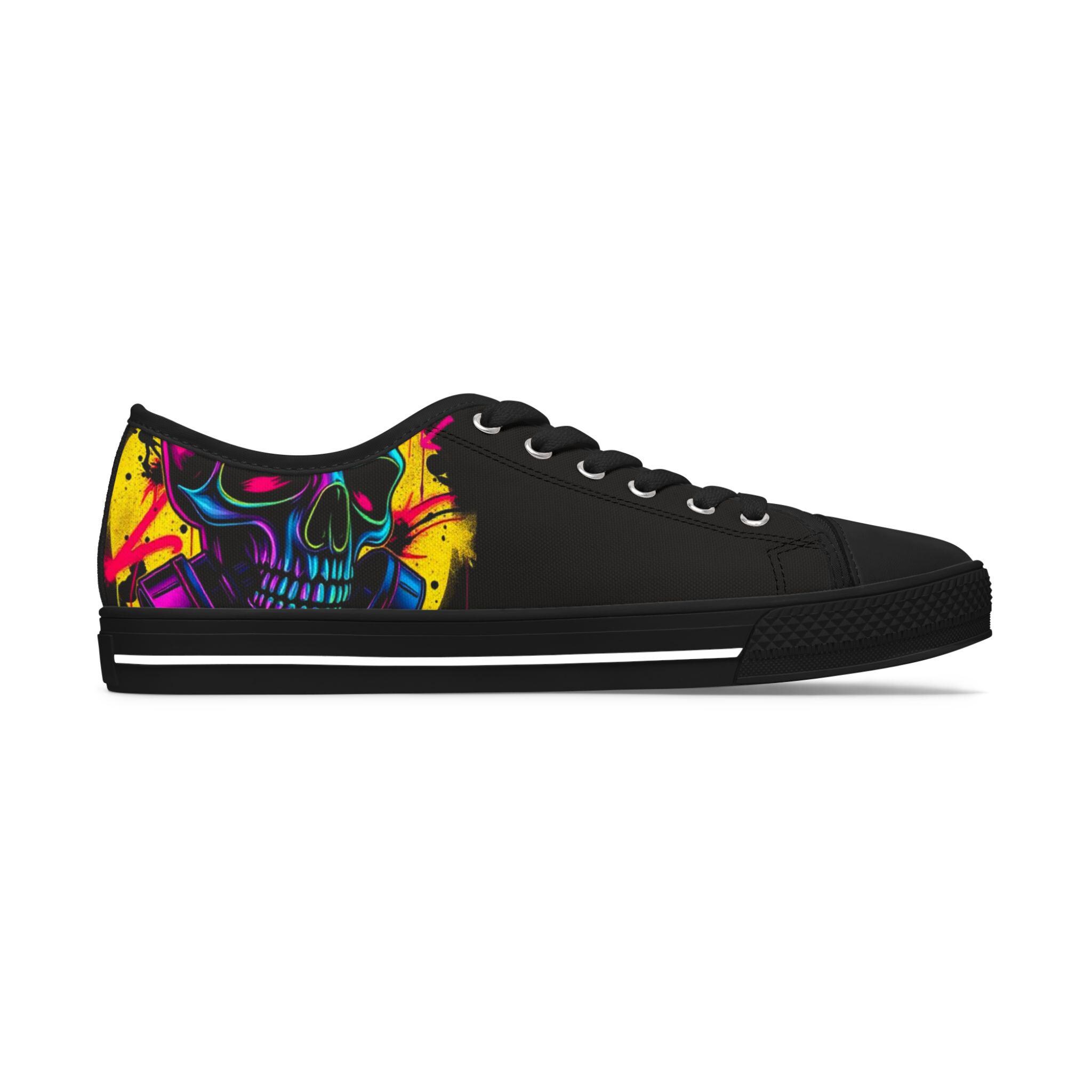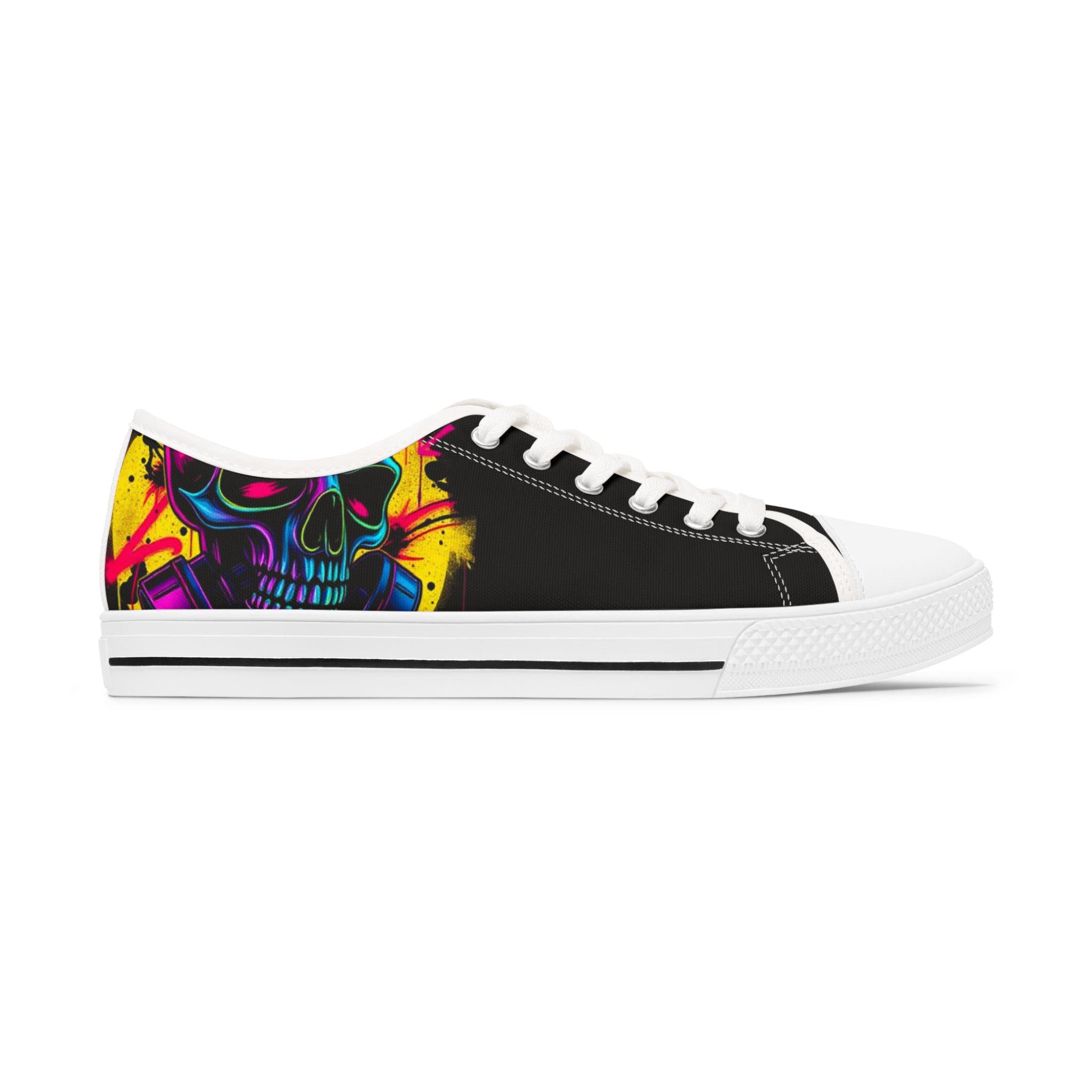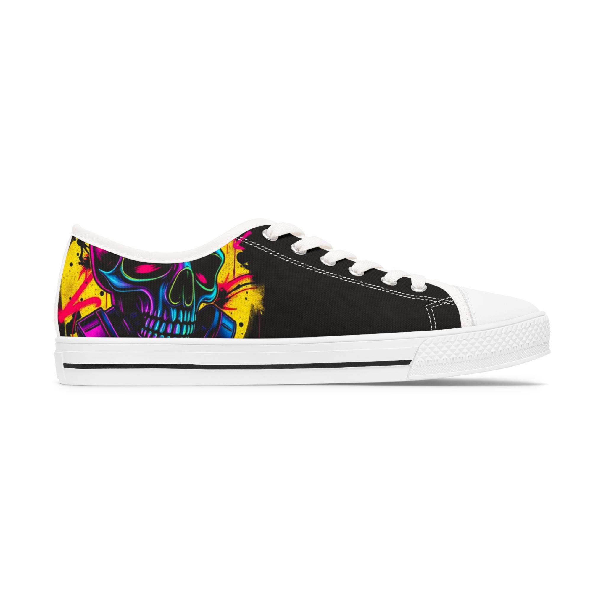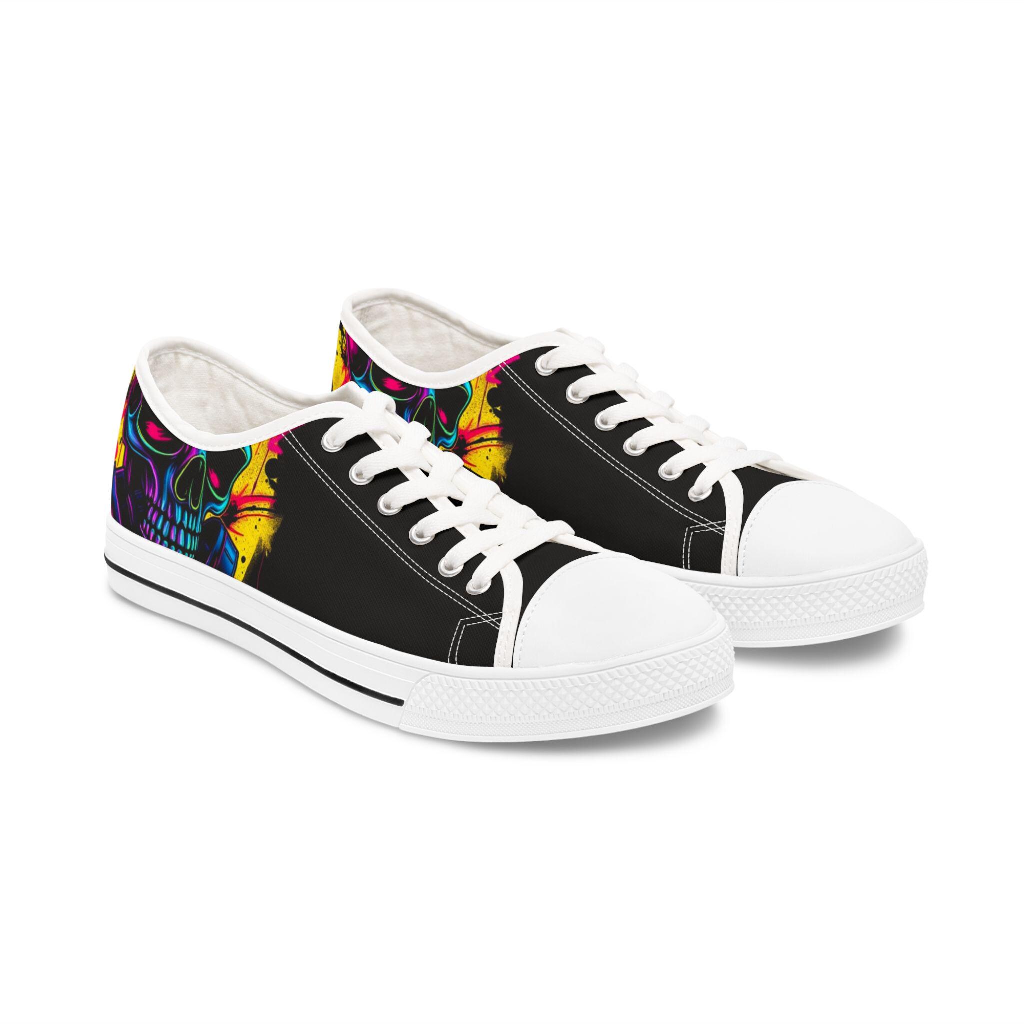 These low-top canvas sneakers bring bold, neon skull art to everyday steps. The full wraparound print lets the vibrant design peek from the outer panels and heel while classic white toe caps and laces keep the look grounded. Lightweight EVA soles and memory-foam insoles give early-morning commutes and late-night walks a springy, shock-absorbing feel. Metal eyelets and PU-leather reinforced toes add durability where you need it most. Wear them with cropped jeans, a band tee, or a leather jacket to push a streetwise, art-forward vibe that stands out without shouting.