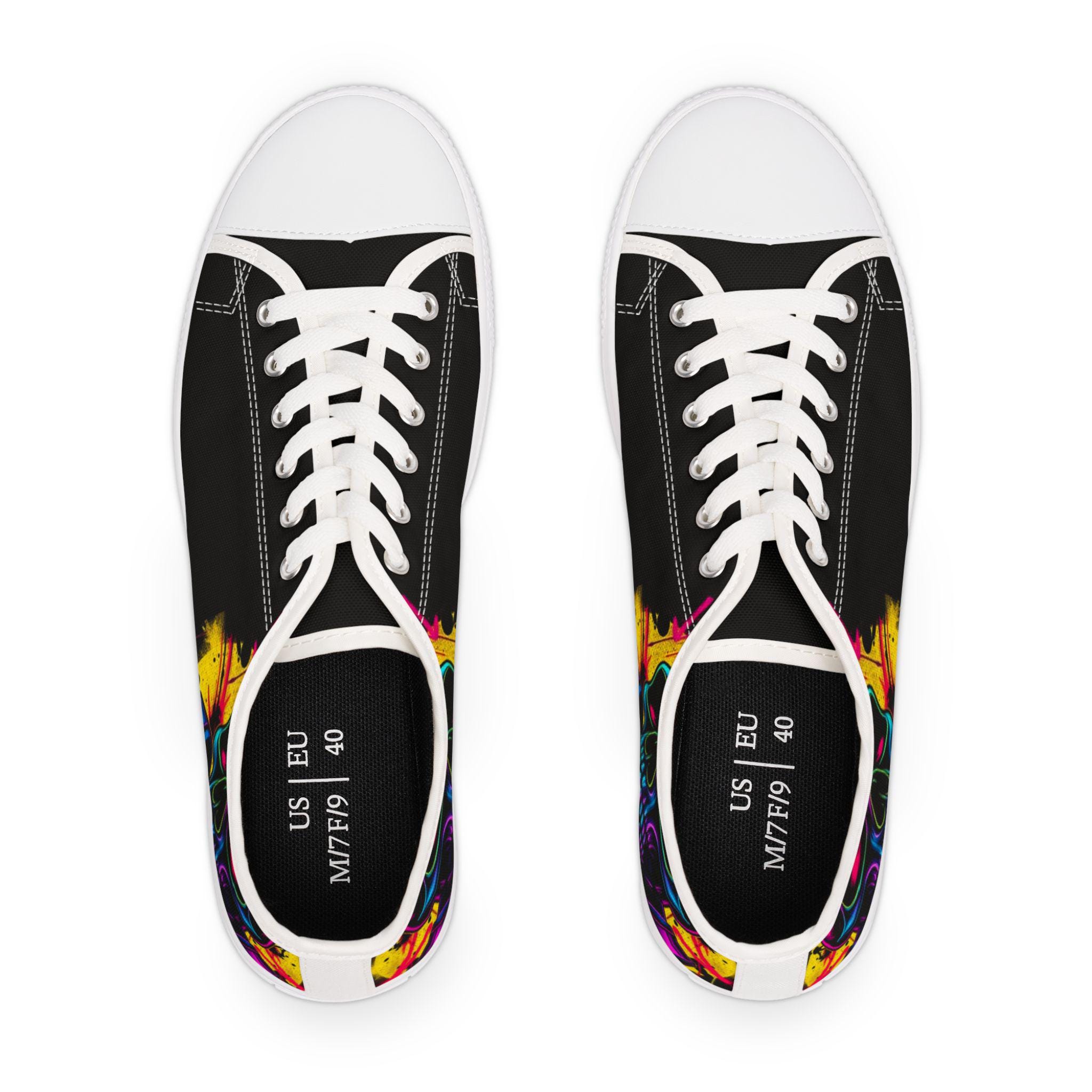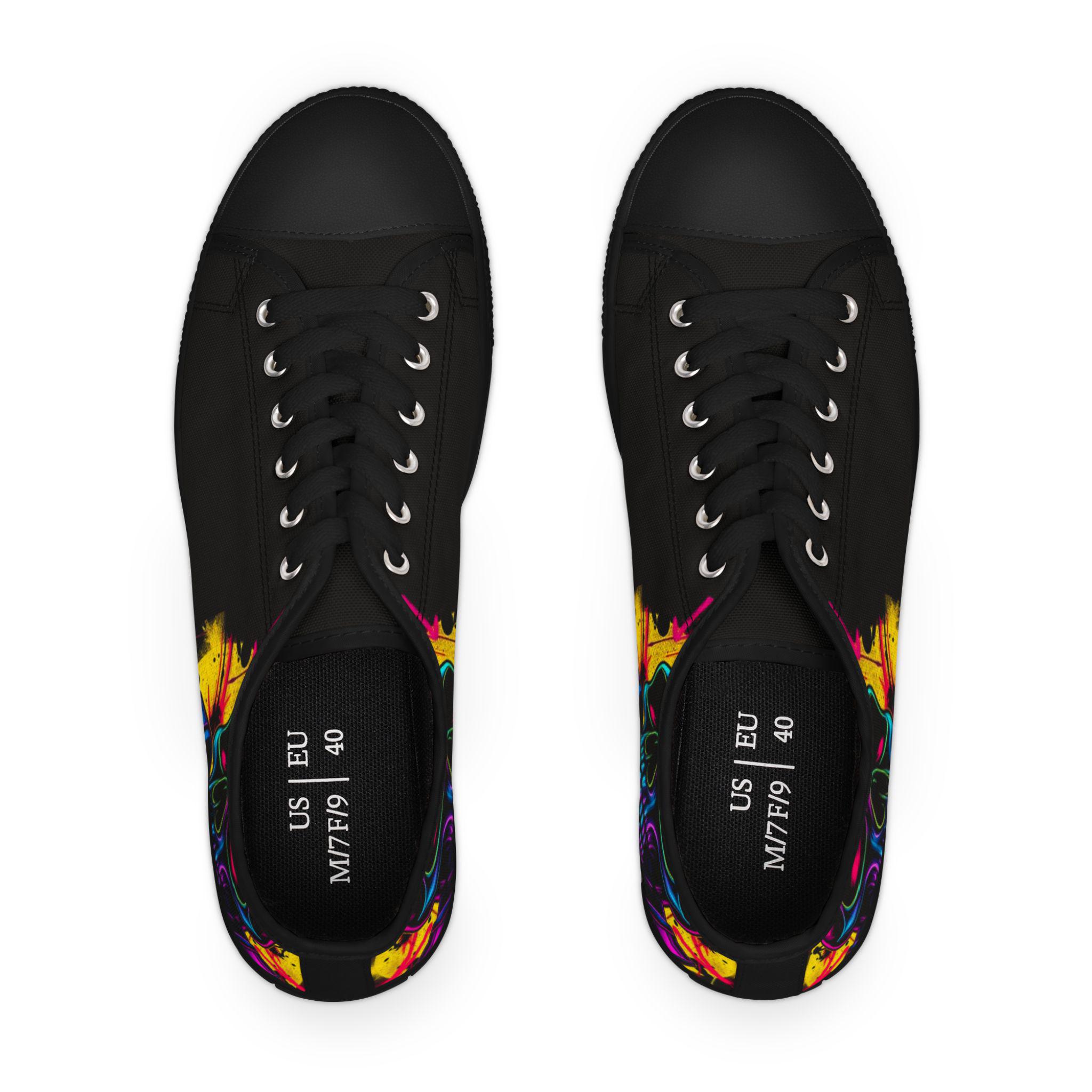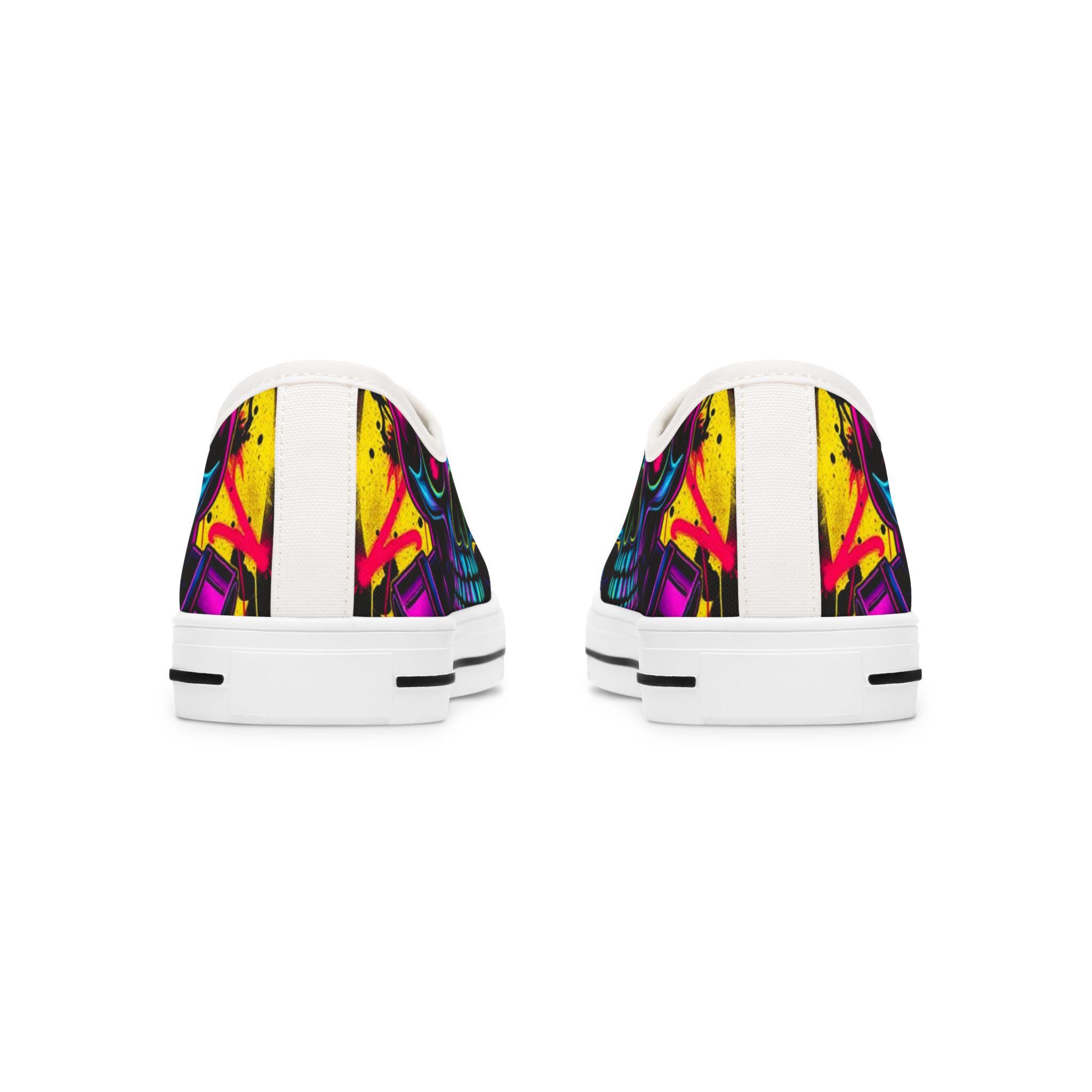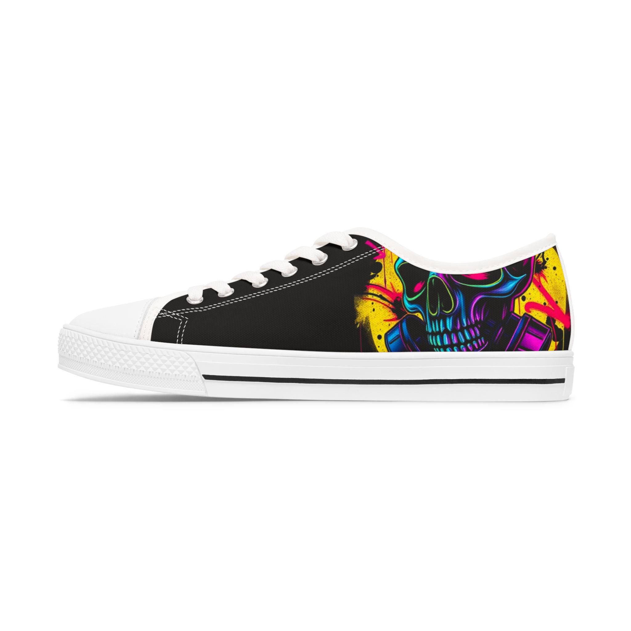 These low-top canvas sneakers bring bold, neon skull art to everyday steps. The full wraparound print lets the vibrant design peek from the outer panels and heel while classic white toe caps and laces keep the look grounded. Lightweight EVA soles and memory-foam insoles give early-morning commutes and late-night walks a springy, shock-absorbing feel. Metal eyelets and PU-leather reinforced toes add durability where you need it most. Wear them with cropped jeans, a band tee, or a leather jacket to push a streetwise, art-forward vibe that stands out without shouting.