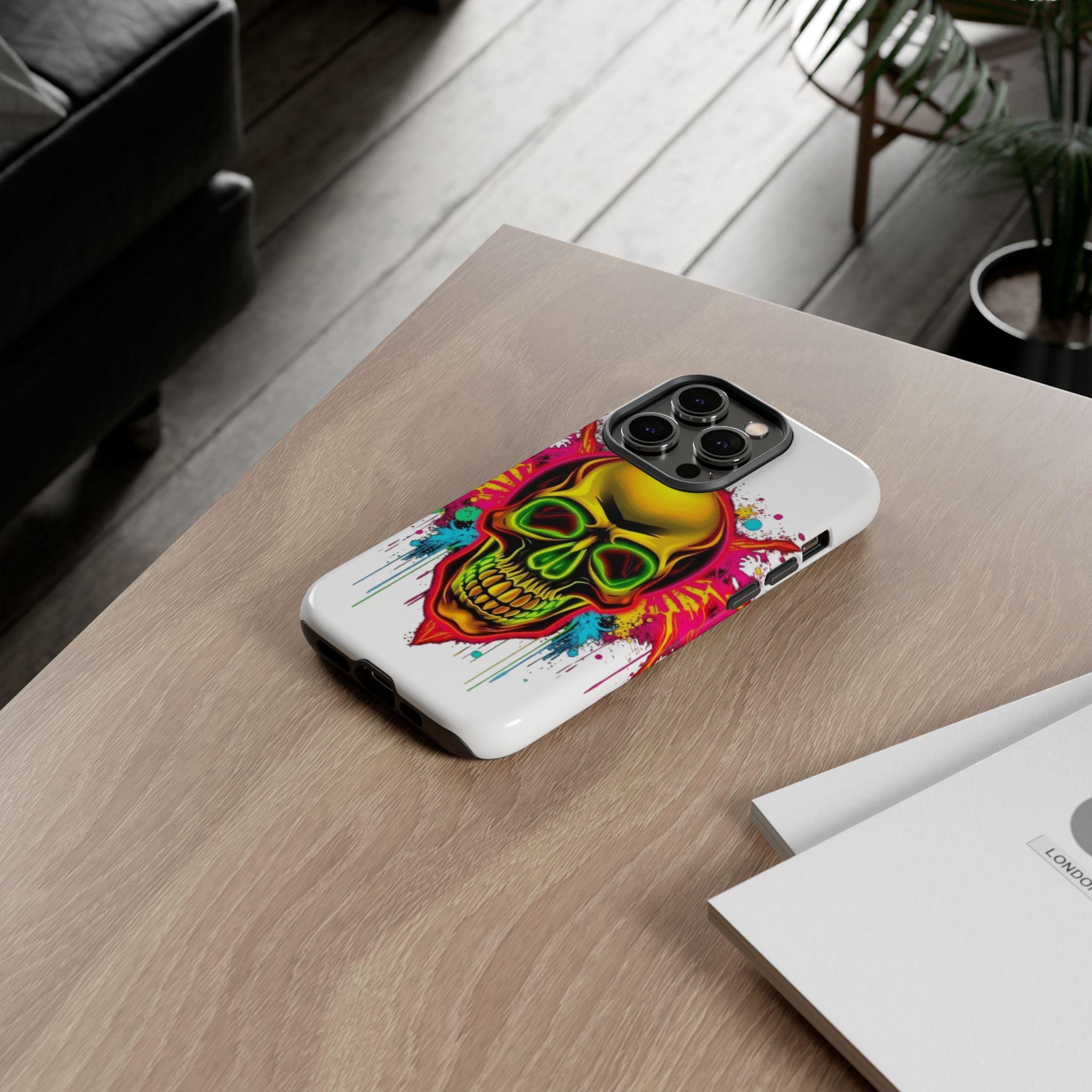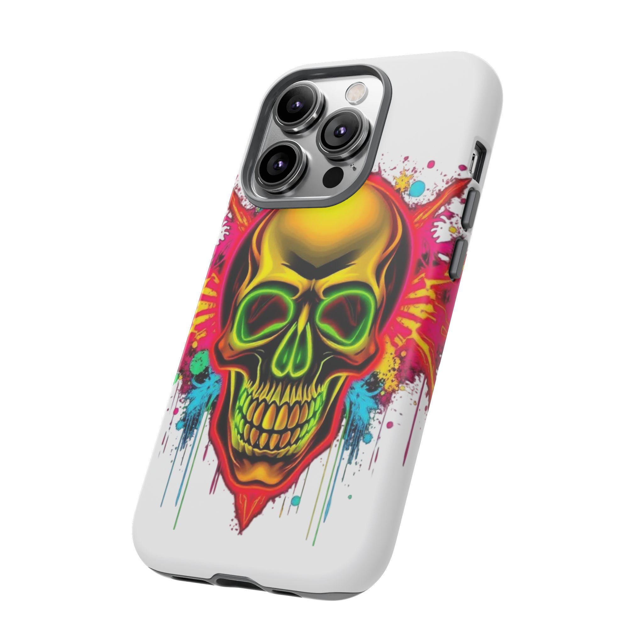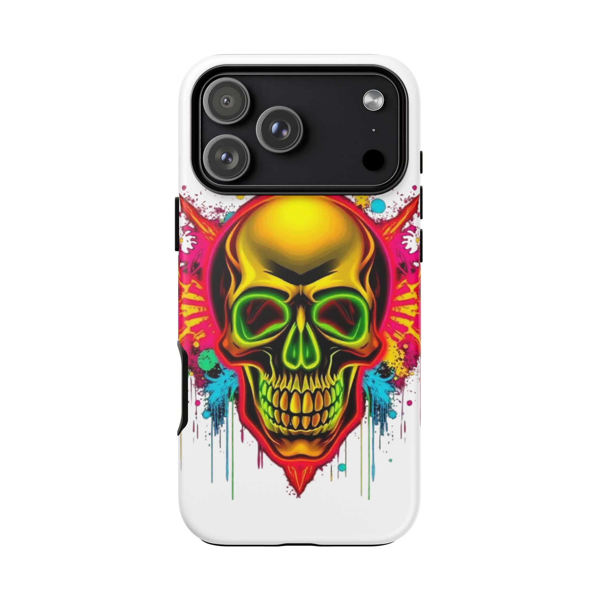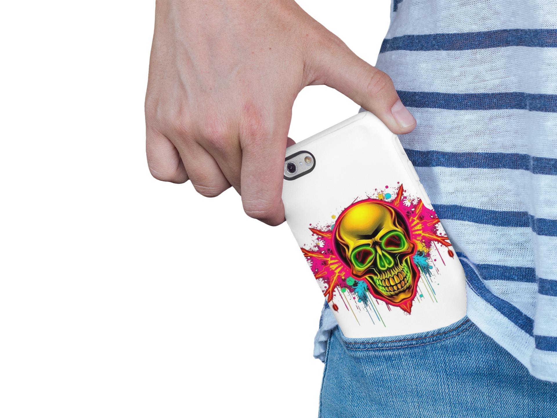 A bold, protective phone case that turns your device into a statement. Vivid neon skull artwork splashes across a high-density 3D wrap, the colors retaining their intensity thanks to UV-resistant printing. The case’s dual-layer construction — a rigid polycarbonate shell and a TPU silicone liner — absorbs shocks and shields edges from drops while keeping ports open and wireless charging accessible. Lightweight and durable, it carries a certified compliance pedigree and arrives in a glossy or matte finish that keeps the design striking through daily wear. Handle with care around strong alcohols, creams, and prolonged heat or sunlight to maintain long-term appearance.