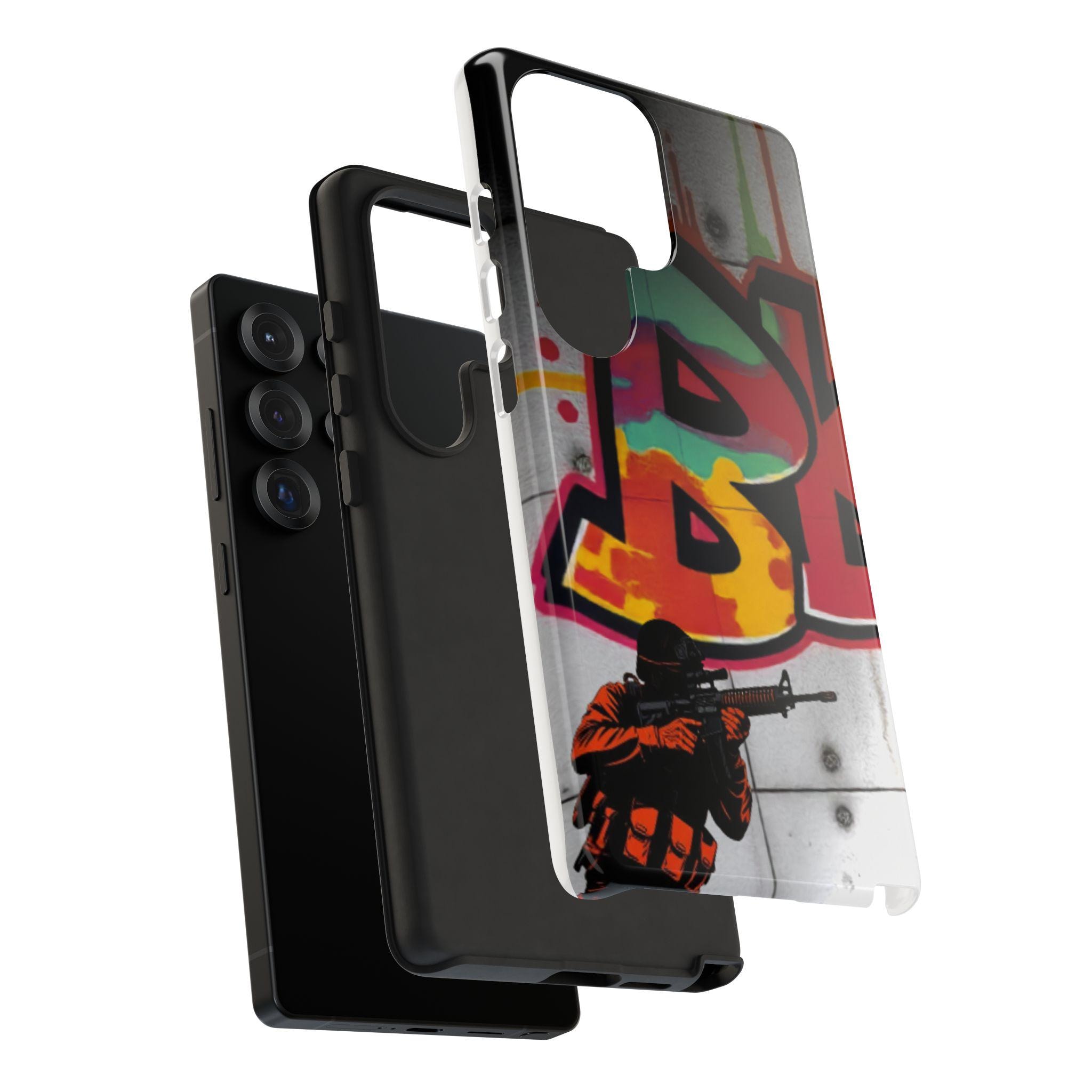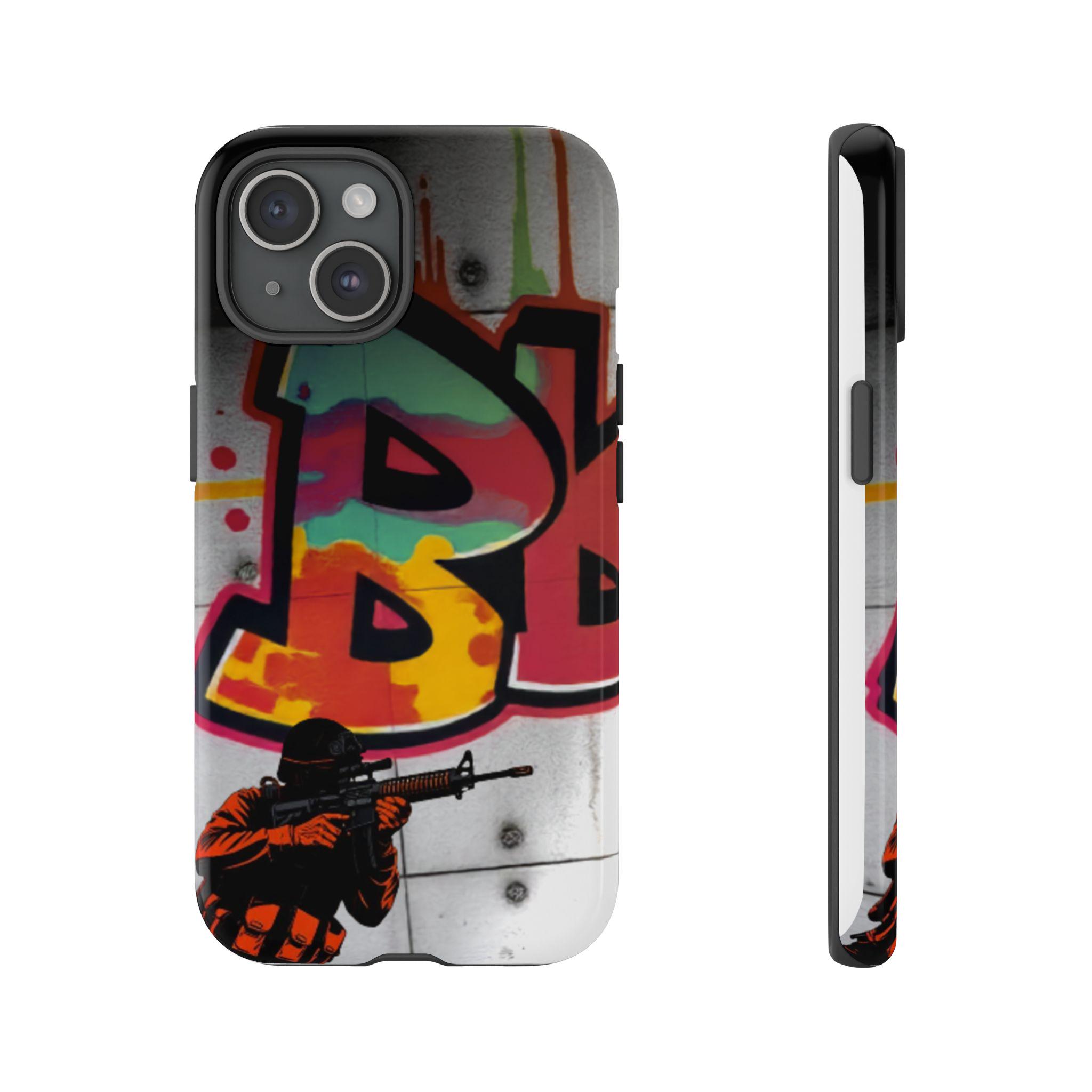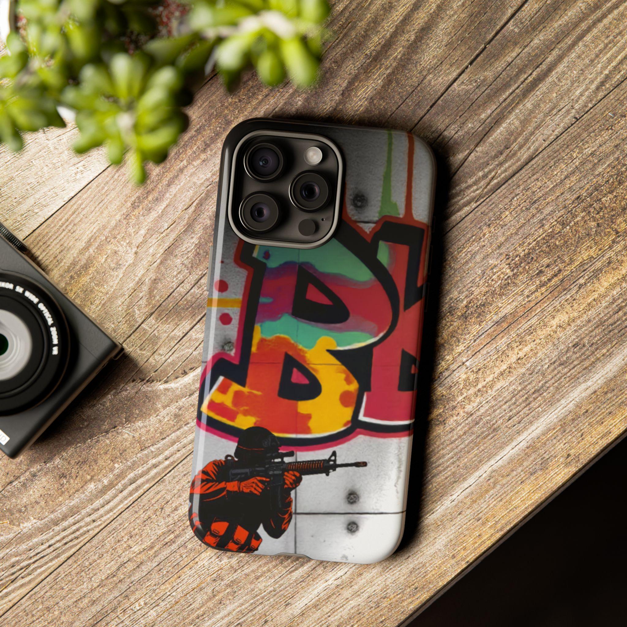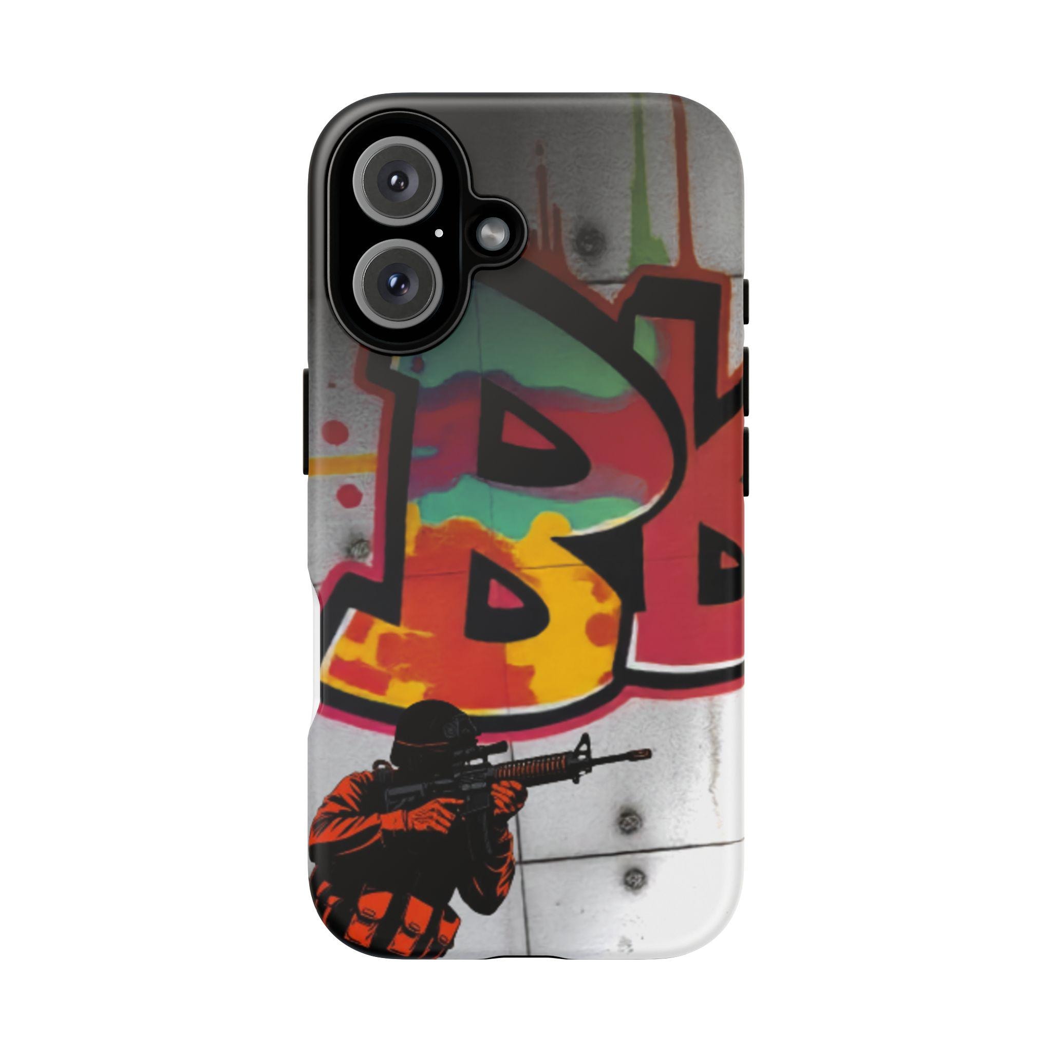 This Tough Case brings street energy and solid protection together. The wraparound print shows bold graffiti colors and a small tactical figure, giving the case a gritty, urban attitude. Dual-layer construction — a rigid polycarbonate shell with a shock-absorbing TPU silicone liner — cushions drops while keeping ports clear and wireless charging accessible. The high-density 3D wrap and UV protection preserve the artwork outdoors, and glossy or matte finishes let you choose the exact look. Lightweight and engineered for everyday impact, this case feels at home on city commutes, skate sessions, or tucked into a backpack for late-night shoots.