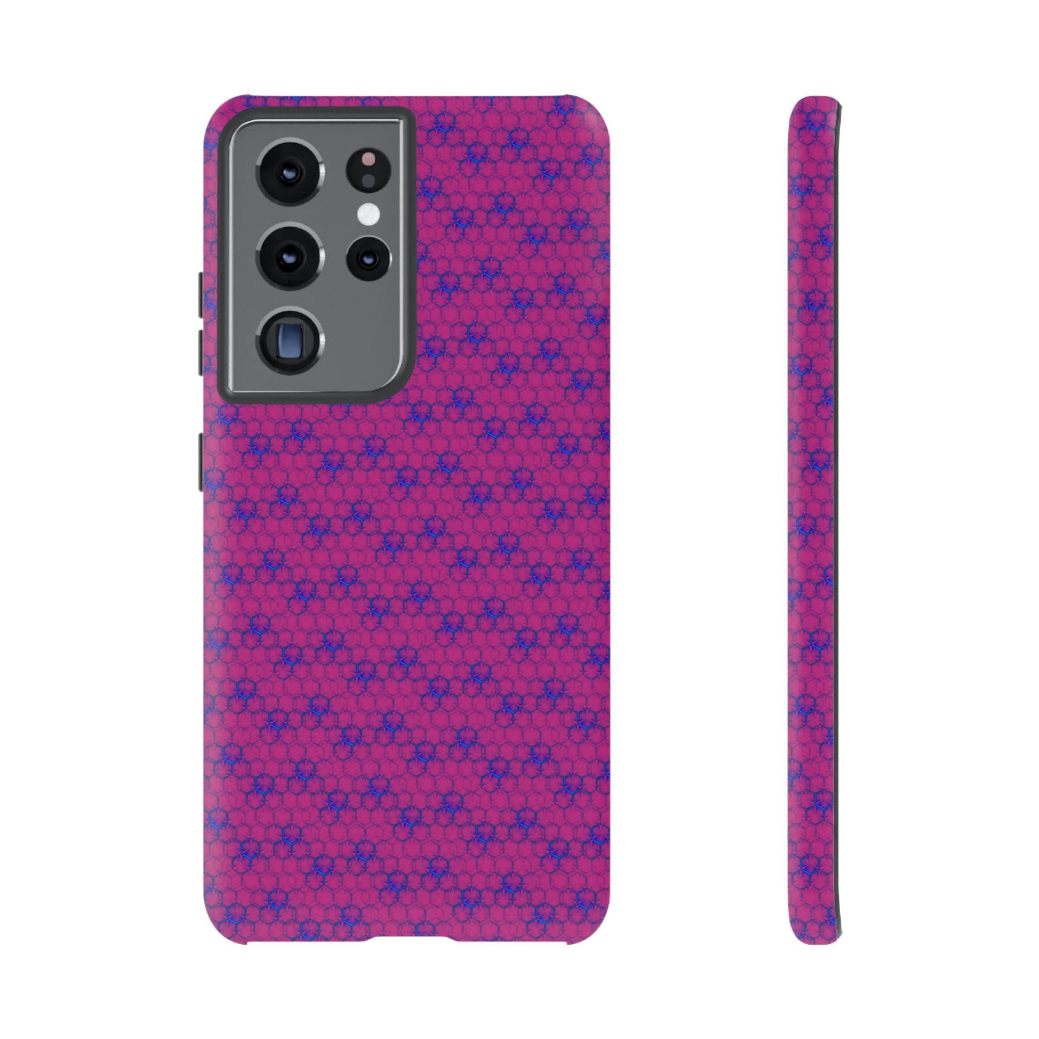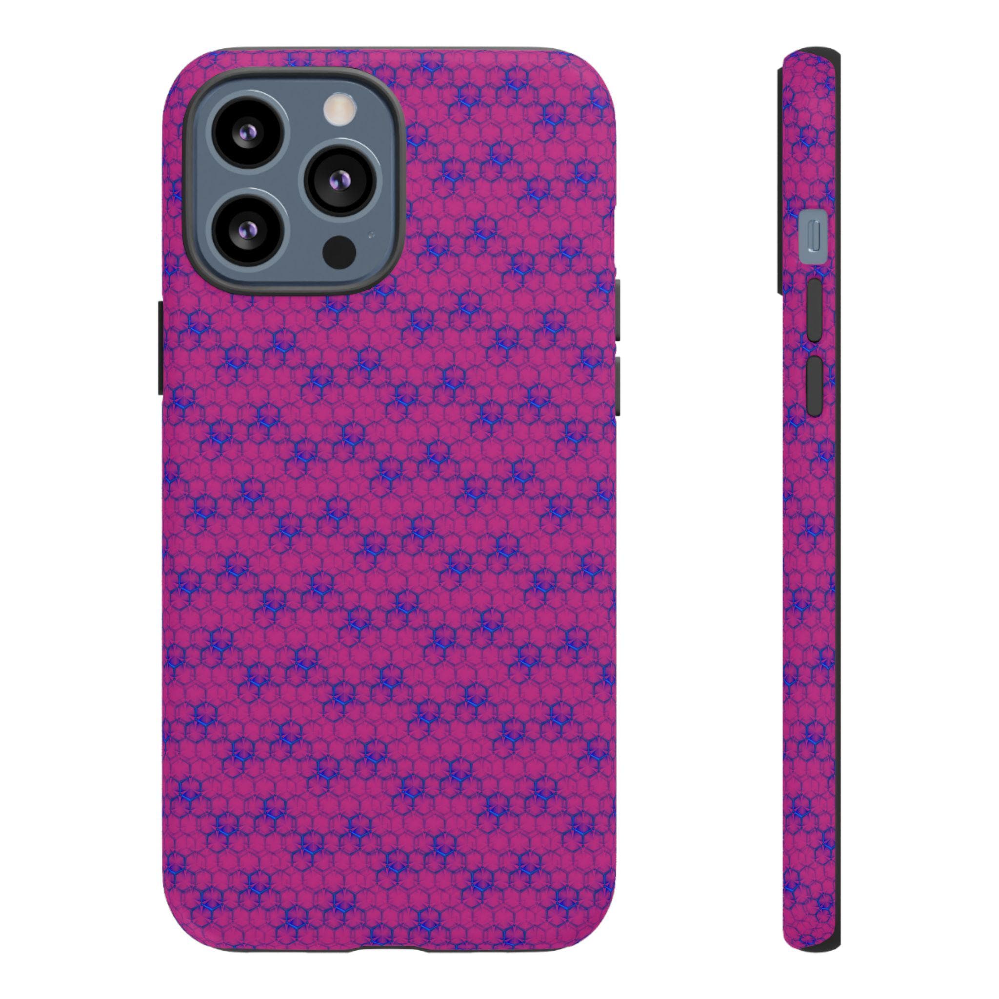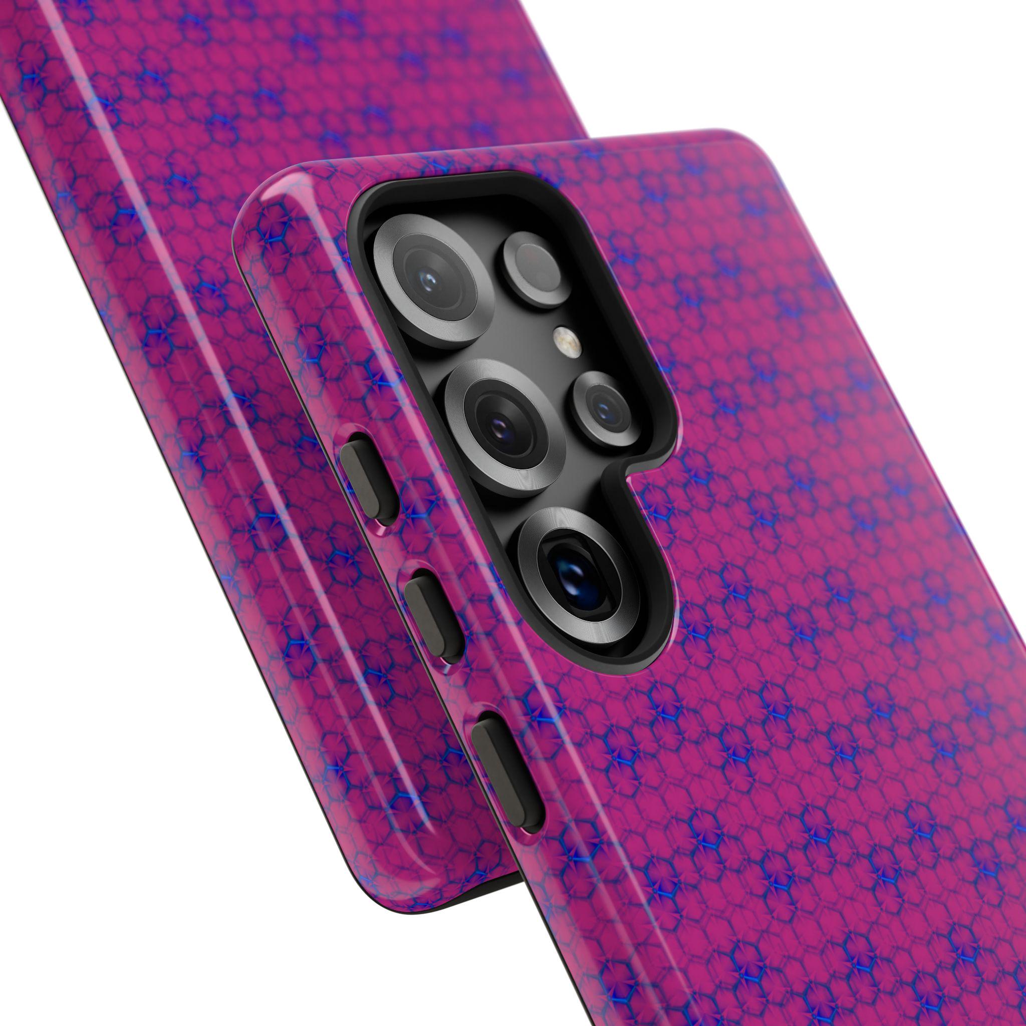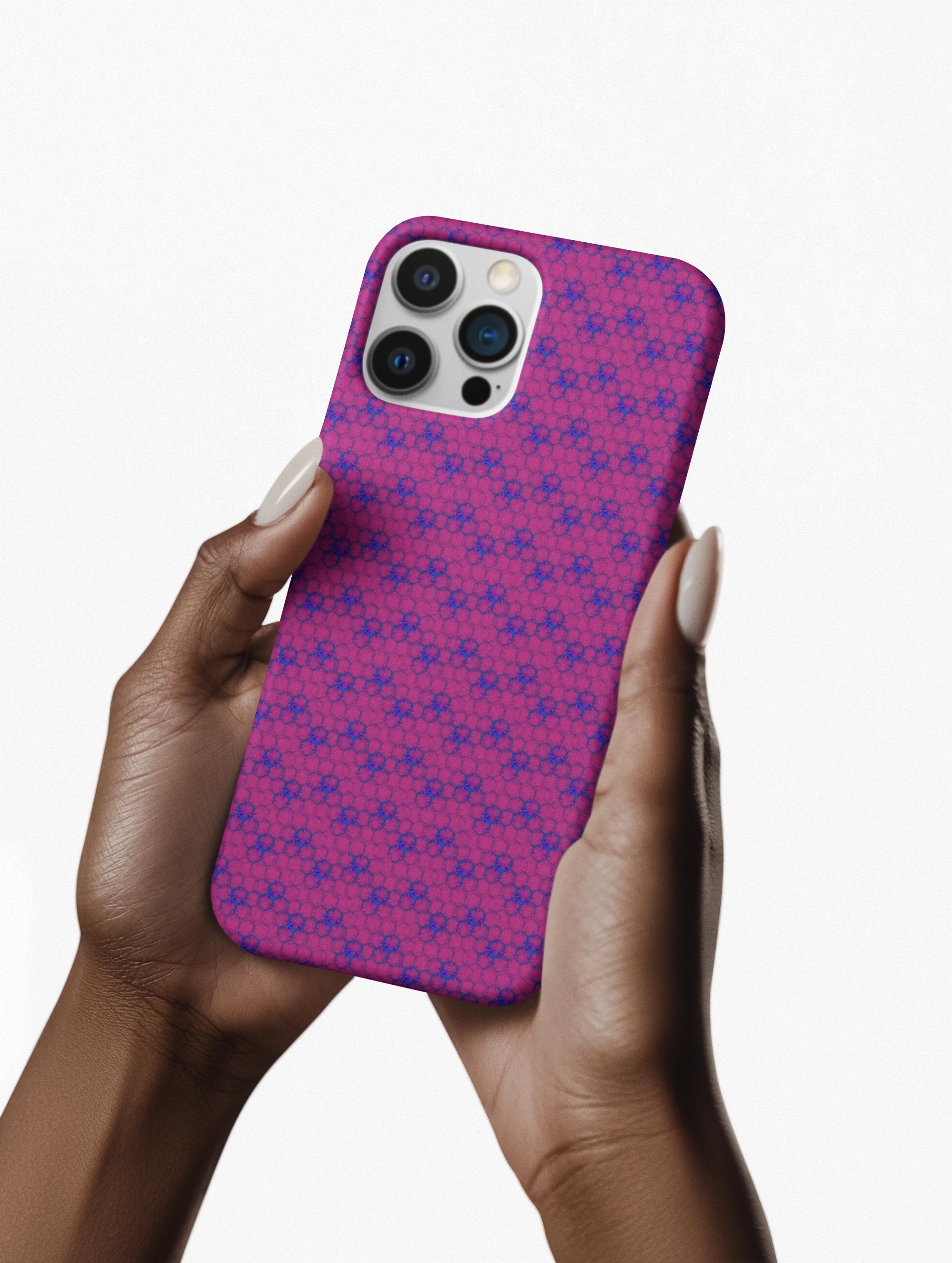 A slim, tough phone case that brings bold color and dependable protection to your daily carry. The vivid magenta background is layered with a small-scale geometric motif in deep blue, giving the surface a textured, hand-crafted look that reads like wearable art. It feels reassuring in the hand thanks to the dual-layer construction: a rigid polycarbonate shell outside and a soft TPU silicone liner inside that cushions against drops and daily bumps. The print wraps fully around the case for uninterrupted color and pattern. Thoughtfully engineered for active use, it resists outdoor fading and keeps ports open for easy charging — and it still supports wireless charging. This case suits someone who wants a statement pattern without sacrificing solid, certified protection.