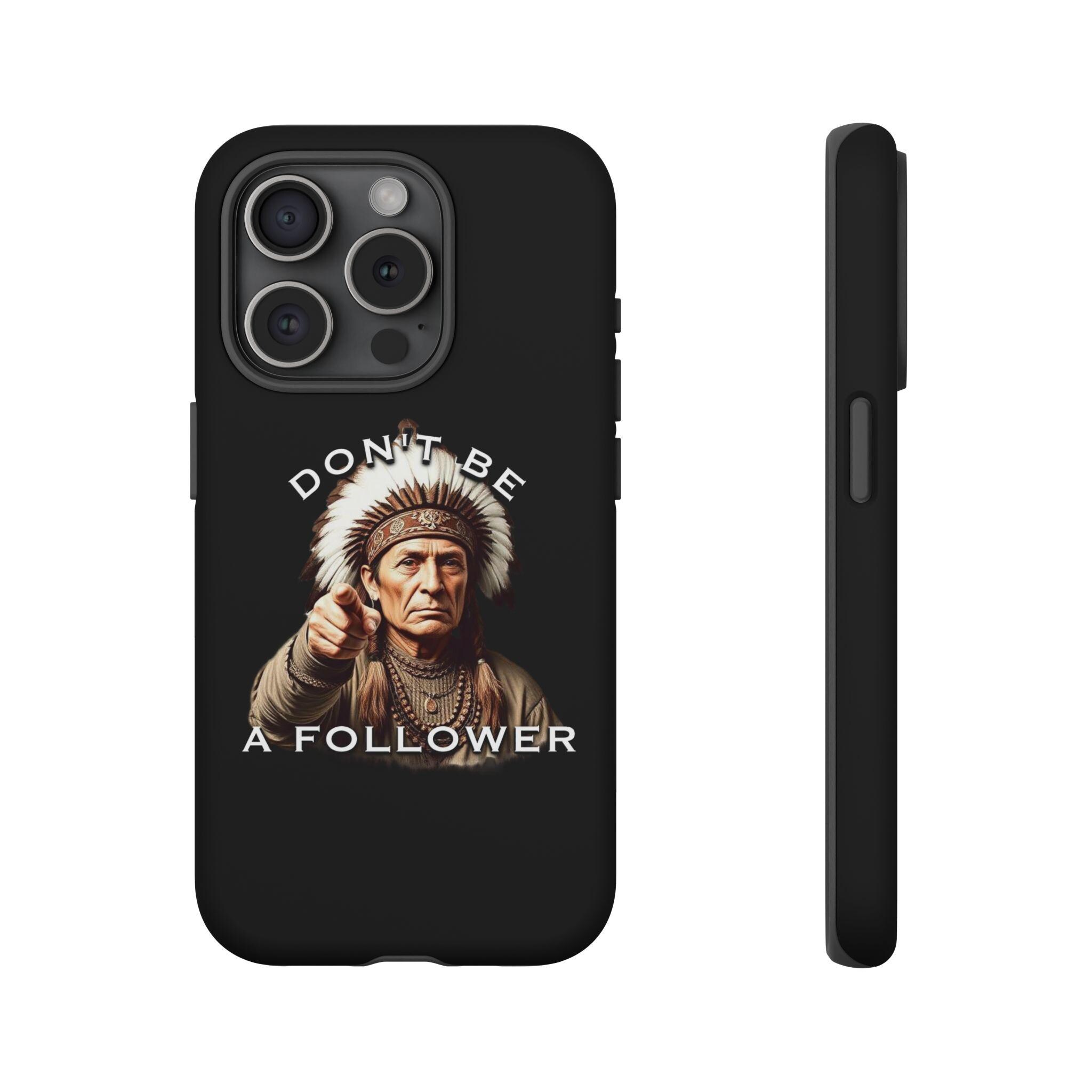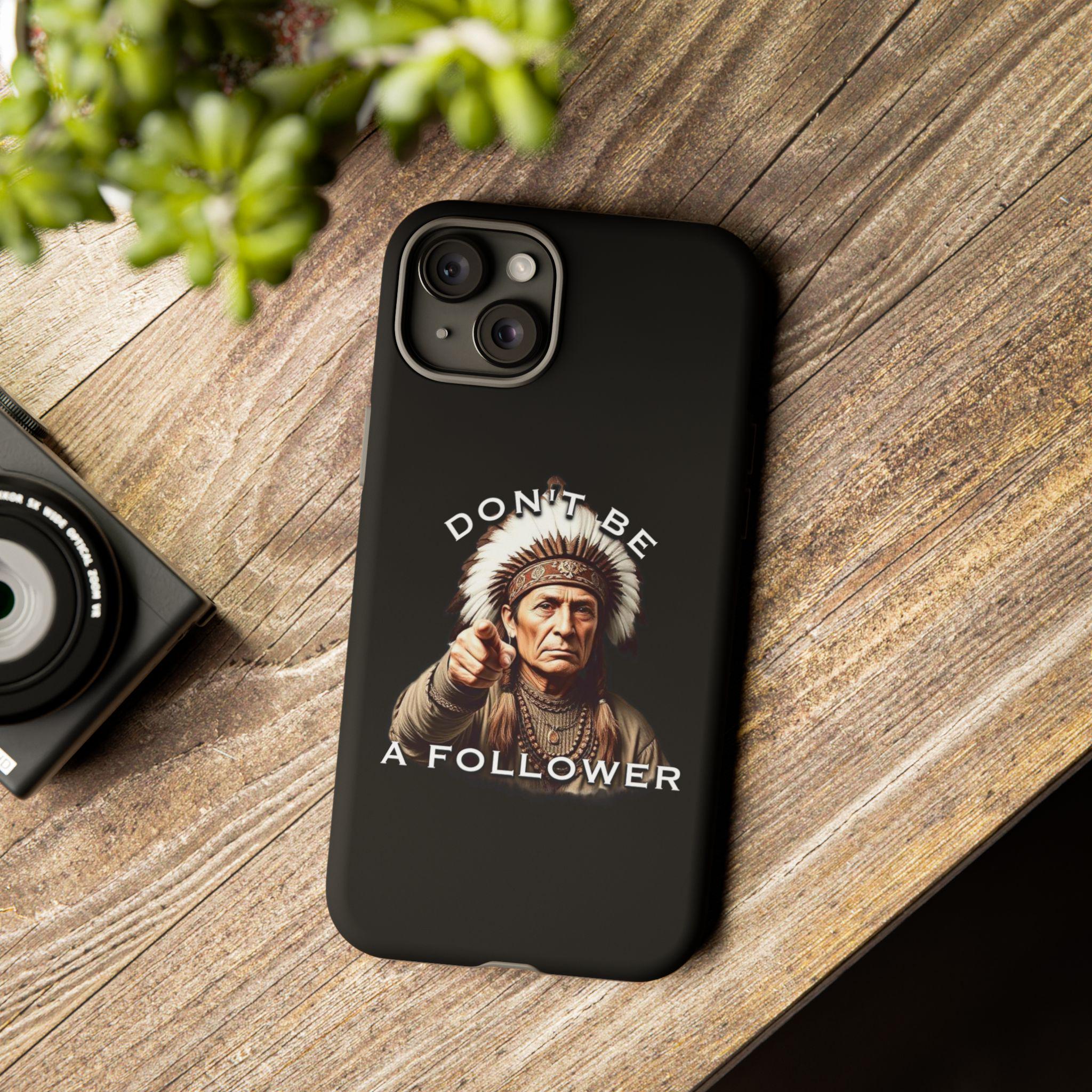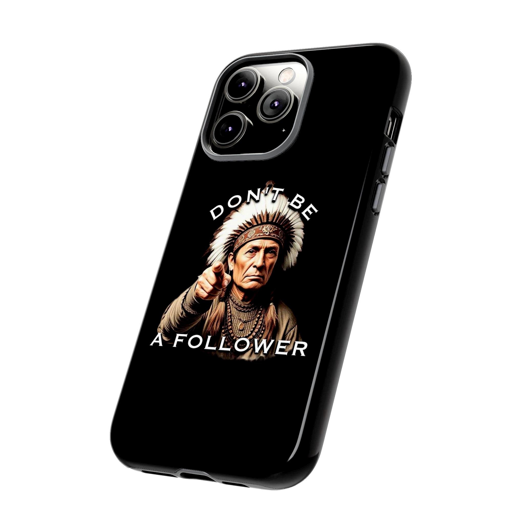 A rugged protective phone case with a bold, vintage-inspired graphic — an elder chief pointing forward beneath the phrase “DON’T BE A FOLLOWER.” The dual-layer shell (polycarbonate exterior + TPU silicone liner) absorbs shocks while keeping a slim profile. Full-coverage 3D wrap printing preserves the design’s depth and contrast, and UV protection helps maintain color outdoors. Clear port openings and wireless-charging compatibility keep daily use effortless. This case feels strong and purposeful — it’s for someone who carries conviction and wants their phone to reflect that quiet confidence.