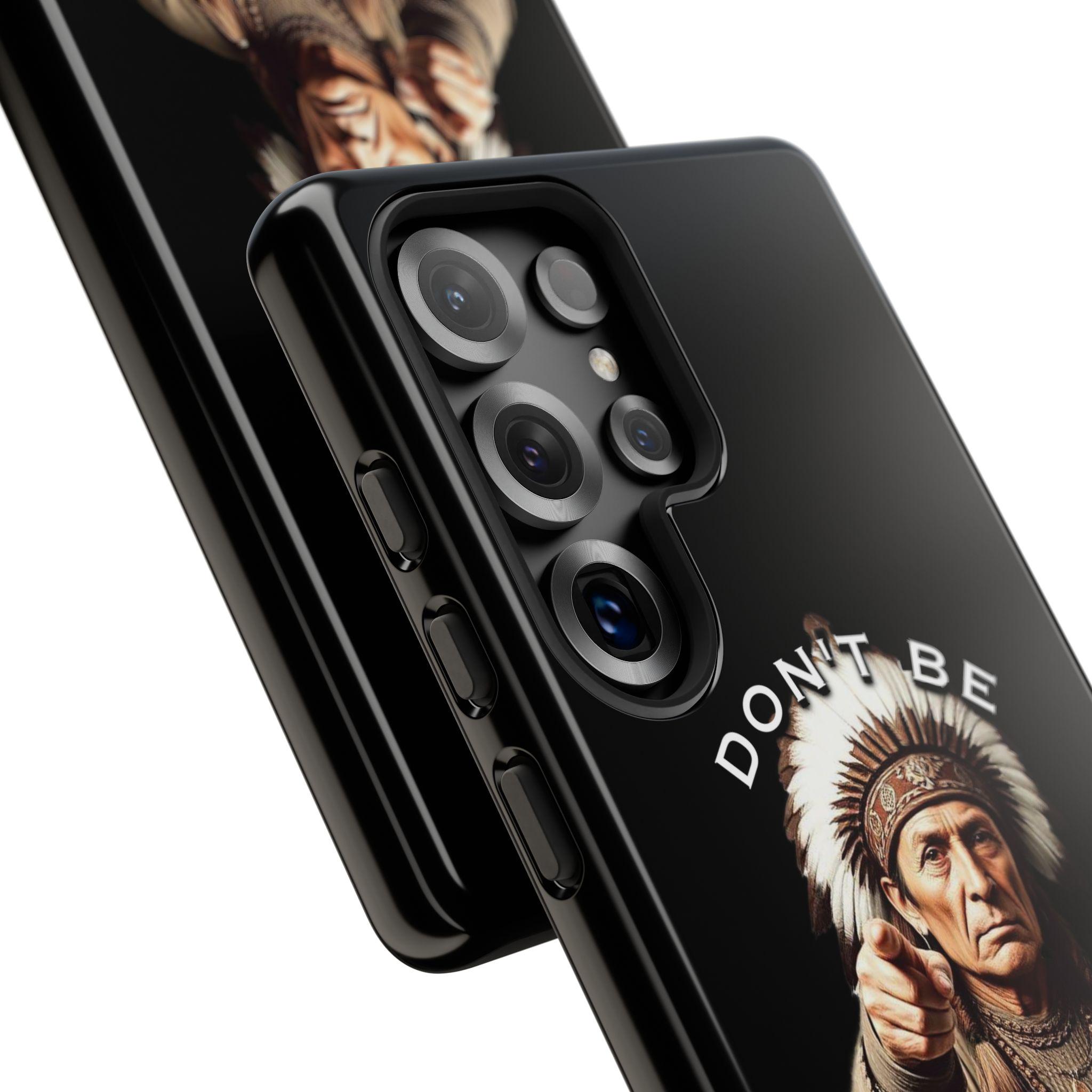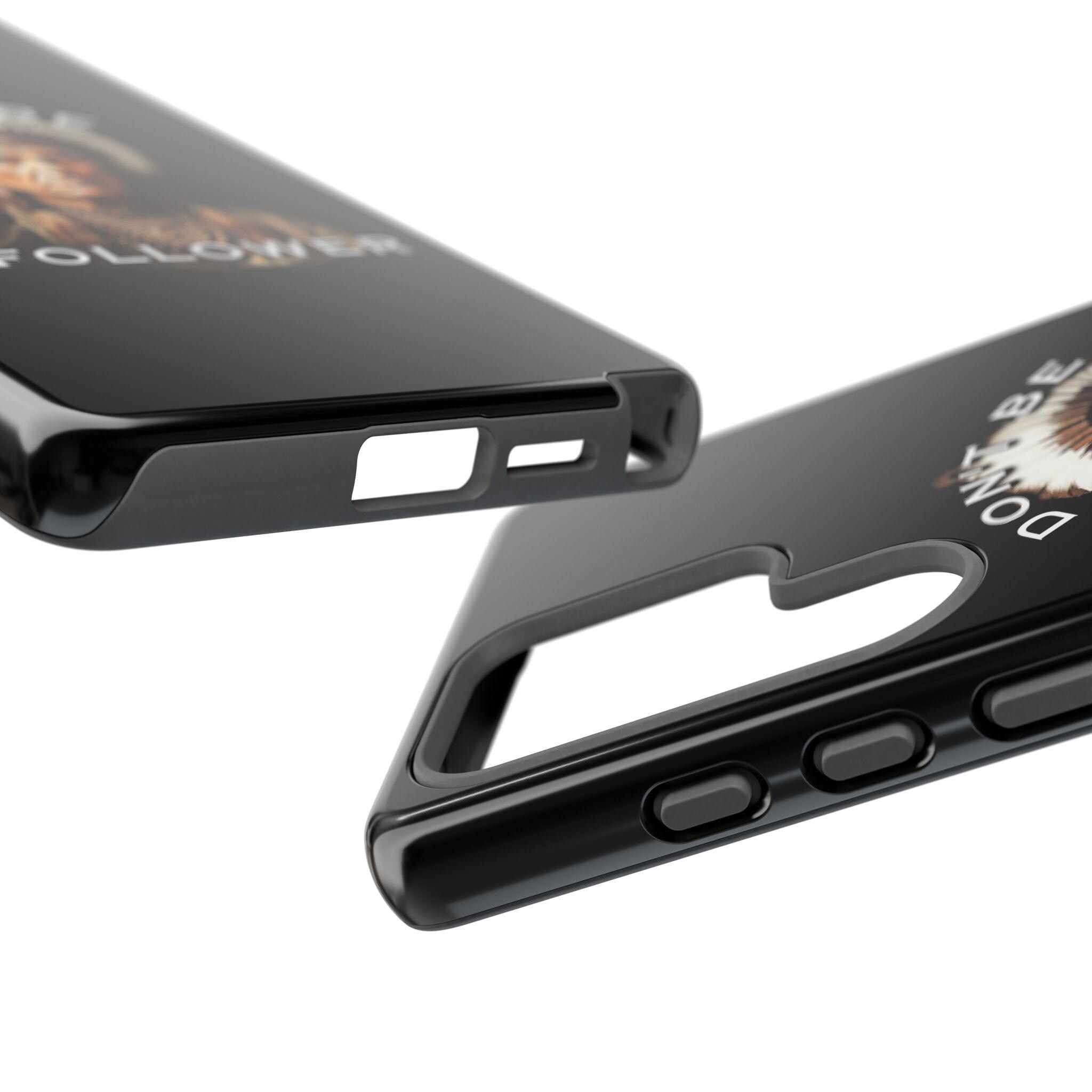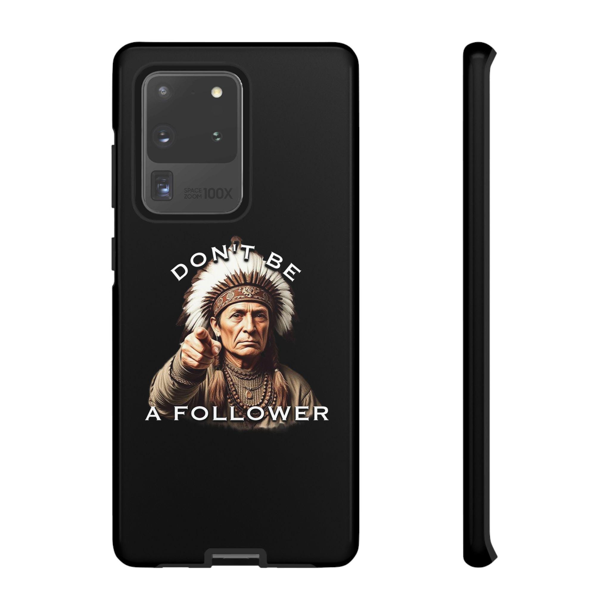 A rugged protective phone case with a bold, vintage-inspired graphic — an elder chief pointing forward beneath the phrase “DON’T BE A FOLLOWER.” The dual-layer shell (polycarbonate exterior + TPU silicone liner) absorbs shocks while keeping a slim profile. Full-coverage 3D wrap printing preserves the design’s depth and contrast, and UV protection helps maintain color outdoors. Clear port openings and wireless-charging compatibility keep daily use effortless. This case feels strong and purposeful — it’s for someone who carries conviction and wants their phone to reflect that quiet confidence.