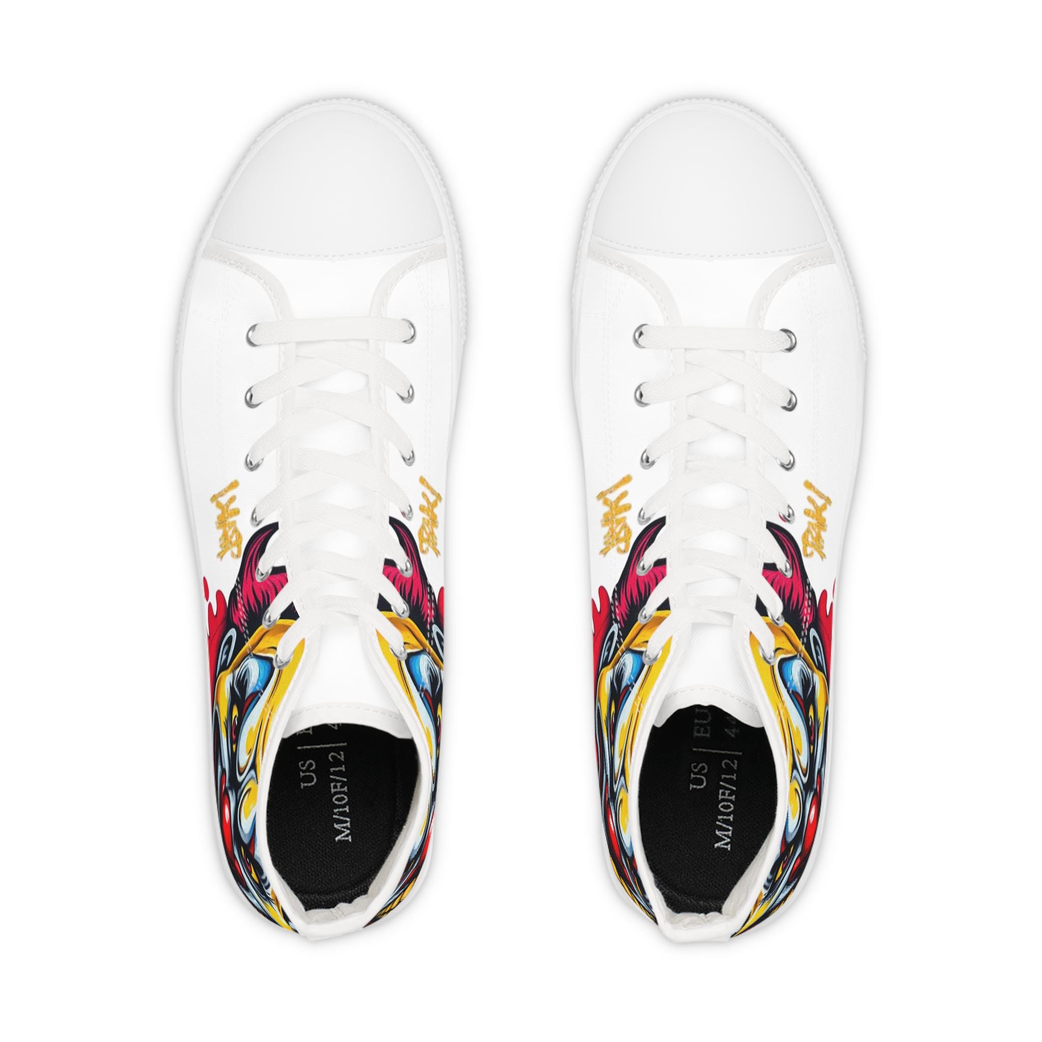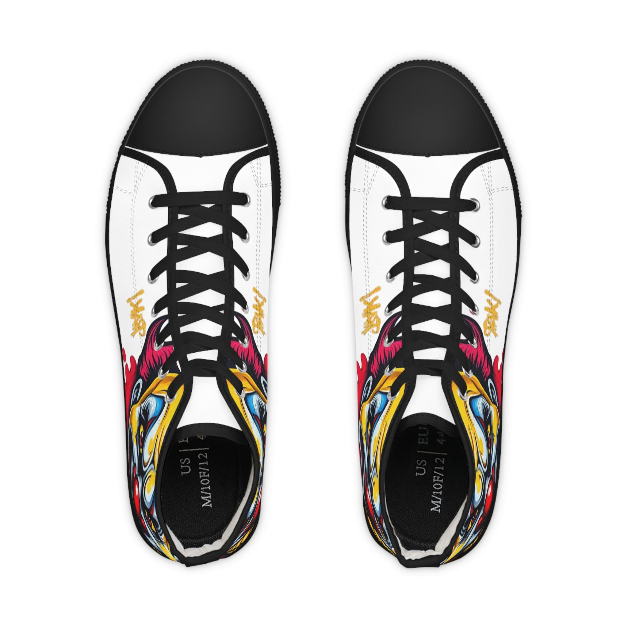 Made with breathable polyester canvas and featuring hi-poly deodorant memory foam insoles, these high top sneakers for men bear all the marks of an awesome shoe. Choose between black or white sole and laces, and enjoy the silver metal eyelets along with the lace-up closure. Add your designs and bring a bespoke staple to life.