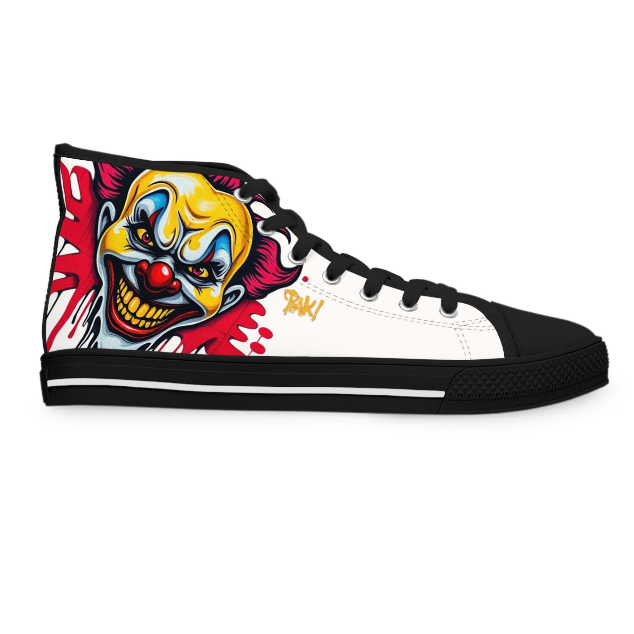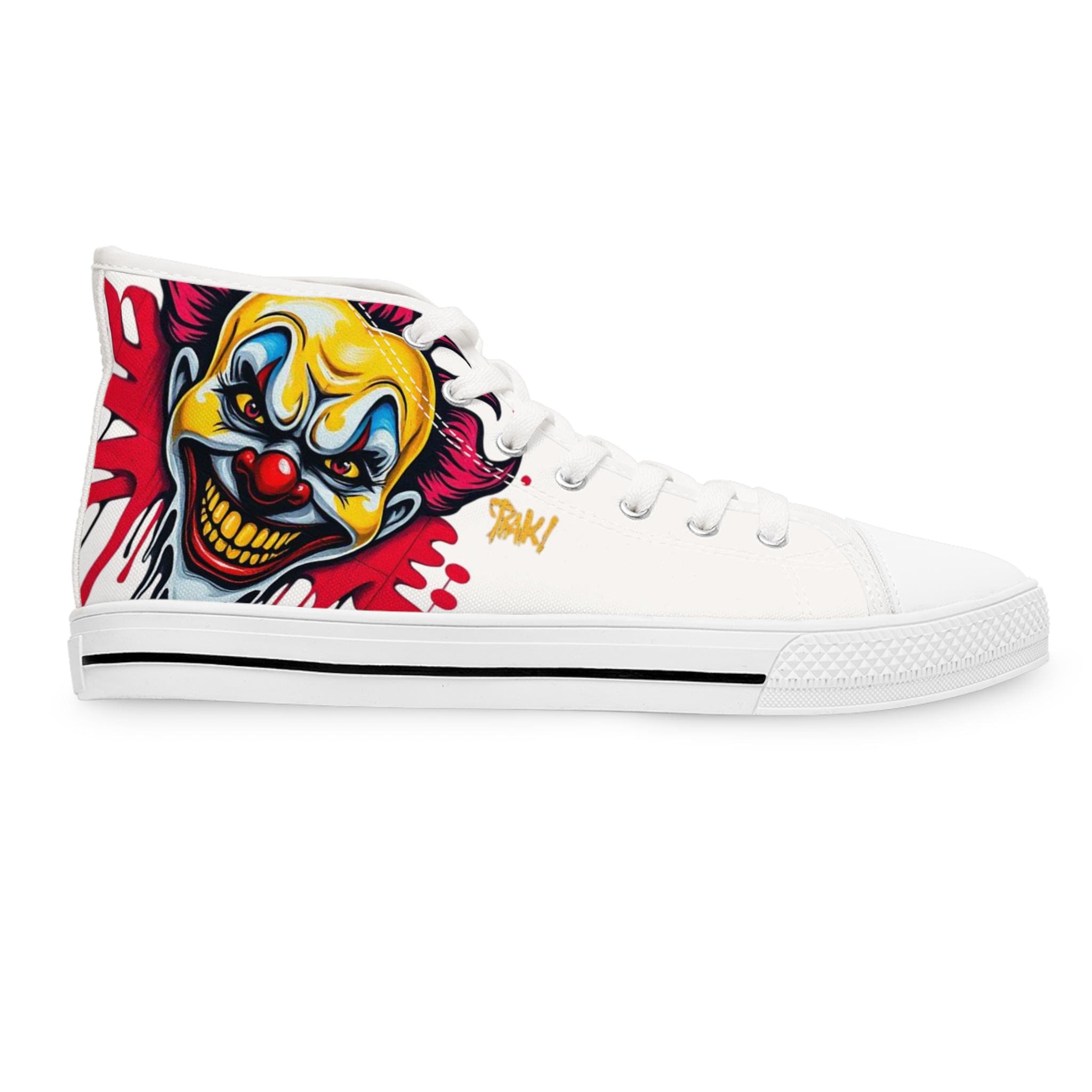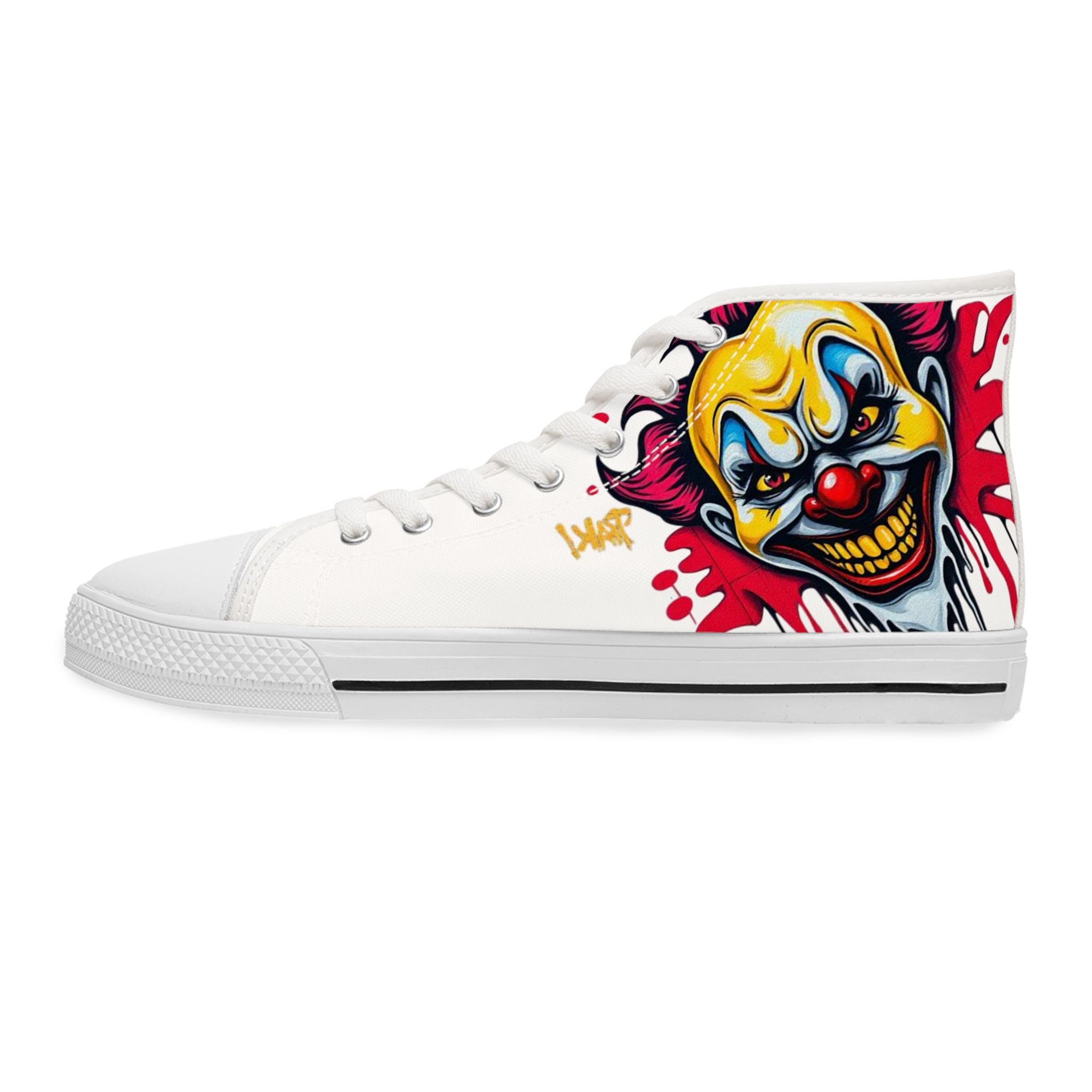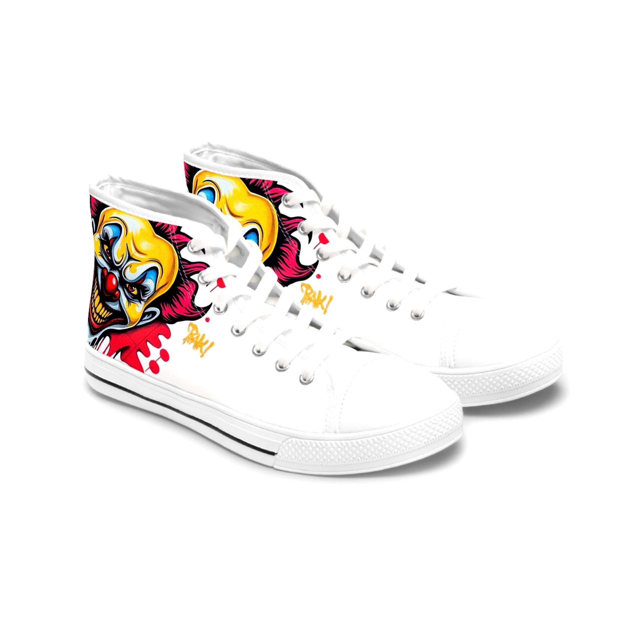 Bright, bold high-top sneakers that bring street-art energy to every step. The wraparound print features a vivid, slightly sinister clown motif in saturated yellows, reds, and blues that pops against the white canvas. Lightweight EVA insoles with deodorant memory foam cushion your feet while the durable rubber outsole stands up to daily wear. Metal eyelets and a pleather toe cap add durability where it matters, and the breathable polyester canvas keeps the shoes comfortable through long days and late nights. These high-tops suit someone who loves graphic, edgy style and wants footwear that reads like wearable artwork — great for concerts, skate sessions, or adding attitude to casual outfits.