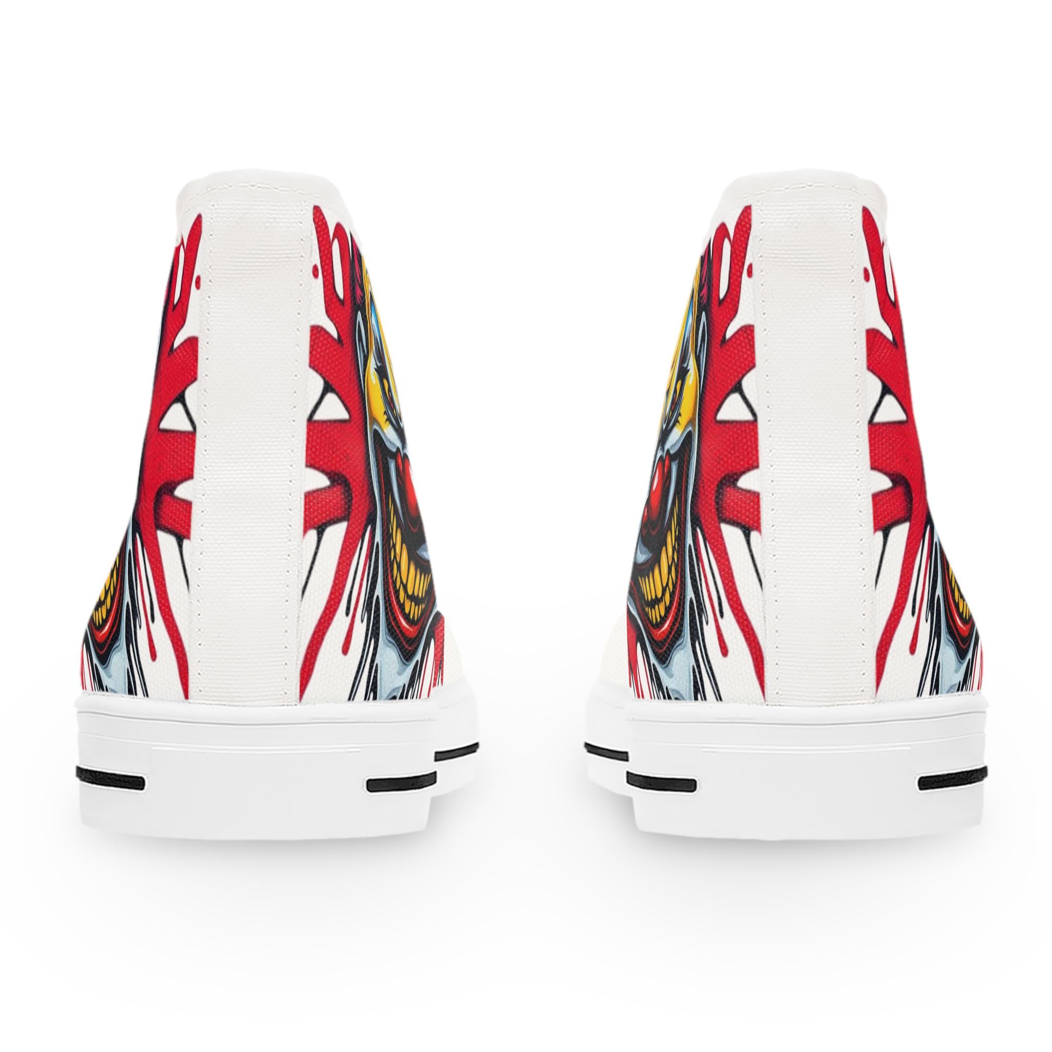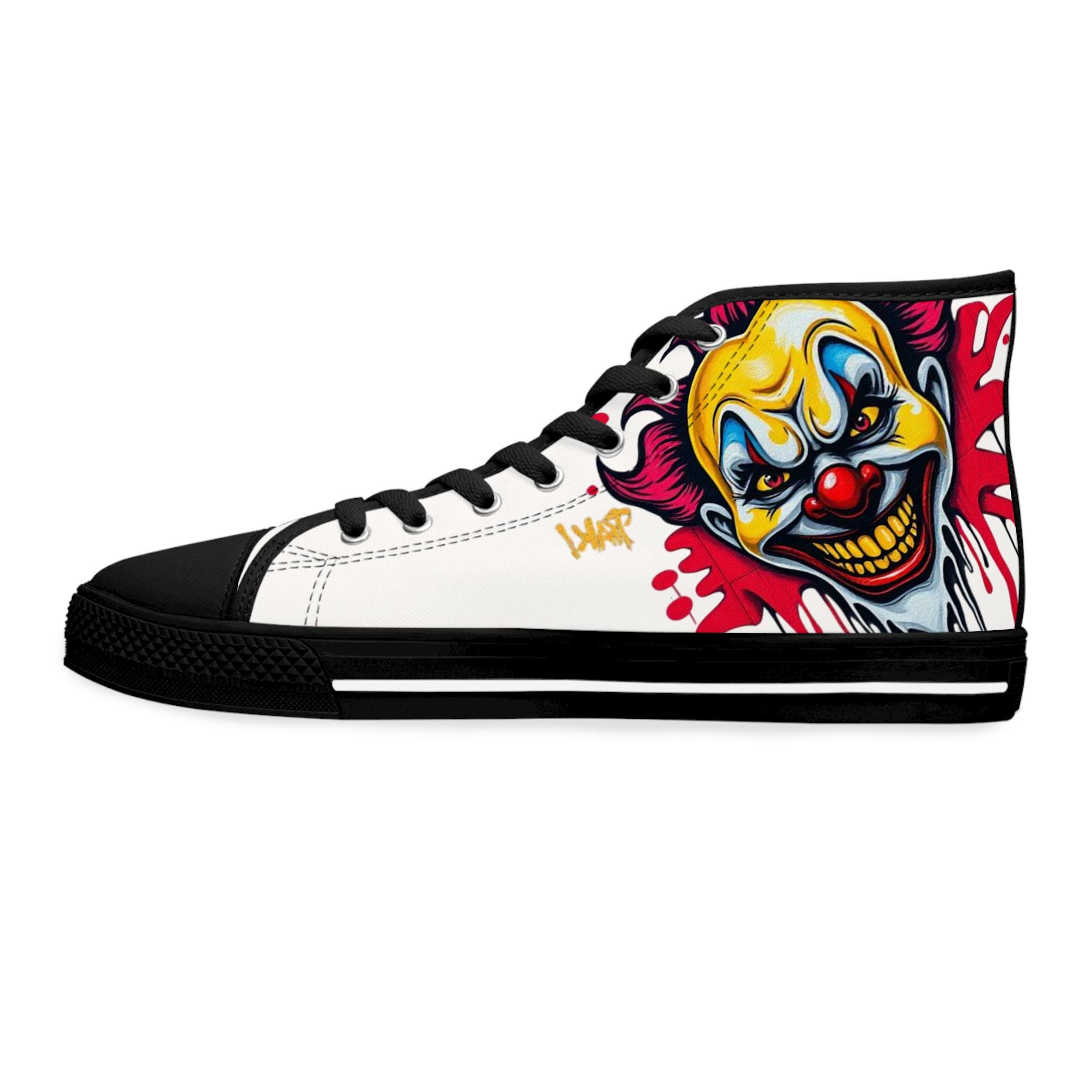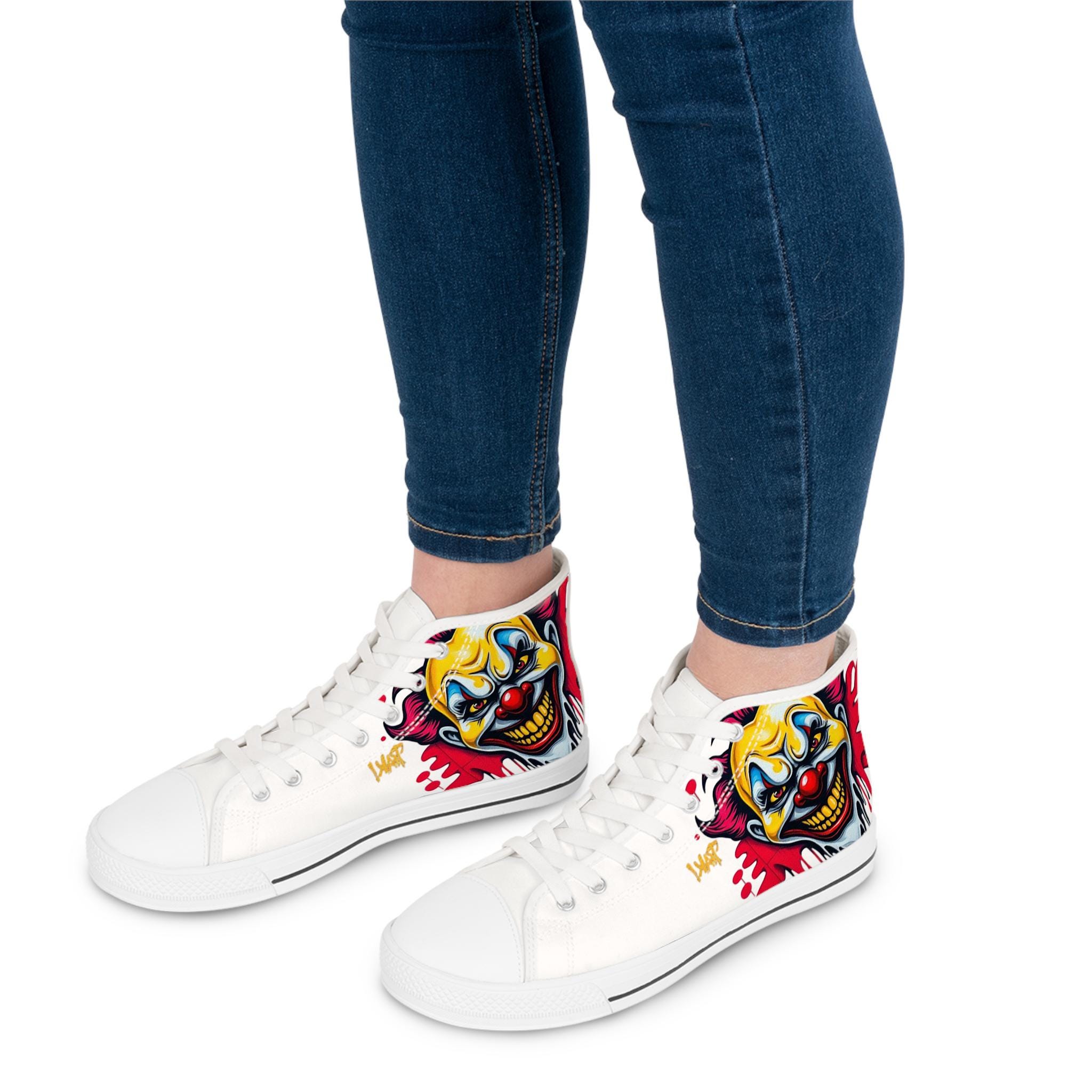 Bright, bold high-top sneakers that bring street-art energy to every step. The wraparound print features a vivid, slightly sinister clown motif in saturated yellows, reds, and blues that pops against the white canvas. Lightweight EVA insoles with deodorant memory foam cushion your feet while the durable rubber outsole stands up to daily wear. Metal eyelets and a pleather toe cap add durability where it matters, and the breathable polyester canvas keeps the shoes comfortable through long days and late nights. These high-tops suit someone who loves graphic, edgy style and wants footwear that reads like wearable artwork — great for concerts, skate sessions, or adding attitude to casual outfits.