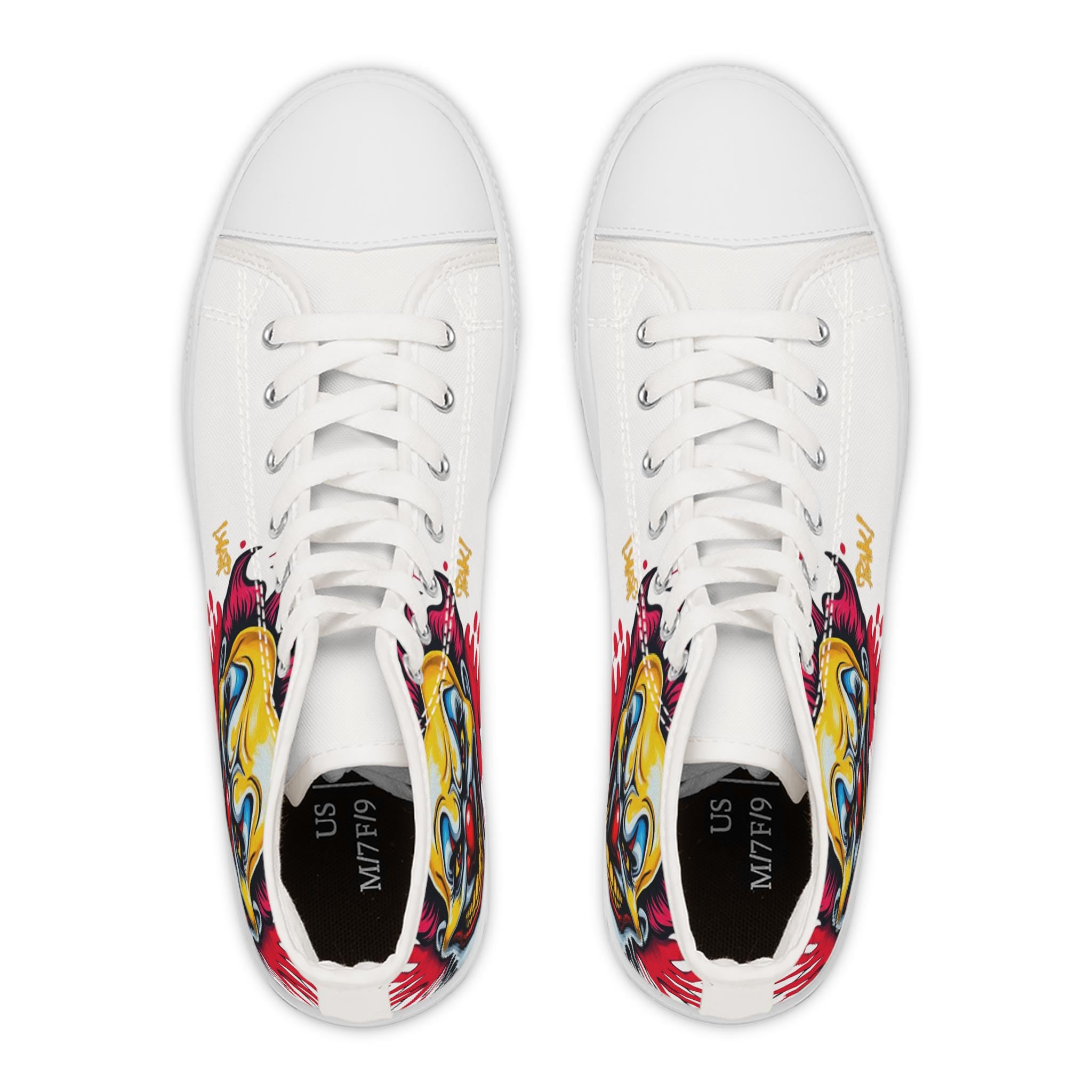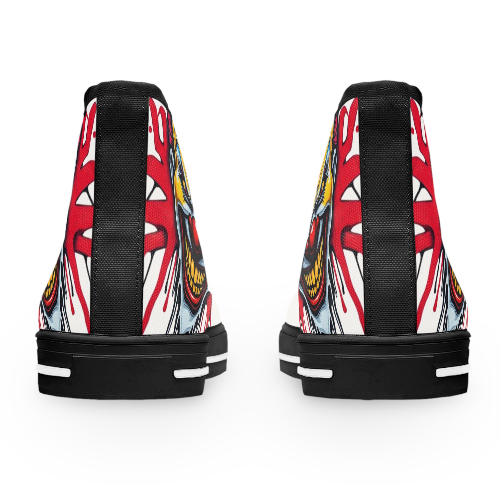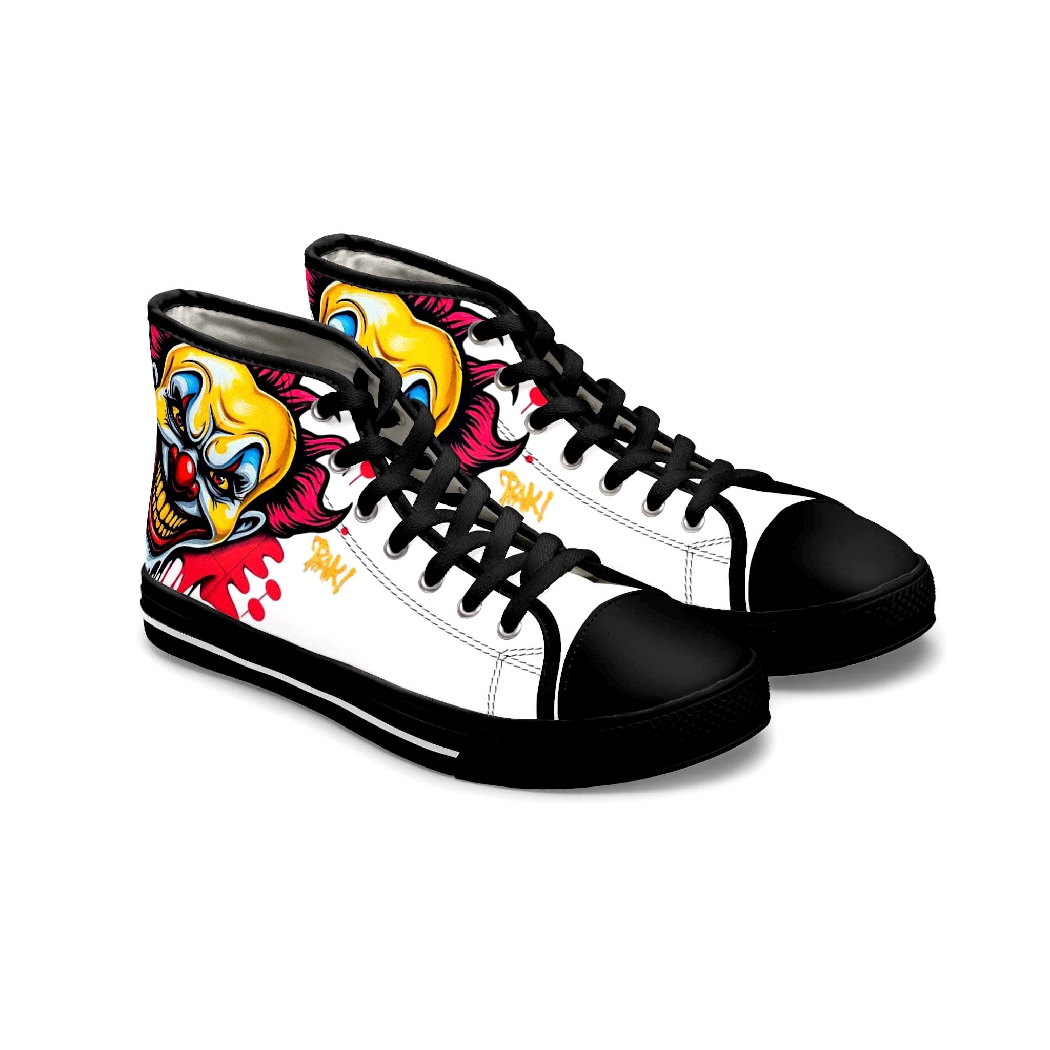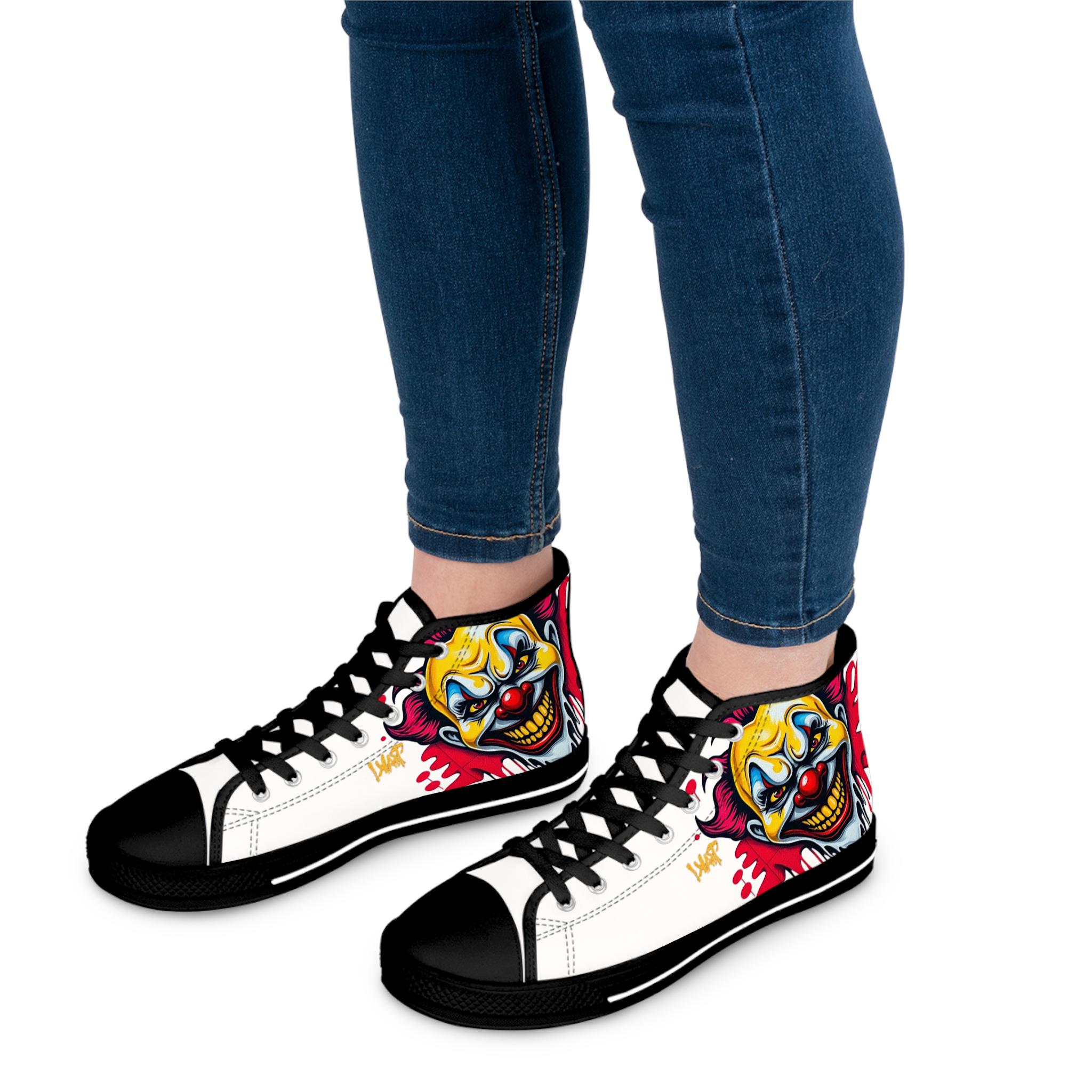 Bright, bold high-top sneakers that bring street-art energy to every step. The wraparound print features a vivid, slightly sinister clown motif in saturated yellows, reds, and blues that pops against the white canvas. Lightweight EVA insoles with deodorant memory foam cushion your feet while the durable rubber outsole stands up to daily wear. Metal eyelets and a pleather toe cap add durability where it matters, and the breathable polyester canvas keeps the shoes comfortable through long days and late nights. These high-tops suit someone who loves graphic, edgy style and wants footwear that reads like wearable artwork — great for concerts, skate sessions, or adding attitude to casual outfits.